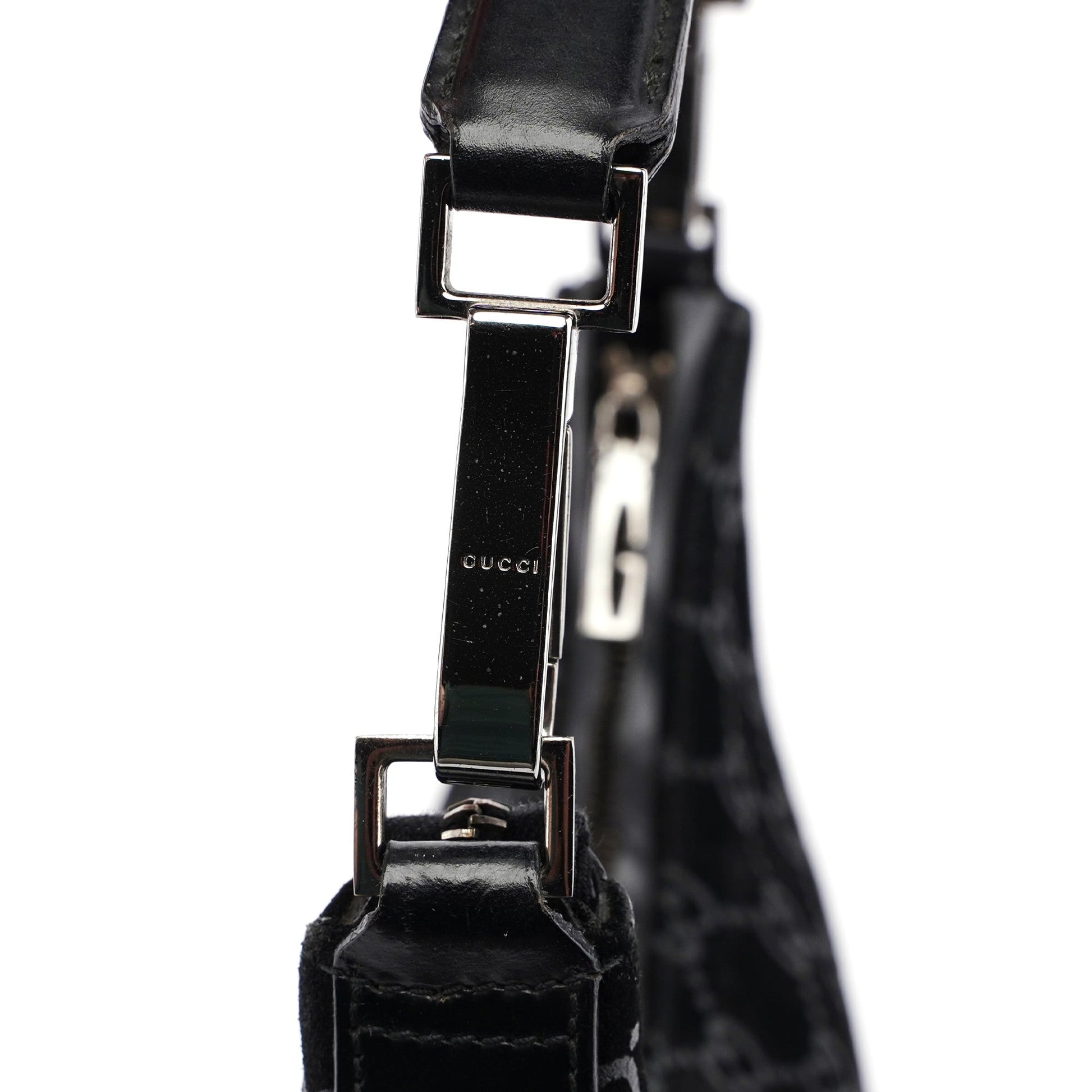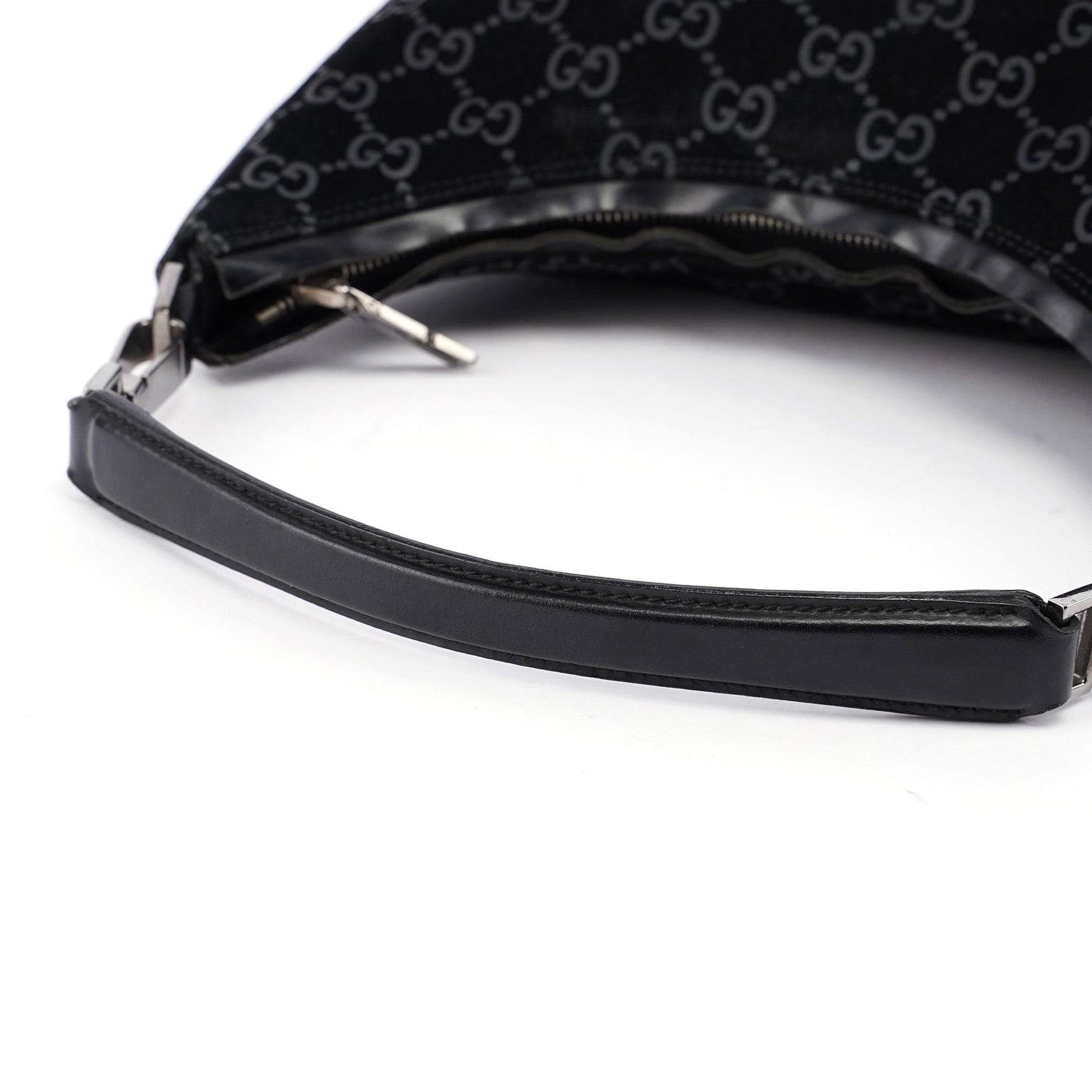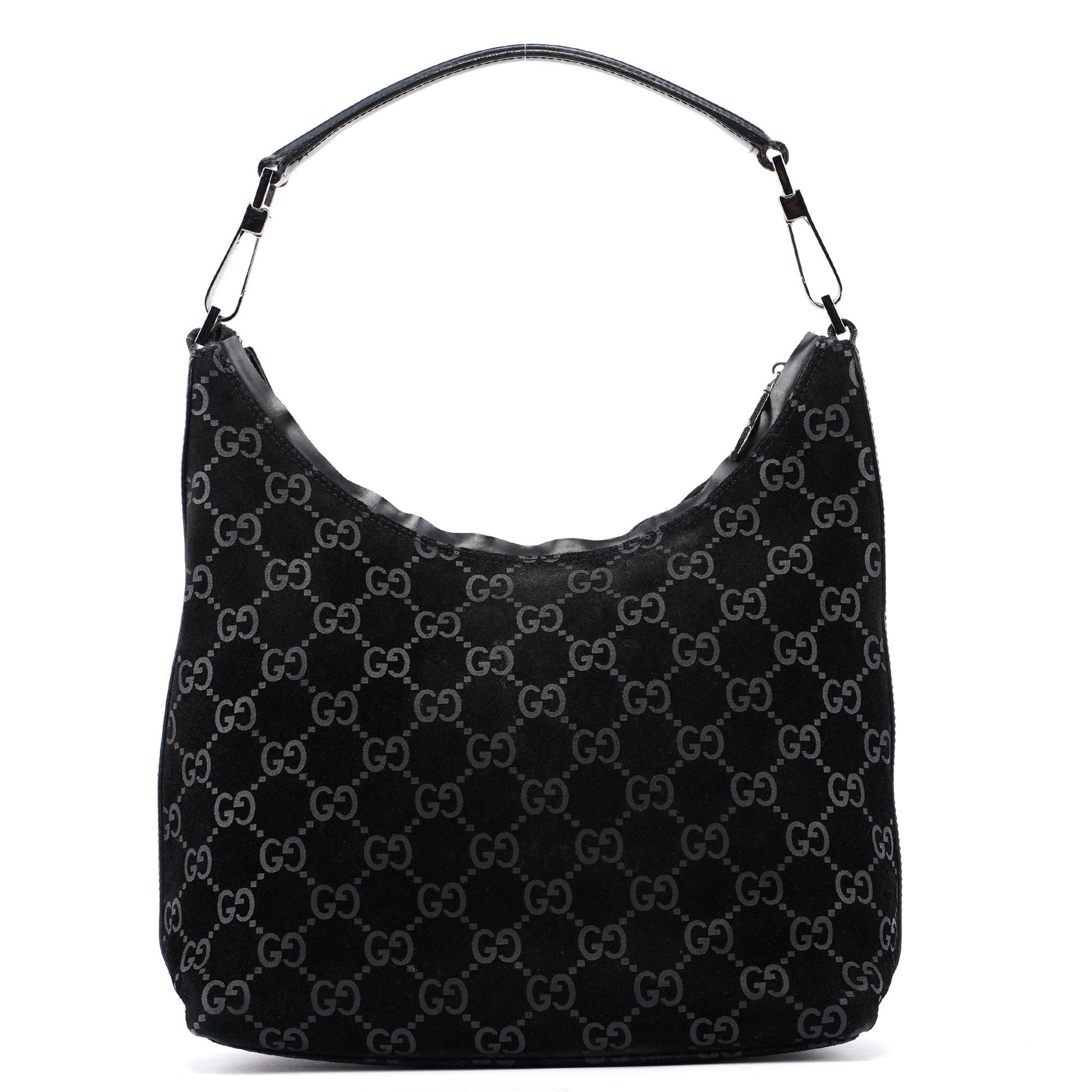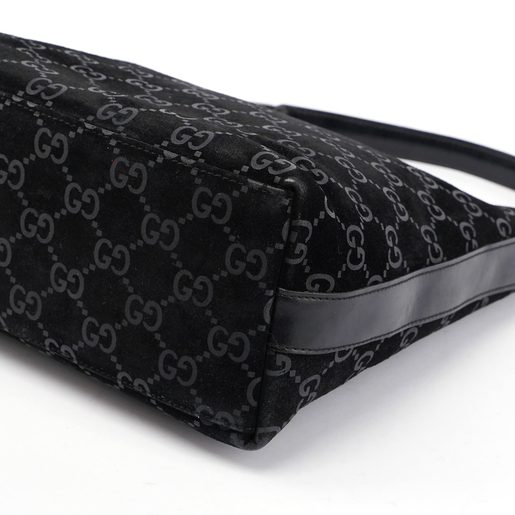 Unveil the elegance of the Gucci GG suede shoulder bag, designed by Tom Ford in 1997. This luxurious piece features silver-tone hardware with engraved Gucci logo, complemented by black calfskin leather trim. A zipper closure secures the satin-lined interior, making it a perfect fusion of timeless design and modern sophistication.