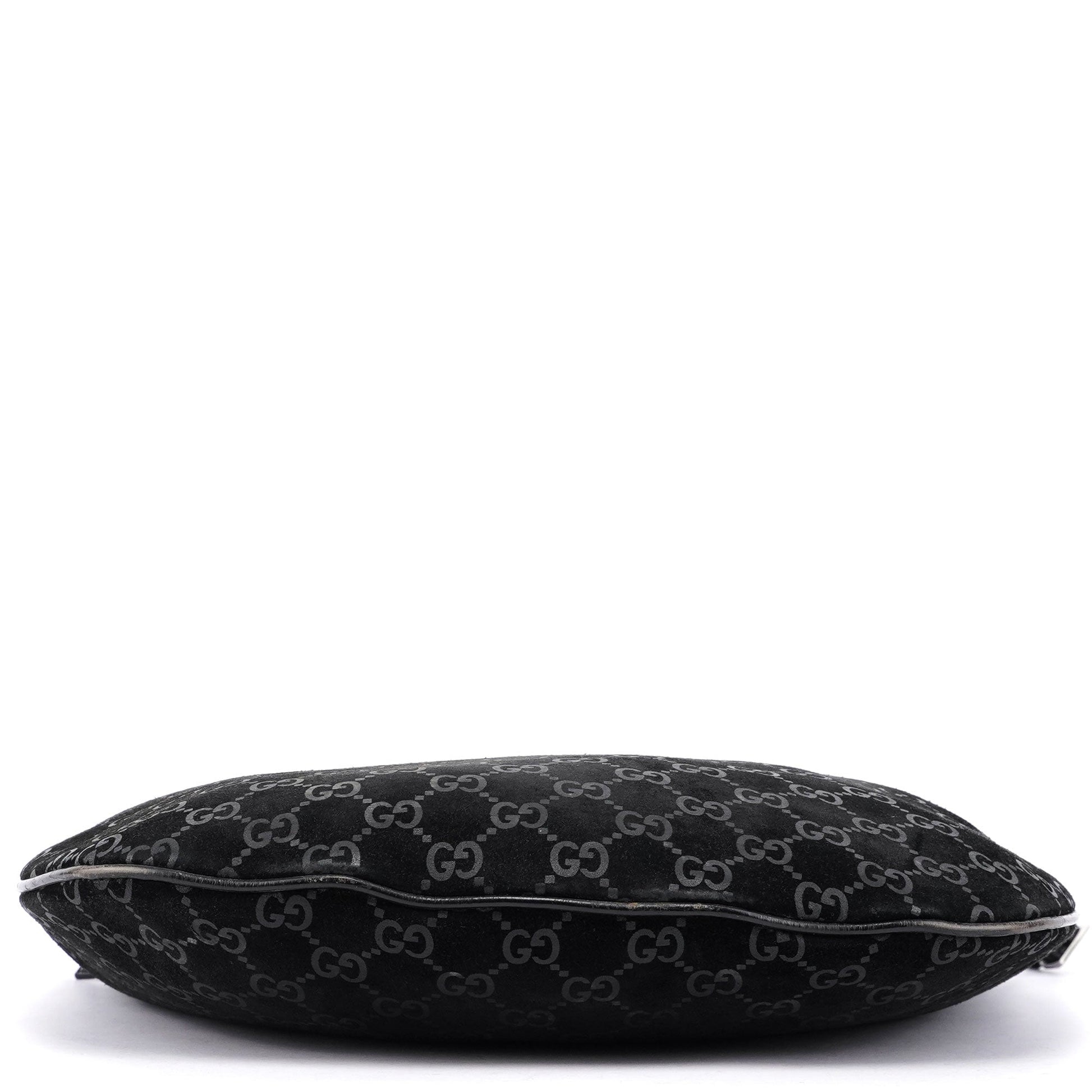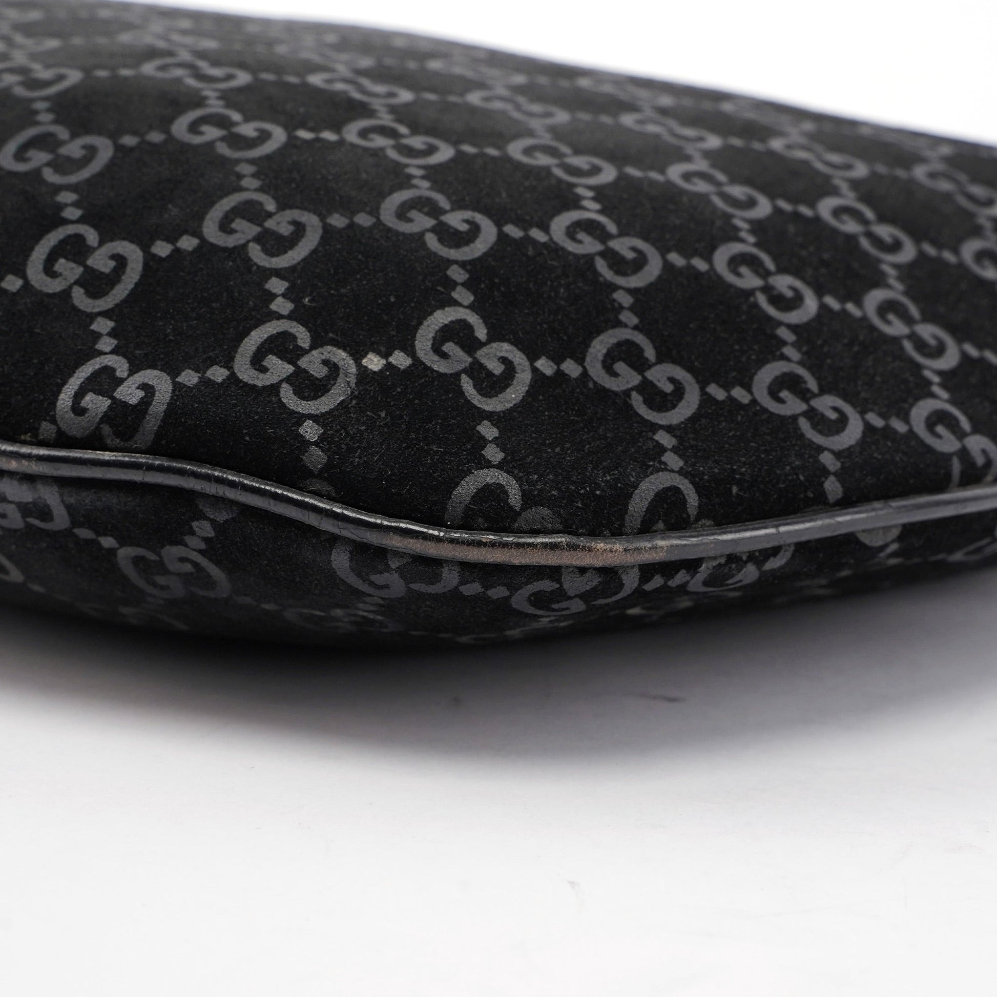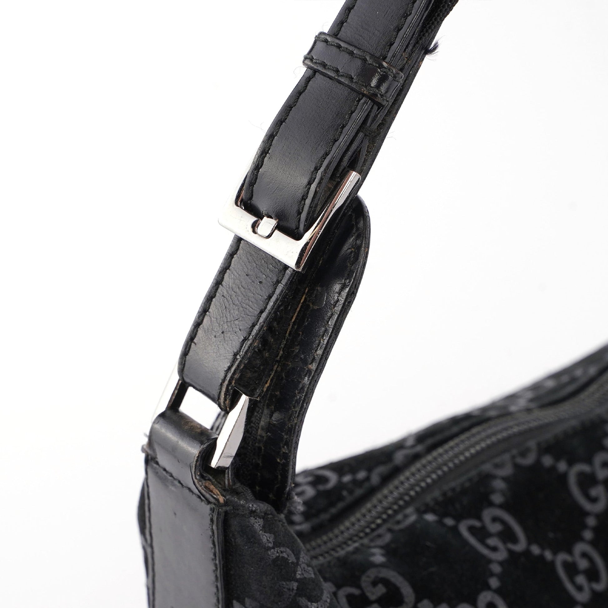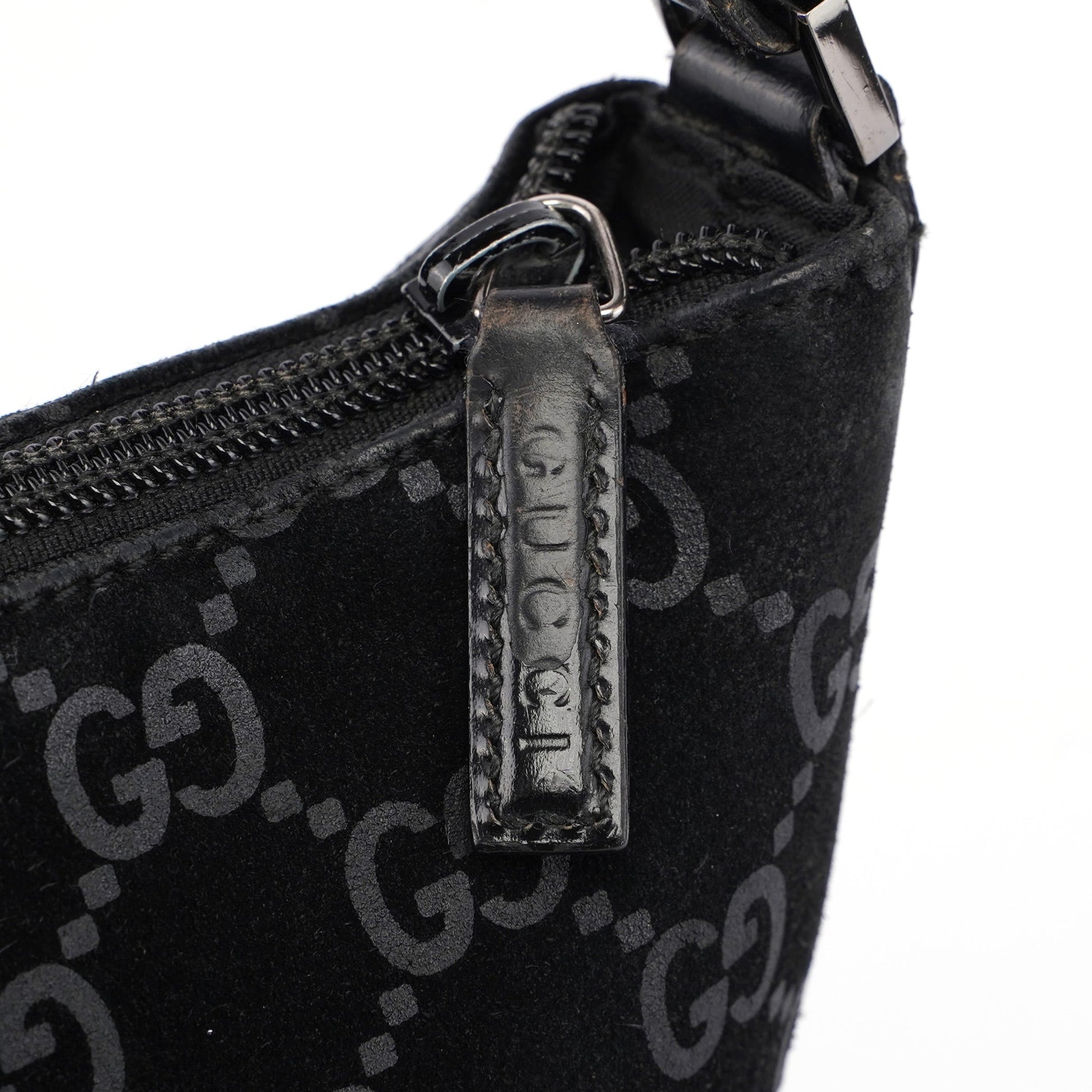 Gucci GG suede shoulder bag, designed by Tom Ford in the late 1990s handcrafted from black GG monogram suede features gold-tone hardware with engraved Gucci logo, complemented by black calfskin leather trim. A zipper closure secures the cotton-lined interior and a zipper pocket, making it a perfect fusion of timeless design and modern sophistication.