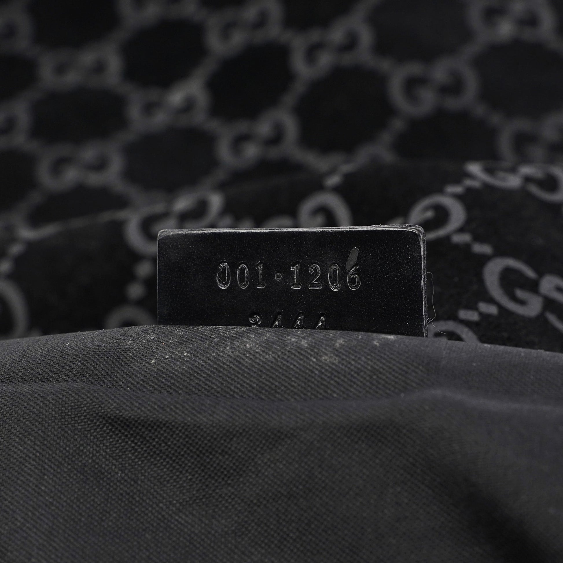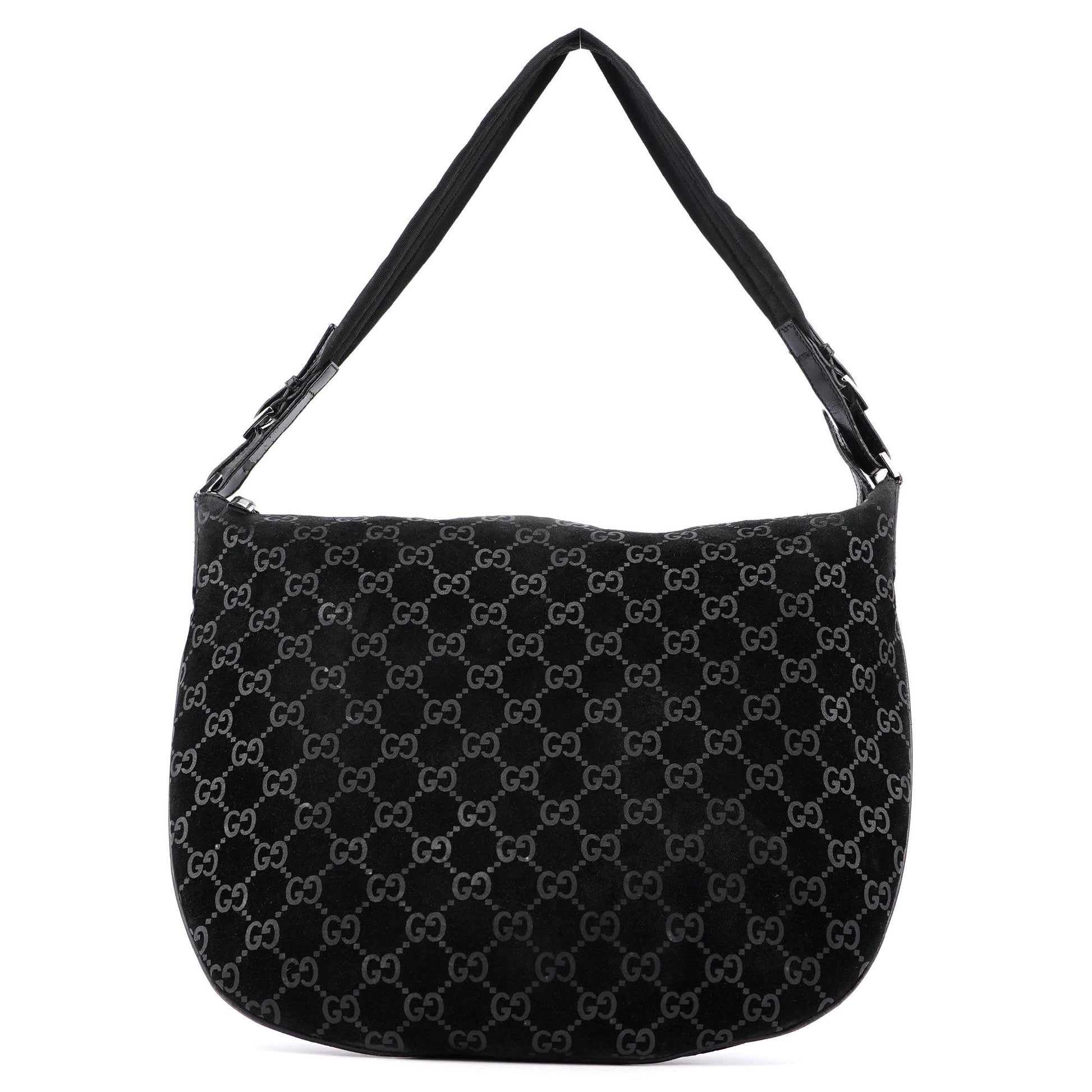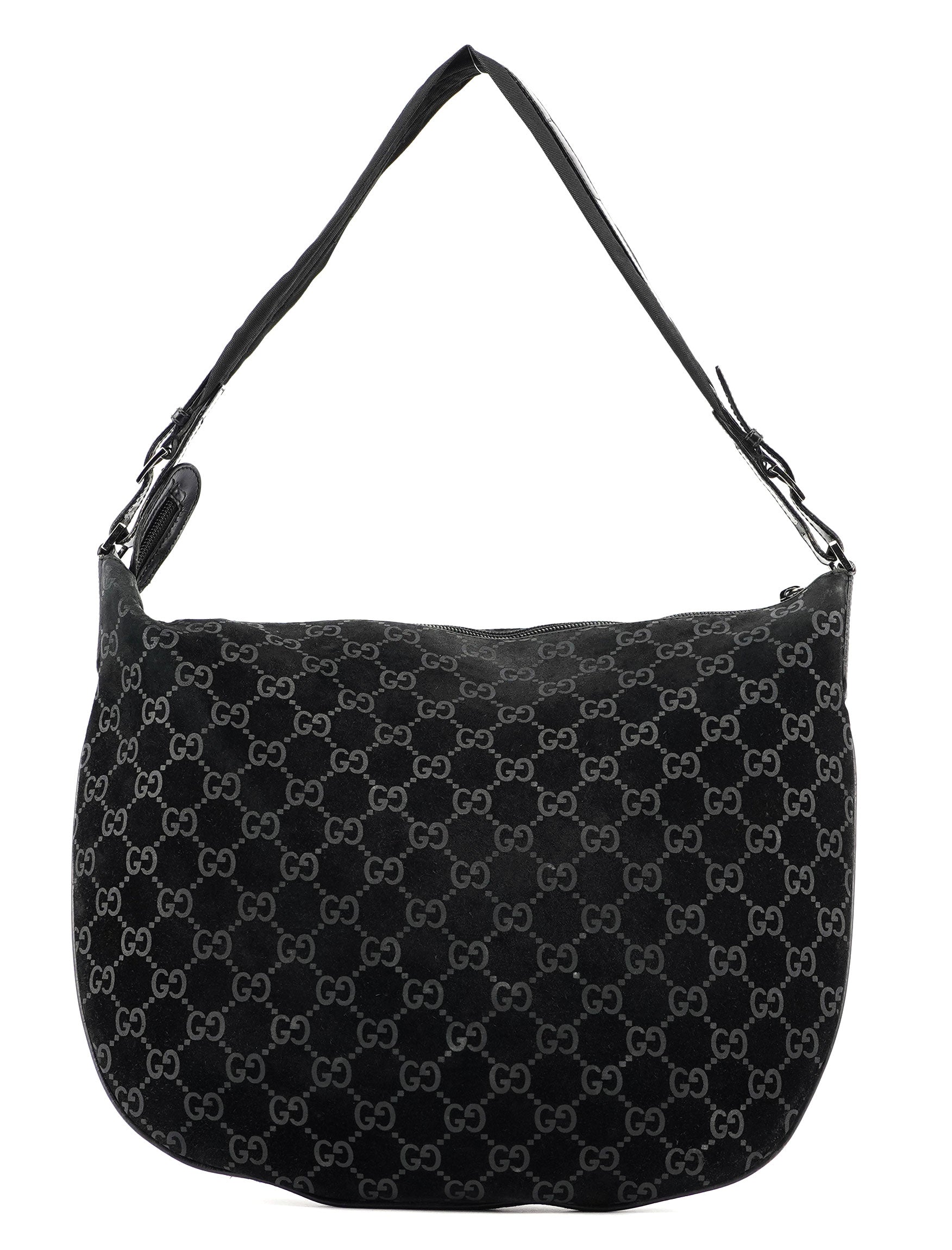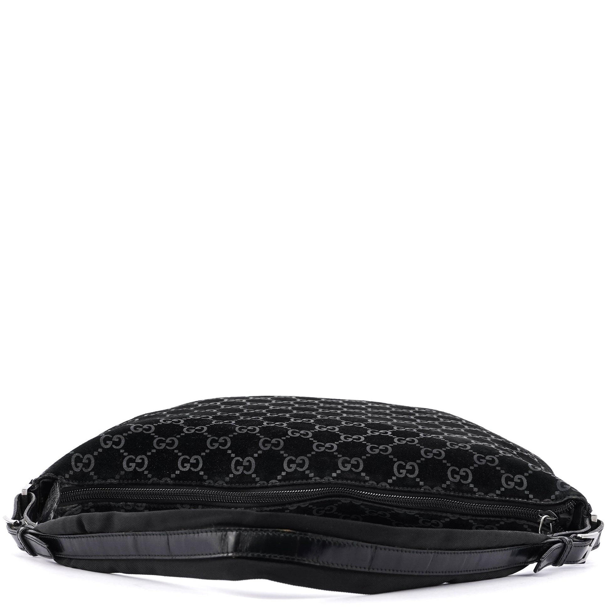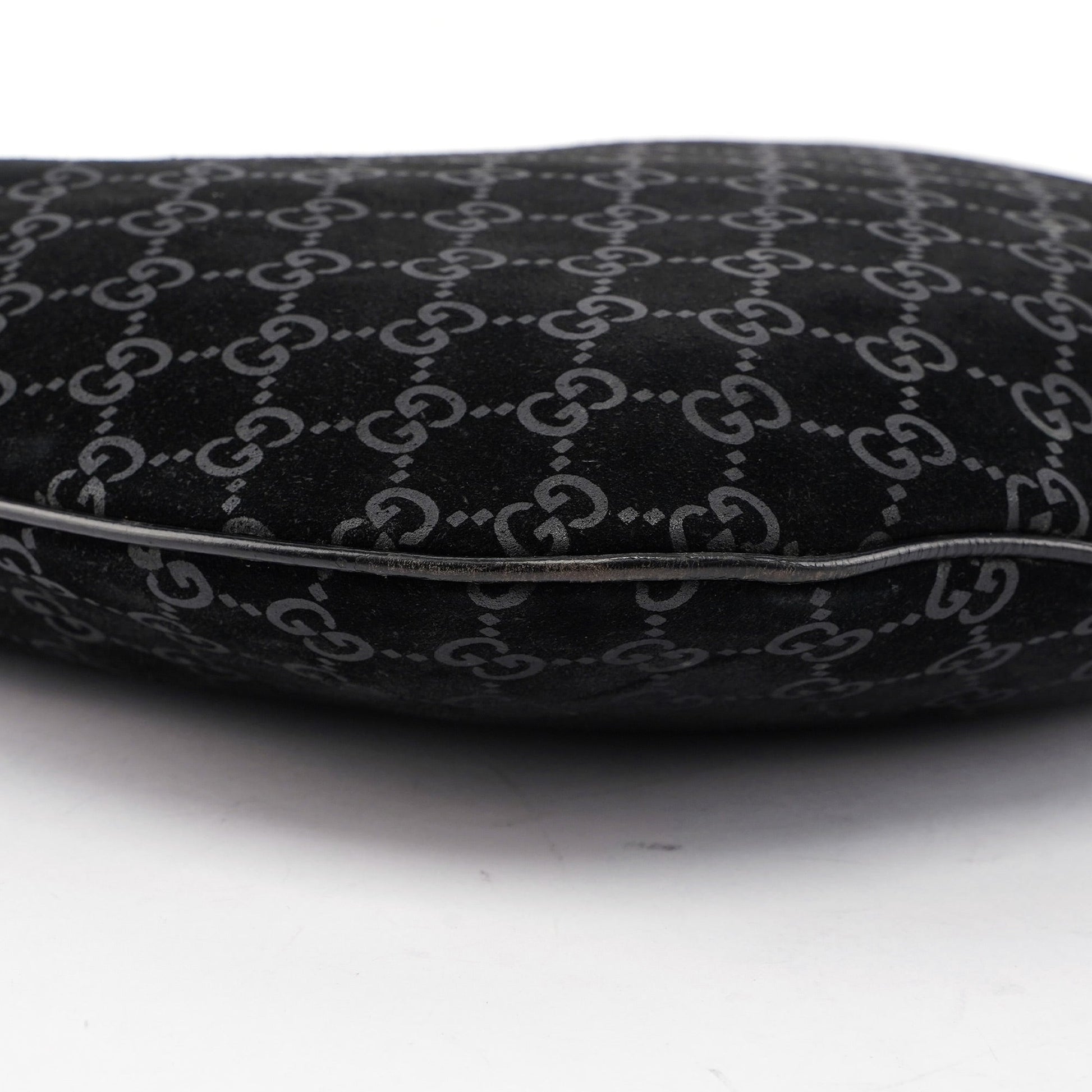 Gucci GG suede shoulder bag, designed by Tom Ford in the late 1990s handcrafted from black GG monogram suede features gold-tone hardware with engraved Gucci logo, complemented by black calfskin leather trim. A zipper closure secures the cotton-lined interior and a zipper pocket, making it a perfect fusion of timeless design and modern sophistication.