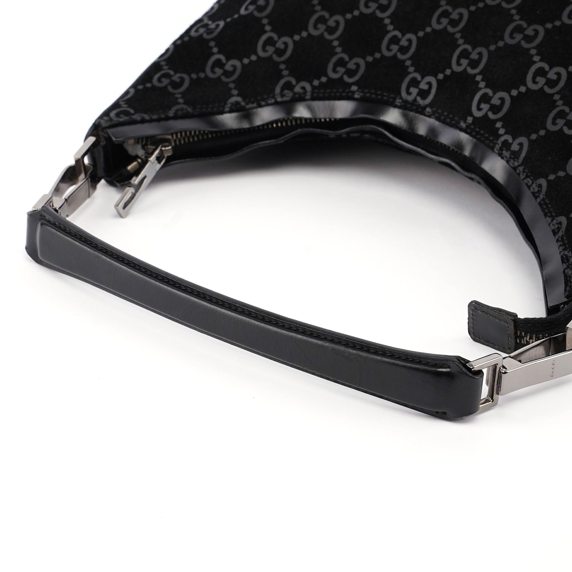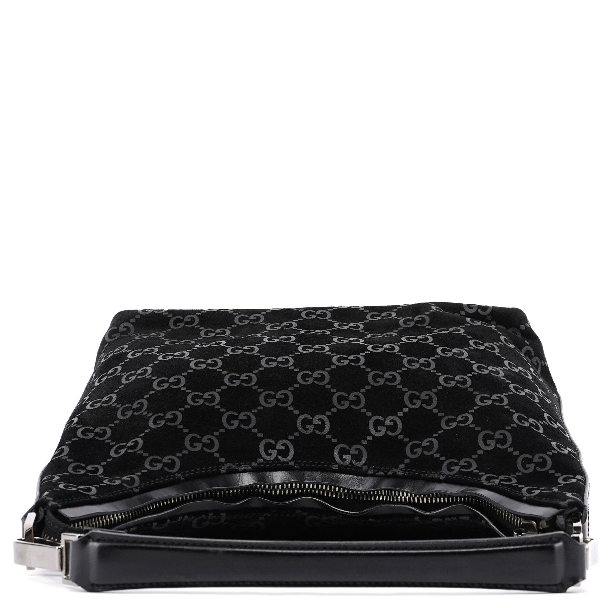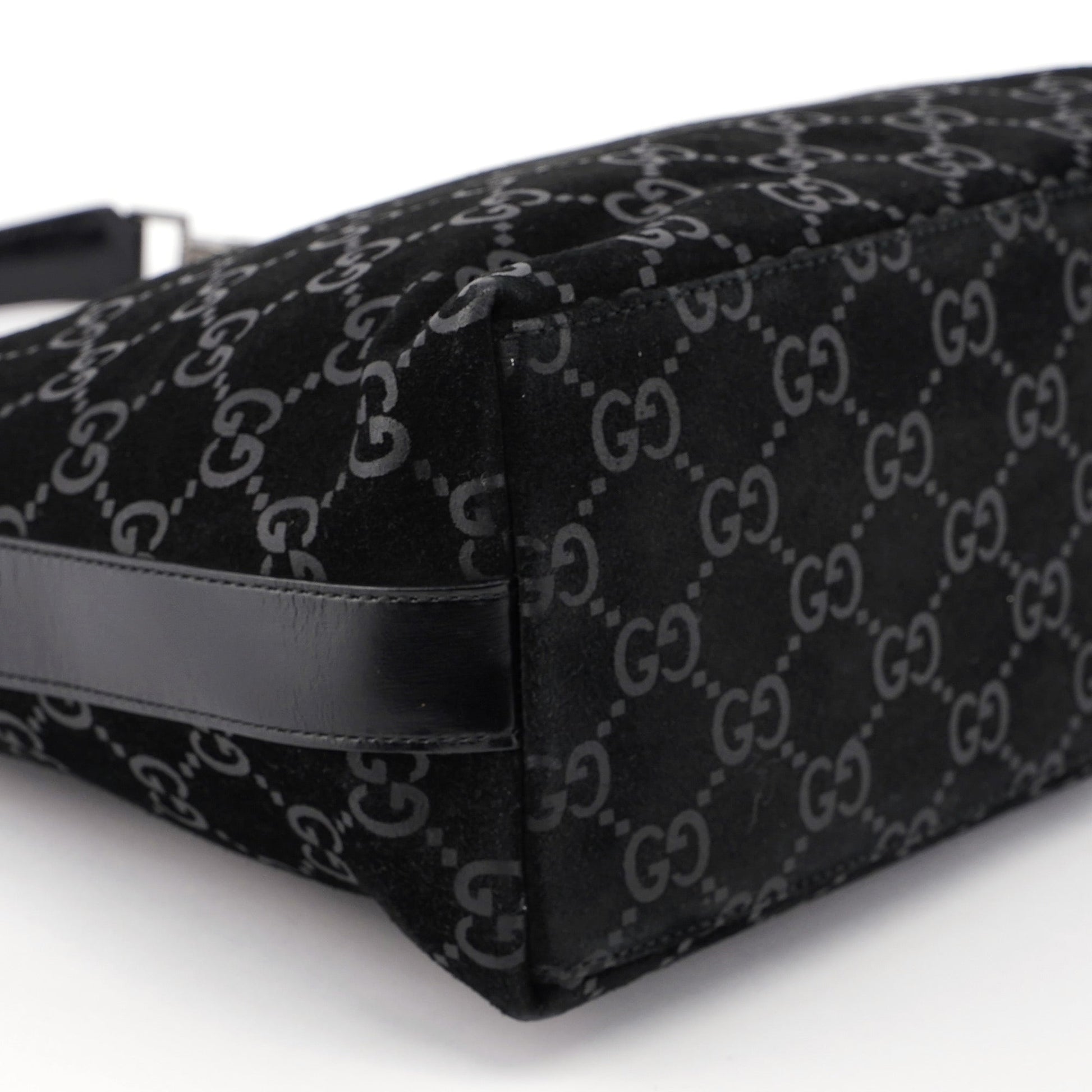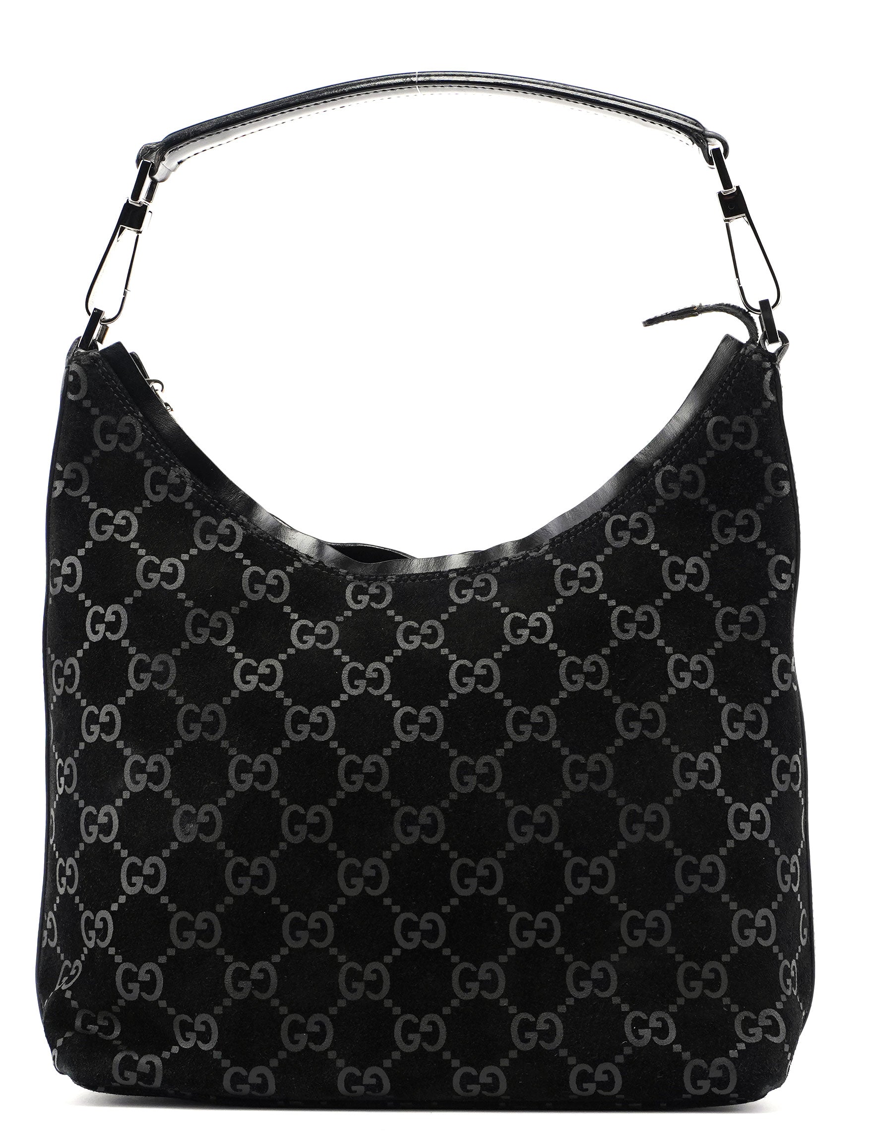Unveil the elegance of the Gucci GG suede shoulder bag, designed by Tom Ford in 1997. This luxurious piece features silver-tone hardware with engraved Gucci logo, complemented by black calfskin leather trim. A zipper closure secures the satin-lined interior.