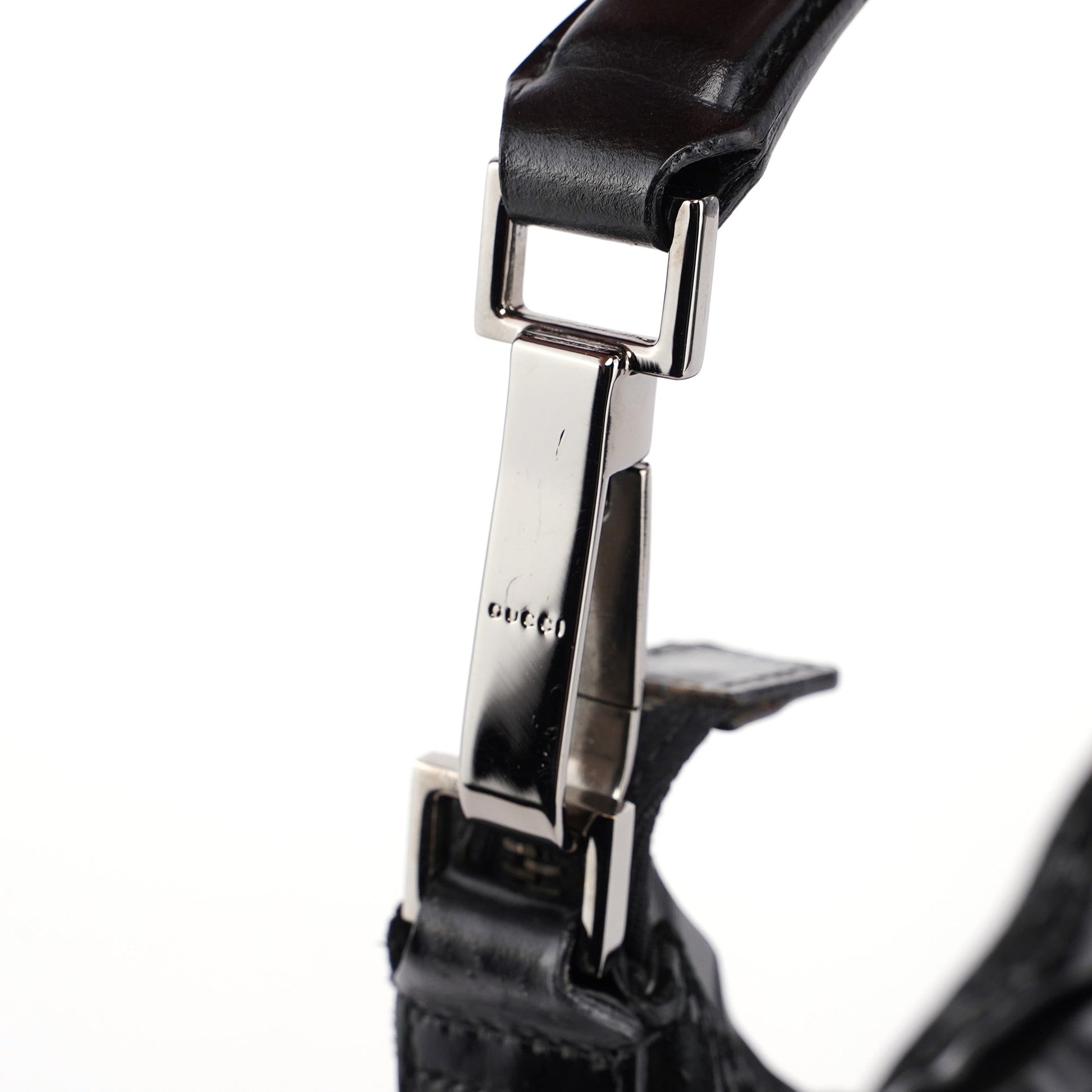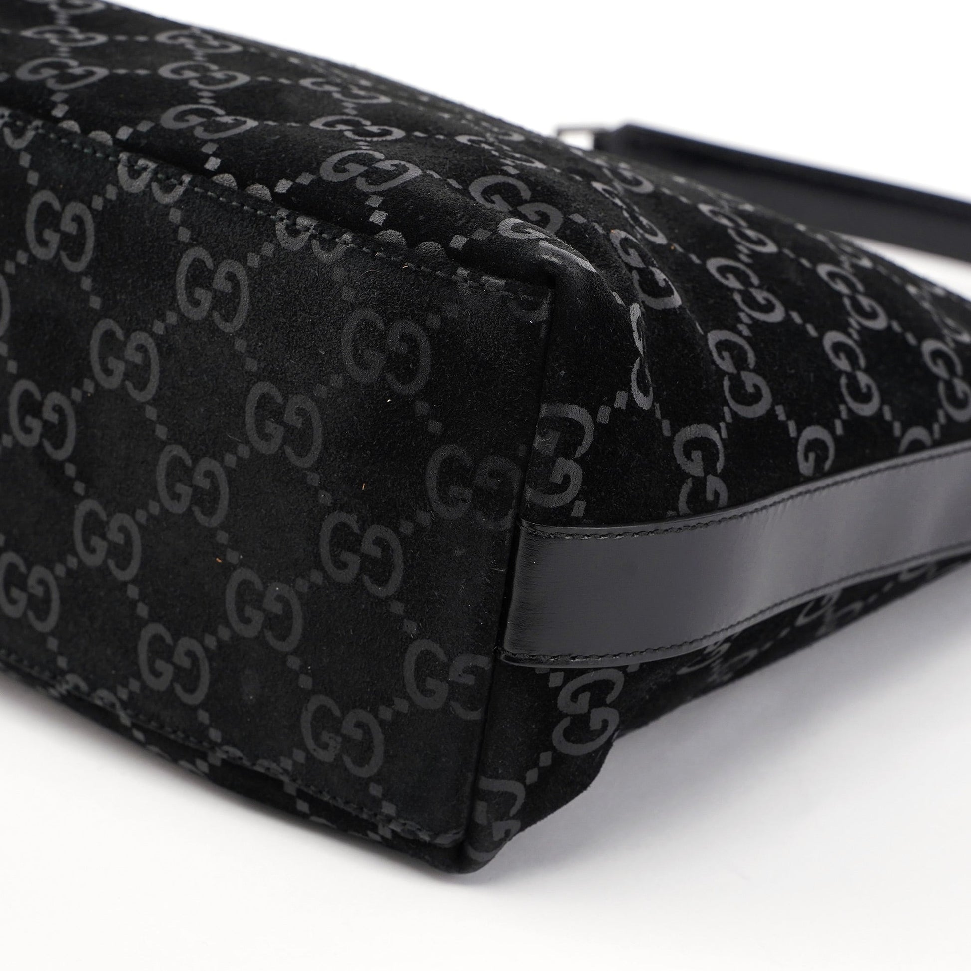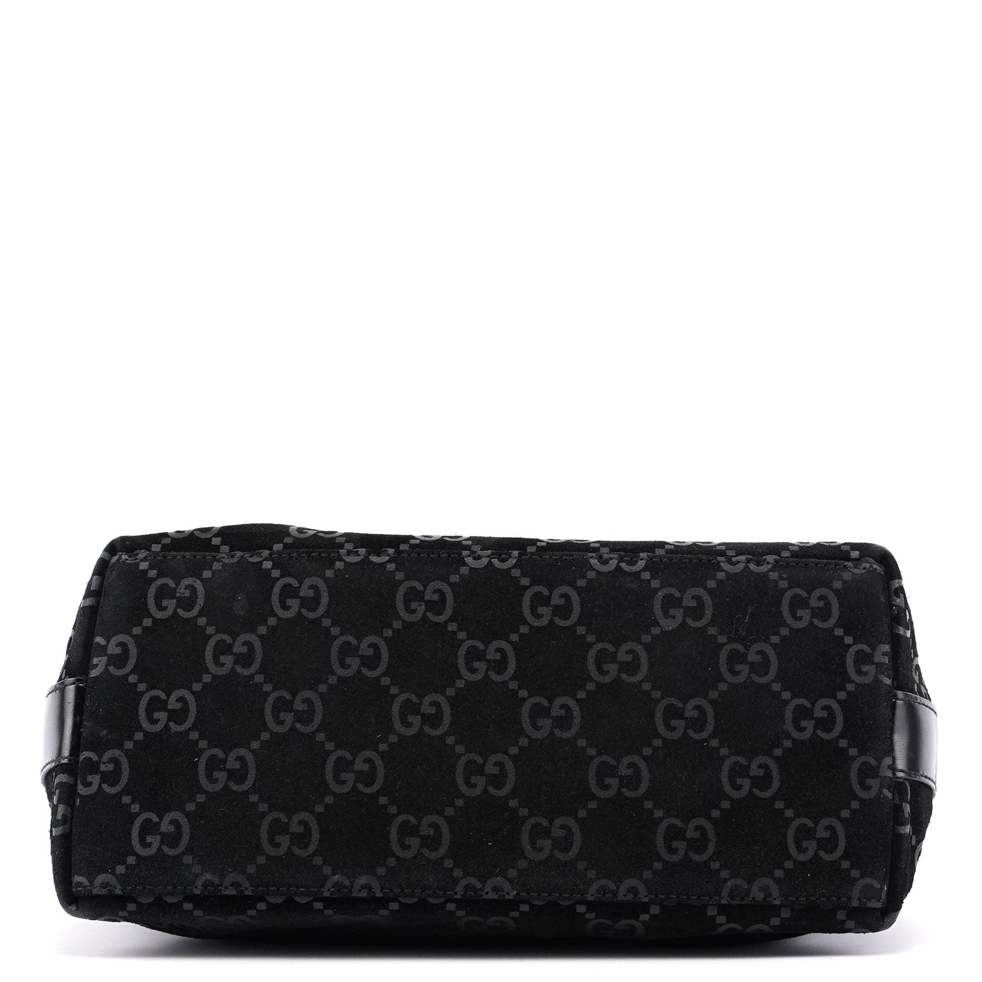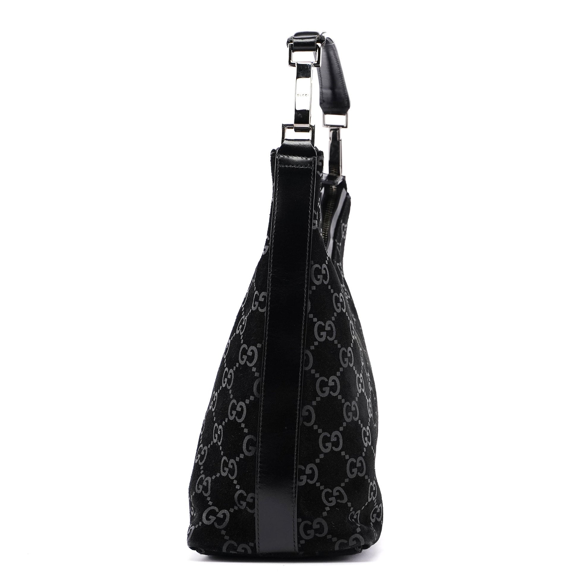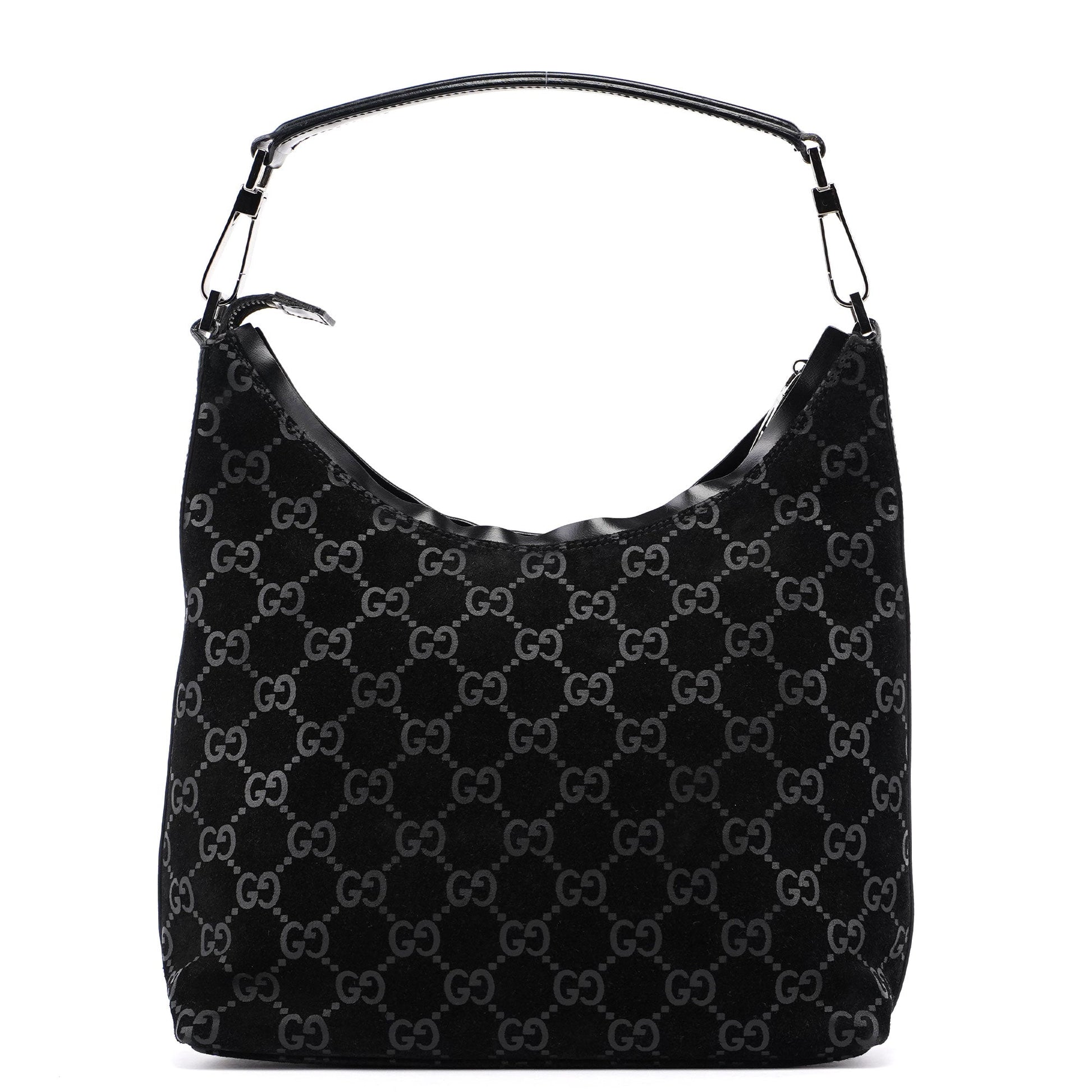 Unveil the elegance of the Gucci GG suede shoulder bag, designed by Tom Ford in 1997. This luxurious piece features silver-tone hardware with engraved Gucci logo, complemented by black calfskin leather trim. A zipper closure secures the satin-lined interior.