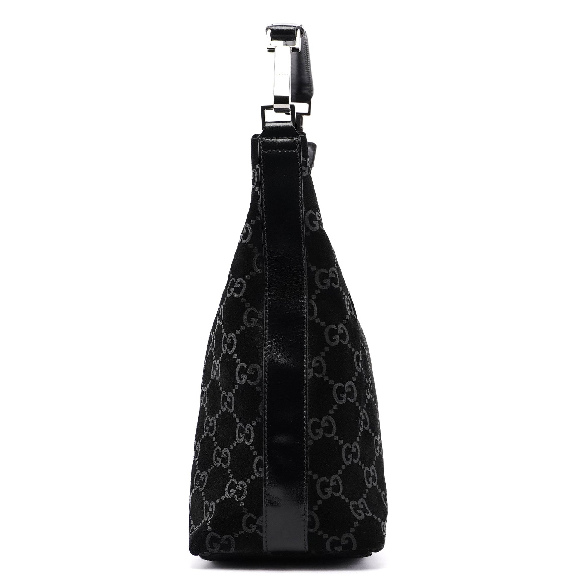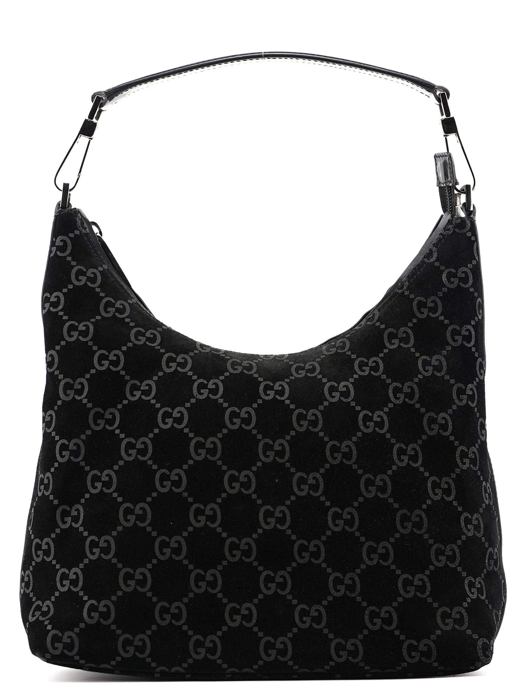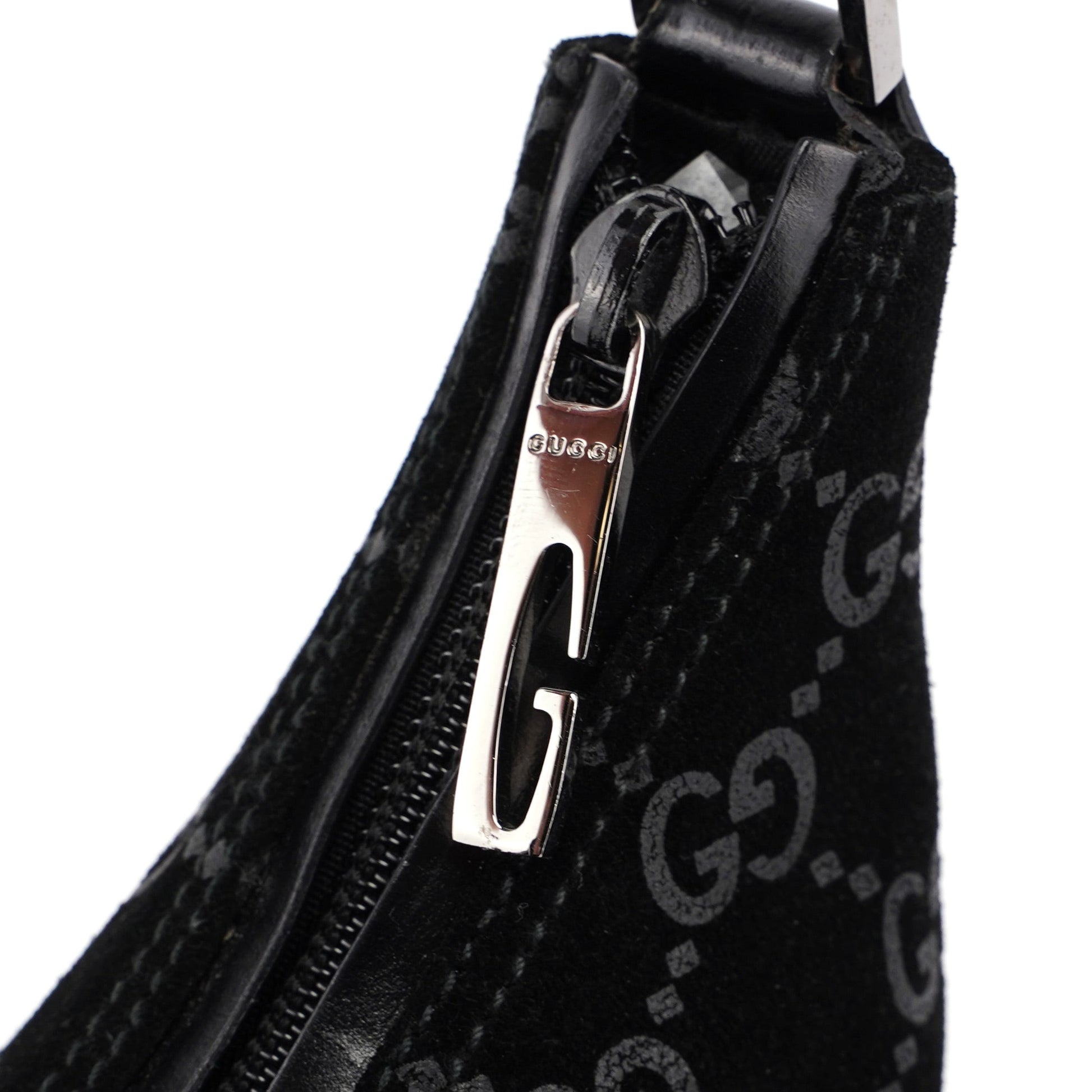 Unveil the elegance of the Gucci GG suede shoulder bag, designed by Tom Ford in 1997. This luxurious piece features silver-tone hardware with engraved Gucci logo, complemented by black calfskin leather trim. A zipper closure secures the satin-lined interior.