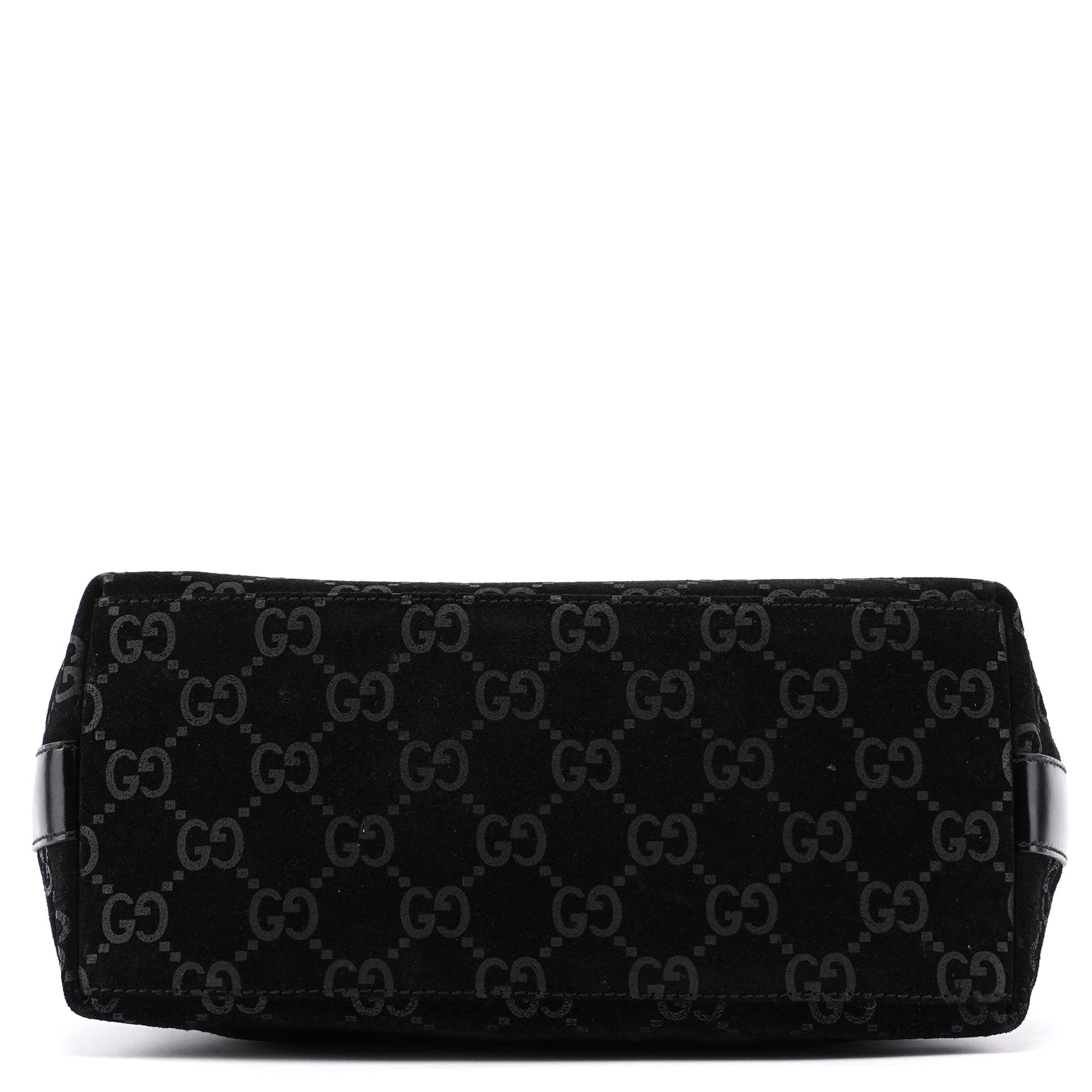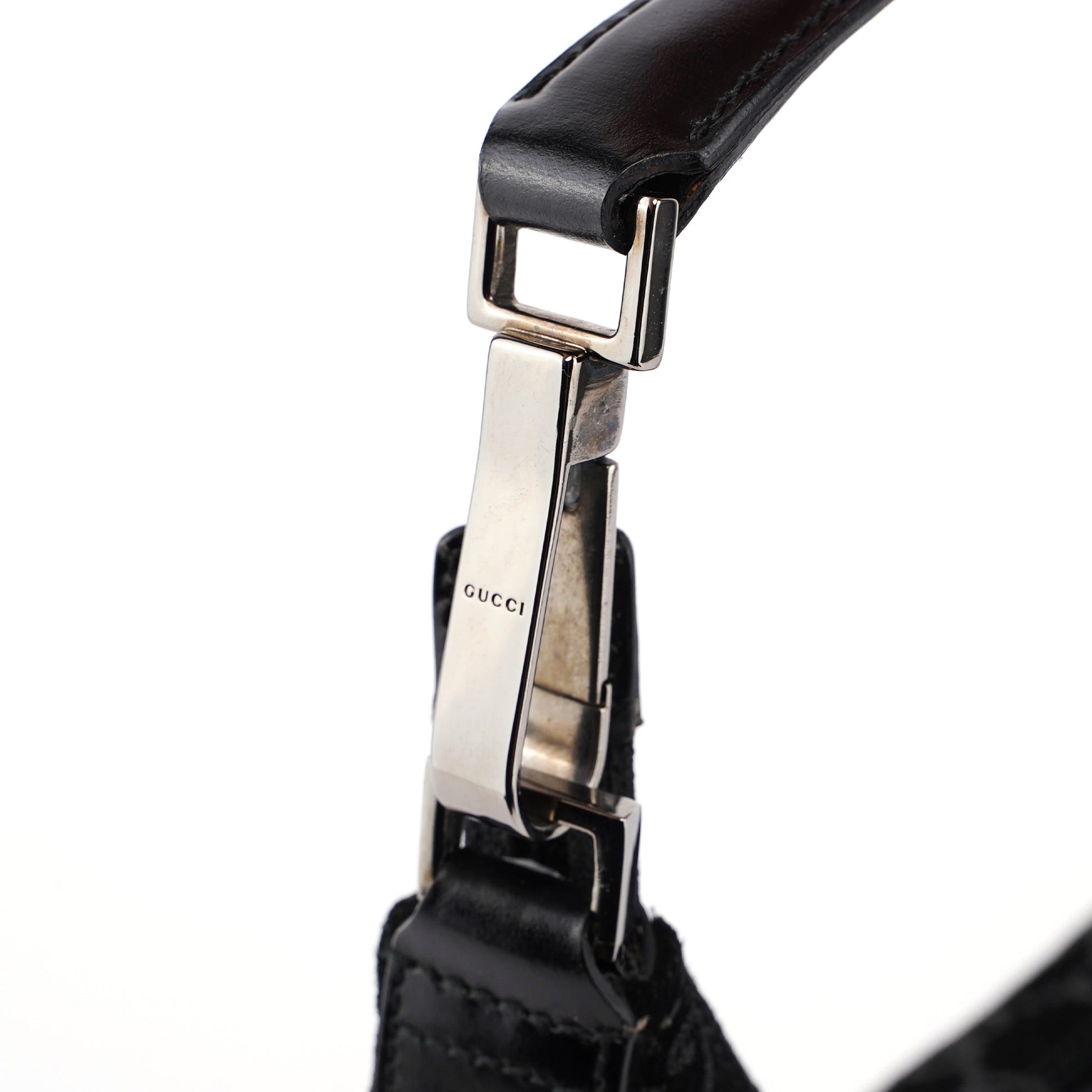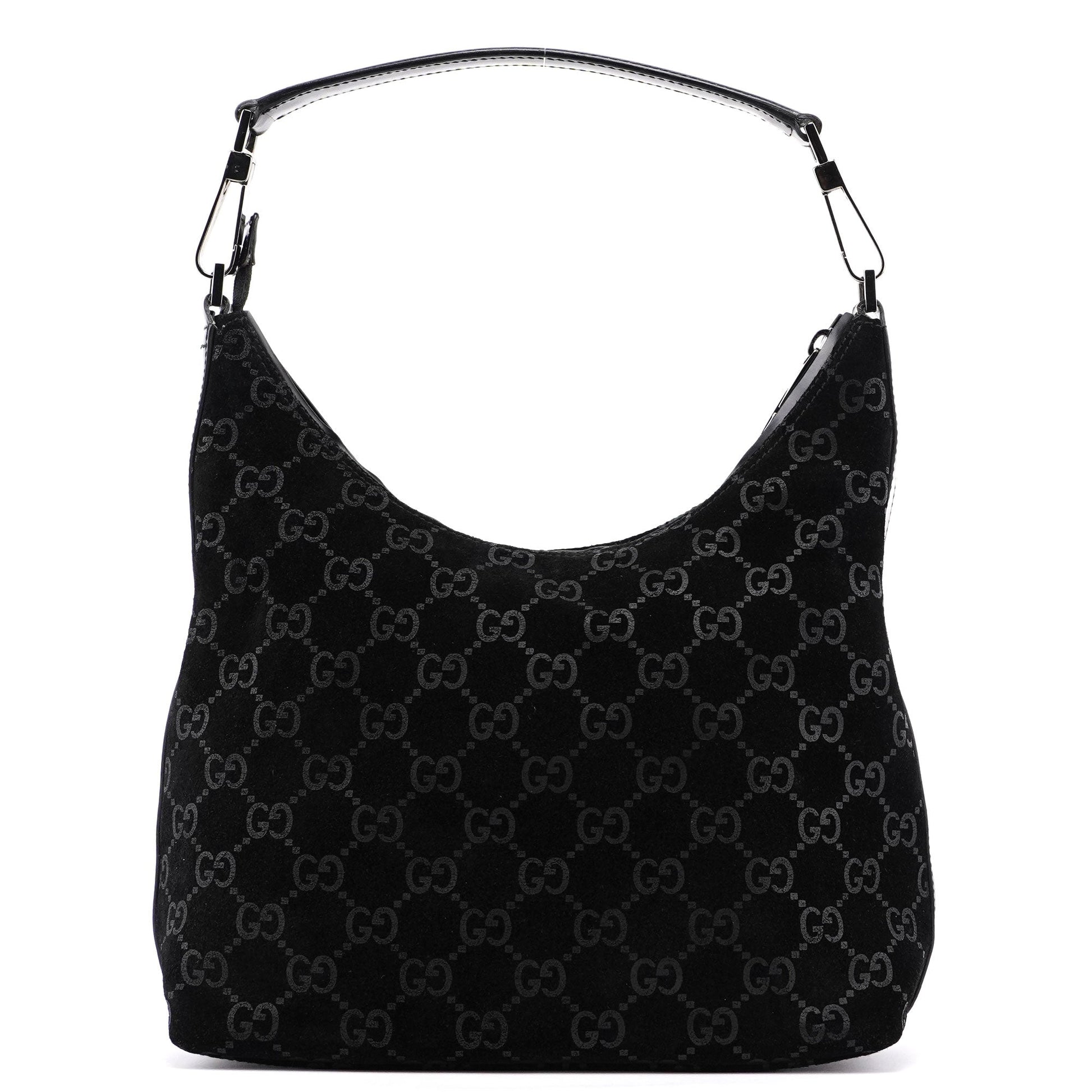 Unveil the elegance of the Gucci GG suede shoulder bag, designed by Tom Ford in 1997. This luxurious piece features silver-tone hardware with engraved Gucci logo, complemented by black calfskin leather trim. A zipper closure secures the satin-lined interior.