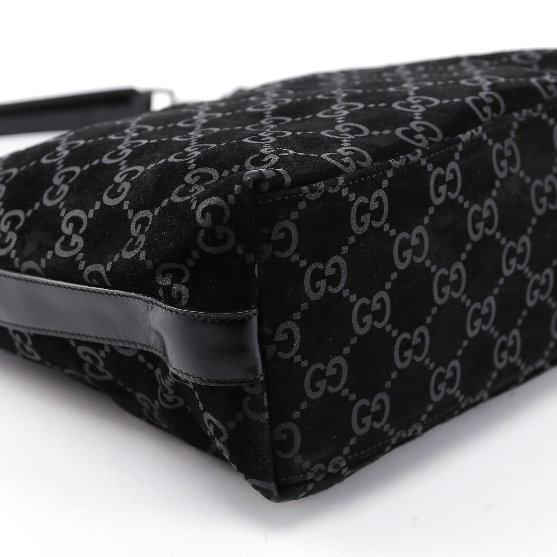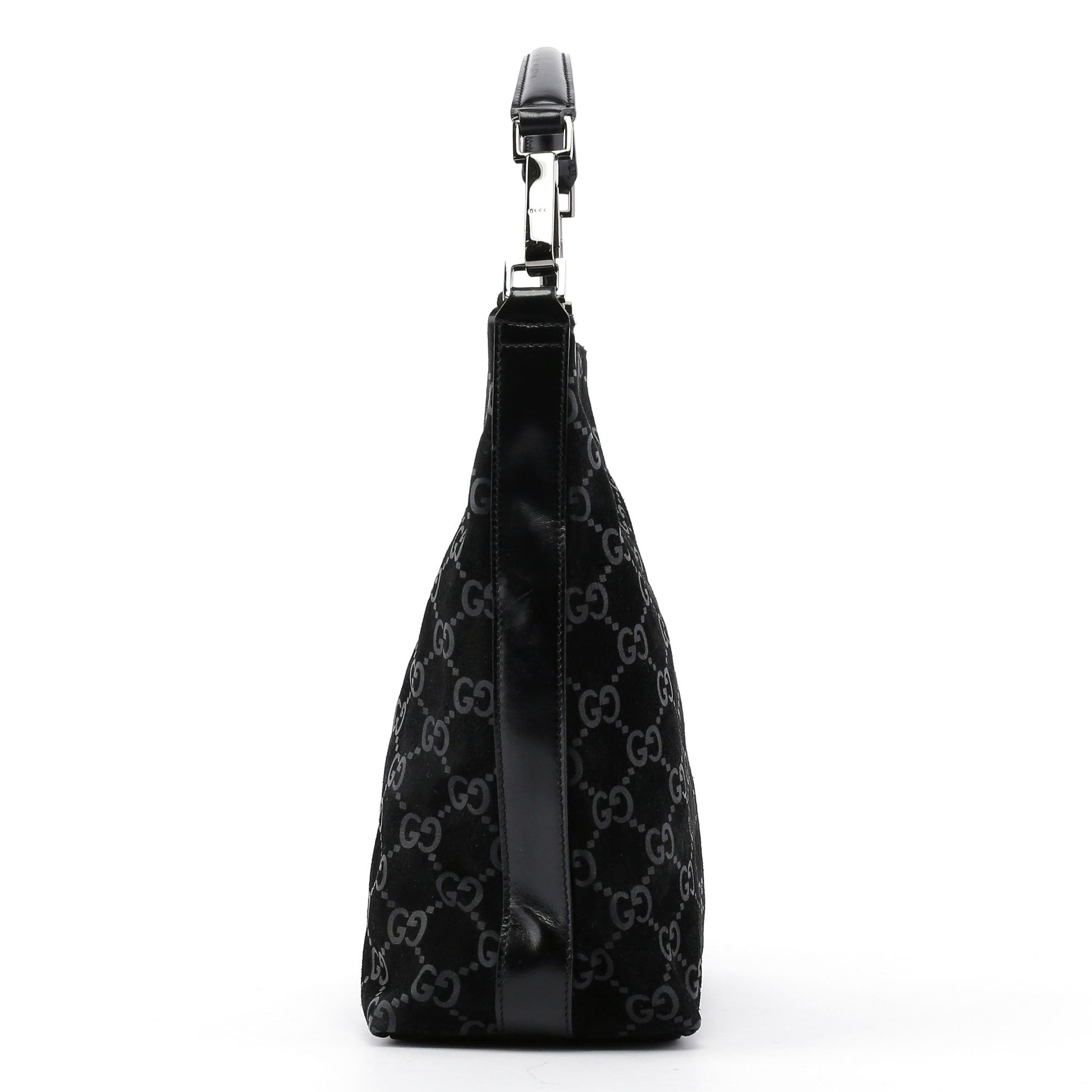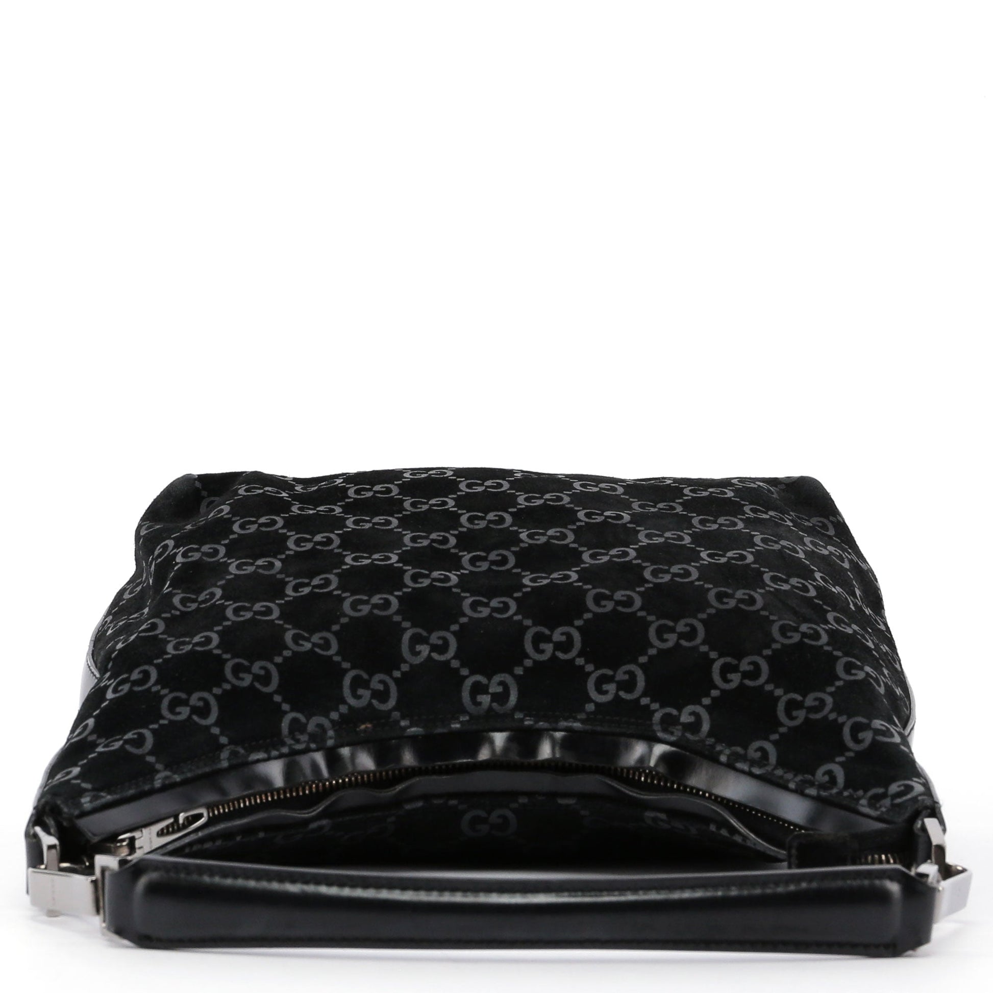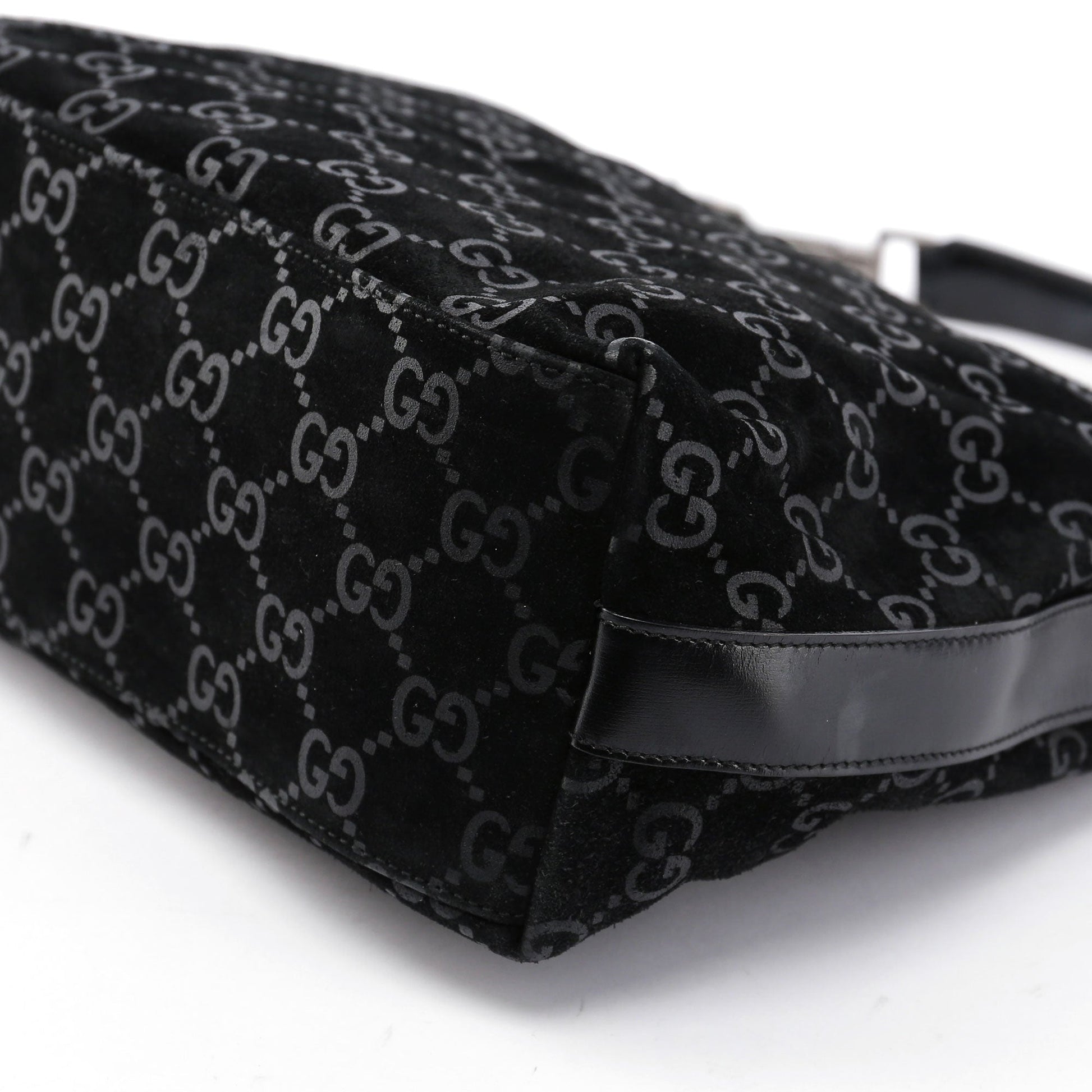 Unveil the elegance of the Gucci GG suede shoulder bag, designed by Tom Ford in 1997. This luxurious piece features silver-tone hardware with engraved Gucci logo, complemented by black calfskin leather trim. A zipper closure secures the satin-lined interior, making it a perfect fusion of timeless design and modern sophistication.