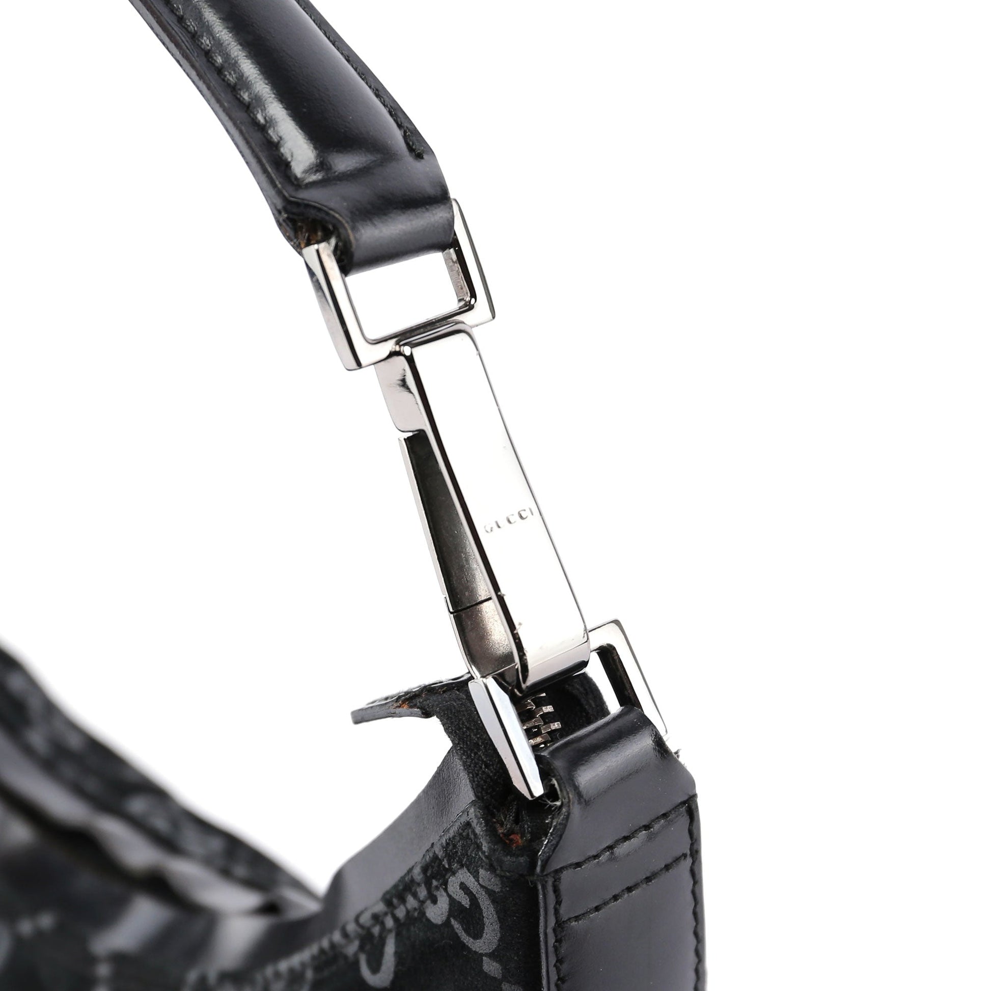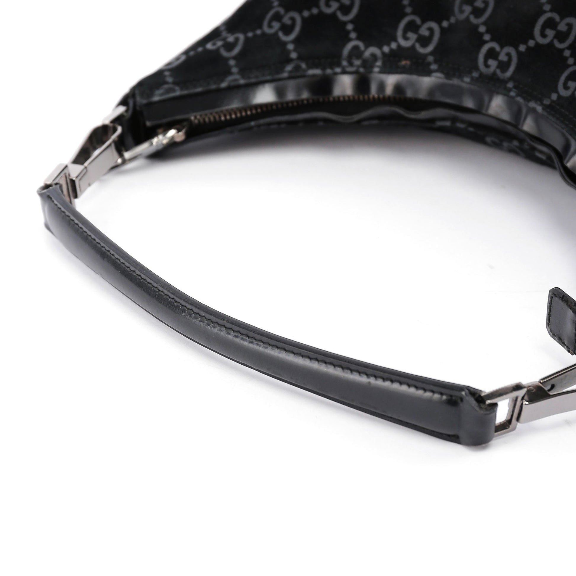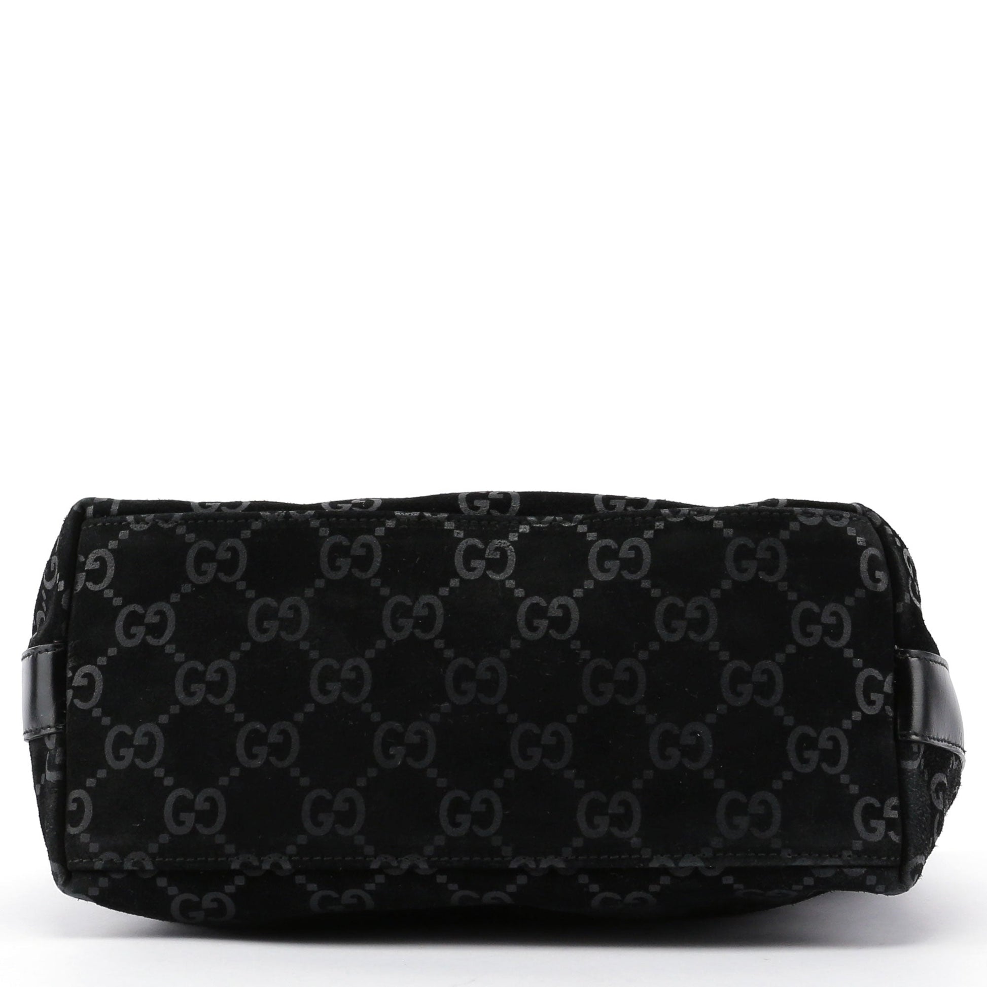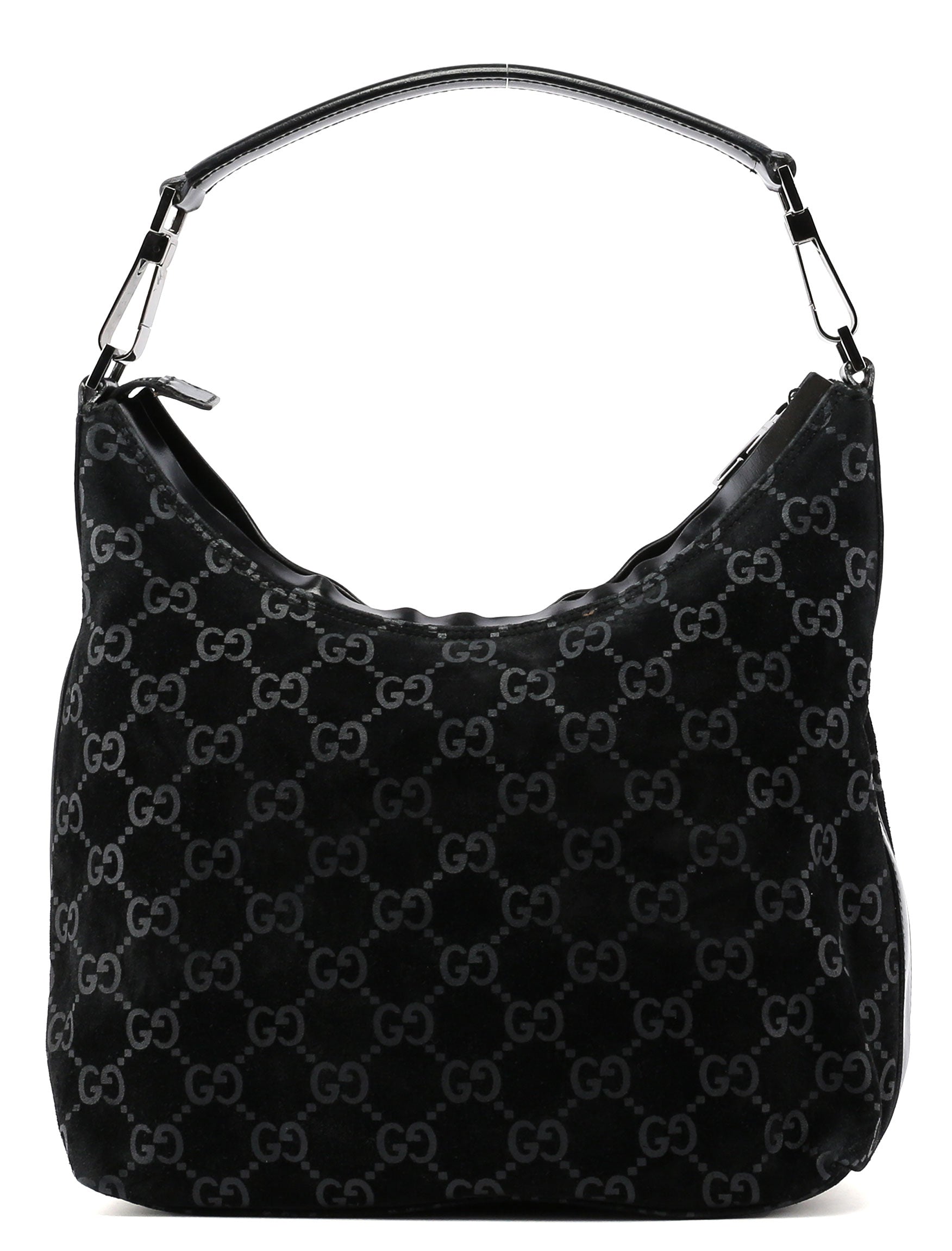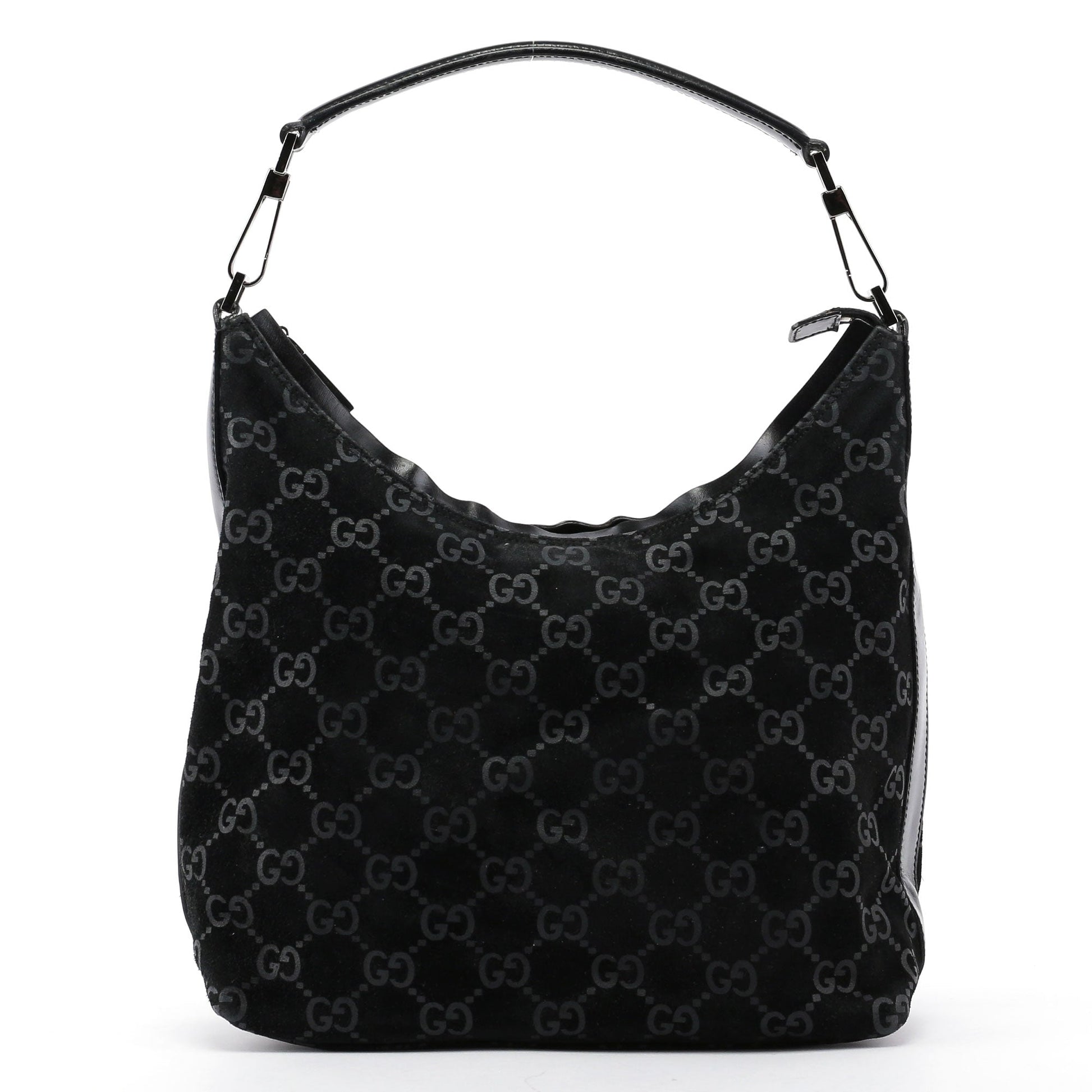 Unveil the elegance of the Gucci GG suede shoulder bag, designed by Tom Ford in 1997. This luxurious piece features silver-tone hardware with engraved Gucci logo, complemented by black calfskin leather trim. A zipper closure secures the satin-lined interior, making it a perfect fusion of timeless design and modern sophistication.