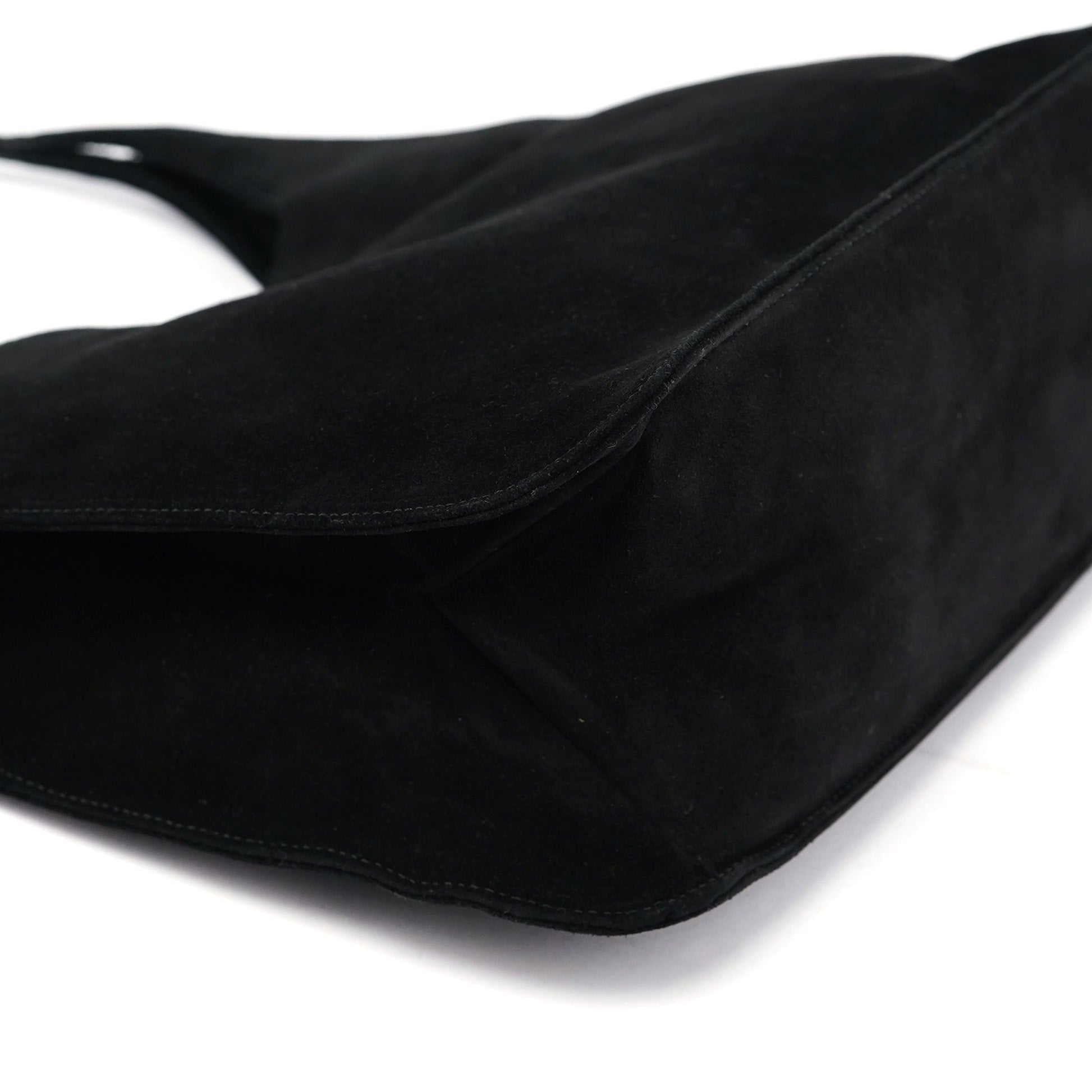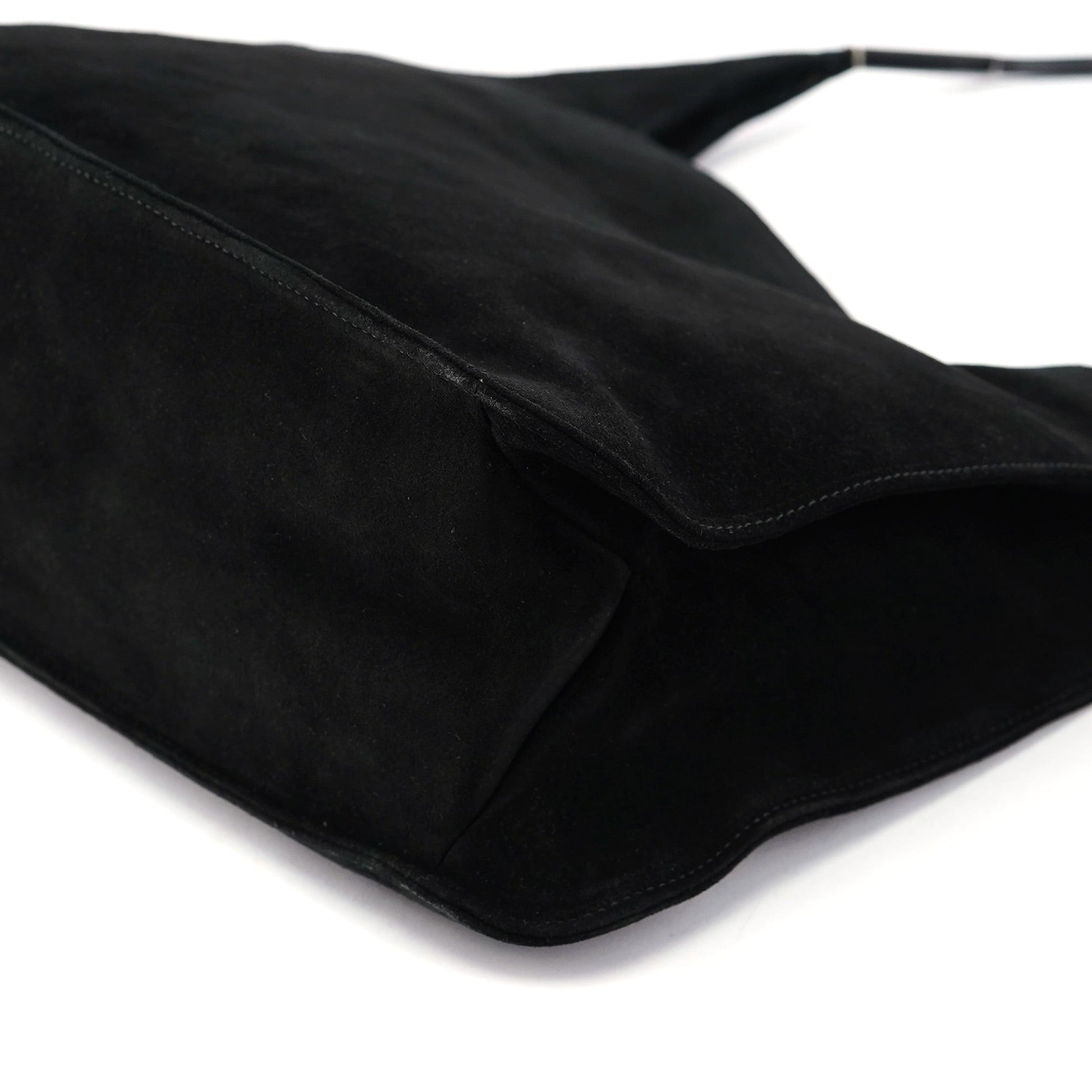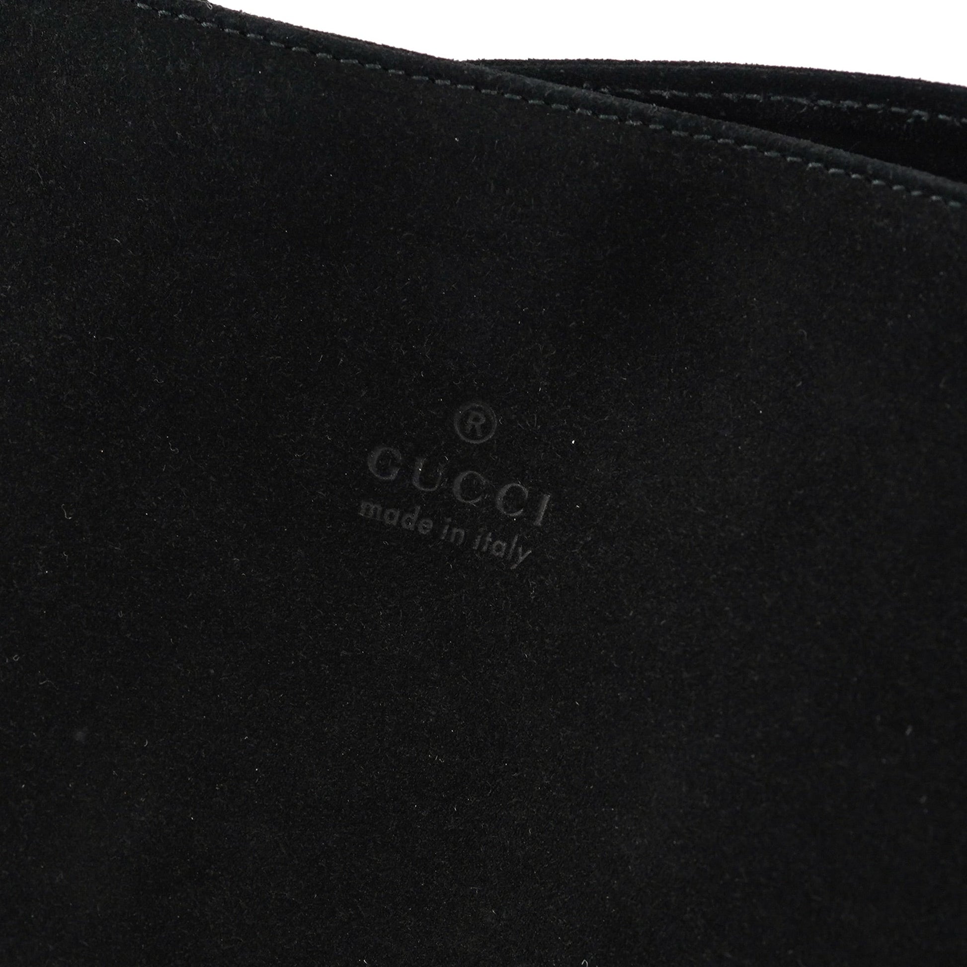 Designed by Tom Ford in the late 1990s, the Gucci Scamosciato shoulder bag is handcrafted from black suede and tonal calfskin leather. It features silver-tone hardware with Gucci logo engraving, a magnetic closure, and a calfskin leather-lined interior with a zipper pocket. The Gucci logo is embossed at the front, adding a signature touch.