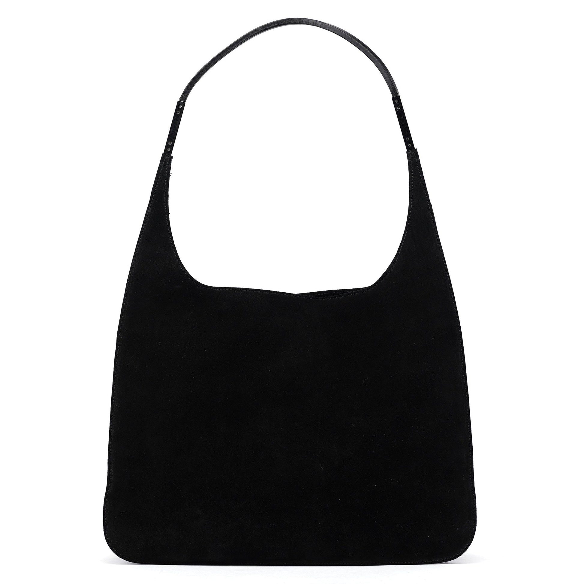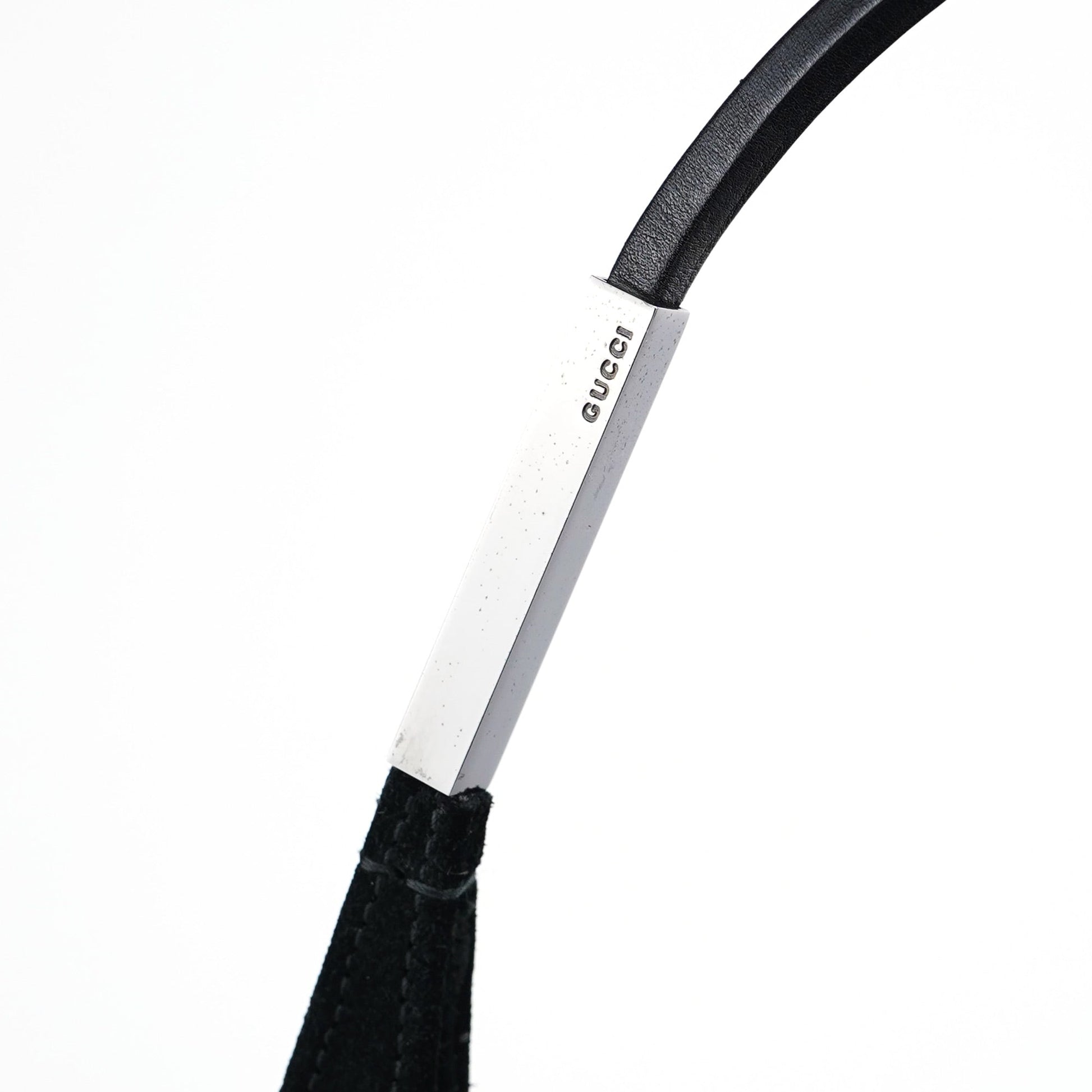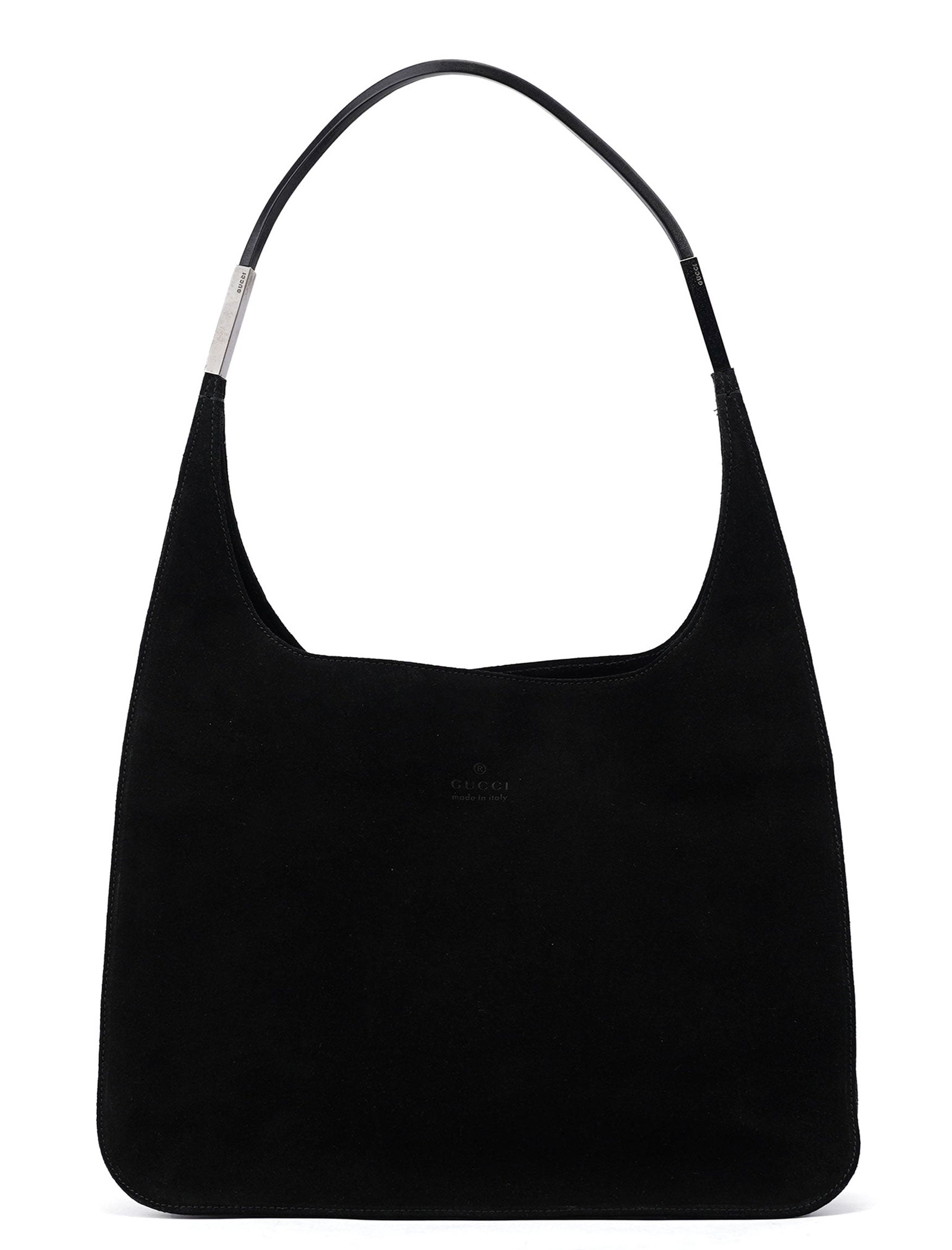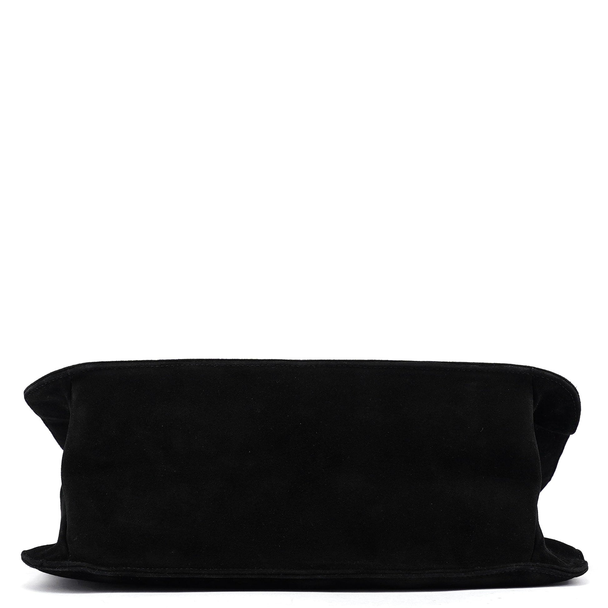 Designed by Tom Ford in the late 1990s, the Gucci Scamosciato shoulder bag is handcrafted from black suede and tonal calfskin leather. It features silver-tone hardware with Gucci logo engraving, a magnetic closure, and a calfskin leather-lined interior with a zipper pocket. The Gucci logo is embossed at the front, adding a signature touch.