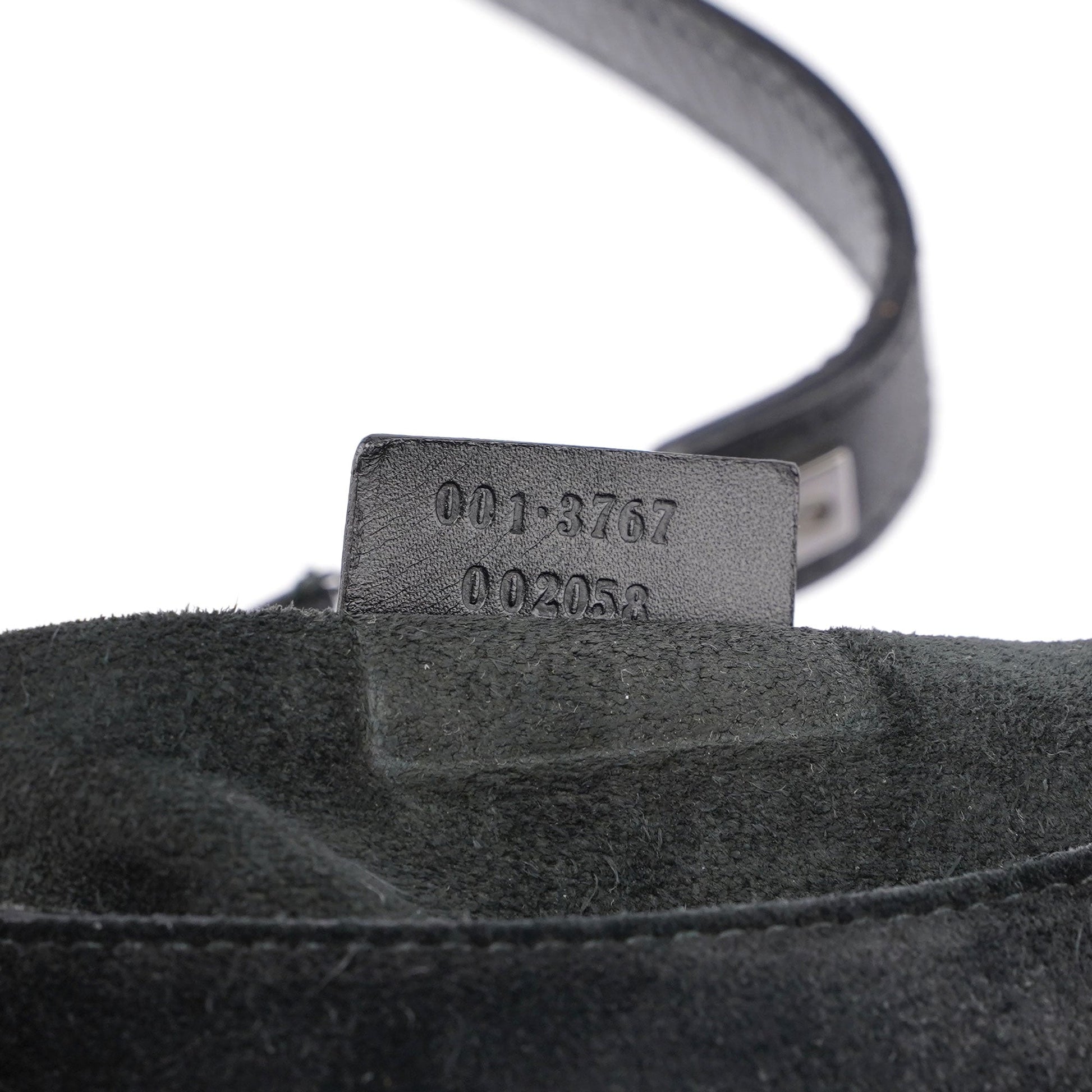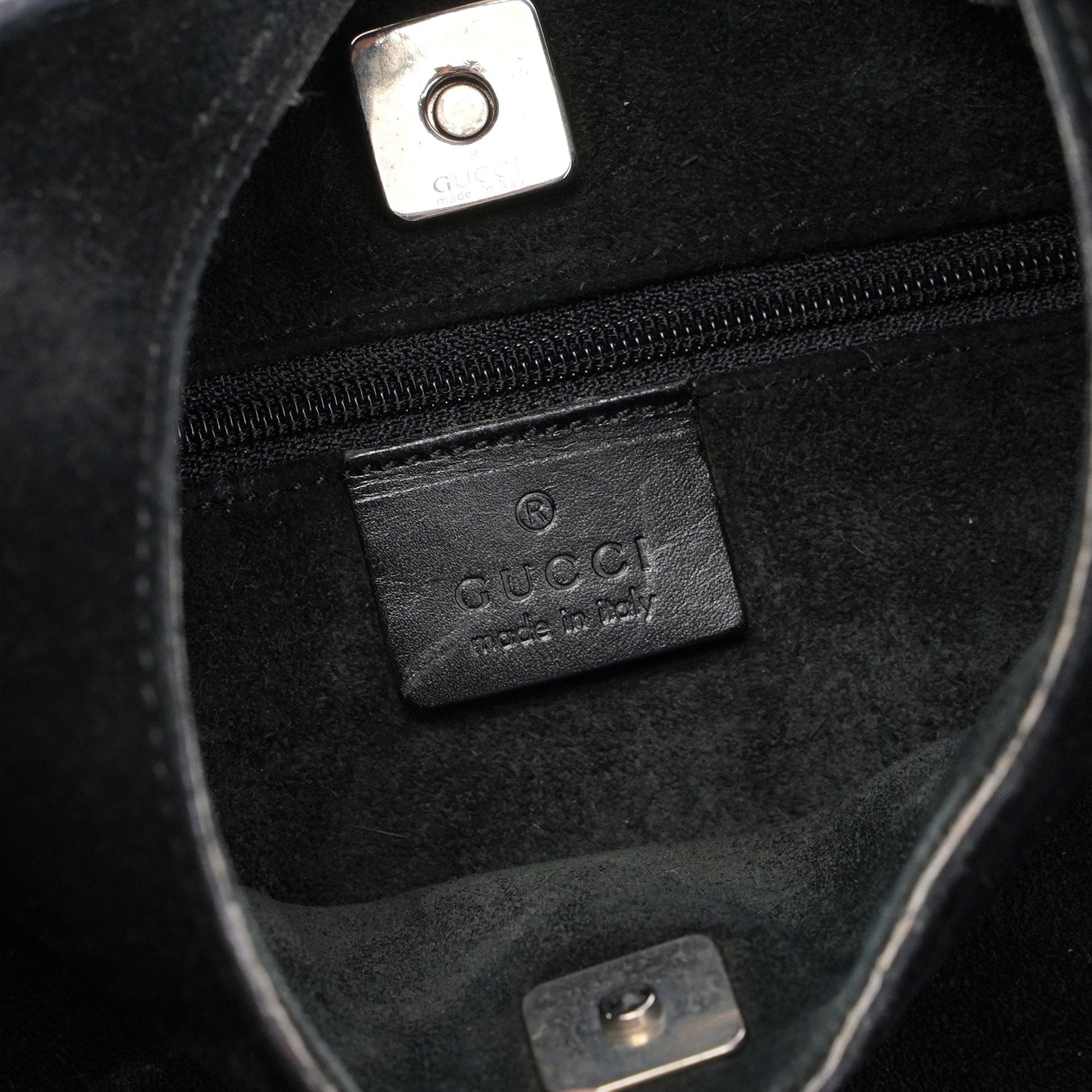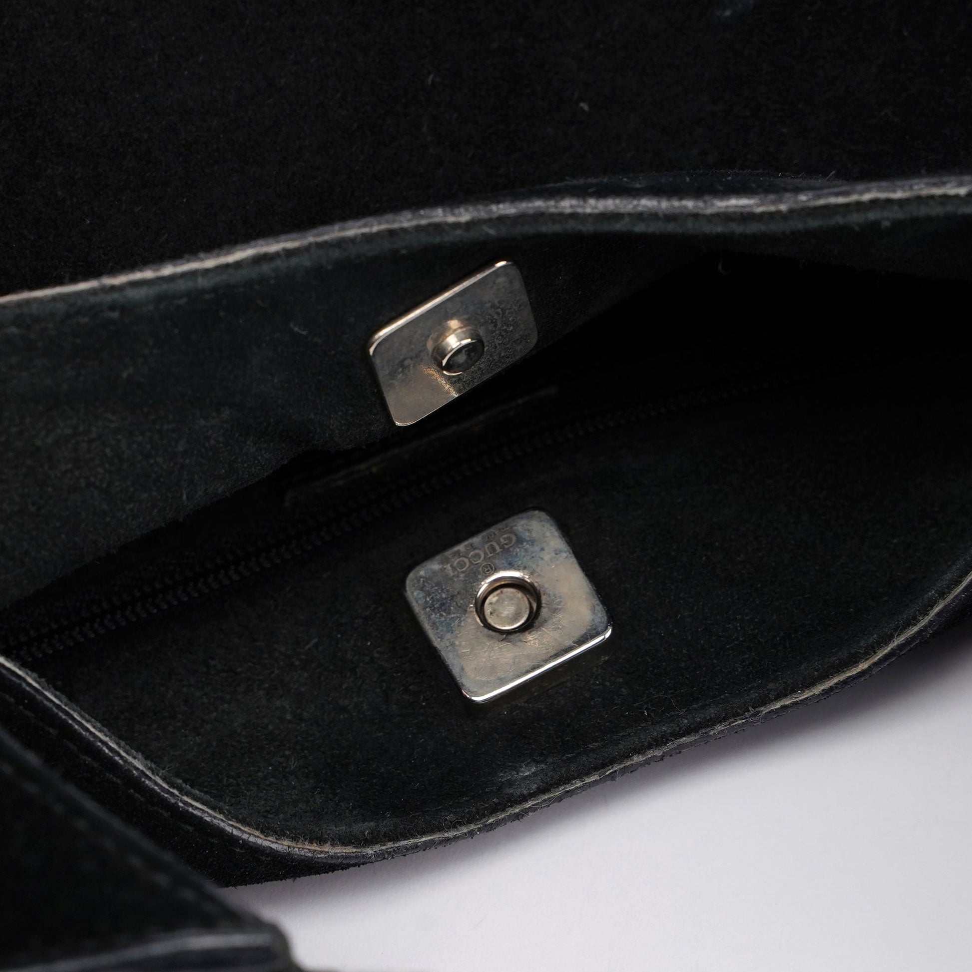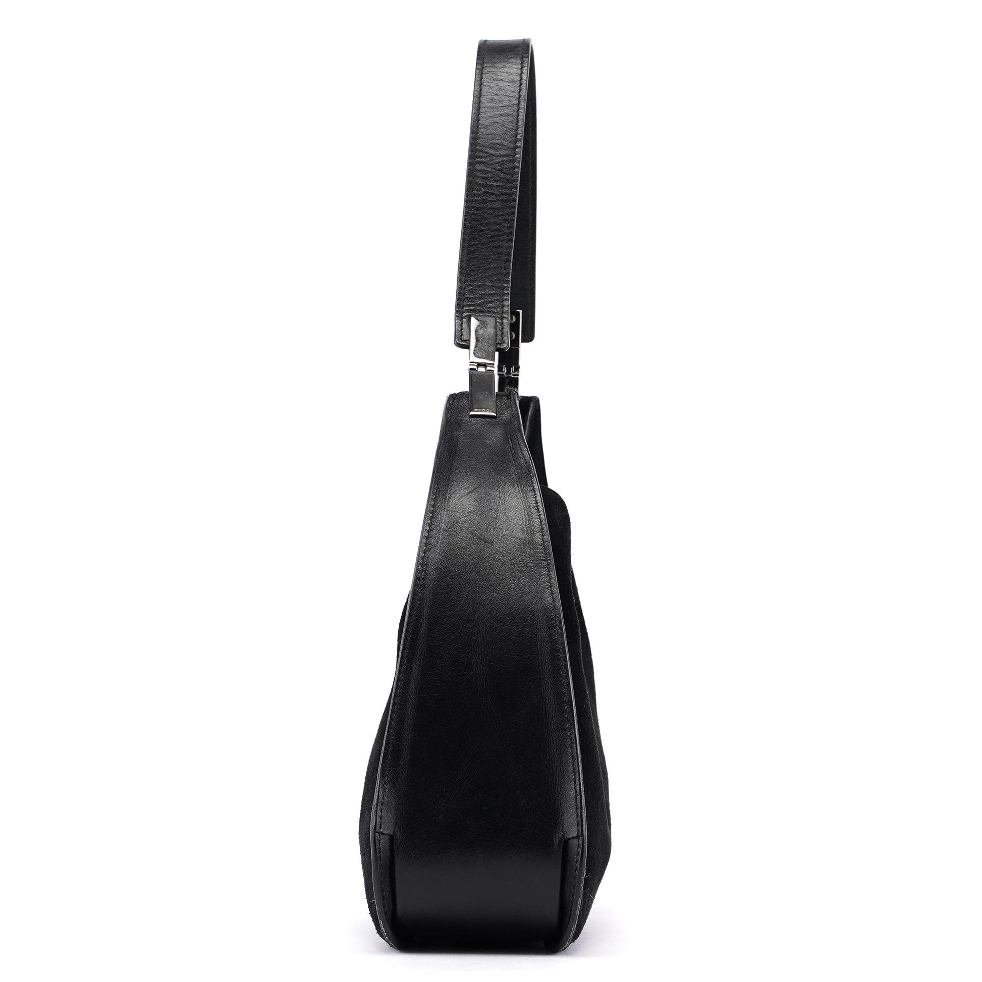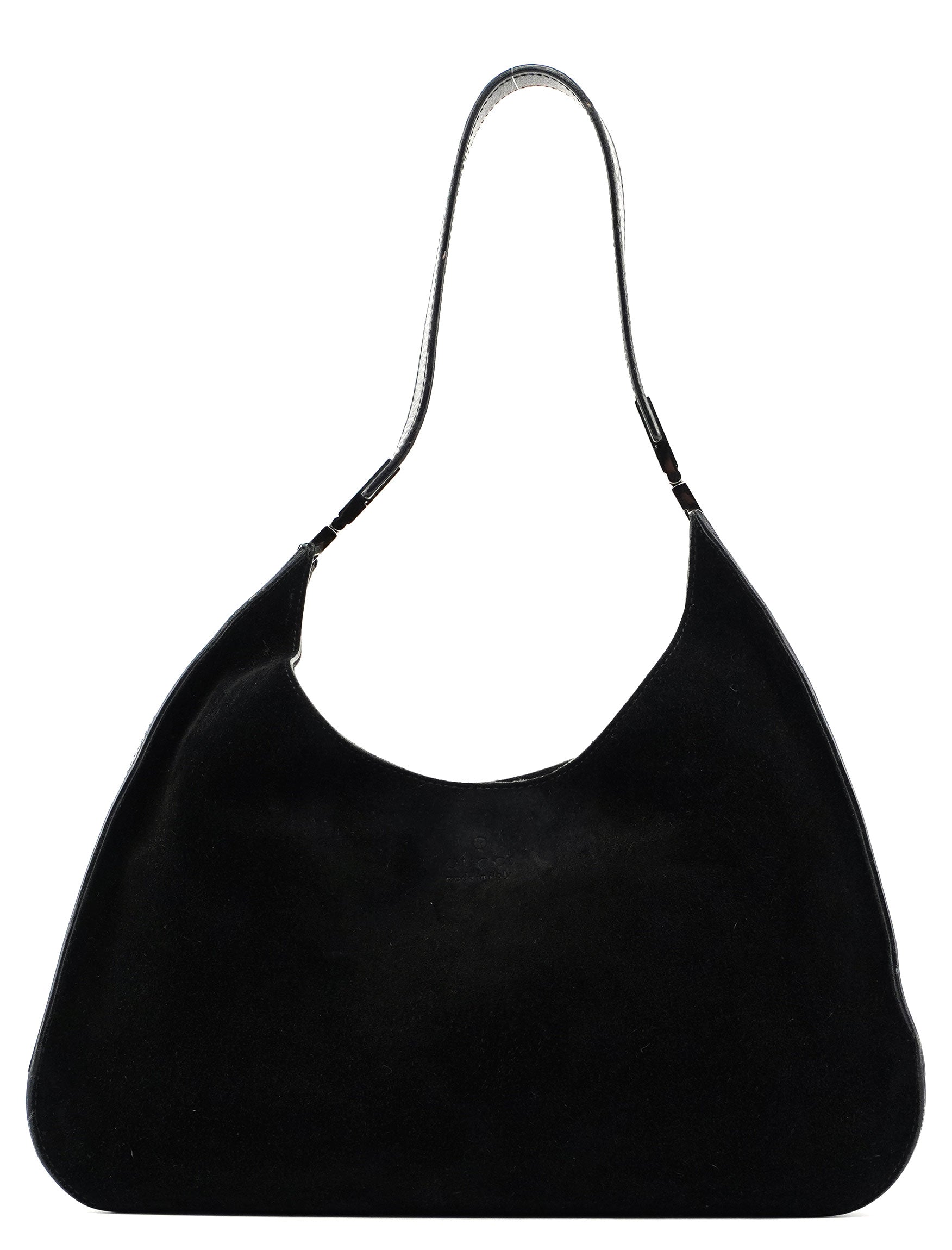 Designed by Tom Ford in the late 1990's, this Gucci Scamosciato shoulder bag exudes elegance. Handcrafted in black suede and tonal leather trim, it boasts silver-tone hardware engraved with the Gucci logo. The magnetic closure opens to a suede-lined interior featuring a zipper pocket.