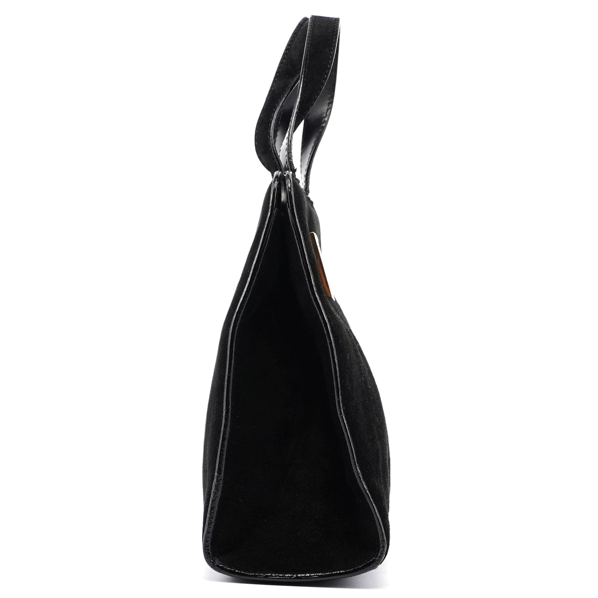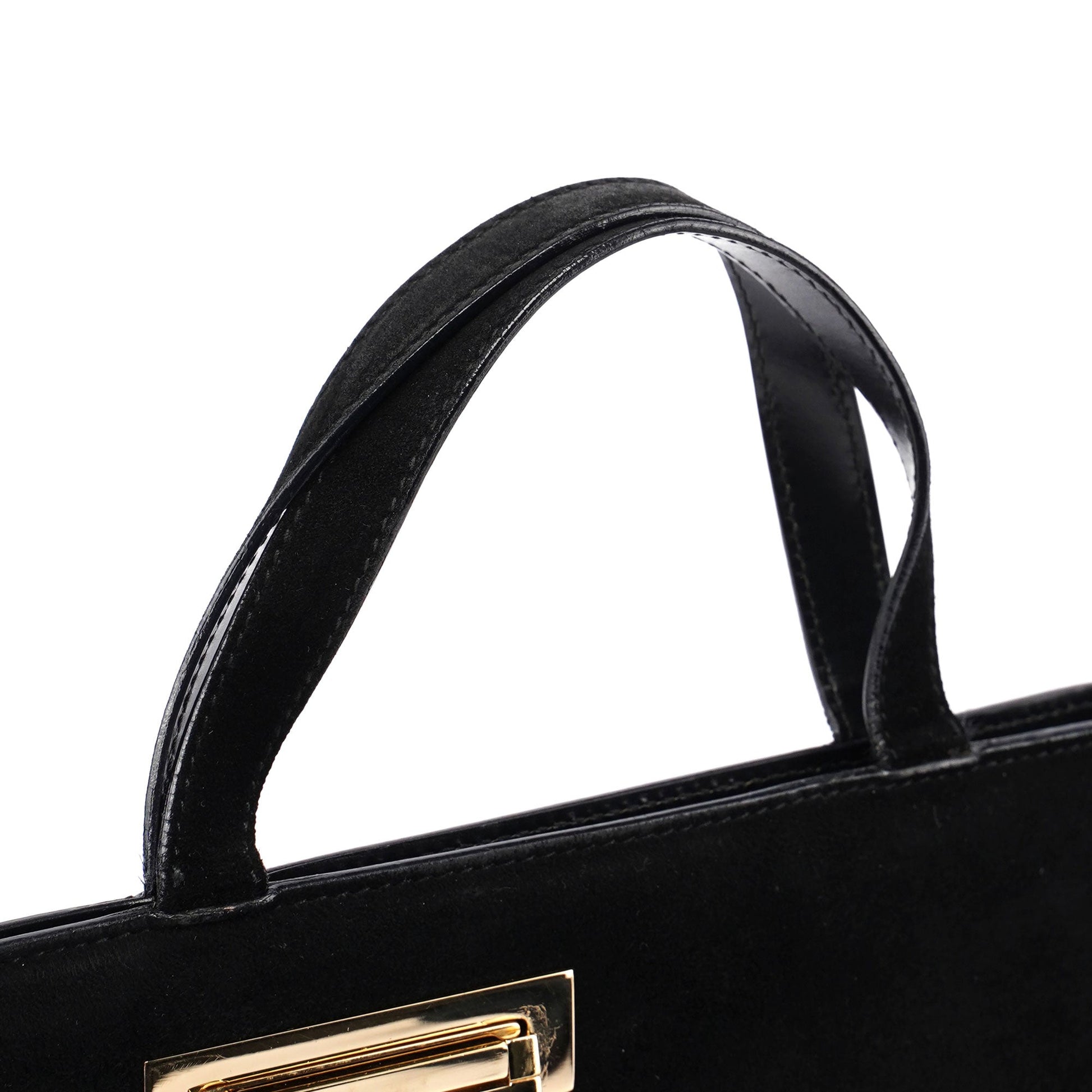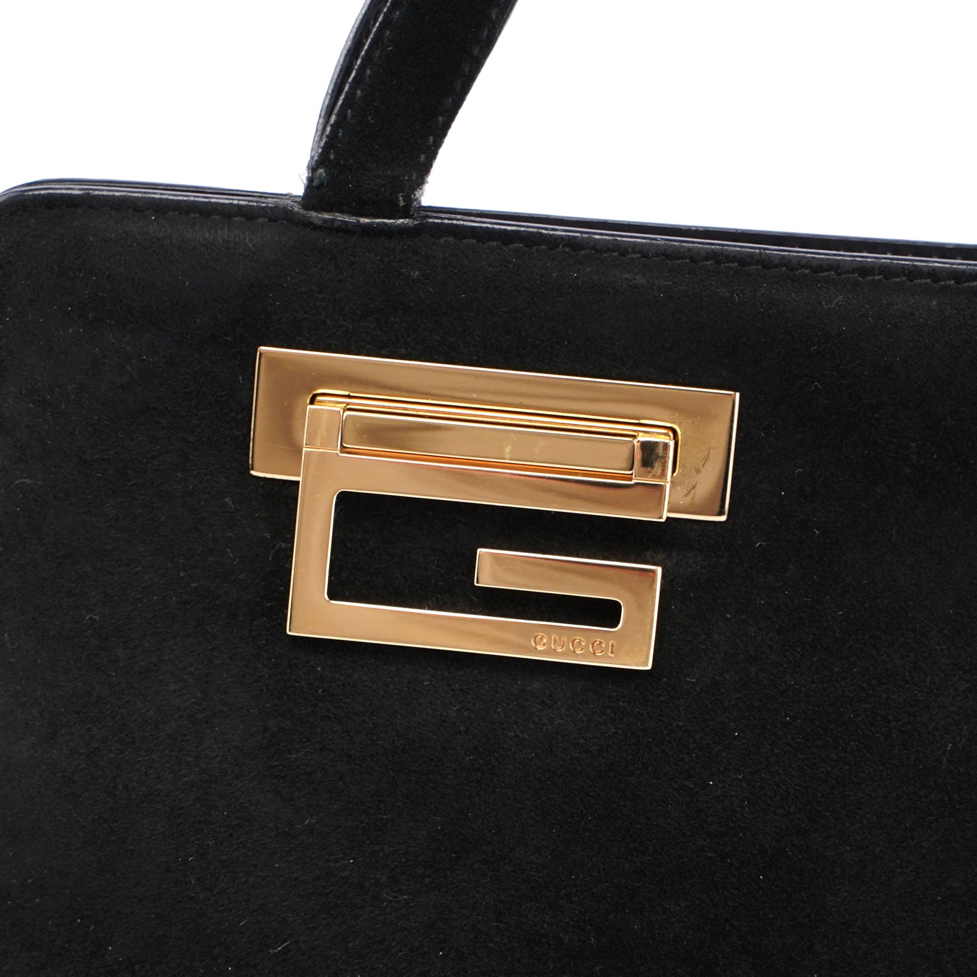 Introducing the Gucci Square G mini tote bag, designed by Tom Ford in the late 1990s. Crafted from luxurious black suede with calfskin leather trim, it features a gold-tone Square G closure with Gucci logo engraving. The interior, lined in suede, includes a zipper pocket for organization.