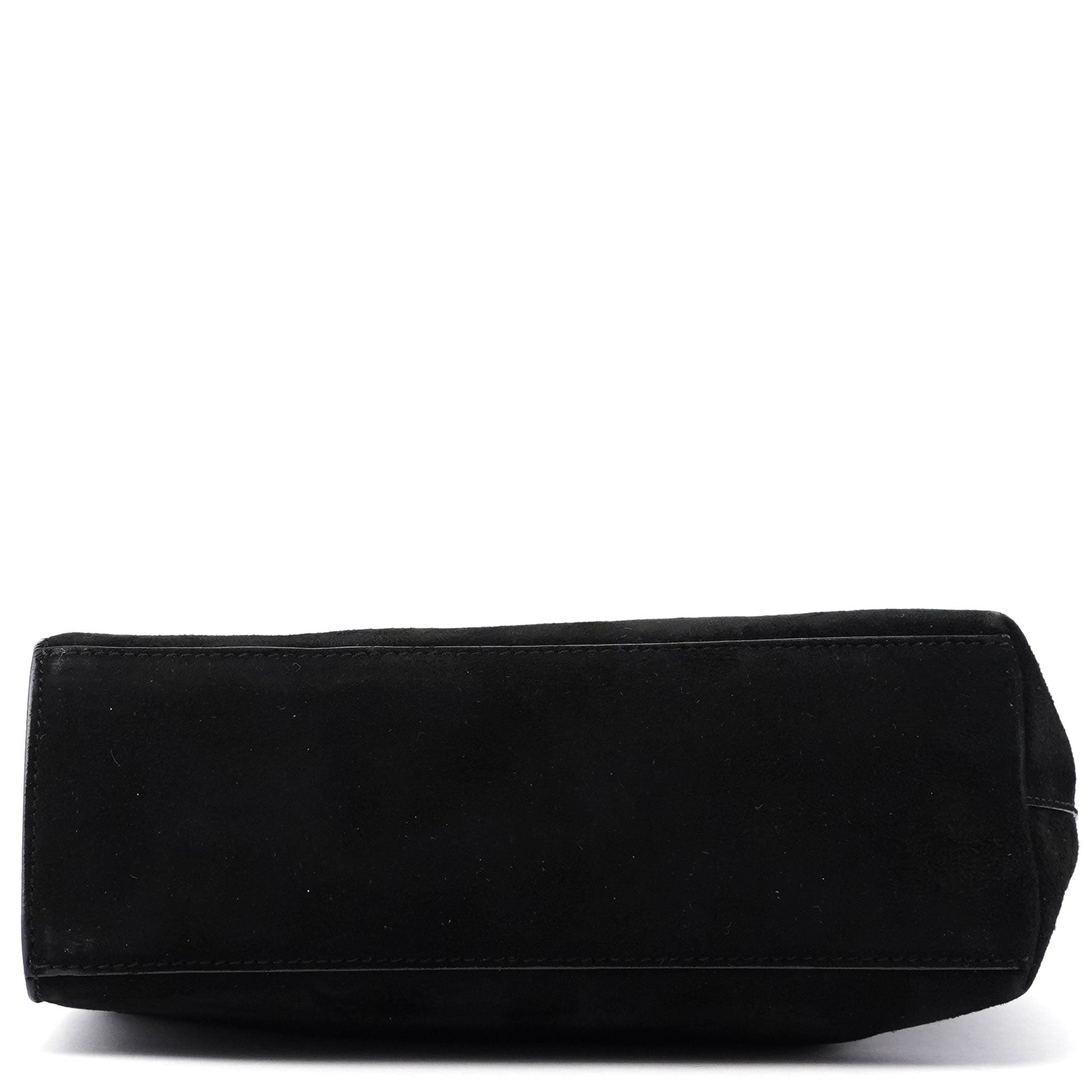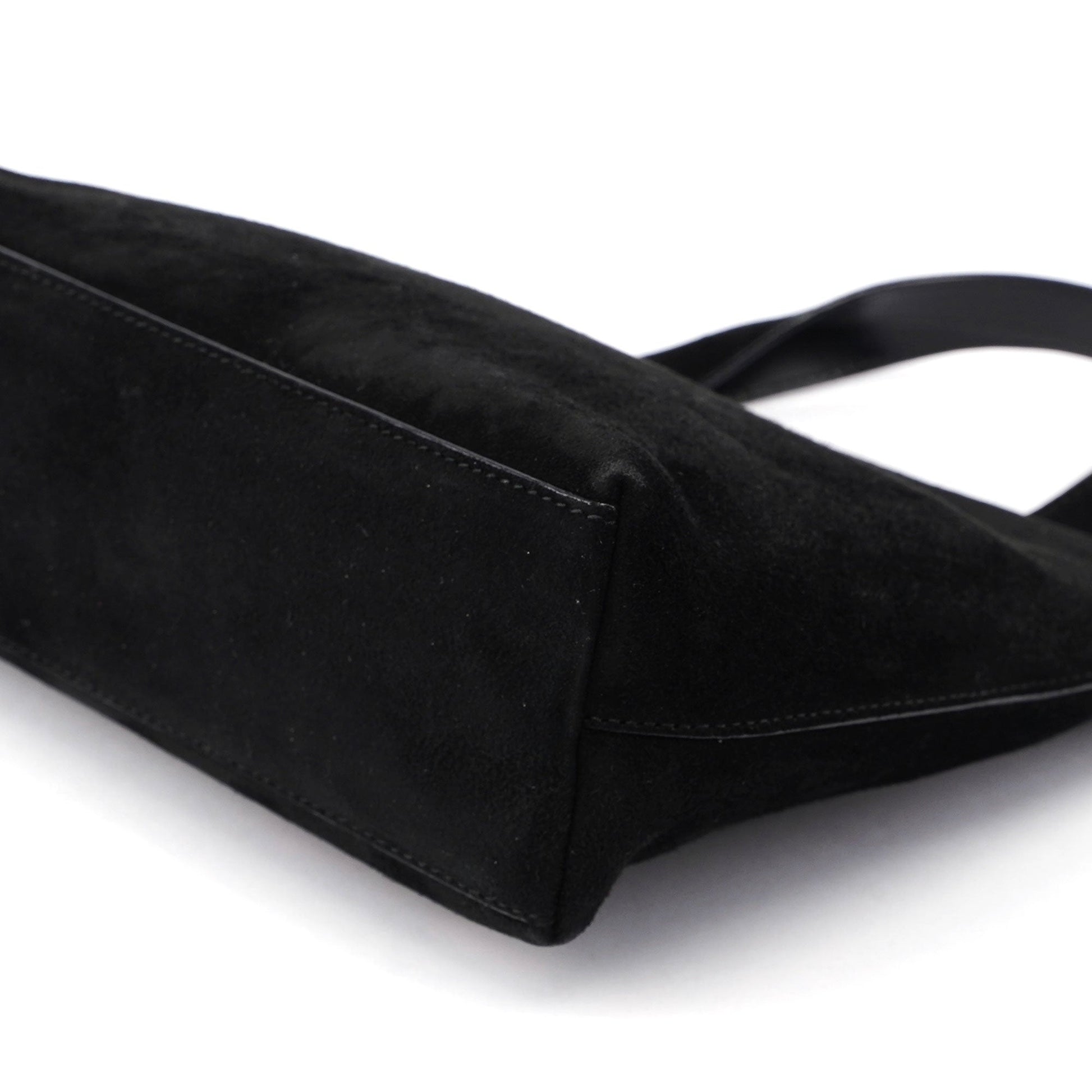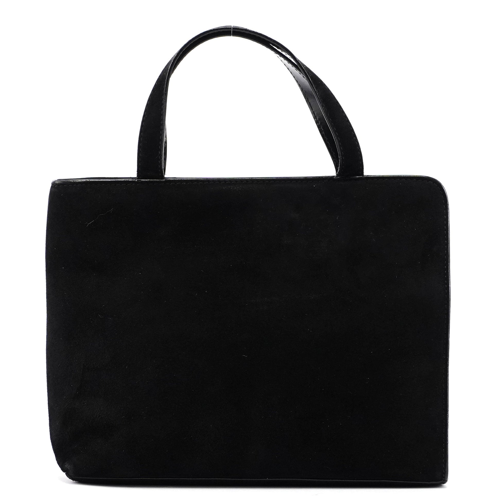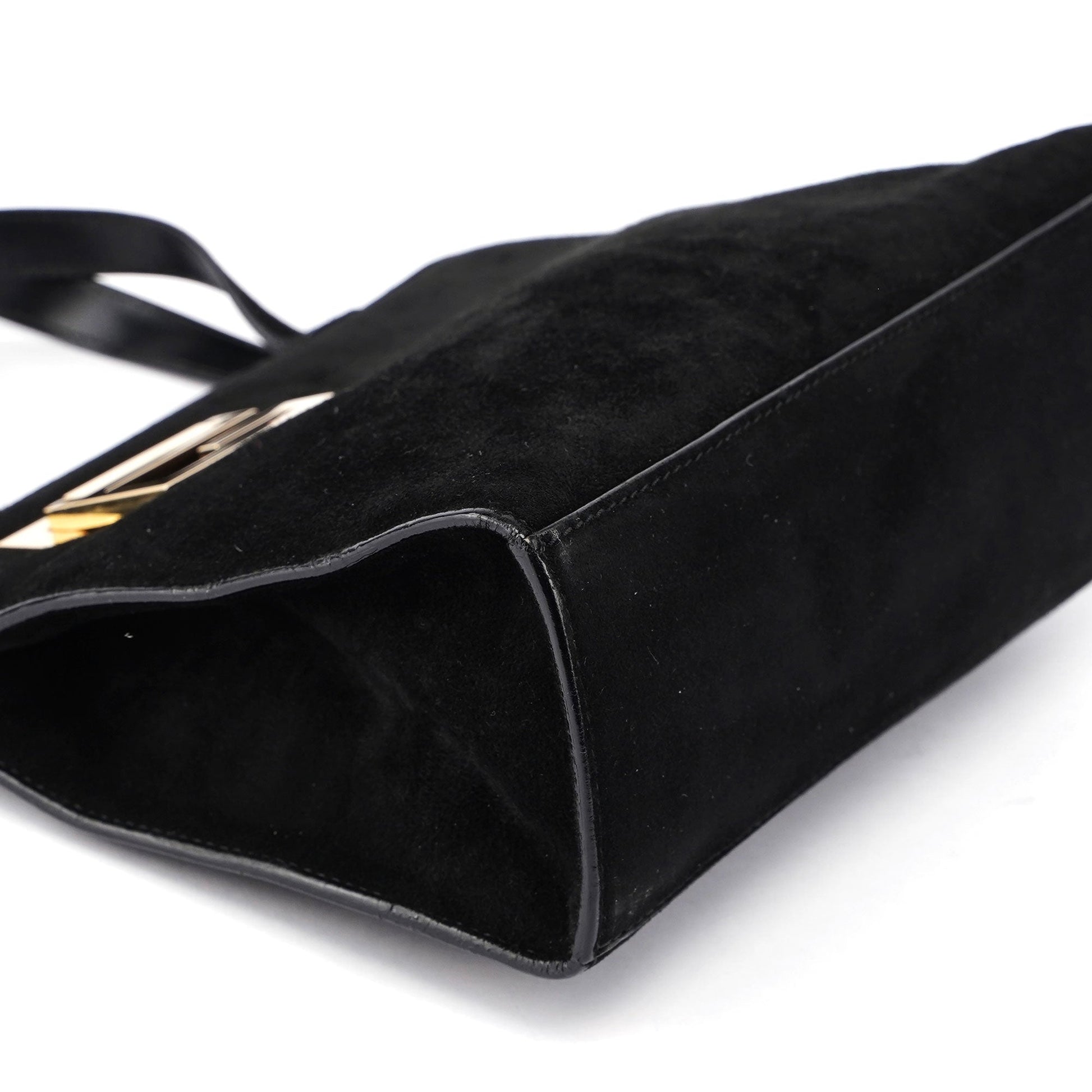 Introducing the Gucci Square G mini tote bag, designed by Tom Ford in the late 1990s. Crafted from luxurious black suede with calfskin leather trim, it features a gold-tone Square G closure with Gucci logo engraving. The interior, lined in suede, includes a zipper pocket for organization.