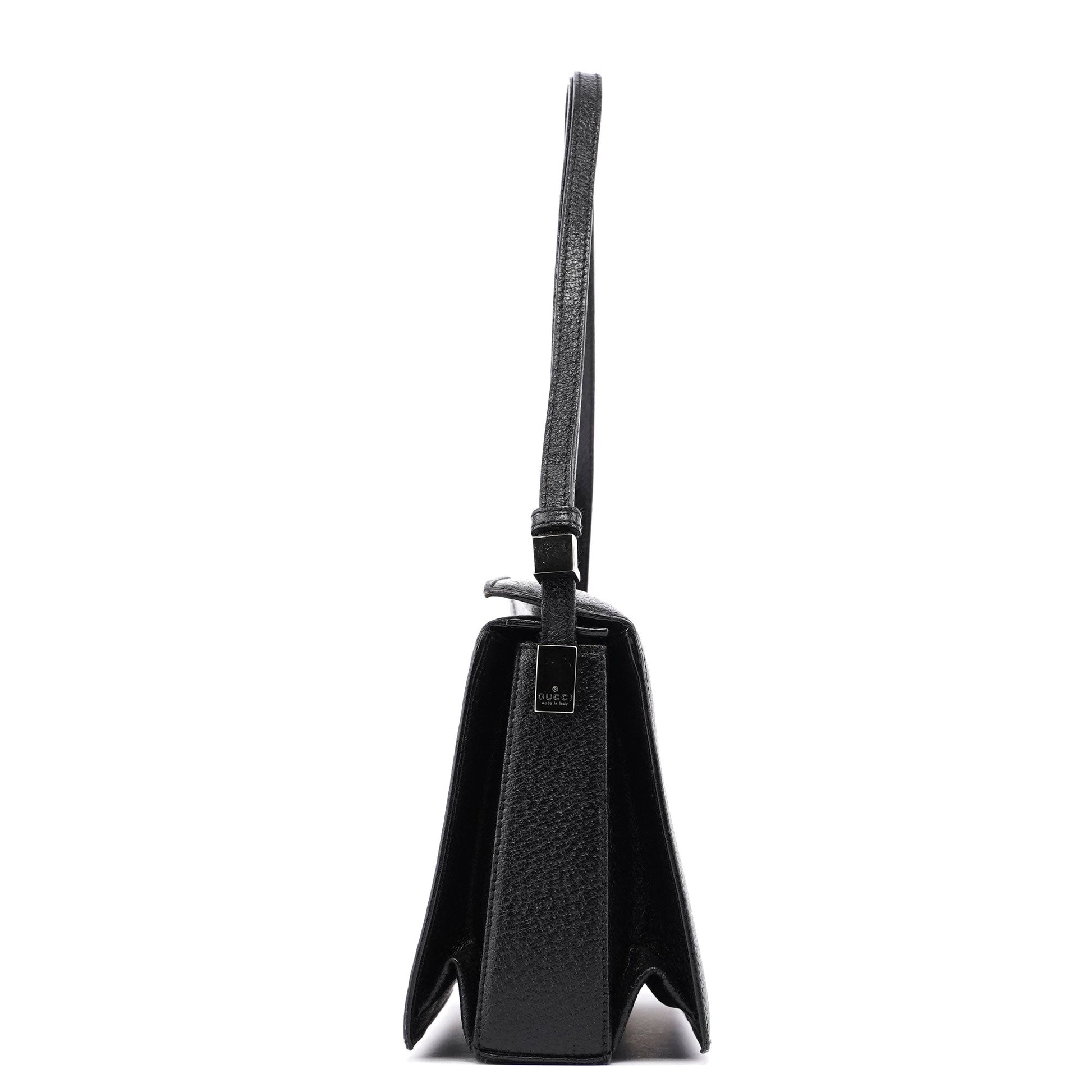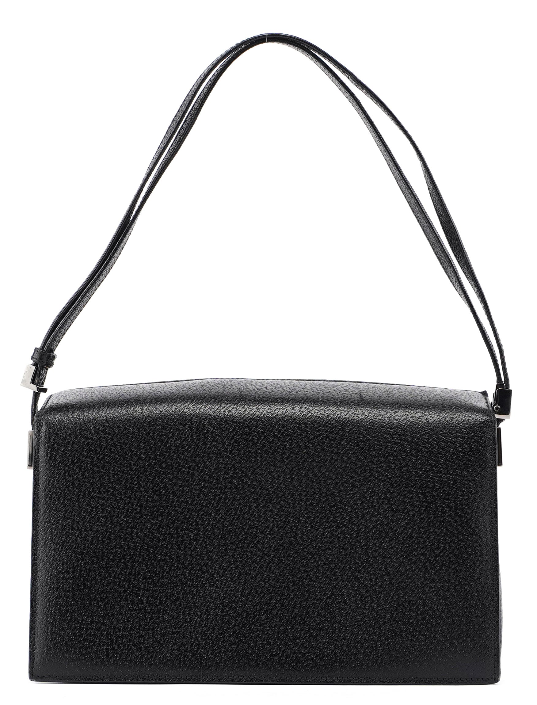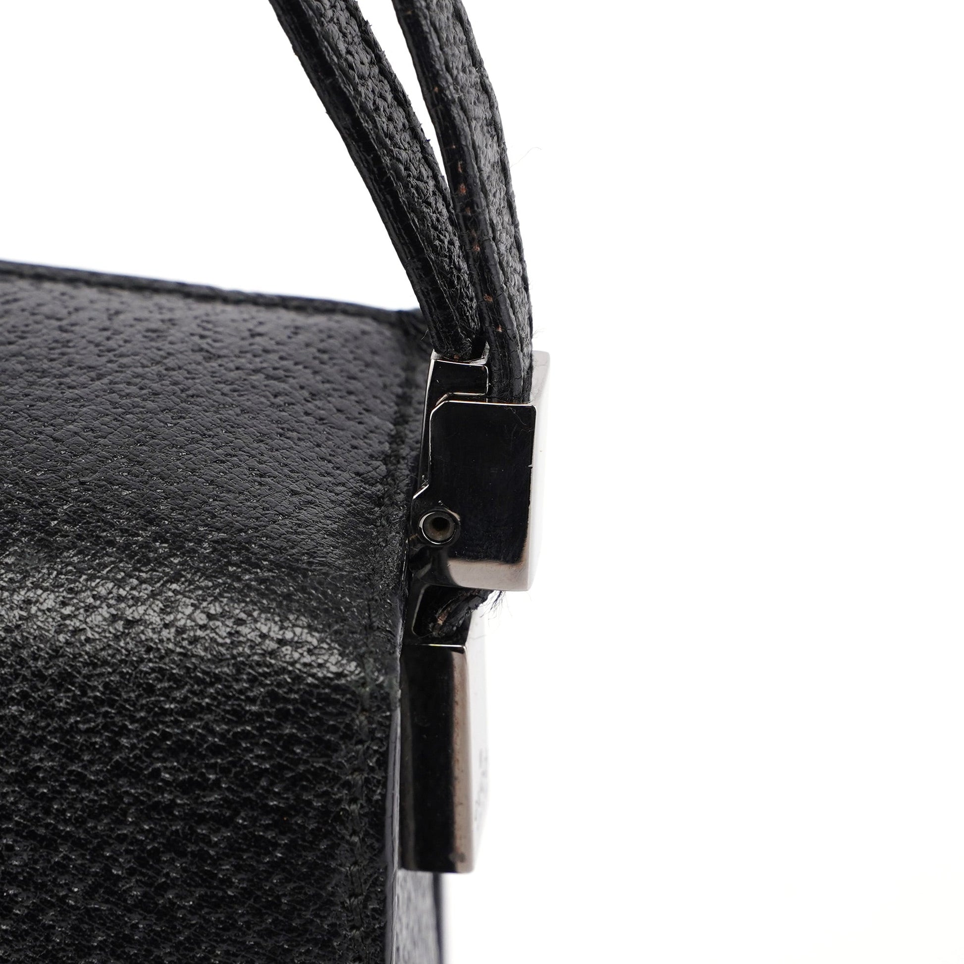 This Gucci mini bag, designed by Tom Ford in the late 1990s, is handcrafted from black textured leather. It features silver-tone hardware engraved with the Gucci logo, a magnetic closure, an adjustable handle and a satin-lined interior with an interior zipper pocket, showcasing understated elegance.