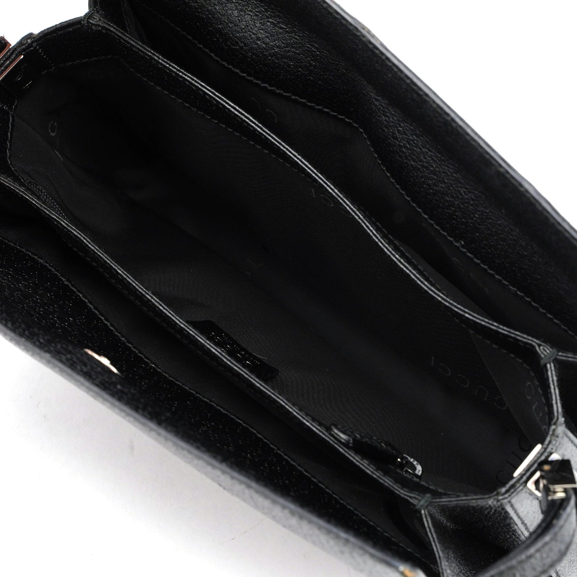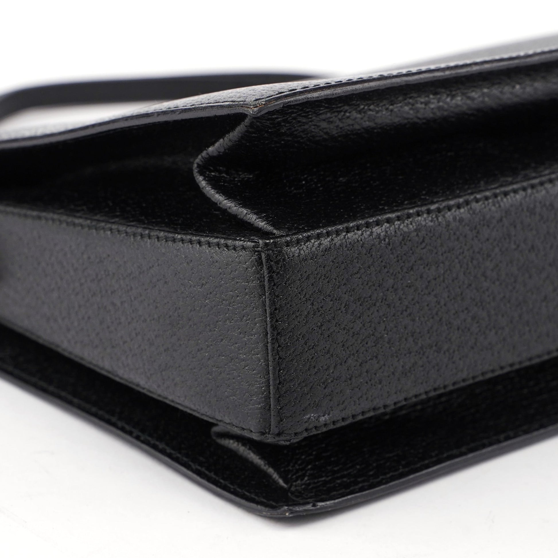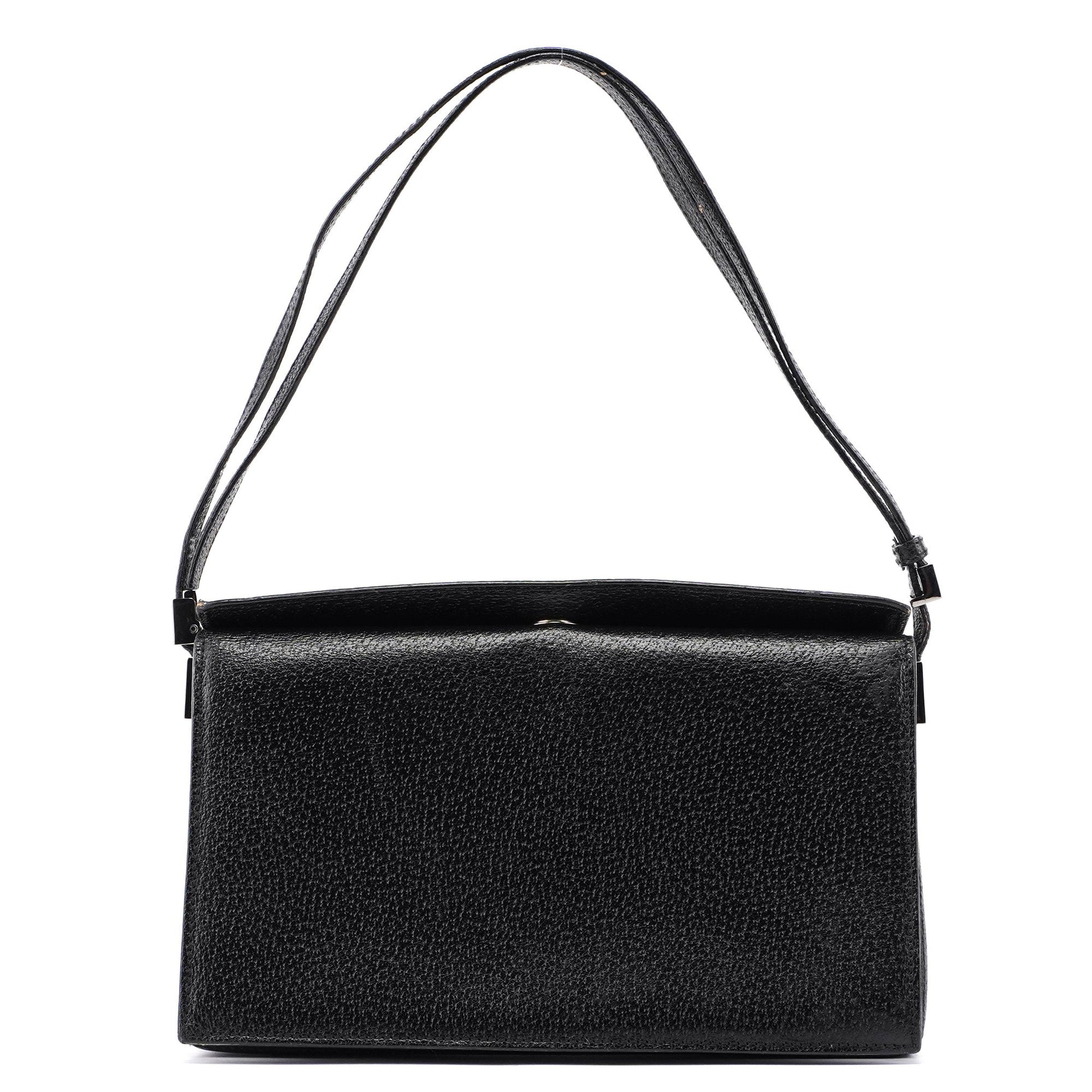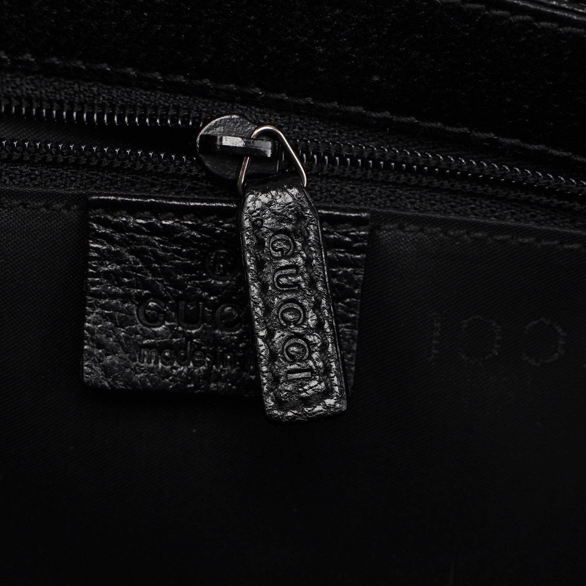 This Gucci mini bag, designed by Tom Ford in the late 1990s, is handcrafted from black textured leather. It features silver-tone hardware engraved with the Gucci logo, a magnetic closure, an adjustable handle and a satin-lined interior with an interior zipper pocket, showcasing understated elegance.
