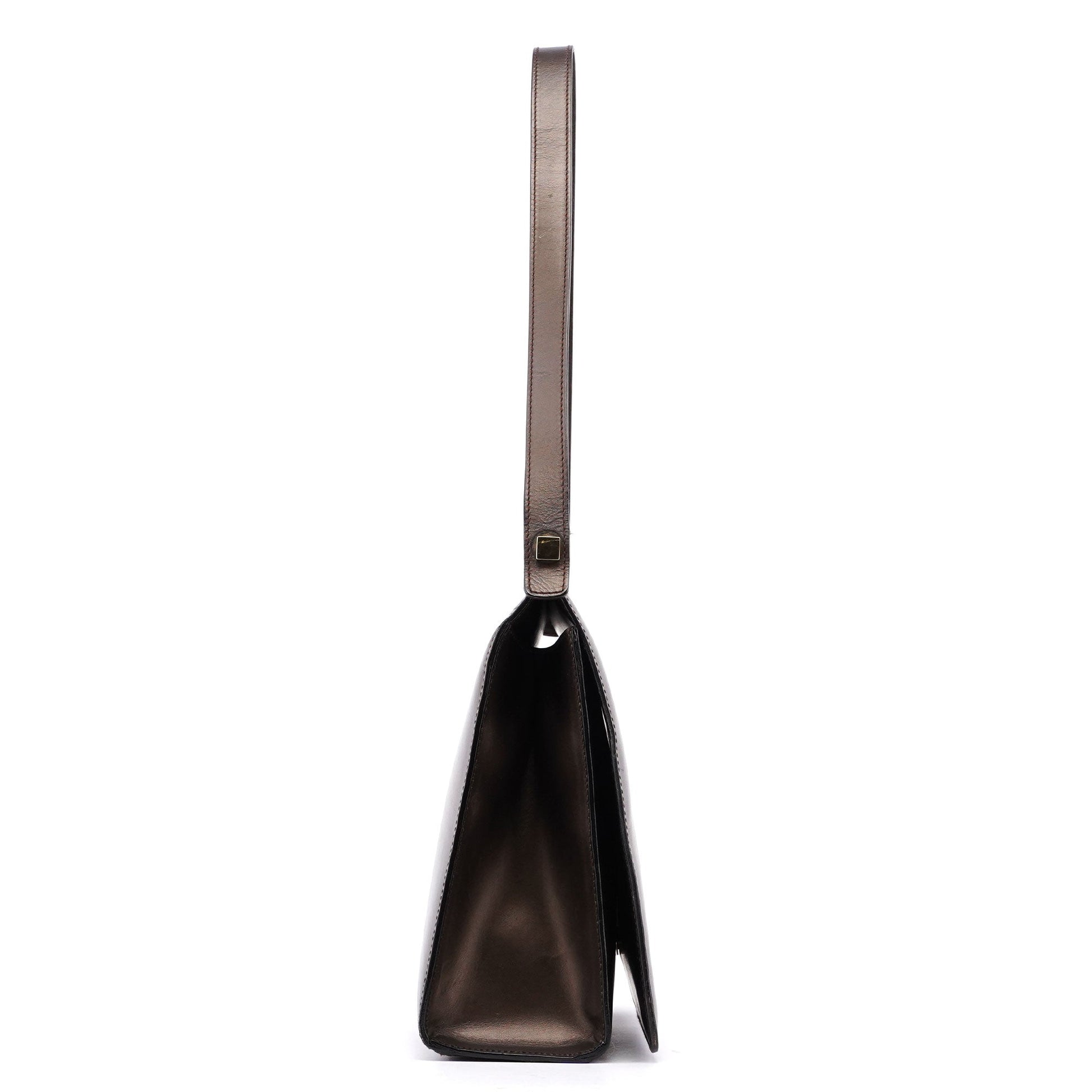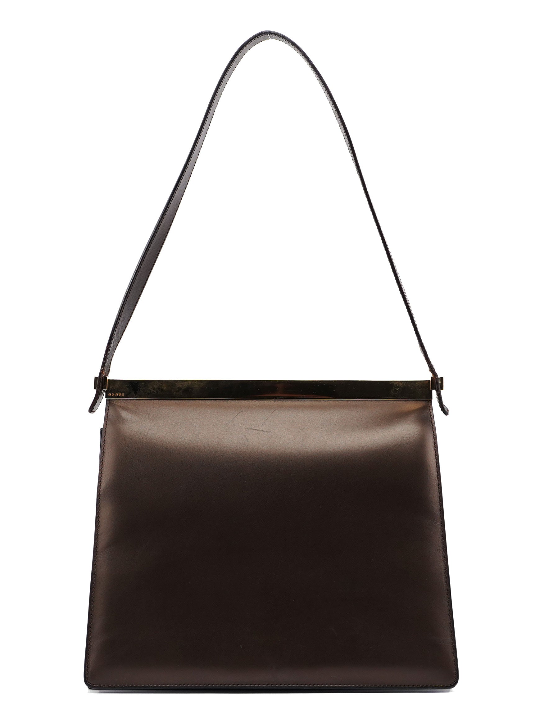 Introducing the Gucci handbag, crafted from bronze-colored leather and designed by Tom Ford in the late 1990s. It features gold-tone hardware engraved with the Gucci logo and a magnetic flap closure for easy access. Inside, the leather interior includes a zipper pocket for organization, combining style and functionality seamlessly.