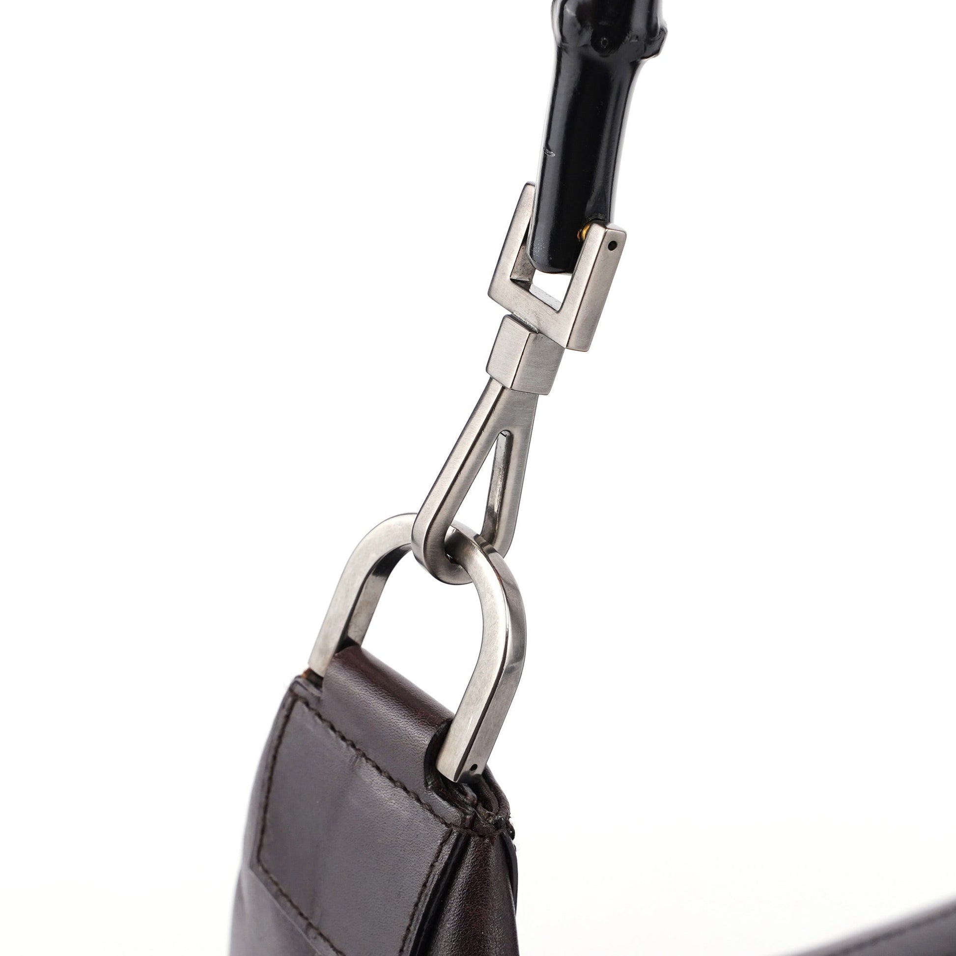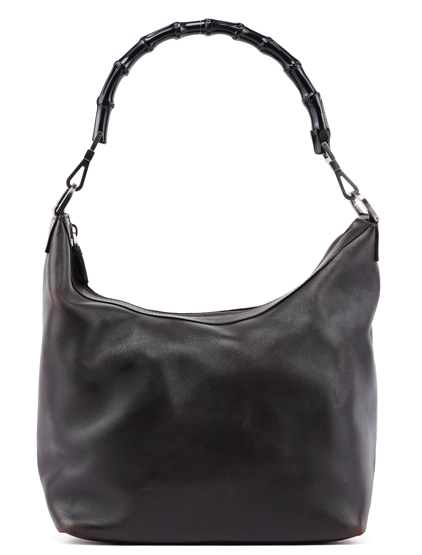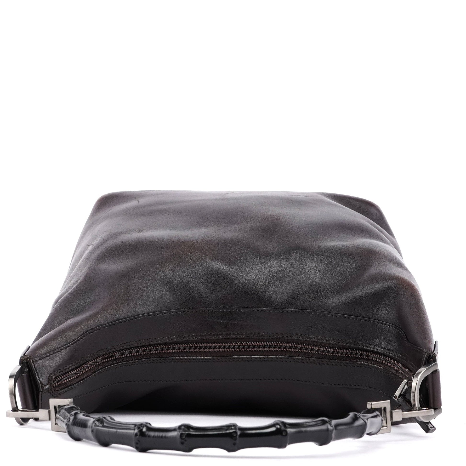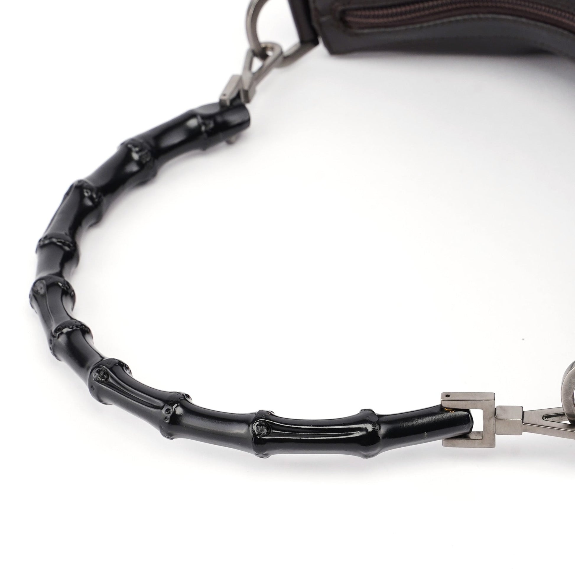 This Gucci Vitello Bamboo shoulder bag is a timeless classic designed in the late 1990s by Tom Ford. The iconic bamboo handle adds a touch of sophistication to the bag, while the brown leather and silver-tone hardware create a stunning visual contrast. The bag's spacious zipper-closed compartment is lined with satin and includes an interior zipper pocket.