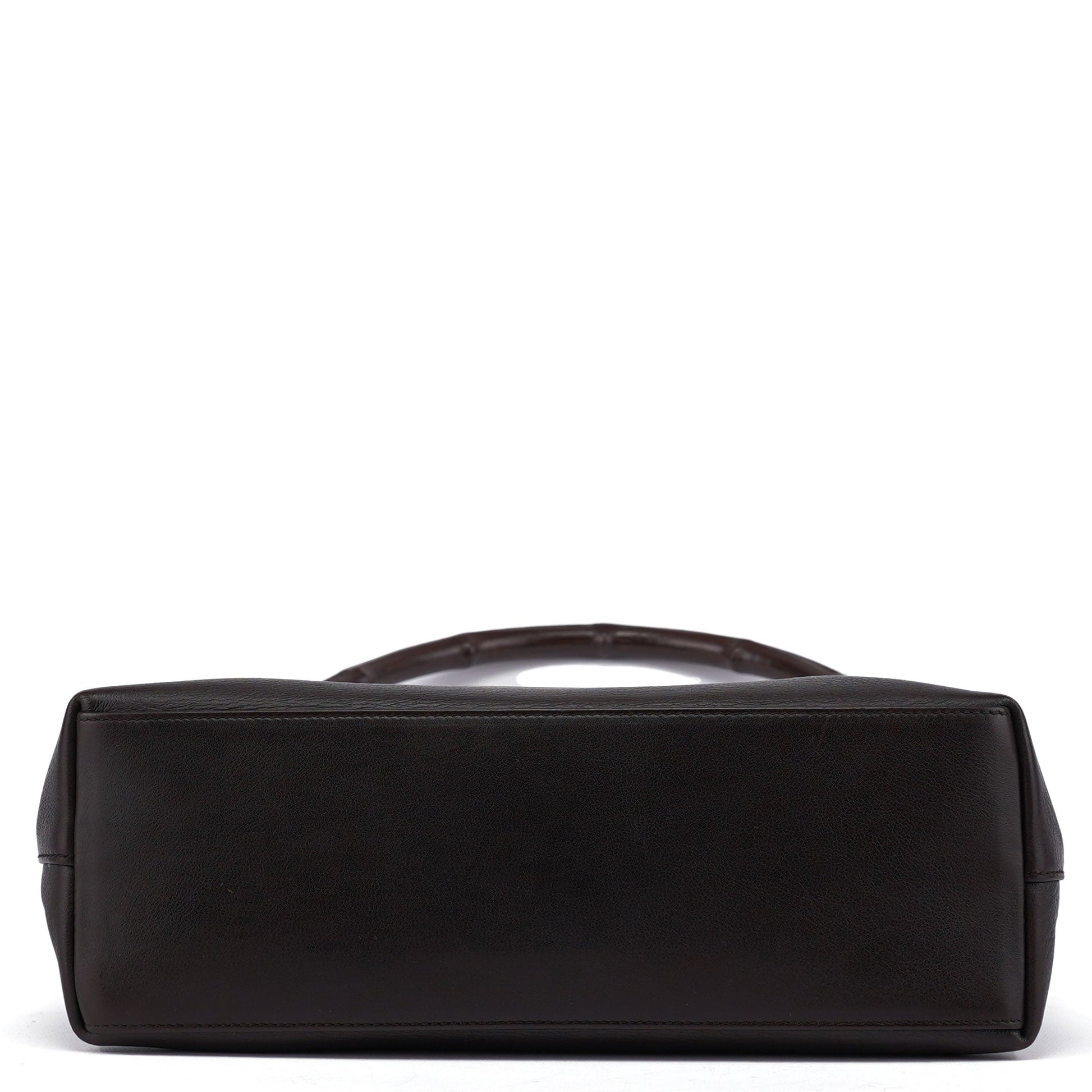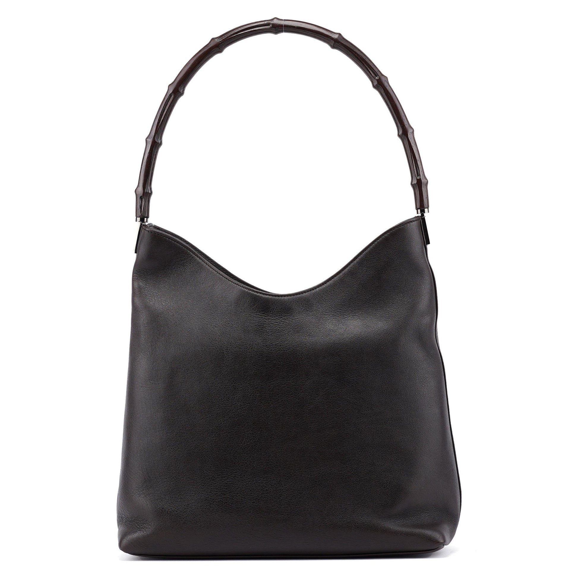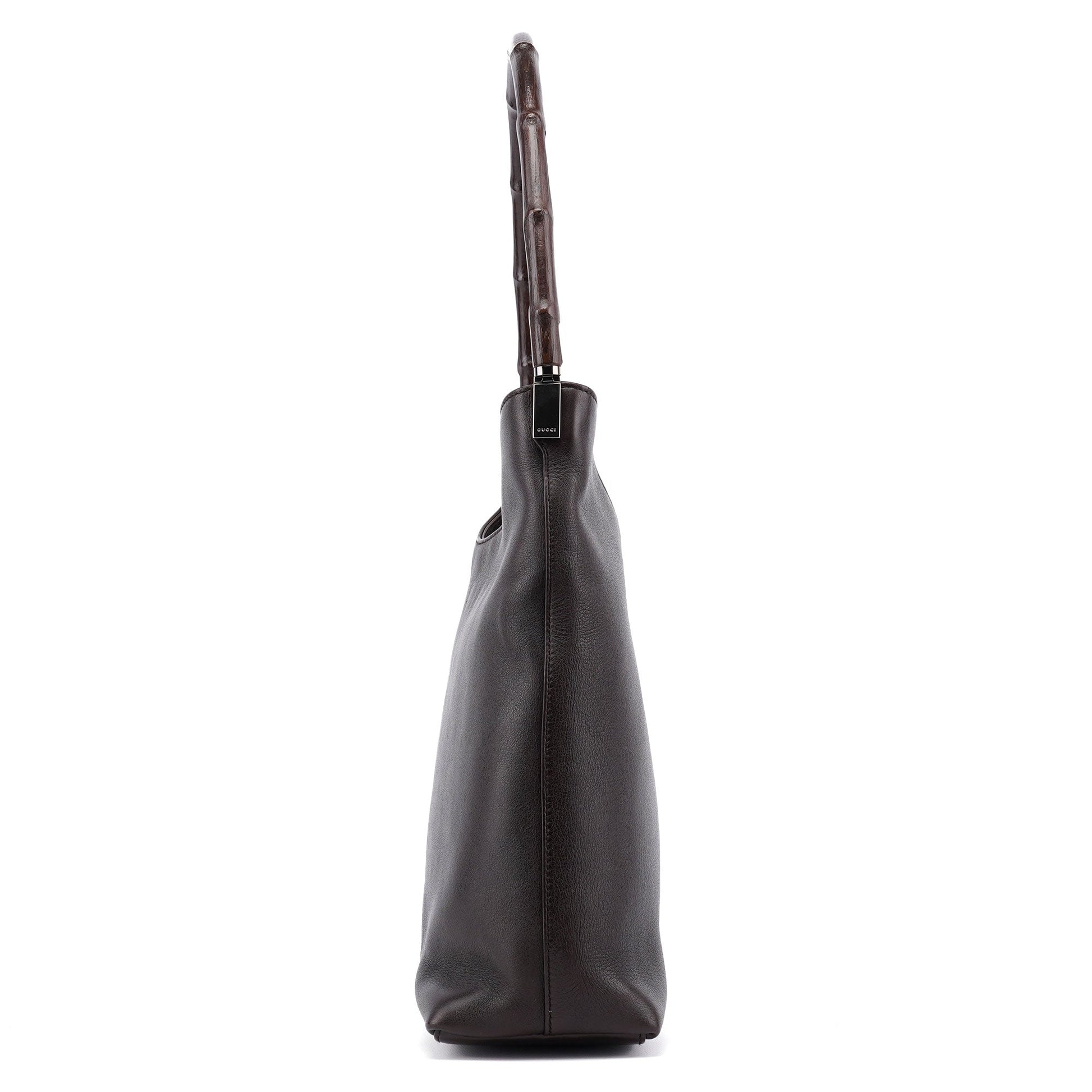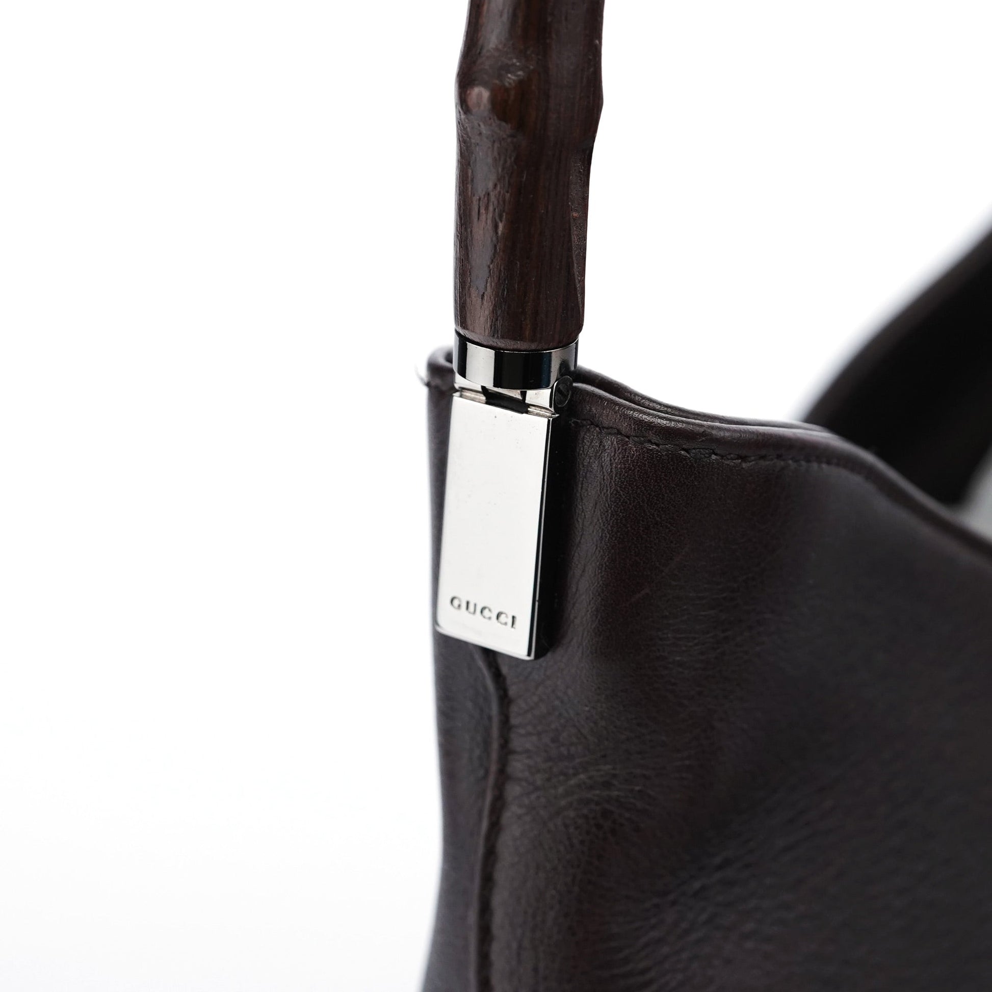 Designed by Tom Ford in the late 1990s, this Gucci Bamboo shoulder bag is crafted from rich brown calfskin leather, featuring the iconic bamboo handle and silver-tone hardware engraved with the Gucci logo. Its spacious satin-lined compartment includes an interior zipper pocket, while the embossed Gucci logo on the front adds a refined touch to its distinguished design.