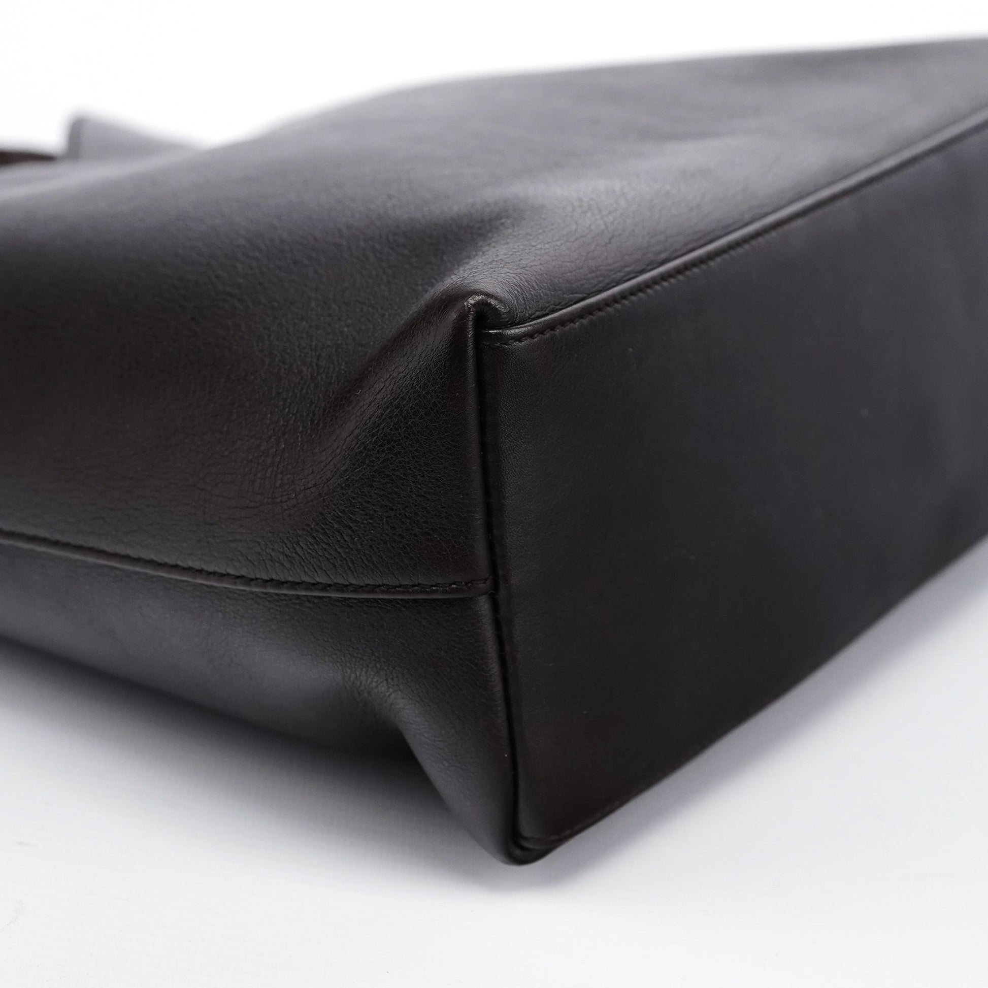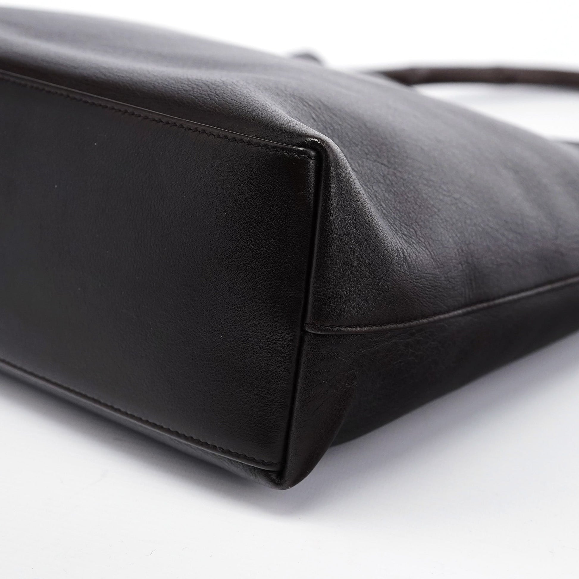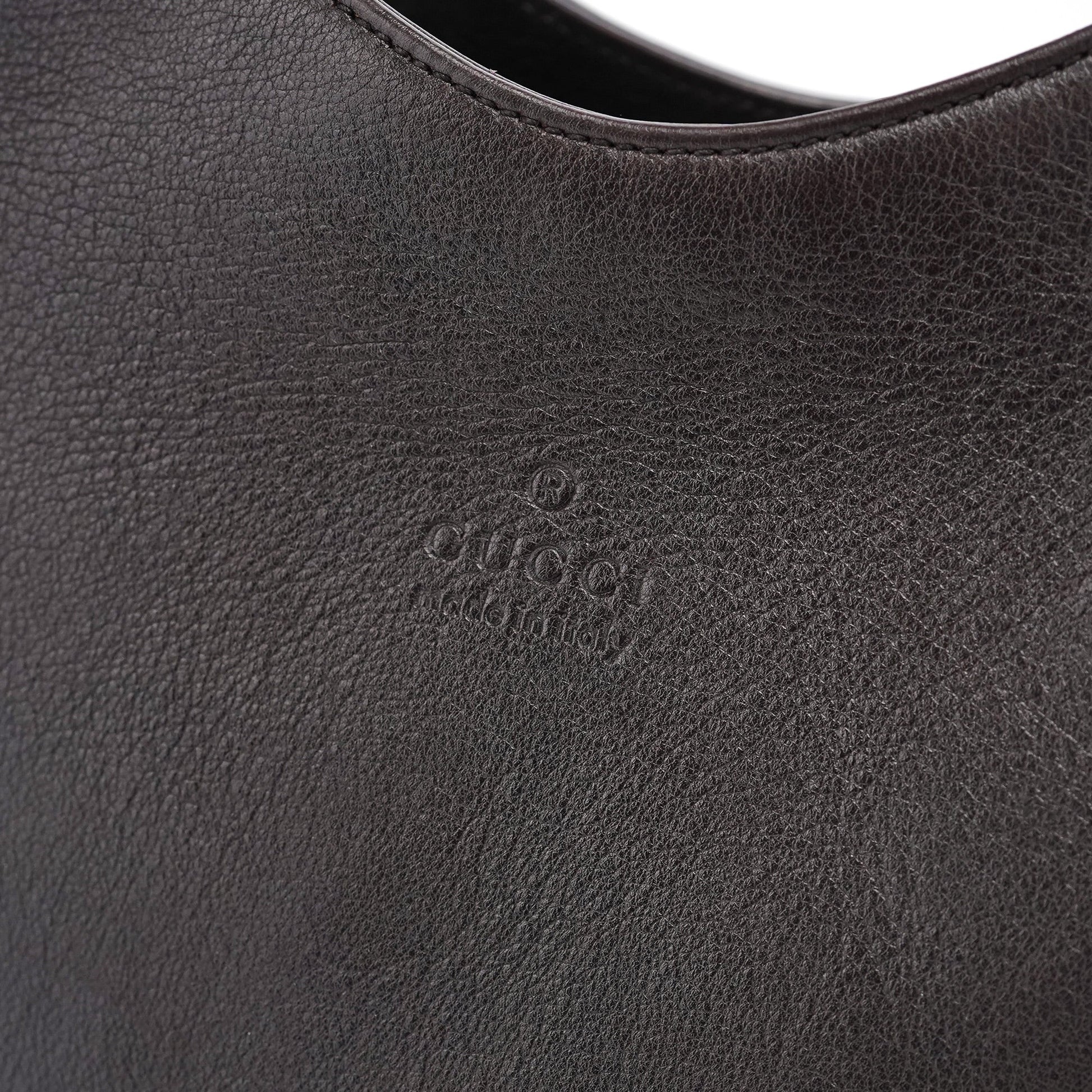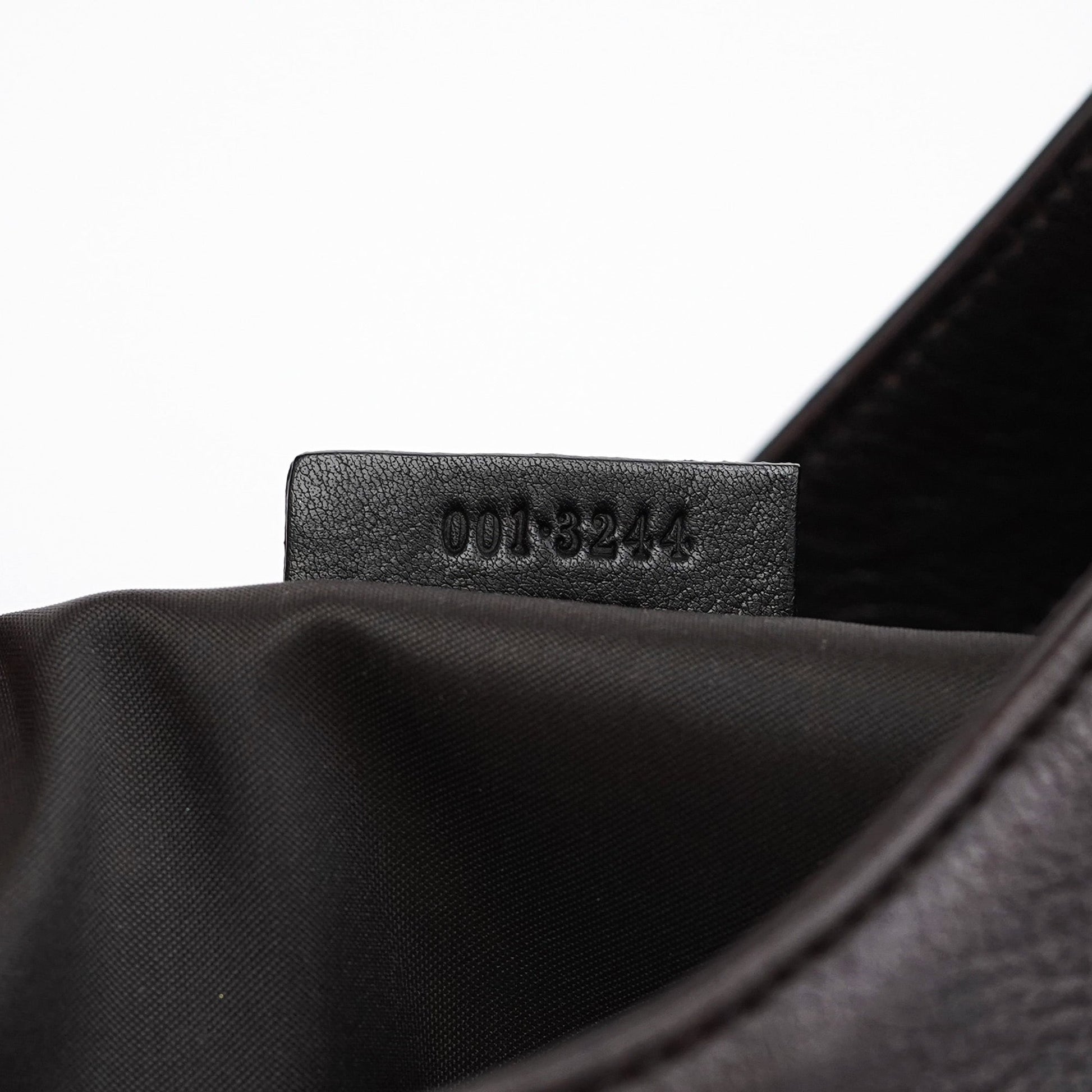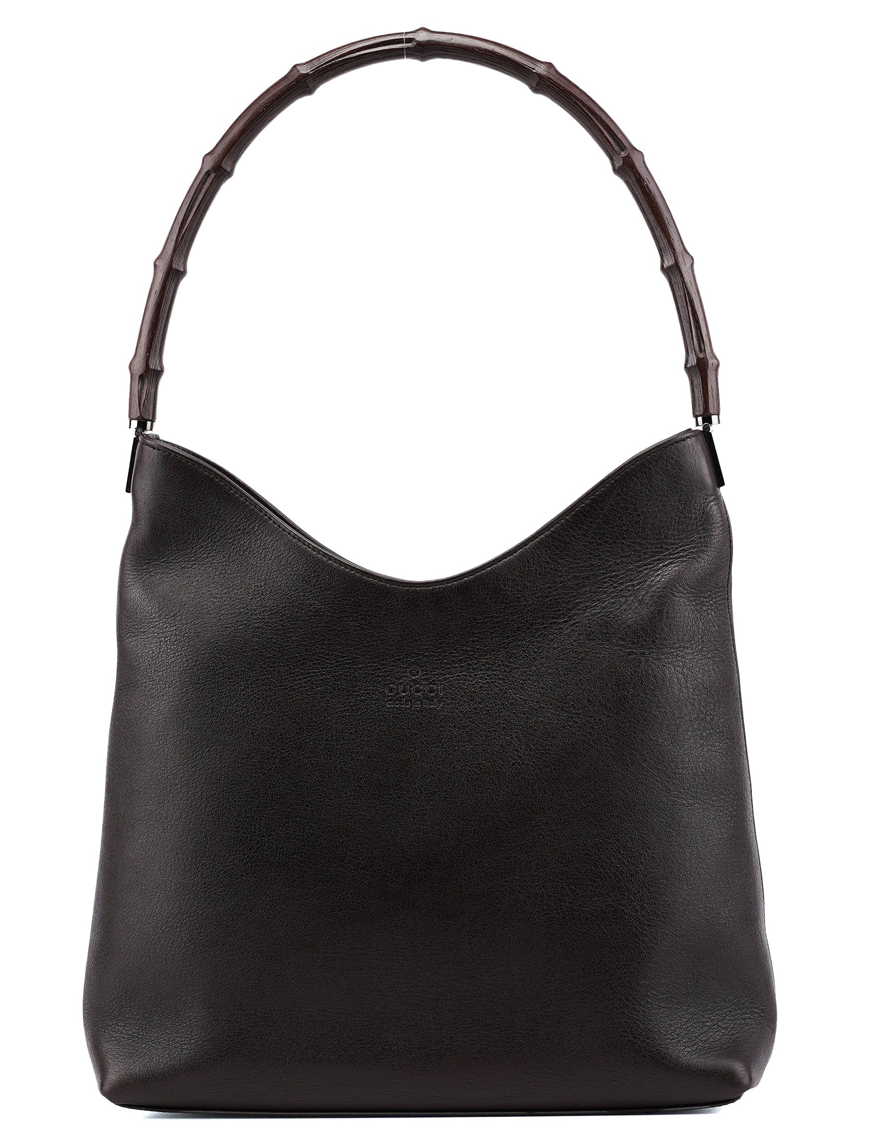 Designed by Tom Ford in the late 1990s, this Gucci Bamboo shoulder bag is crafted from rich brown calfskin leather, featuring the iconic bamboo handle and silver-tone hardware engraved with the Gucci logo. Its spacious satin-lined compartment includes an interior zipper pocket, while the embossed Gucci logo on the front adds a refined touch to its distinguished design.