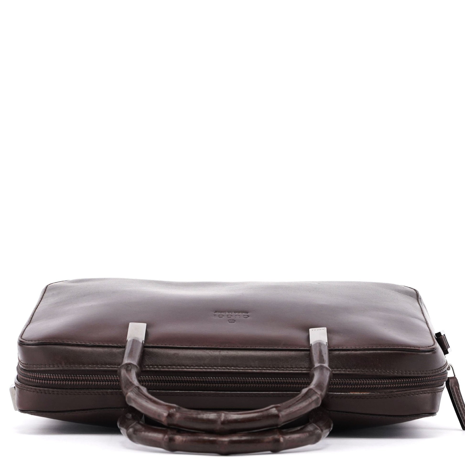 Handcrafted in brown calfskin leather, this Gucci Bamboo bag by Tom Ford from the late 1990s features dual bamboo handles with Gucci logo engraving, silver-tone hardware, and a zipper closure. The interior is lined in satin and has a zipper pocket. The Gucci logo is embossed at the front, showcasing timeless elegance.