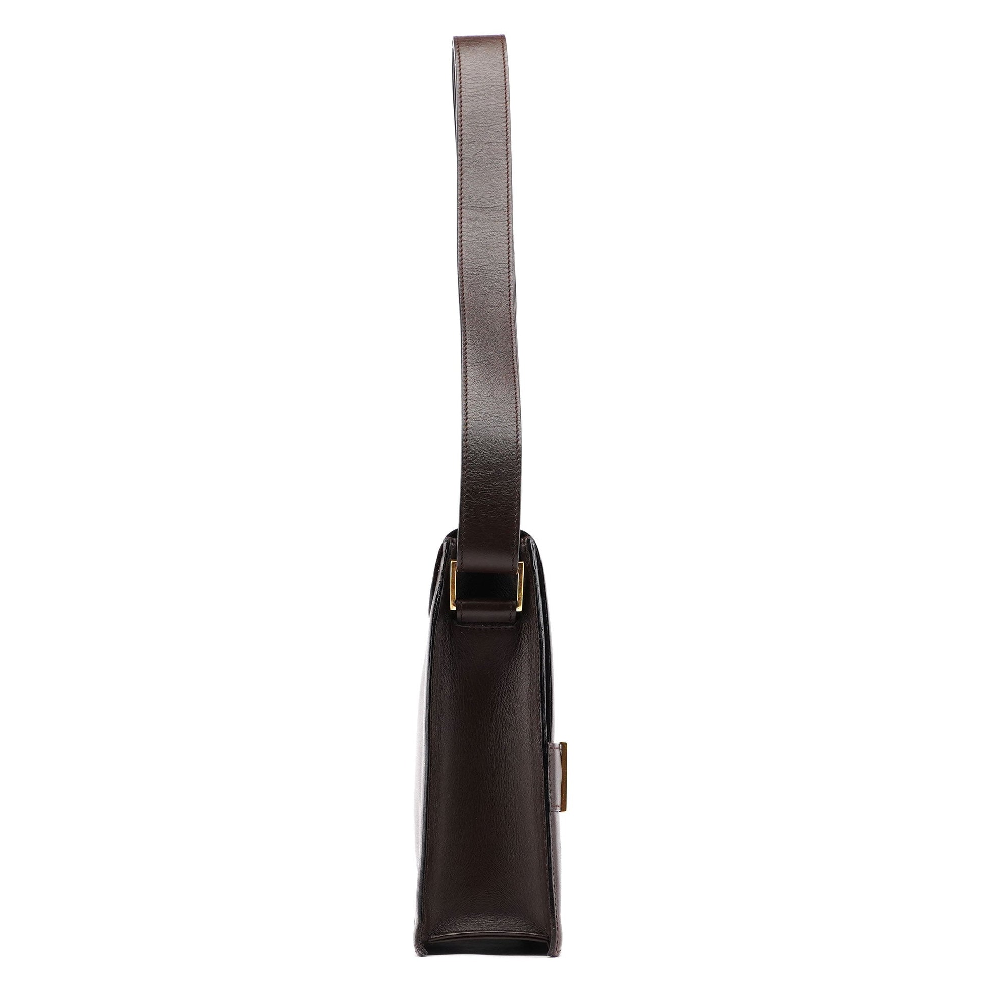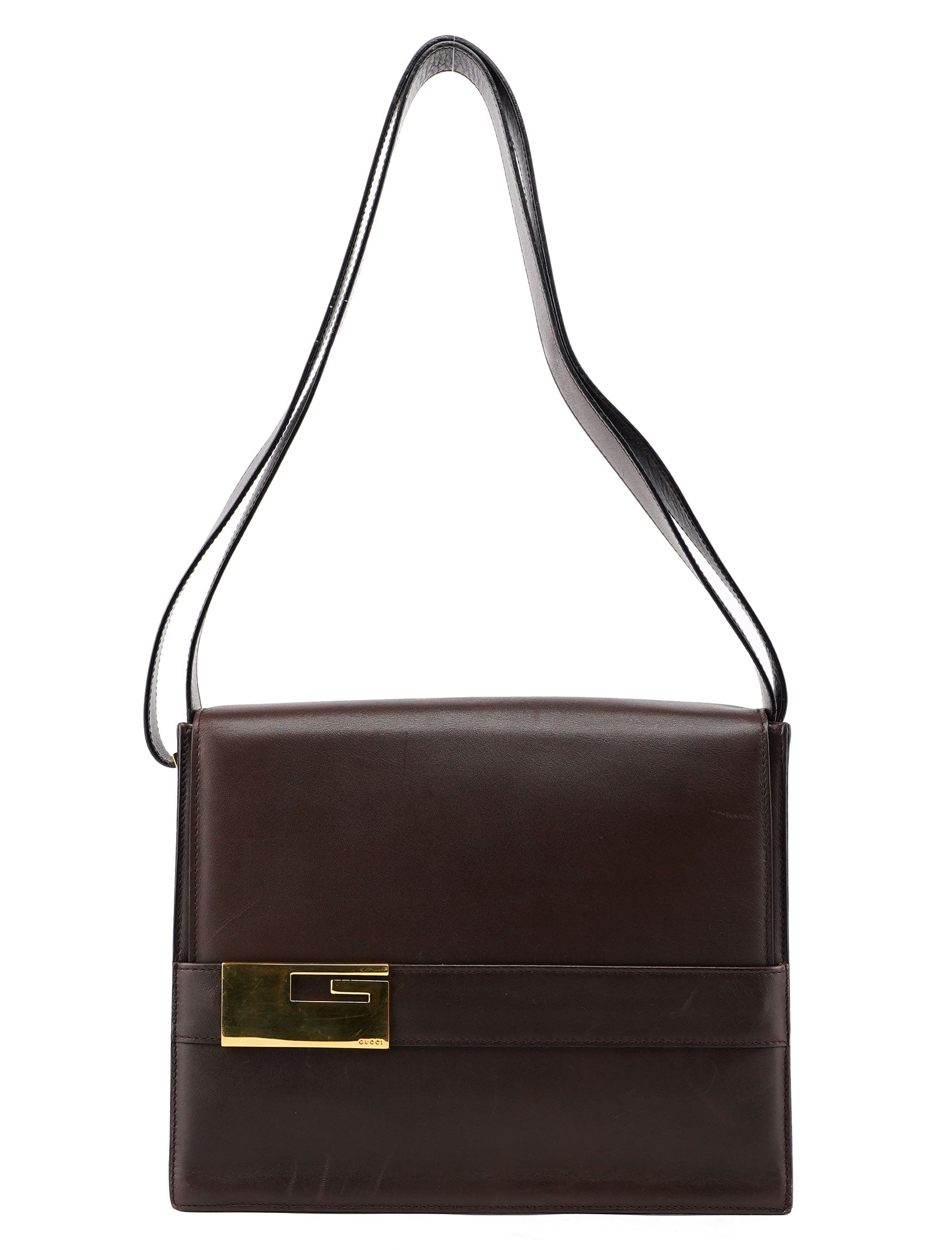Designed by Tom Ford in the late '90s, the Gucci Square G bag exudes elegance. Its brown calfskin leather exterior is accentuated by gold-tone hardware bearing the iconic Gucci logo. The flap closure opens to reveal a luxurious interior lined with sumptuous suede, complete with a convenient interior zipper pocket.