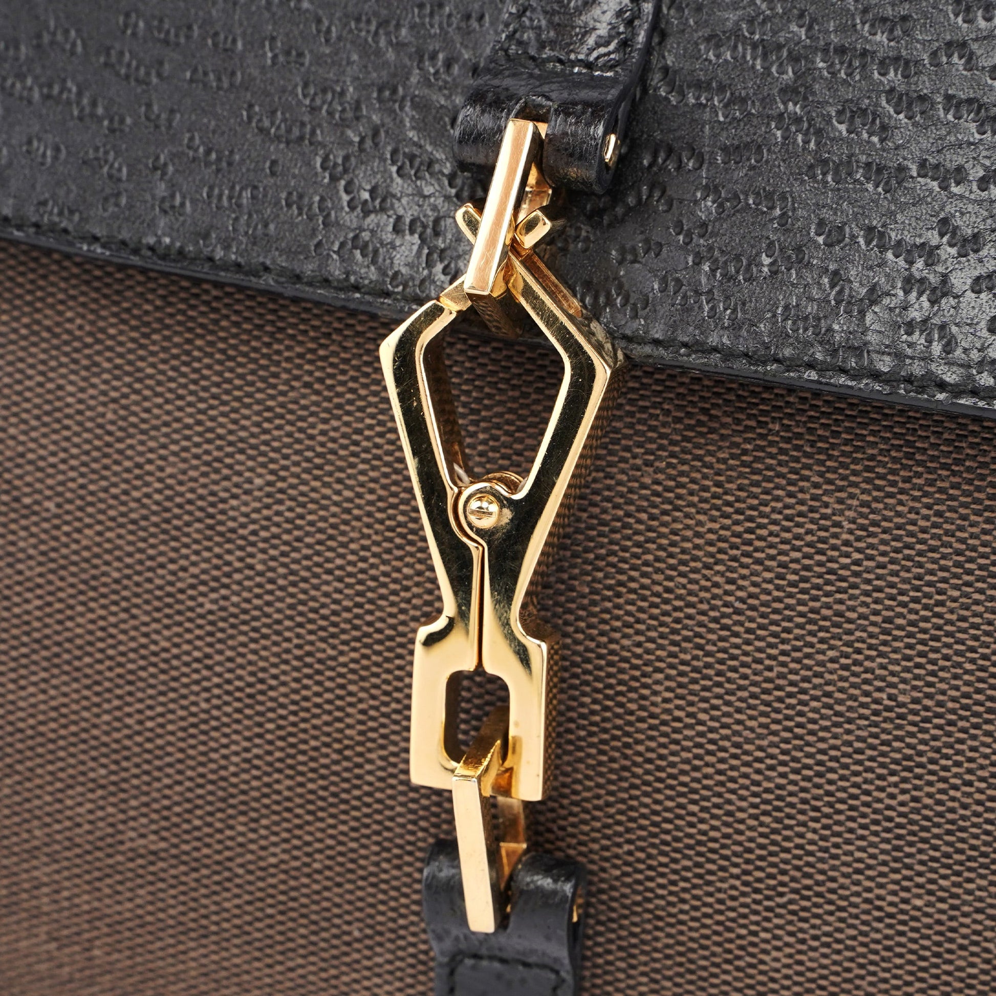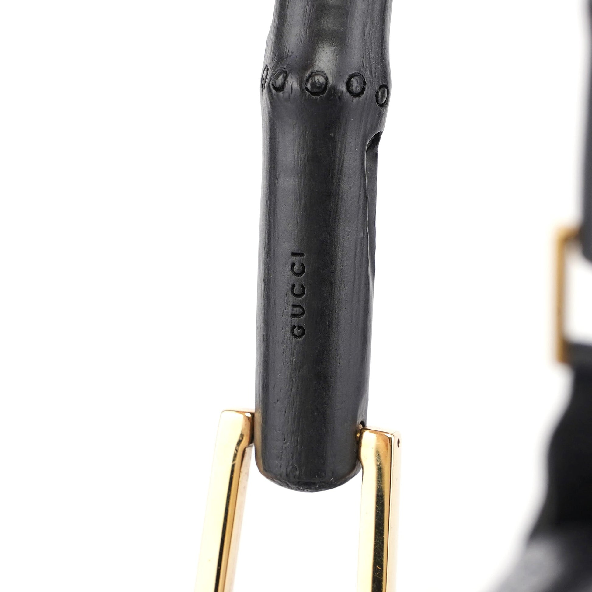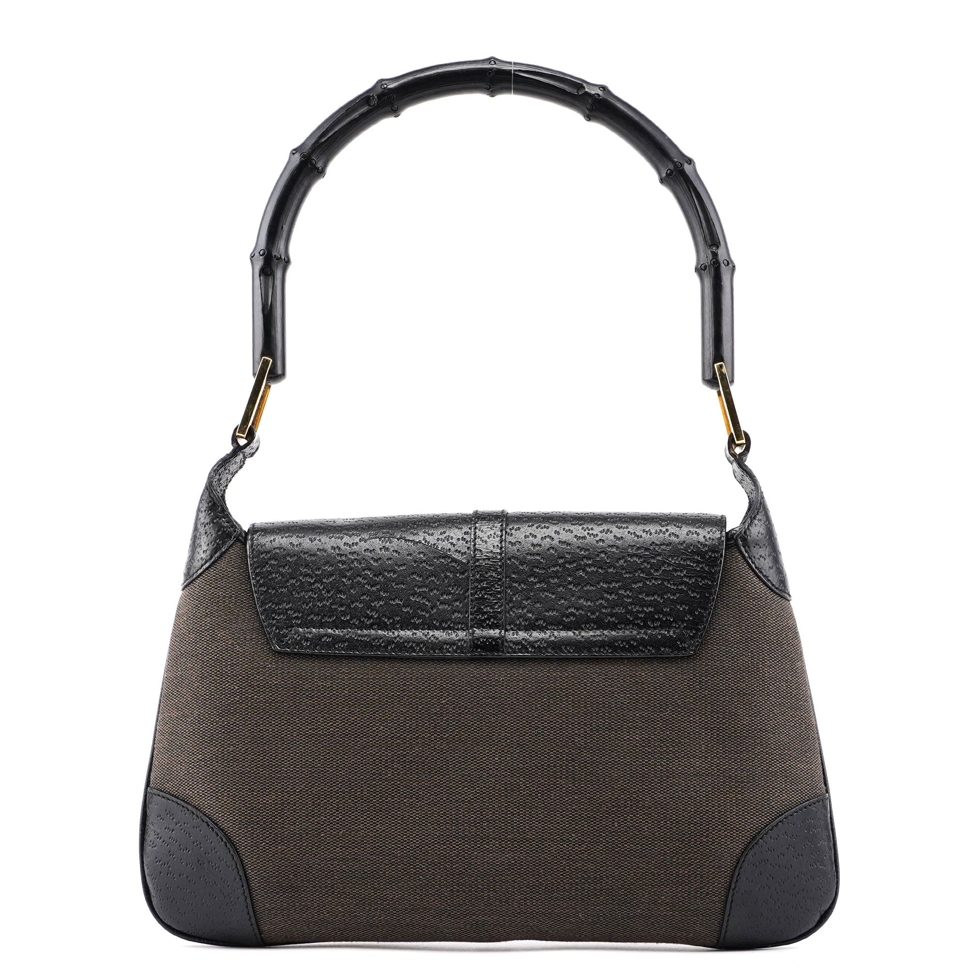 Designed by Tom Ford in the late 1990s, this Gucci Jackie Bamboo bag is handcrafted in brown cotton canvas with black leather trim and gold-tone hardware. It features a bamboo handle with Gucci logo engraving and a classic sgold-tone Jackie style closure. The interior is lined with satin and includes a zipper pocket.