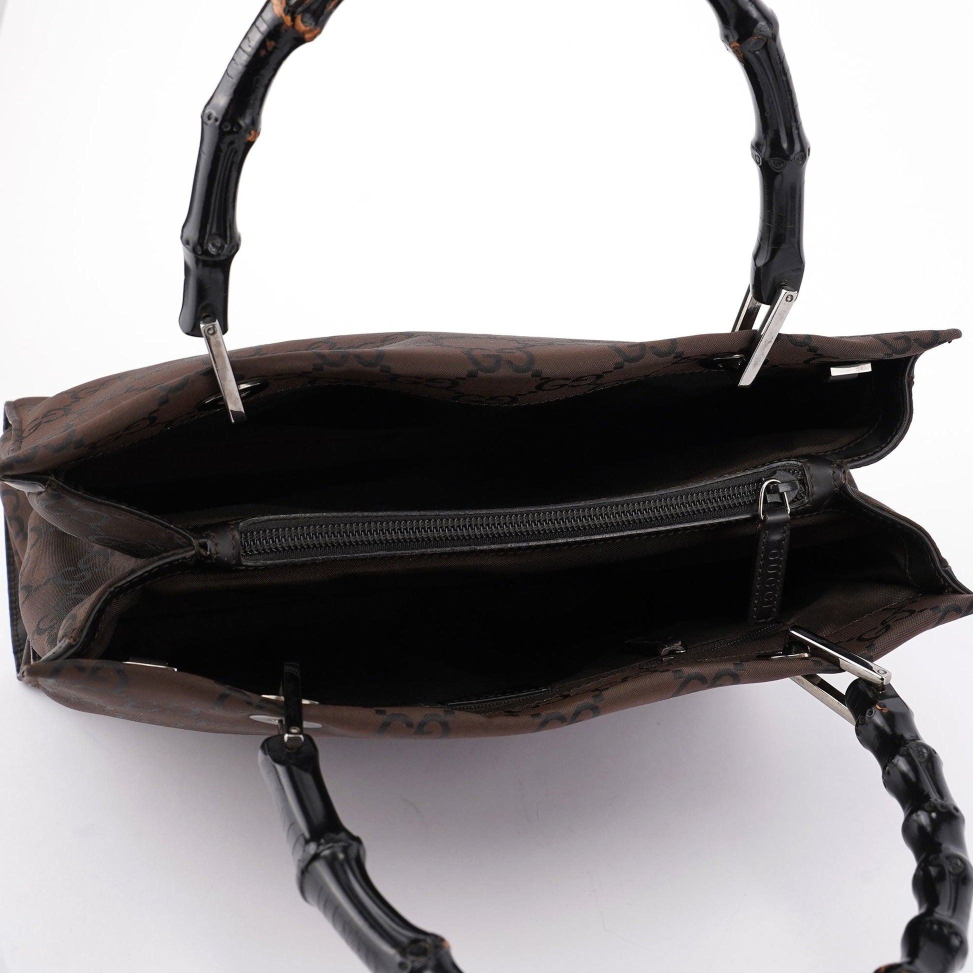 Designed by Tom Ford in the late 1990s, this Gucci Bamboo GG tote bag features black bamboo handles and silver-tone hardware. Crafted with the iconic GG monogram canvas, it offers three interior compartments lined with satin, including an interior zipper pocket, blending luxurious design with practical functionality.