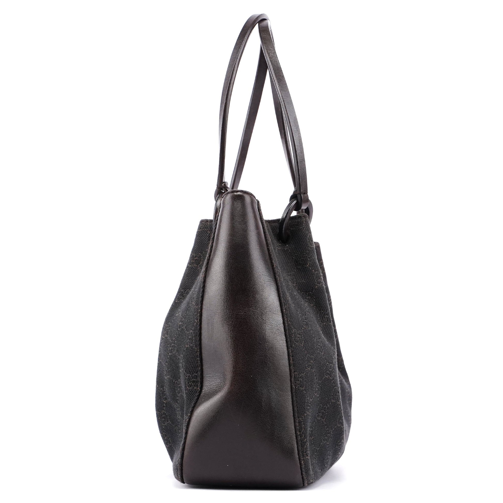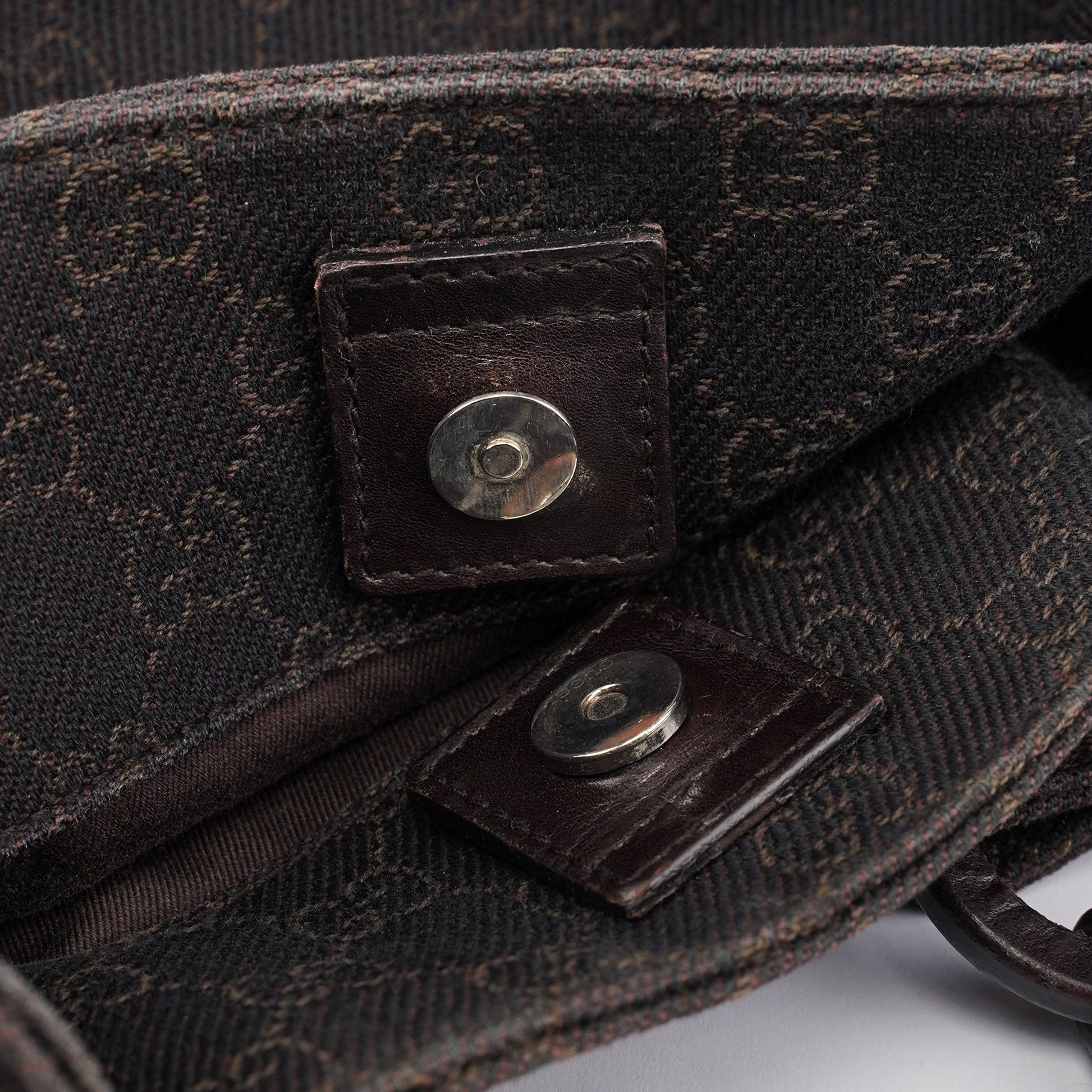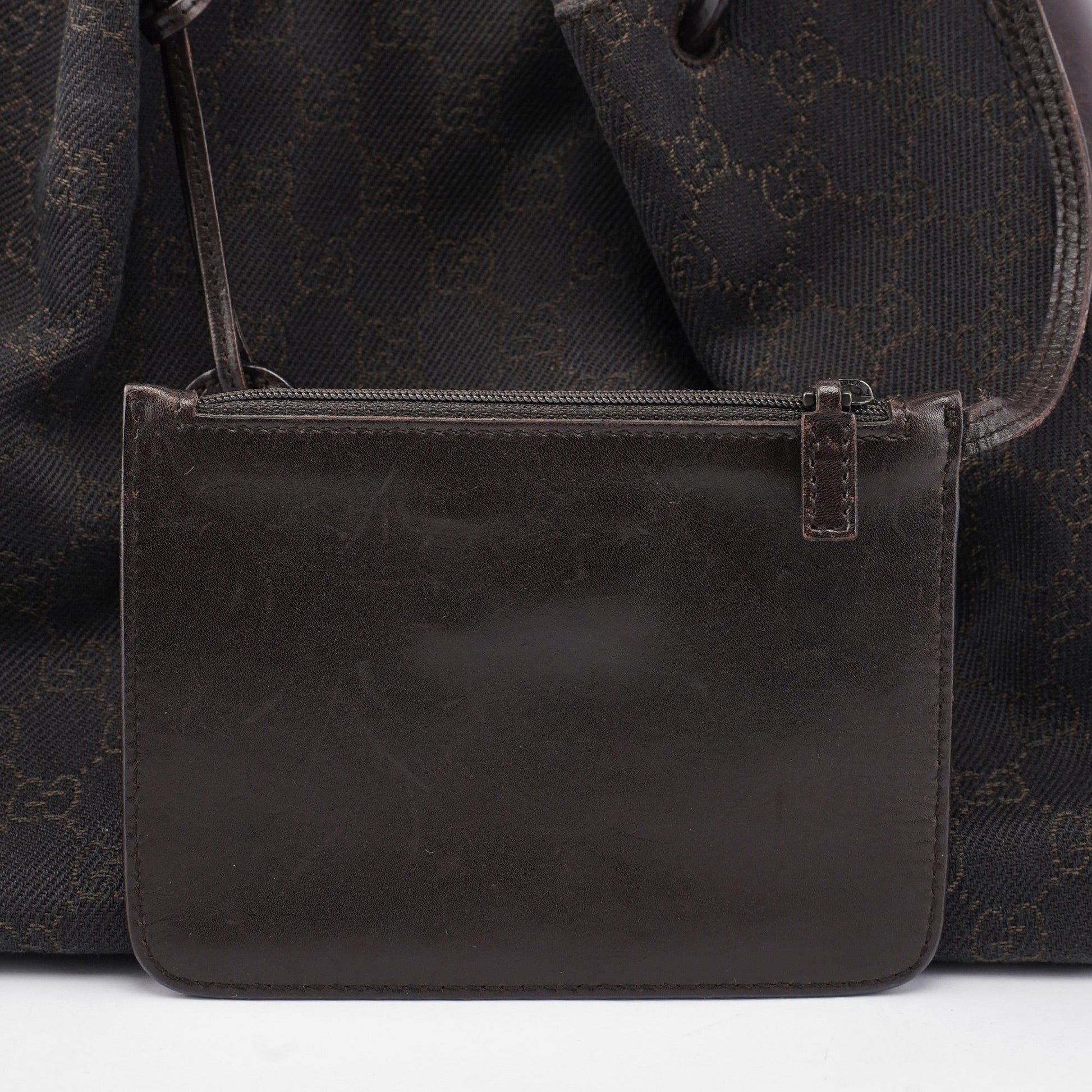 Introducing the Gucci Monogram handbag, designed by Tom Ford in the late 1990s. Handcrafted from brown GG monogram canvas with tonal leather trim, it features an attached leather pouch and a magnetic closure. The interior is lined in cotton and finished with a Gucci logo plate attached to the bag.