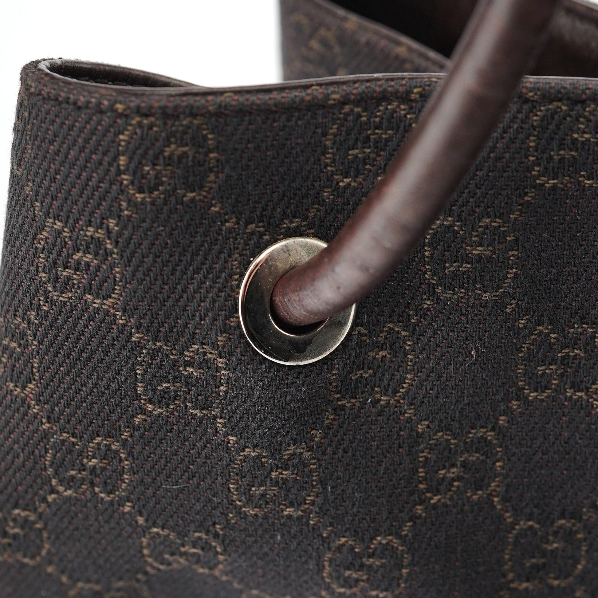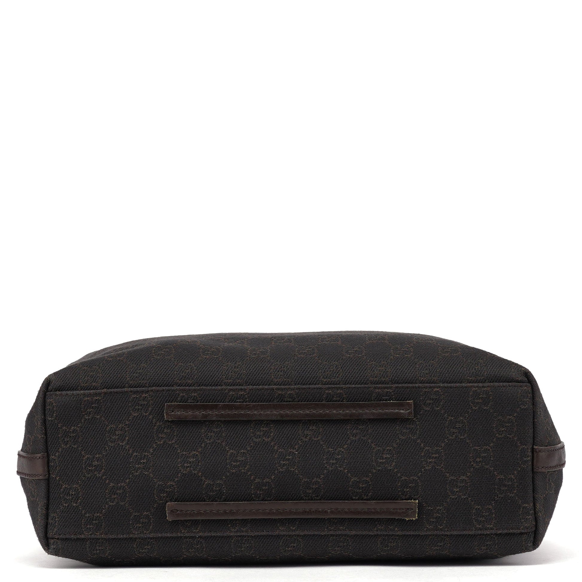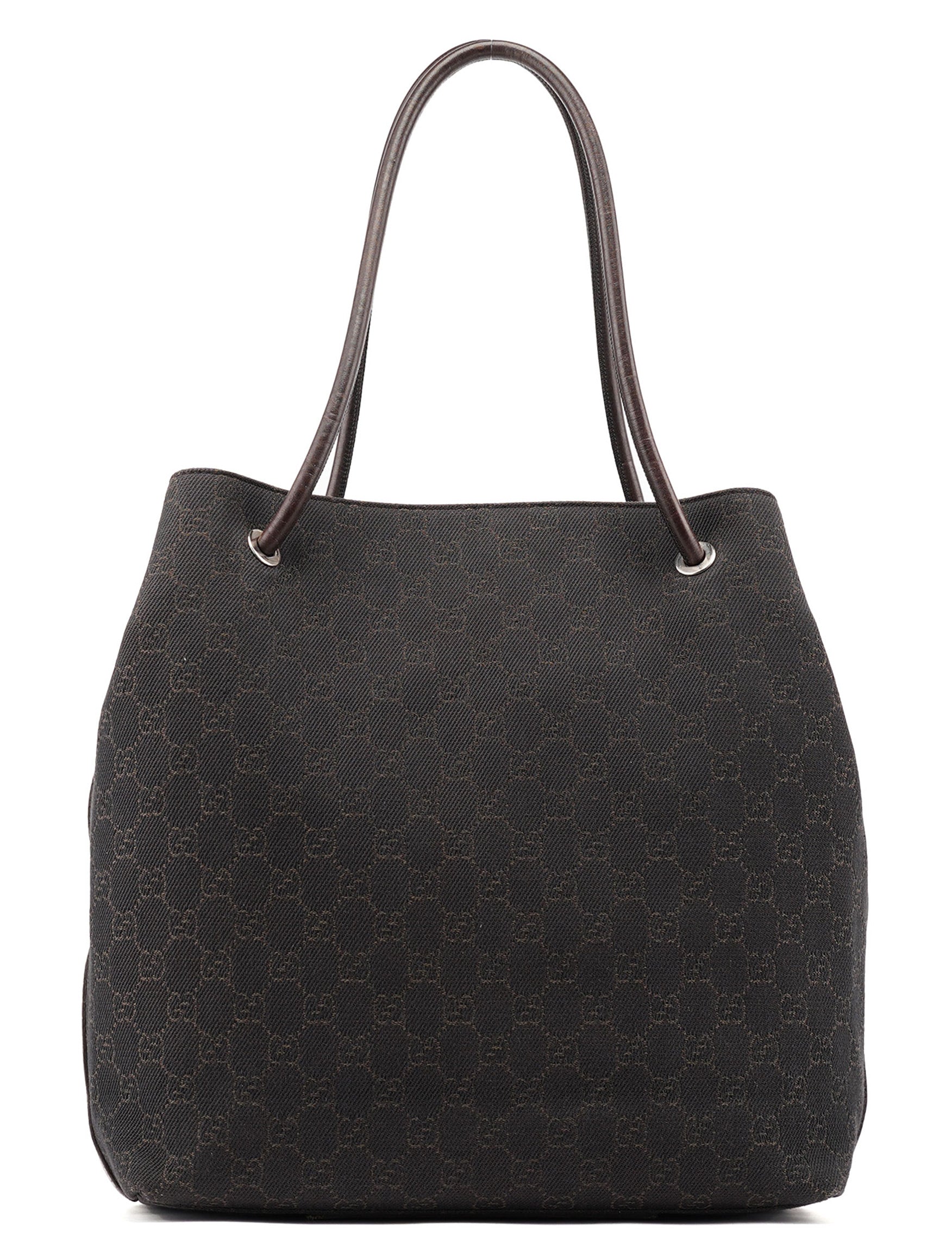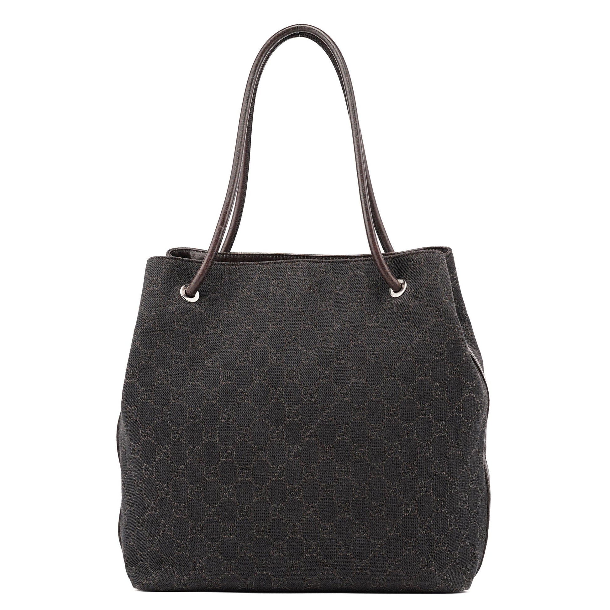 Designed by Tom Ford in the early 2000s, this Gucci tote is crafted from black GG monogram canvas with tonal leather shoulder straps. The open top reveals a spacious interior lined in cotton with a zippered pocket, making it an elegant yet practical everyday bag.