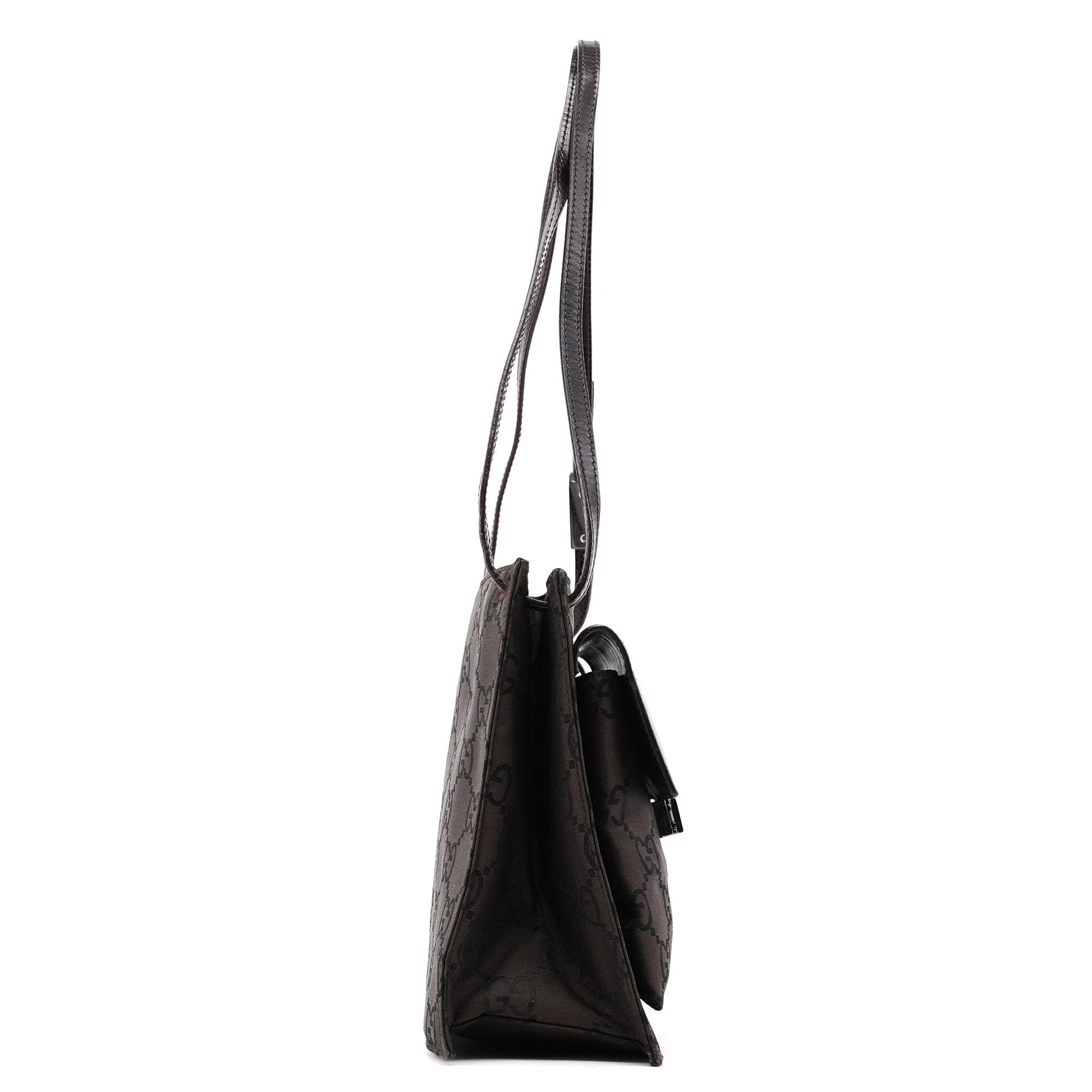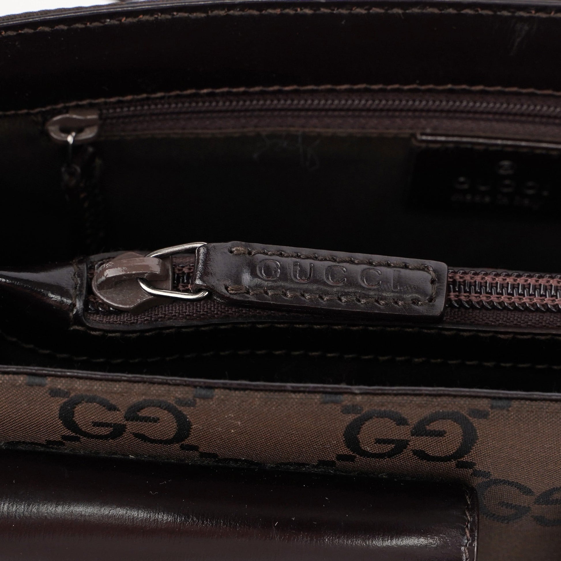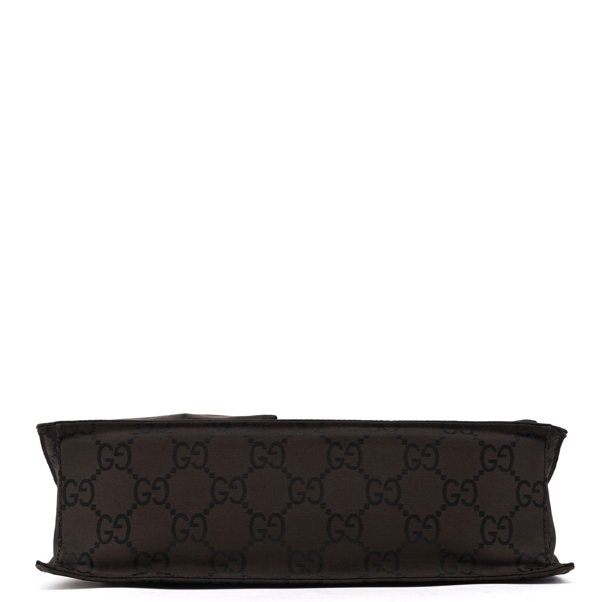 This Gucci GG shoulder bag, designed by Tom Ford in the late 1990s, is handcrafted from brown GG nylon with tonal patent leather trim. It features silver-tone hardware engraved with the Gucci logo, two front pockets, and an adjustable strap. The satin-lined interior offers three compartments, one with a zipper closure, along with an additional zipper pocket for added functionality.