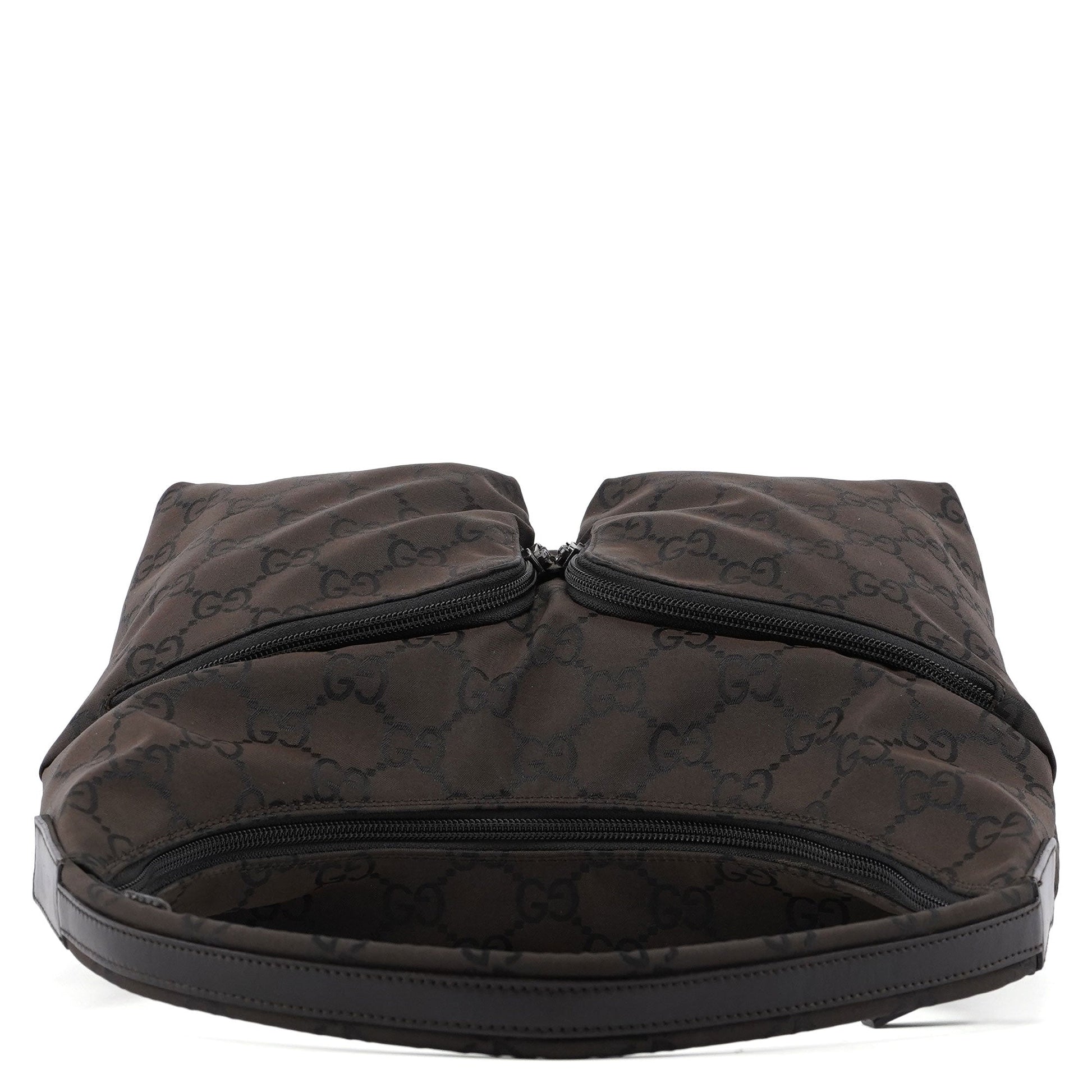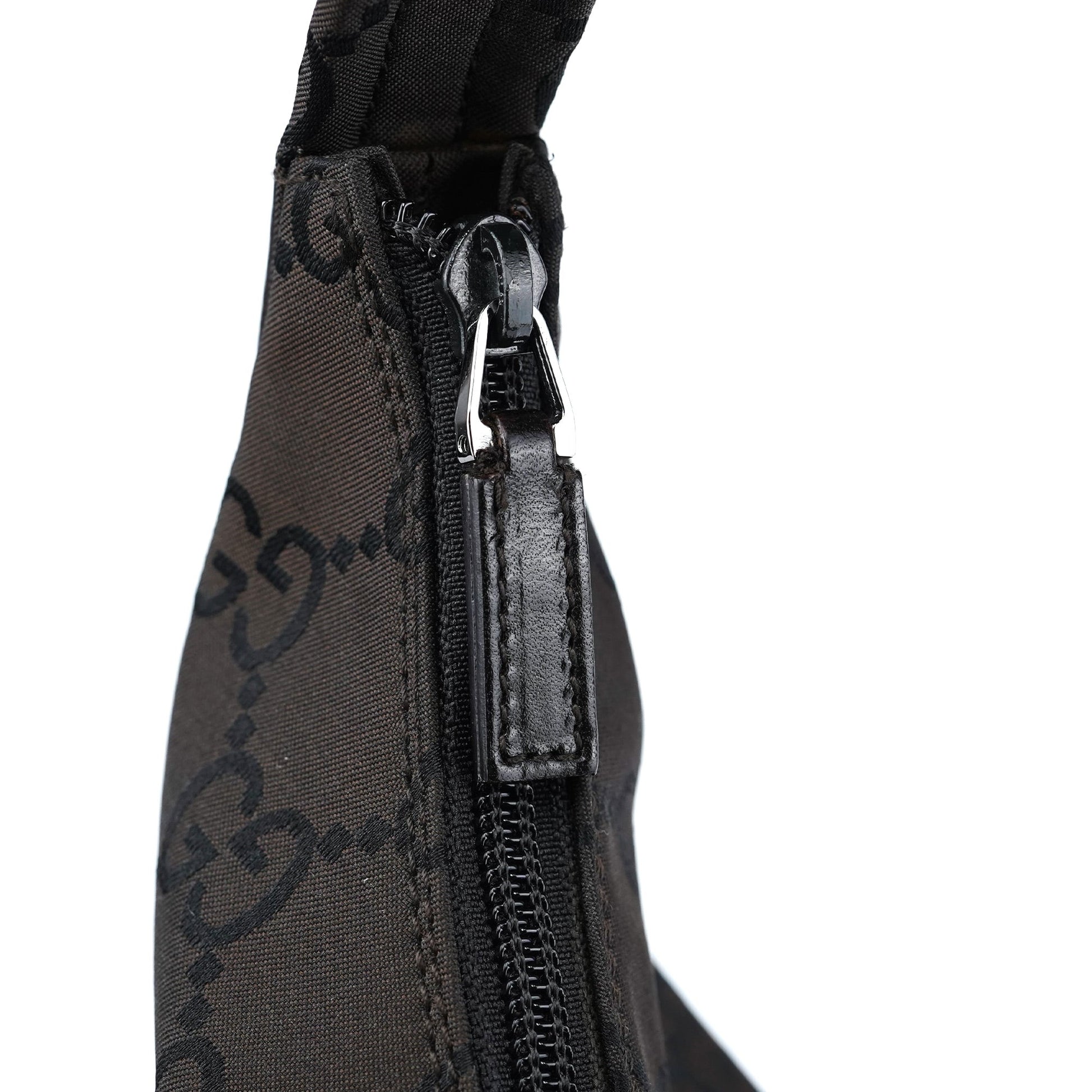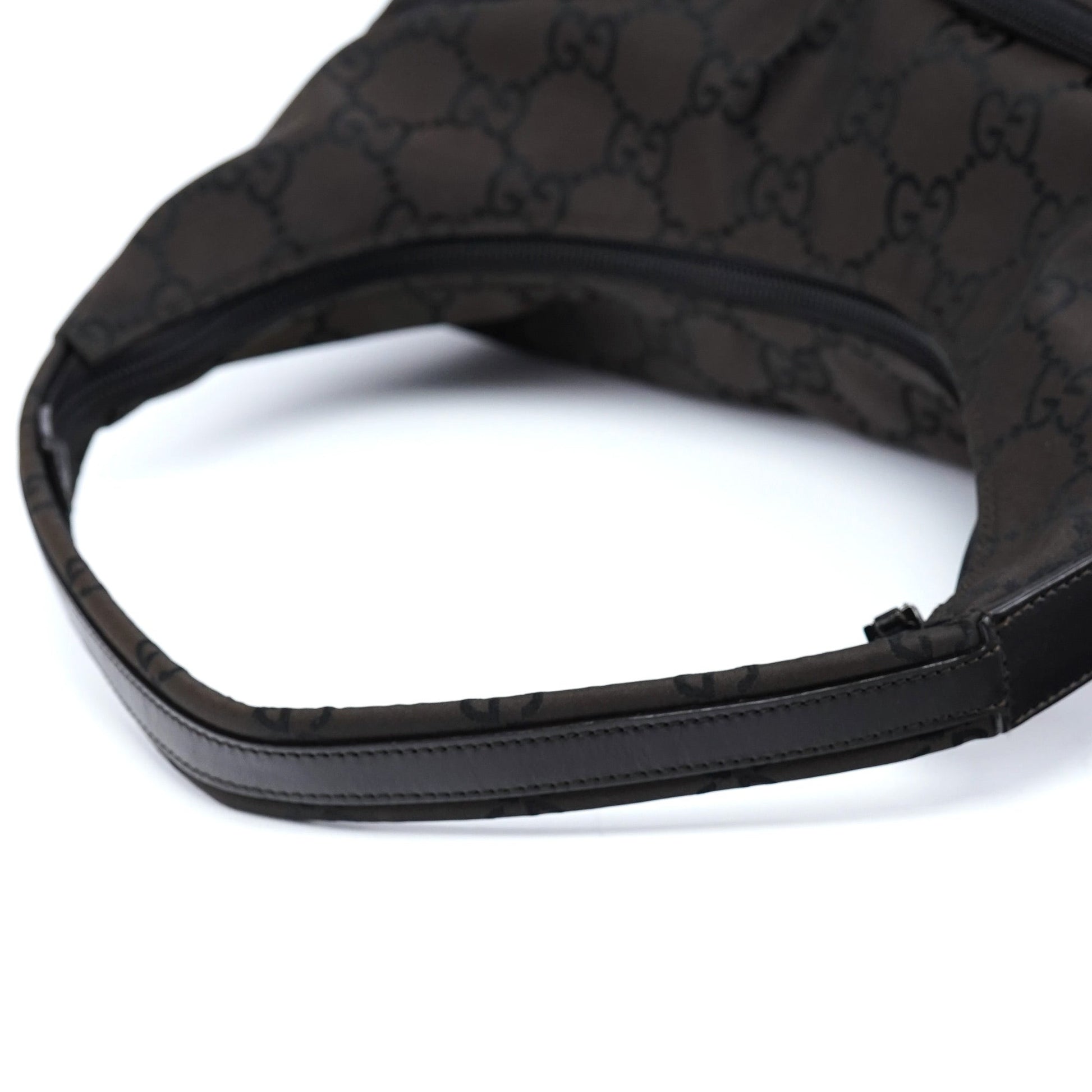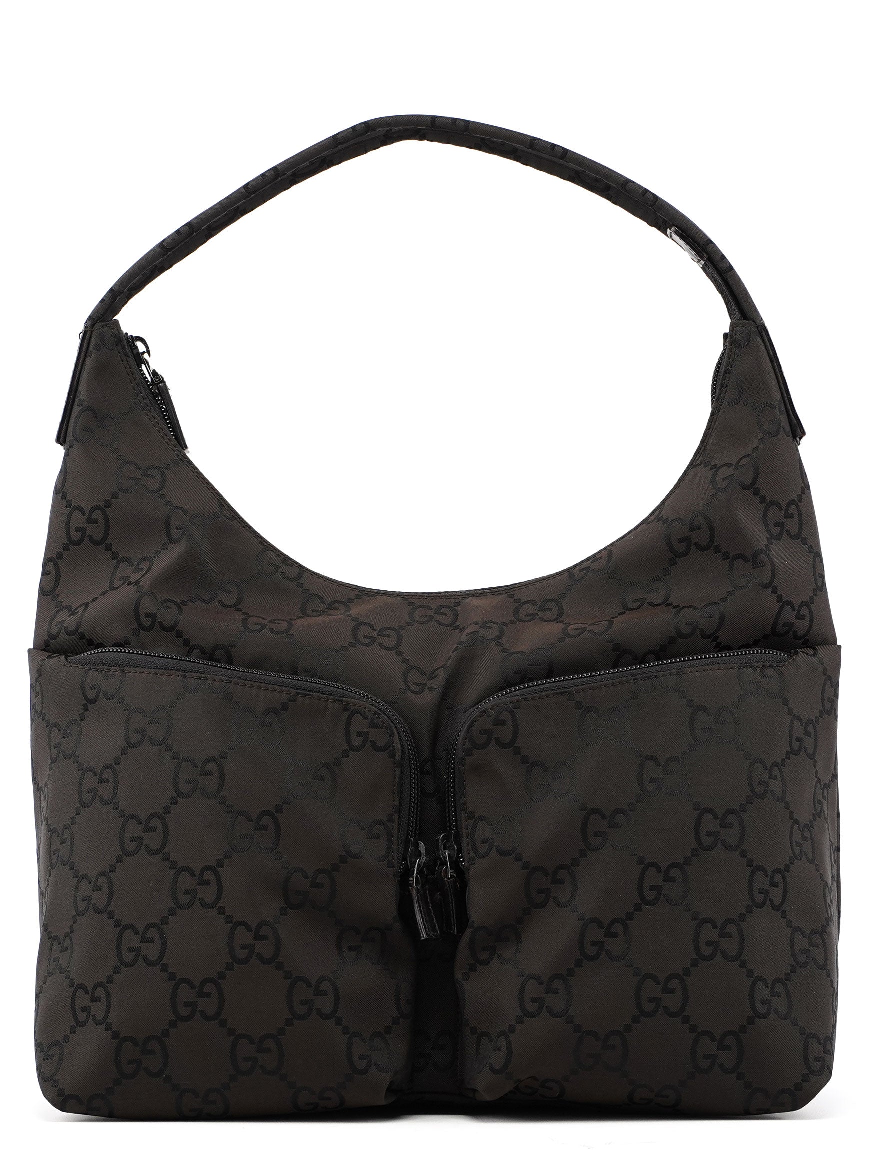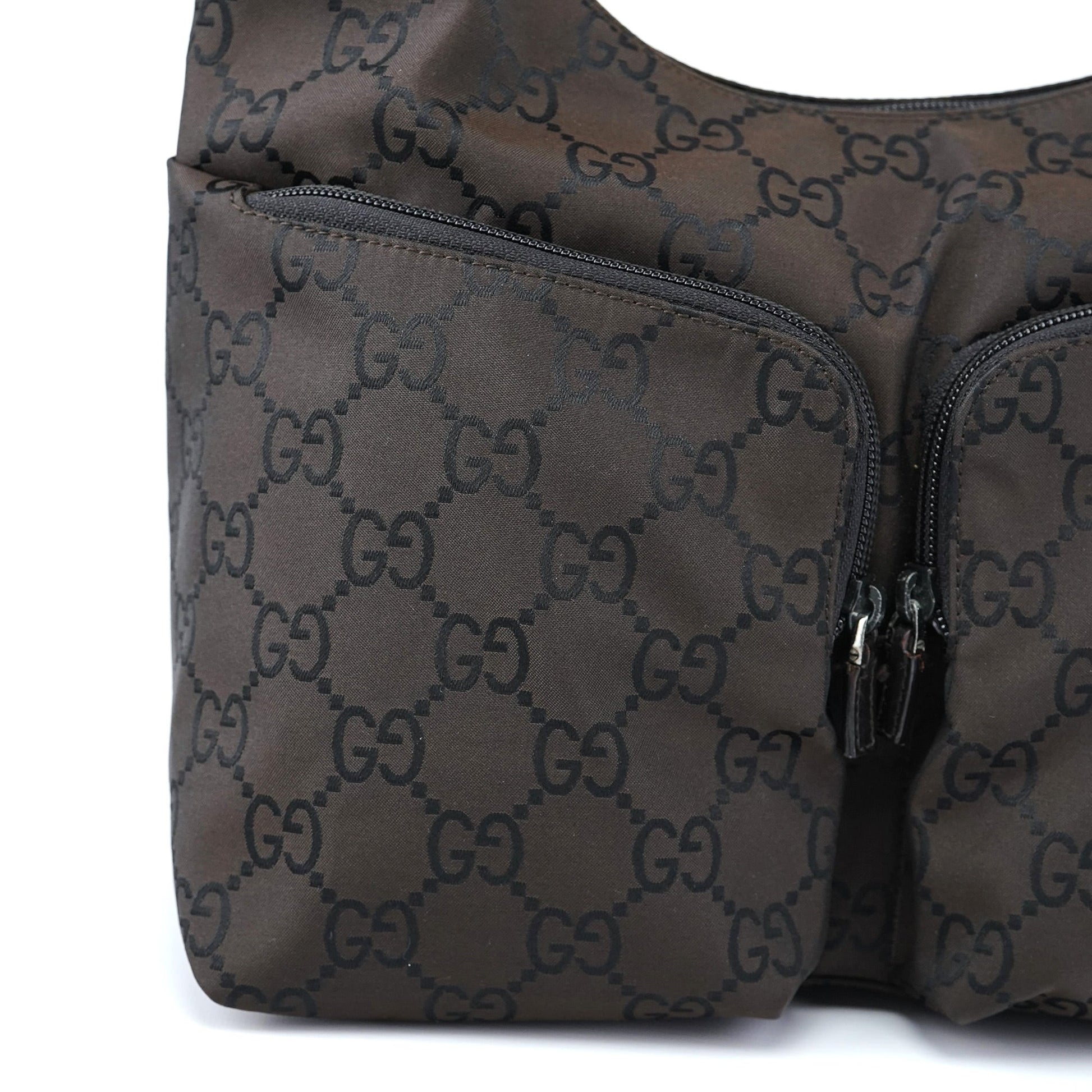Designed by Tom Ford in the late 1990s, the Gucci GG shoulder bag boasts a brown GG monogram canvas with tonal leather trim. It features silver-tone hardware adorns and two zipper pockets at the front. The bag securely closes with a zipper, revealing a satin-lined interior complete with an additional zipper pocket.