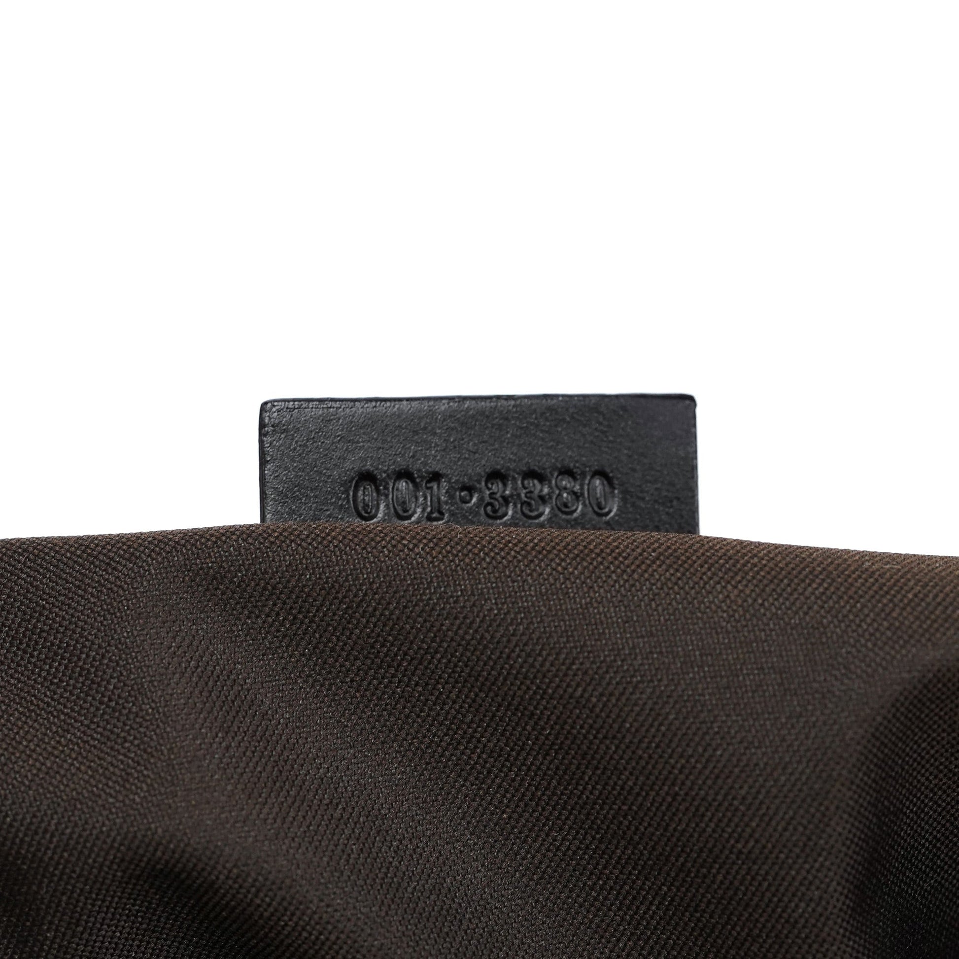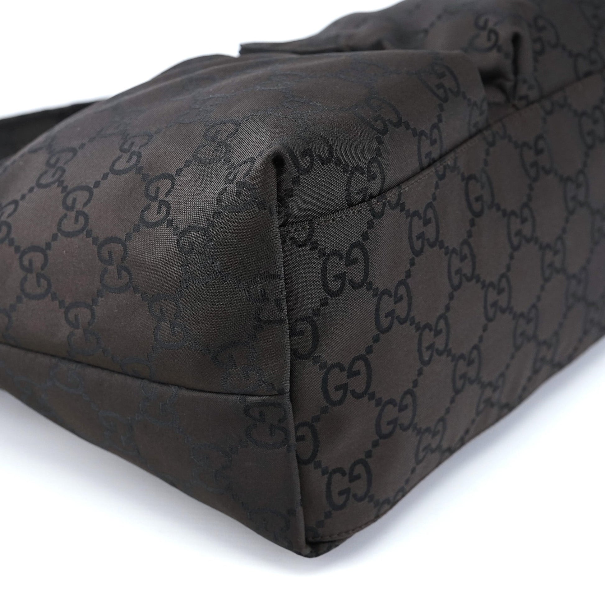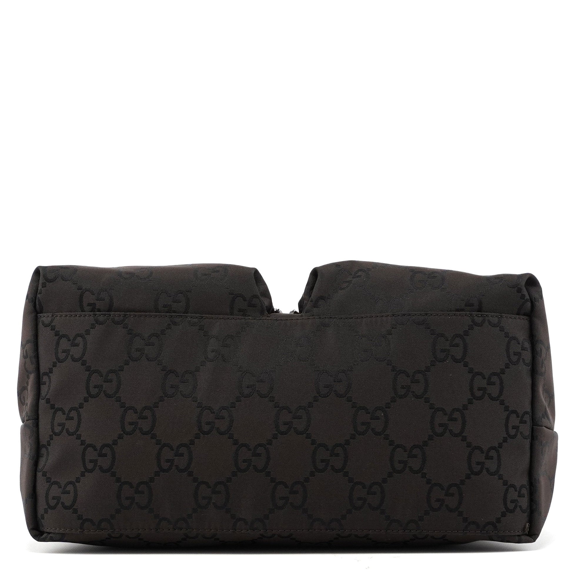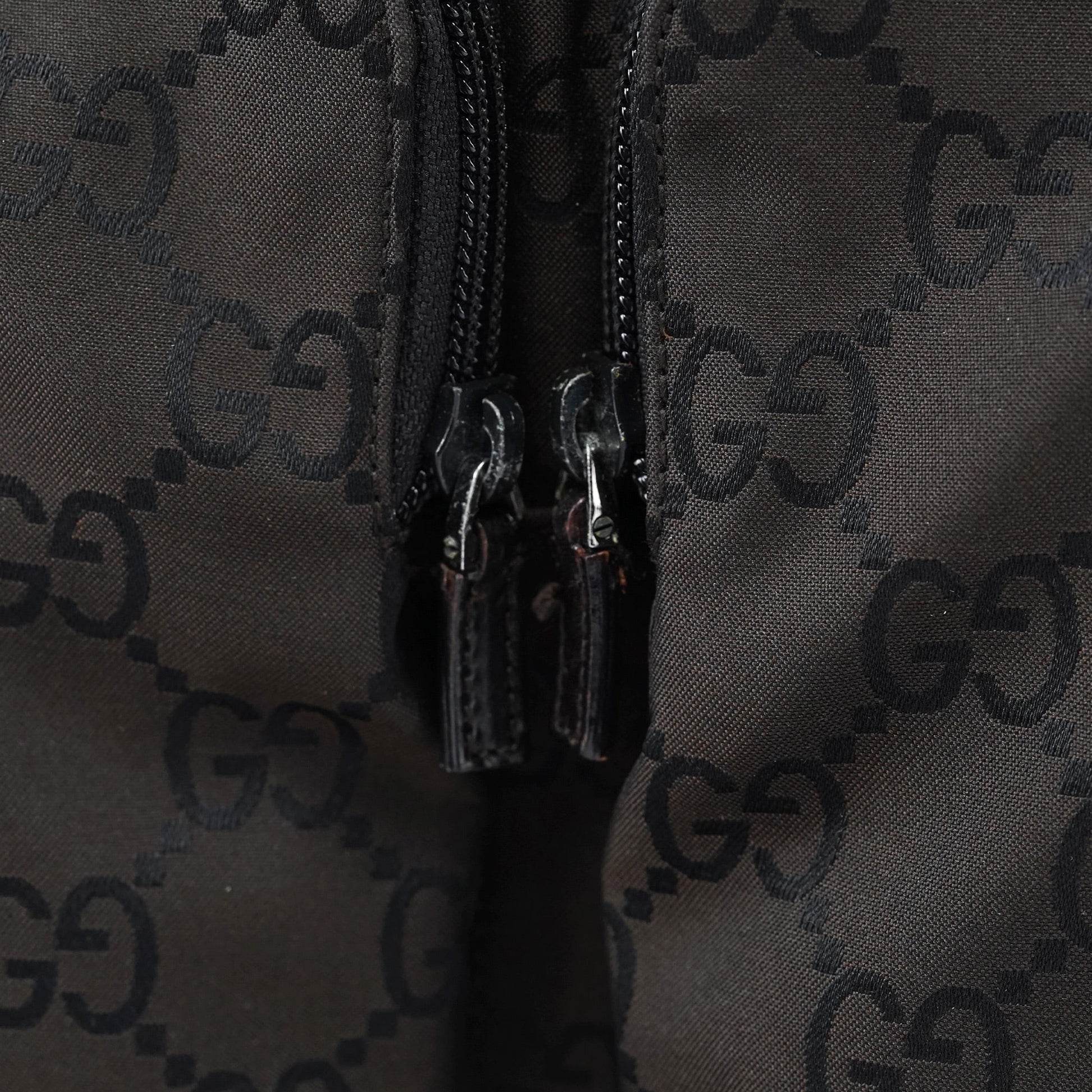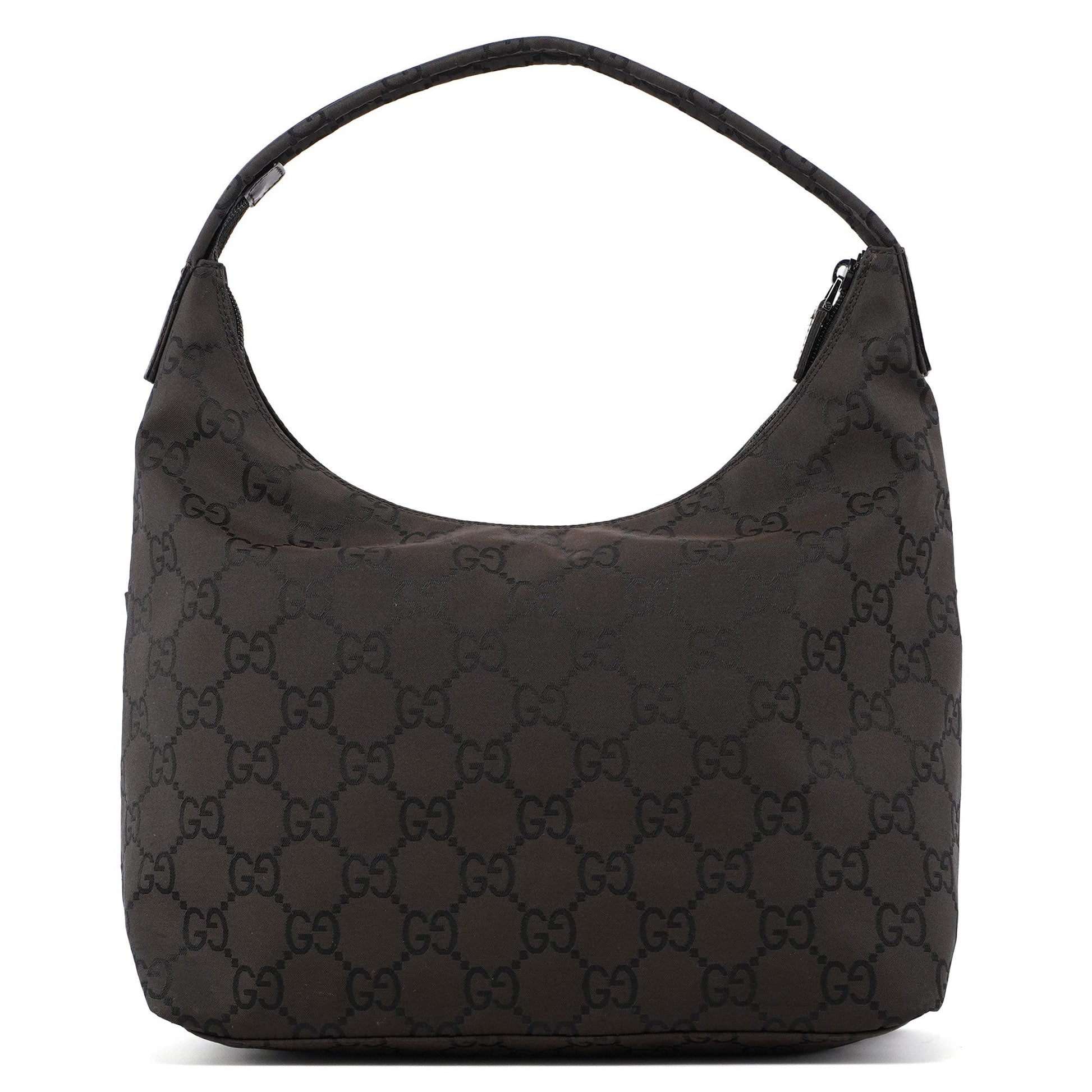 Designed by Tom Ford in the late 1990s, the Gucci GG shoulder bag boasts a brown GG monogram canvas with tonal leather trim. It features silver-tone hardware adorns and two zipper pockets at the front. The bag securely closes with a zipper, revealing a satin-lined interior complete with an additional zipper pocket.