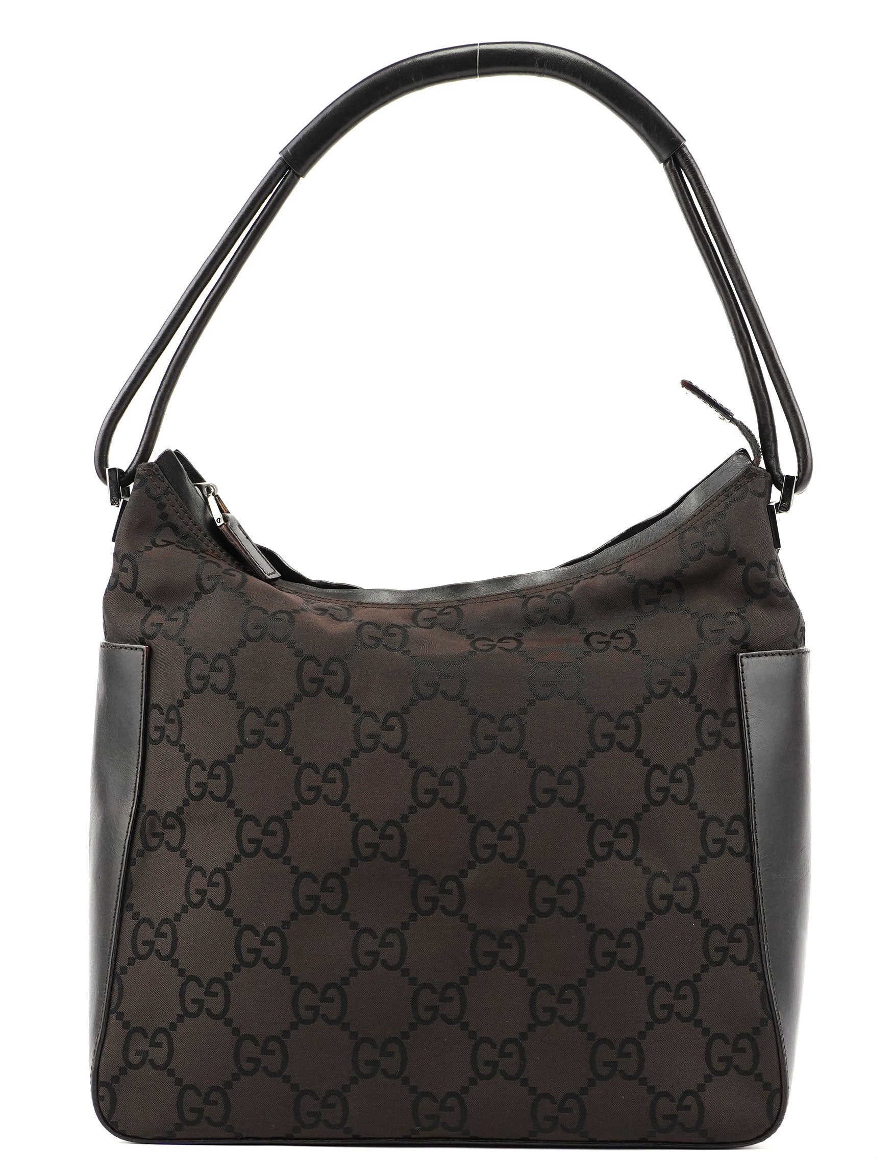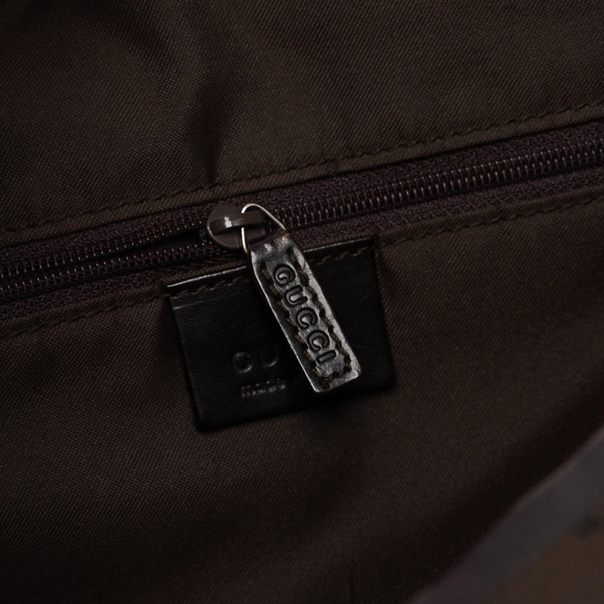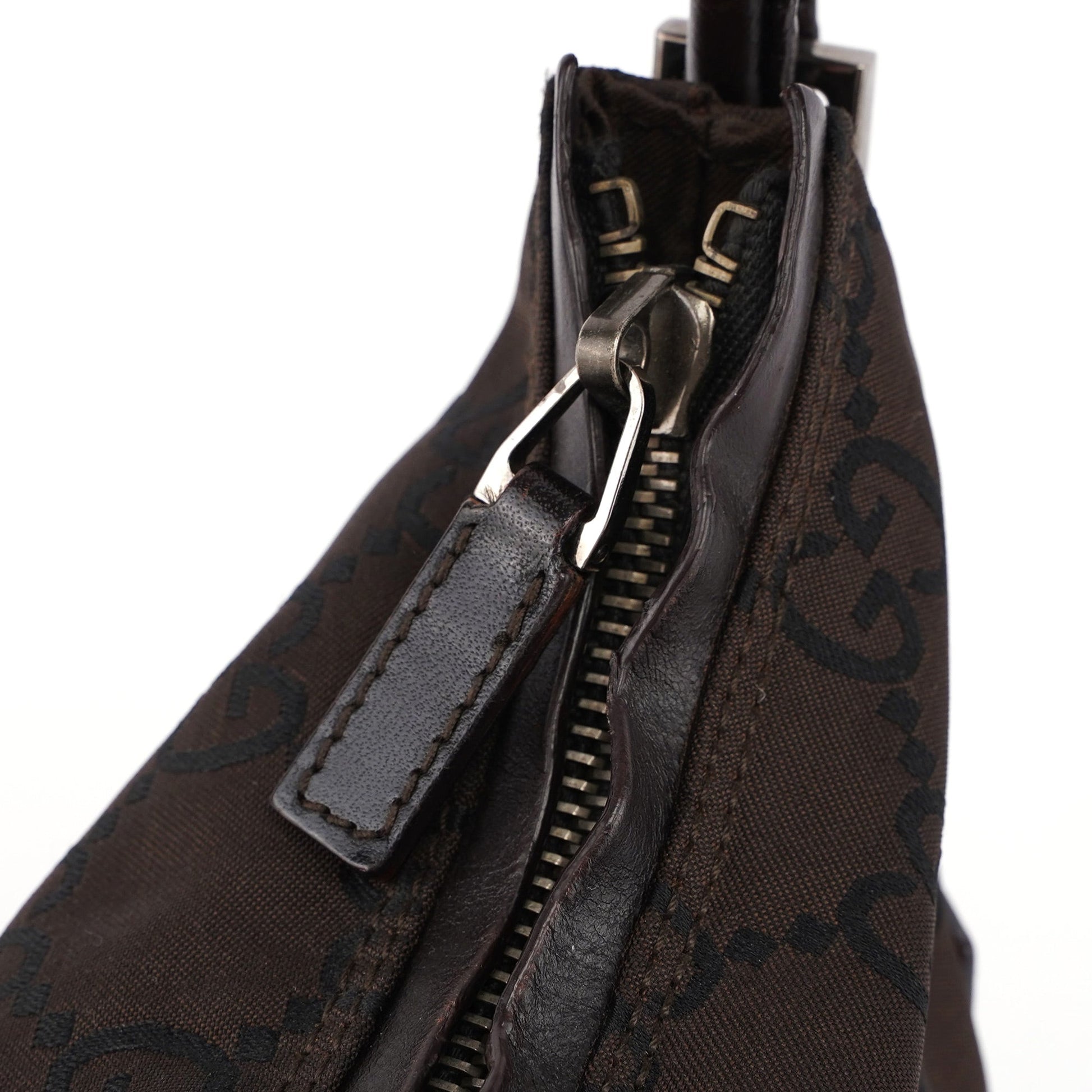 Designed by Tom Ford in the late 1990s, the Gucci hobo bag blends brown GG canvas and tonal leather elegantly. Silver-tone hardware complements its design. The cotton-lined interior features a convenient zipper pocket, with a discreet Gucci logo plate adorning the side.