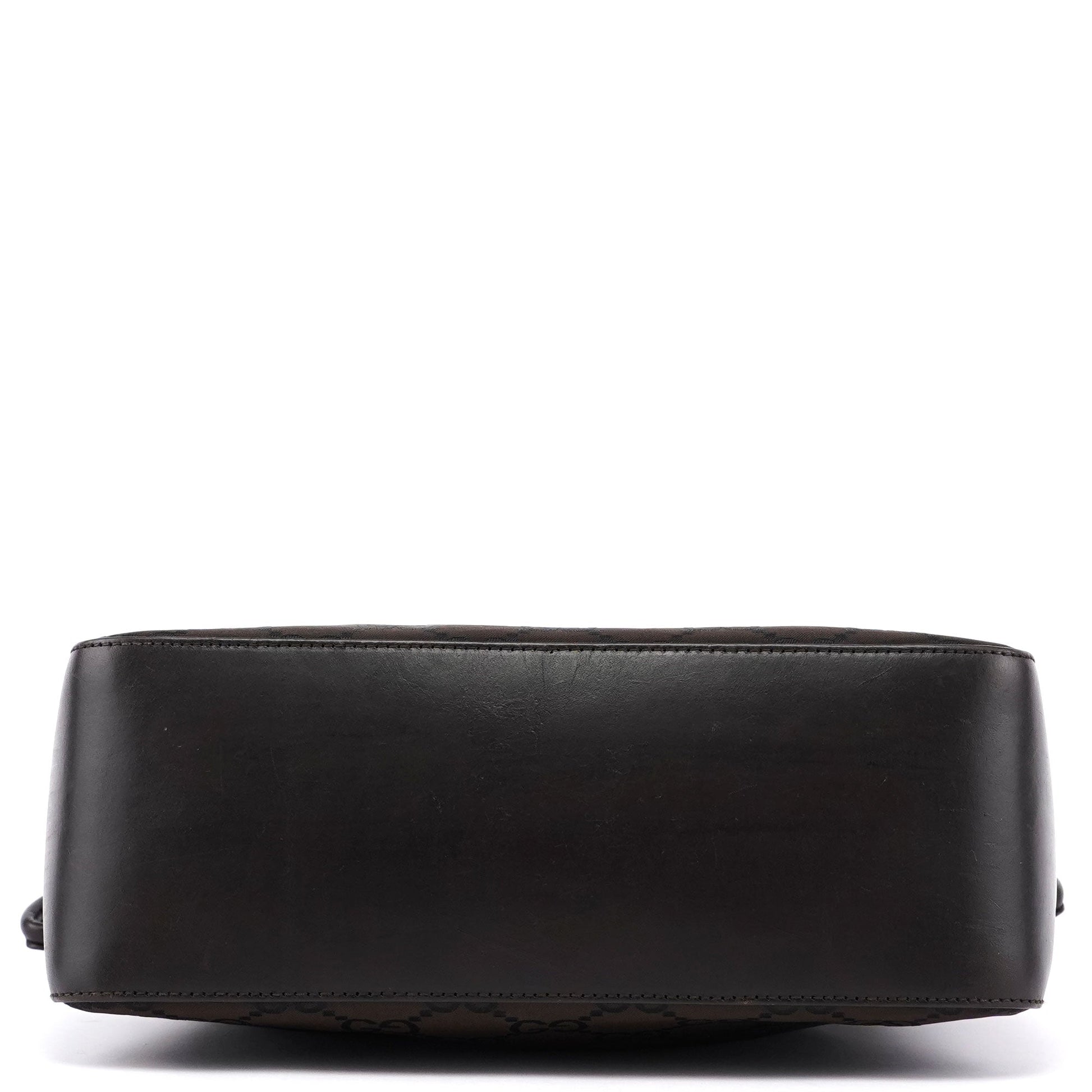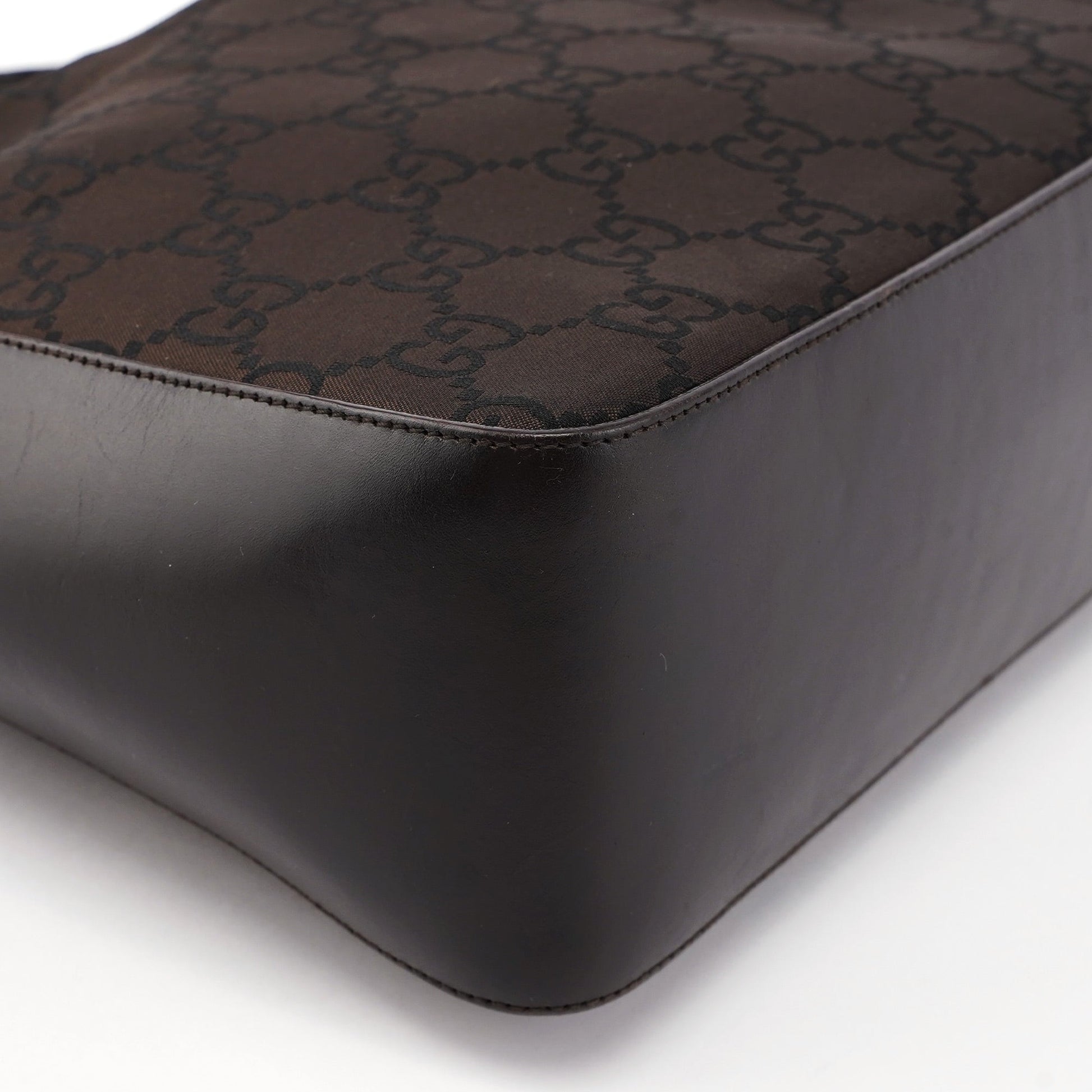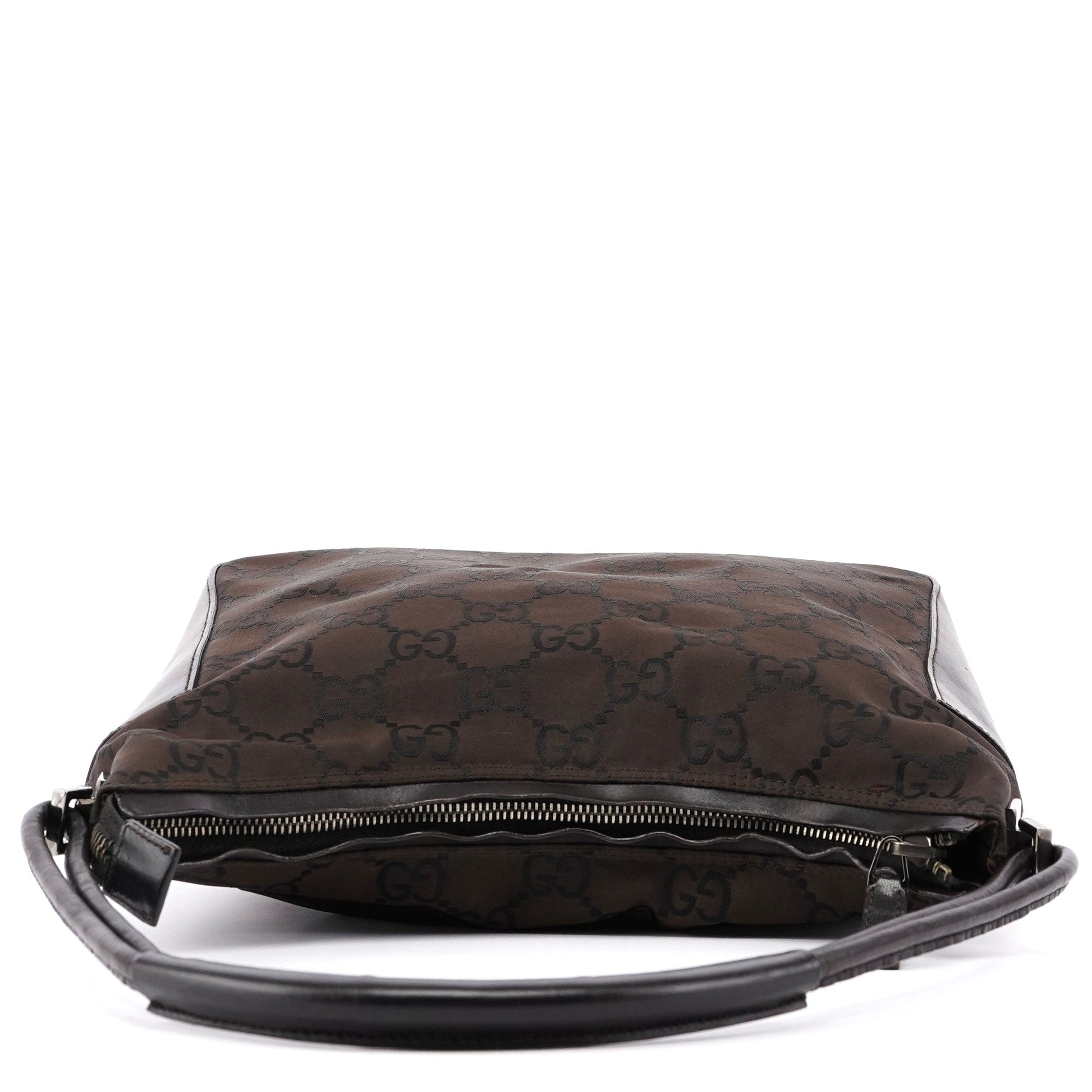 Designed by Tom Ford in the late 1990s, the Gucci hobo bag blends brown GG canvas and tonal leather elegantly. Silver-tone hardware complements its design. The cotton-lined interior features a convenient zipper pocket, with a discreet Gucci logo plate adorning the side.
