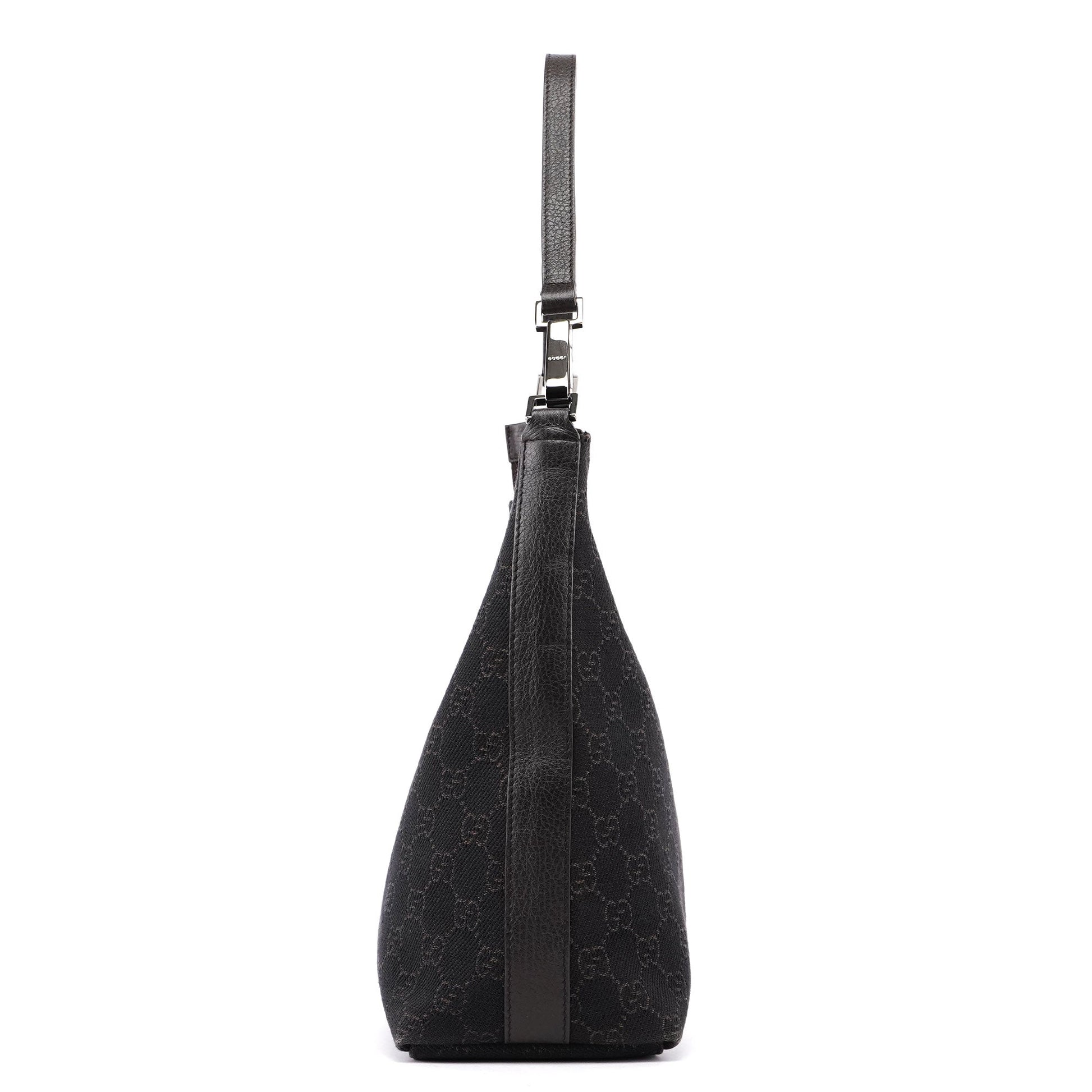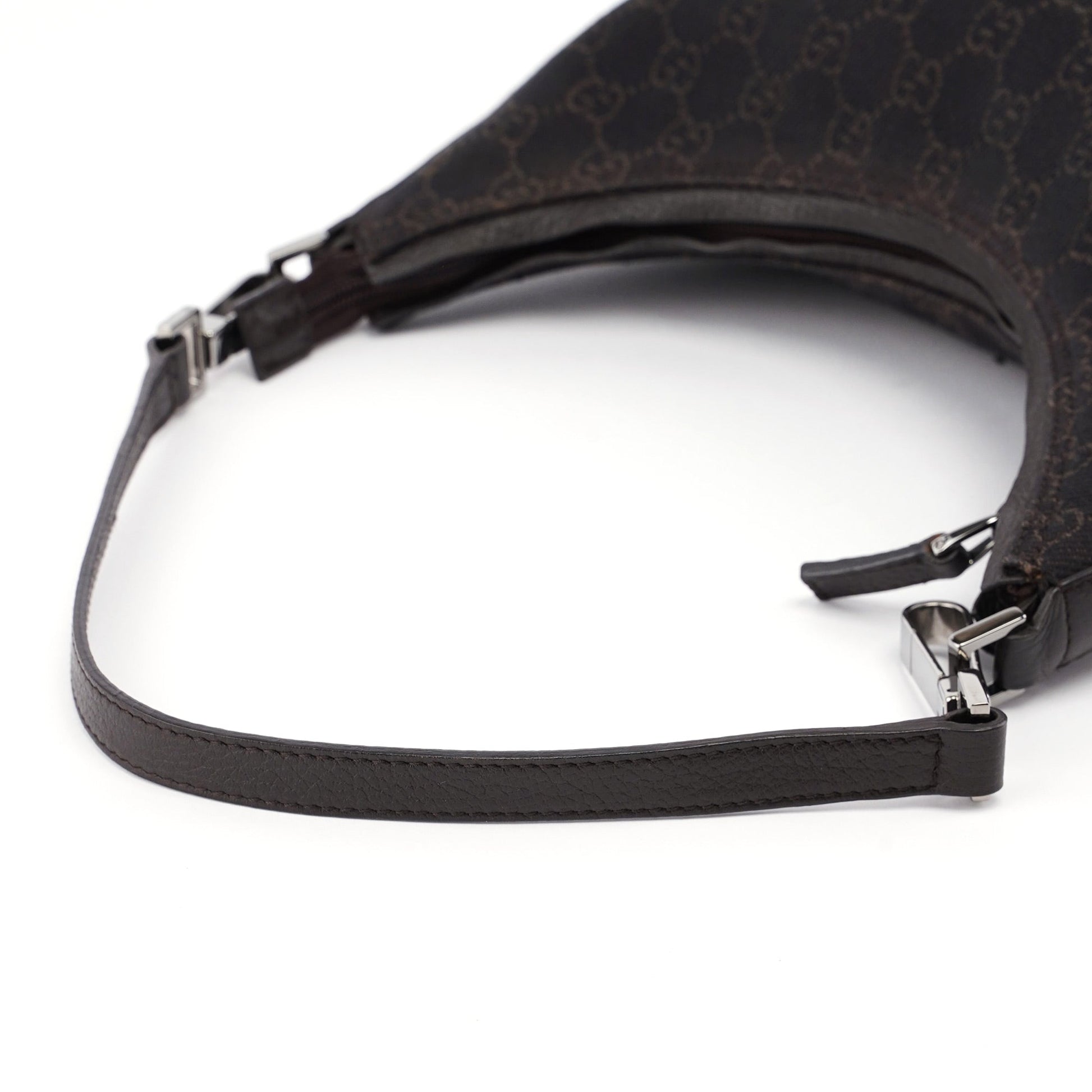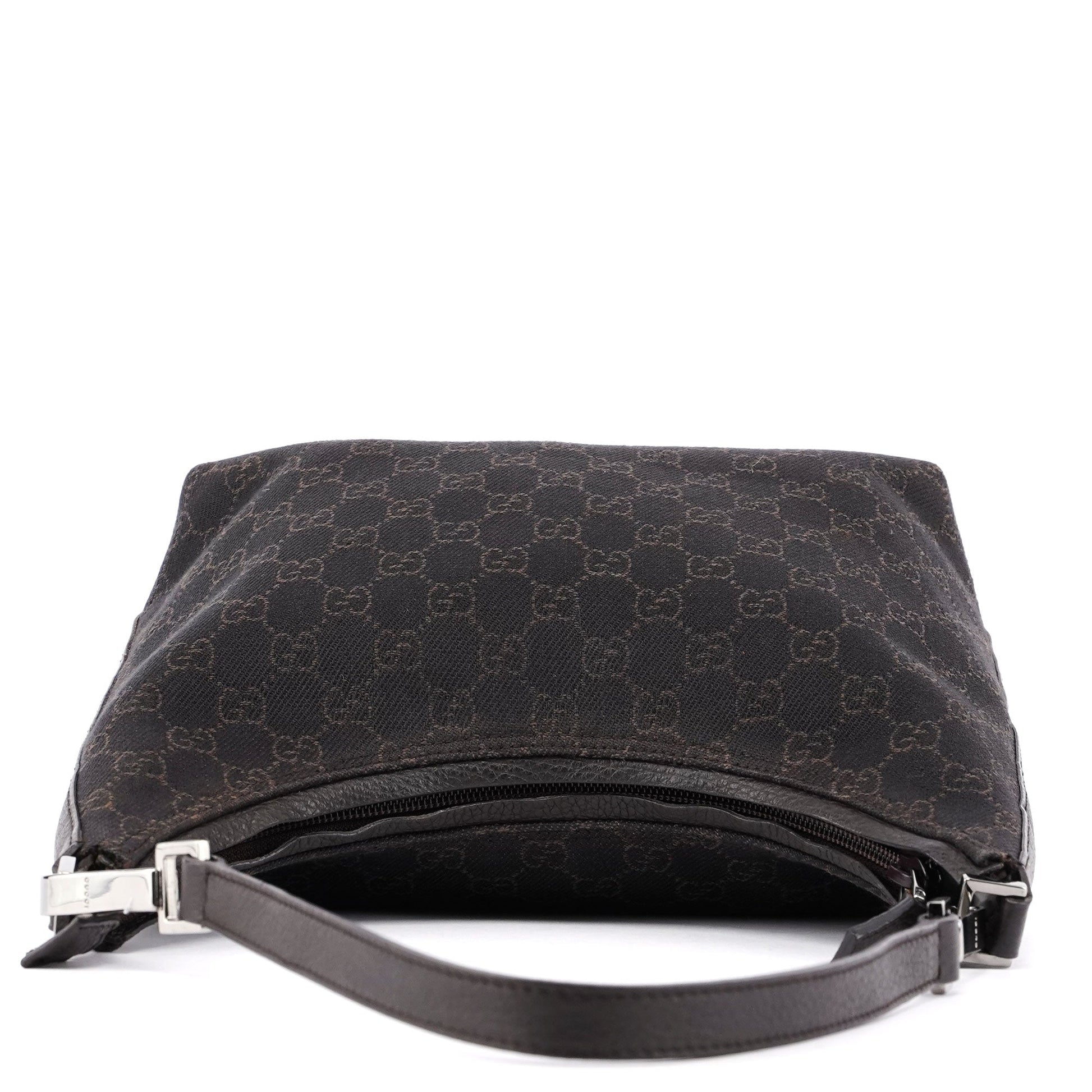 Unveil the elegance of the Gucci GG hobo shoulder bag, designed by Tom Ford in the late 1990s. Handcrafted from brown GG monogram it features silver-tone hardware with engraved Gucci logo, complemented by brown calfskin leather trim. A zipper closure secures the satin-lined interior.