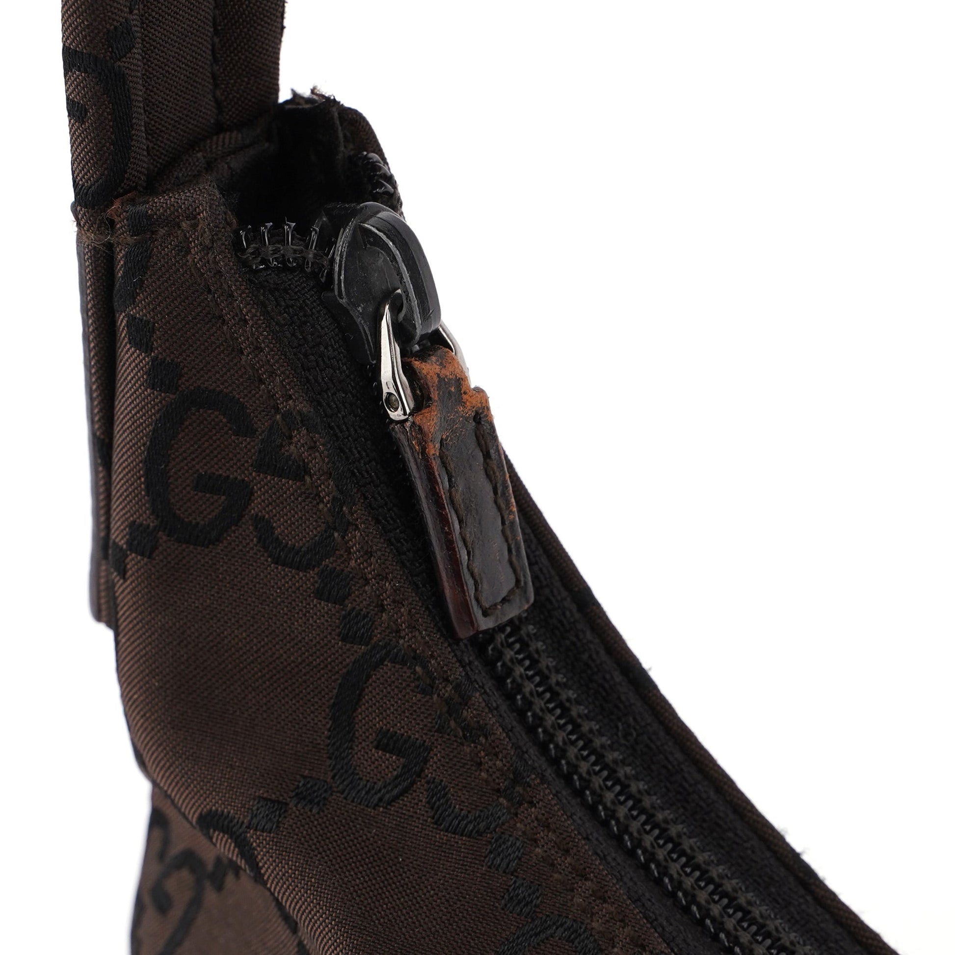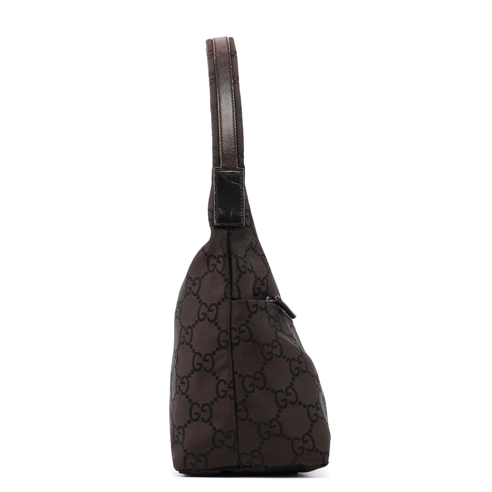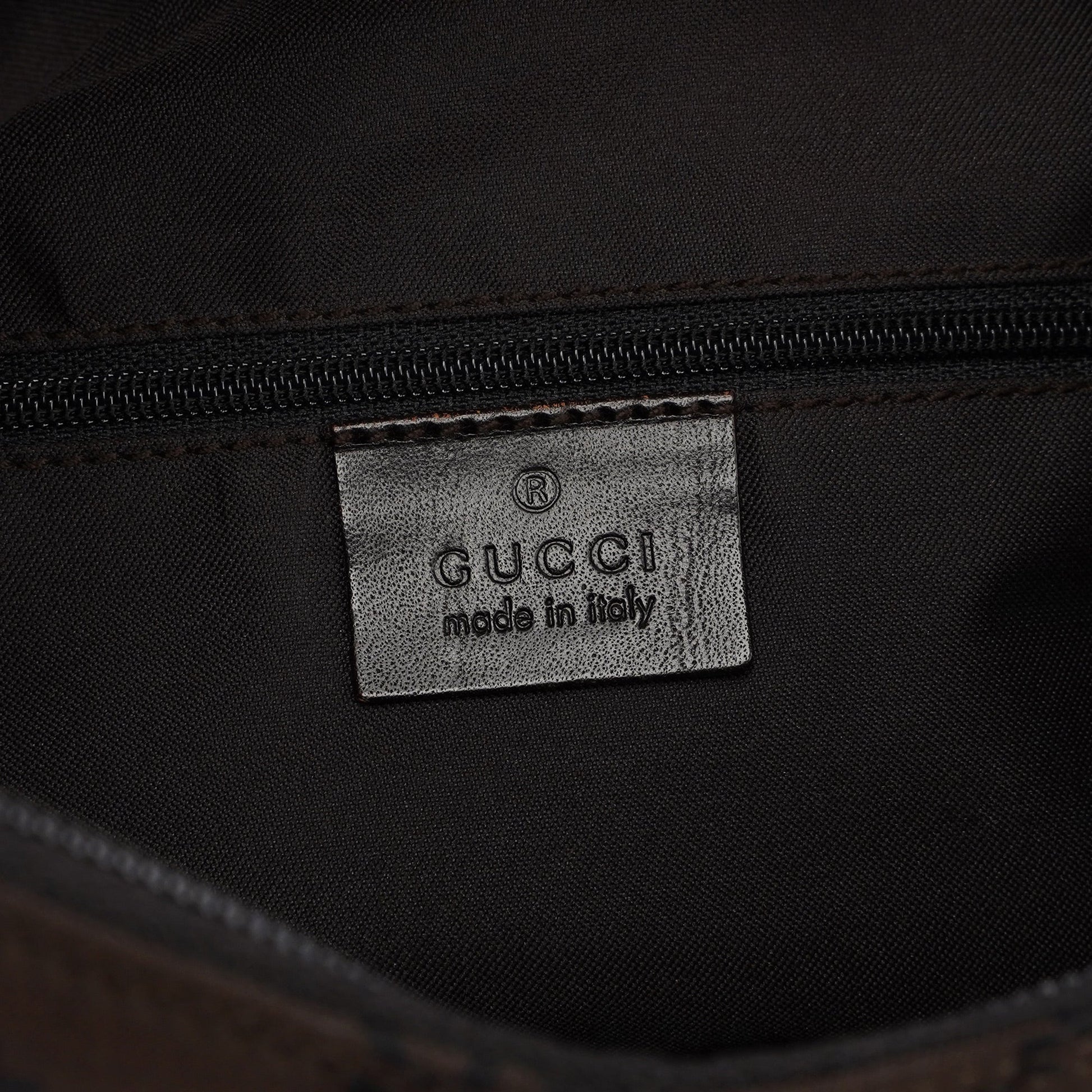 Designed by Tom Ford in the late 1990s, the Gucci GG shoulder bag boasts a brown GG canvas monogram with tonal leather trim. Silver-tone hardware adorns the exterior, including a convenient zipper pocket at the front. The bag securely closes with a zipper, revealing a satin-lined interior complete with an additional zipper pocket.