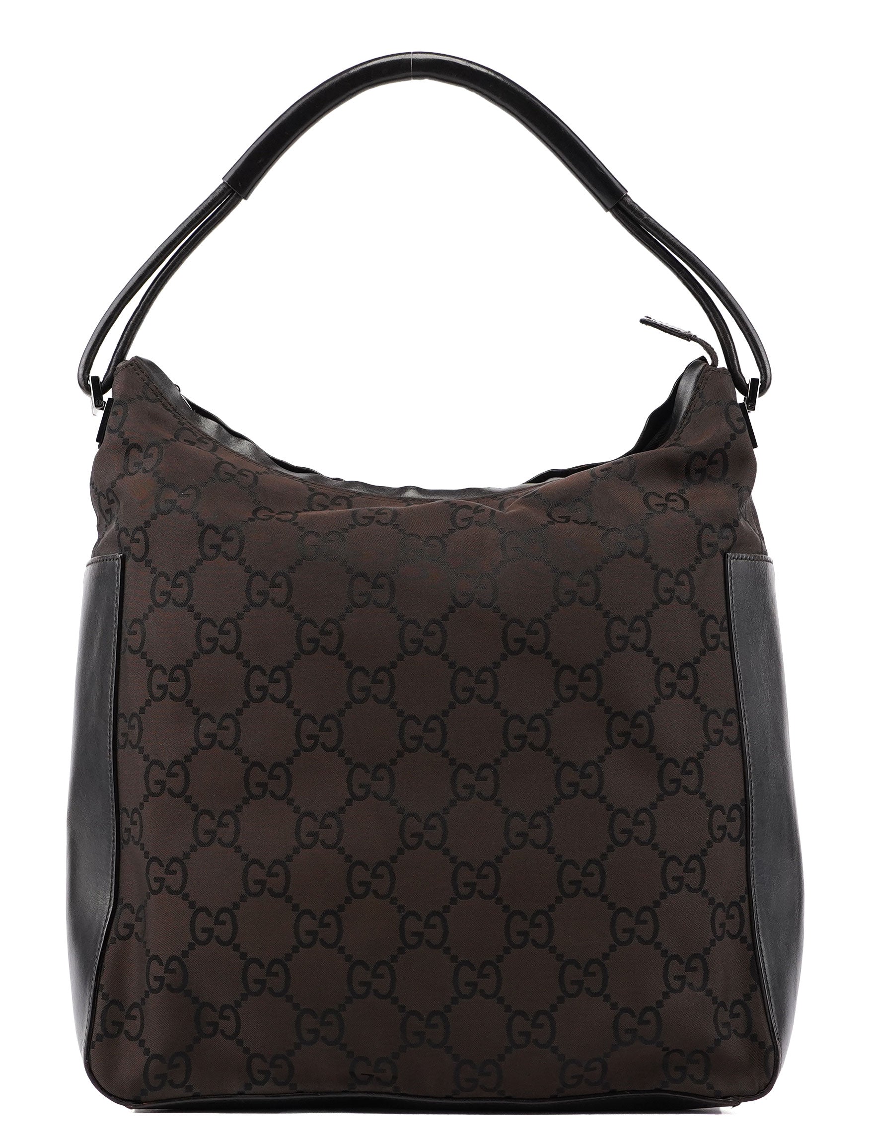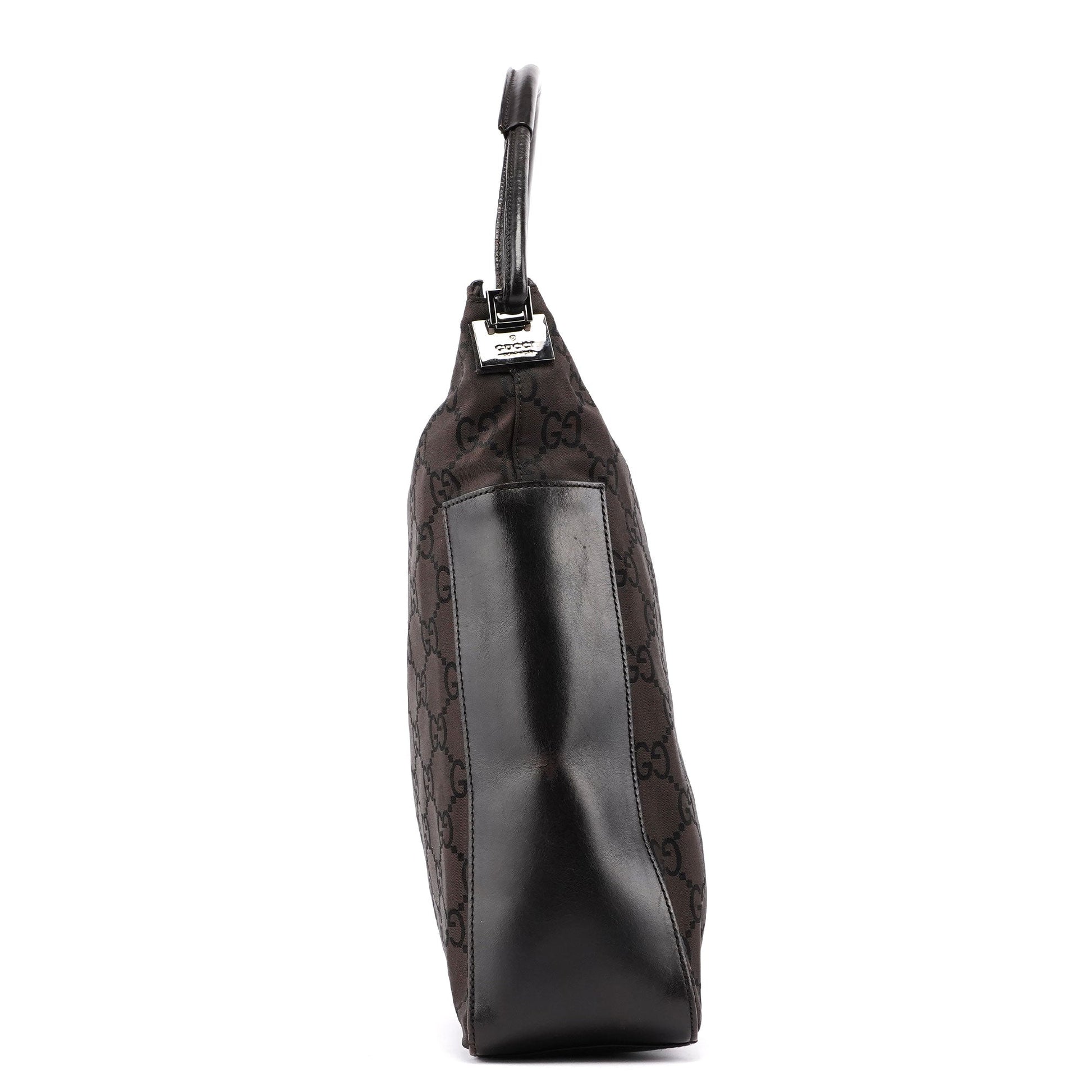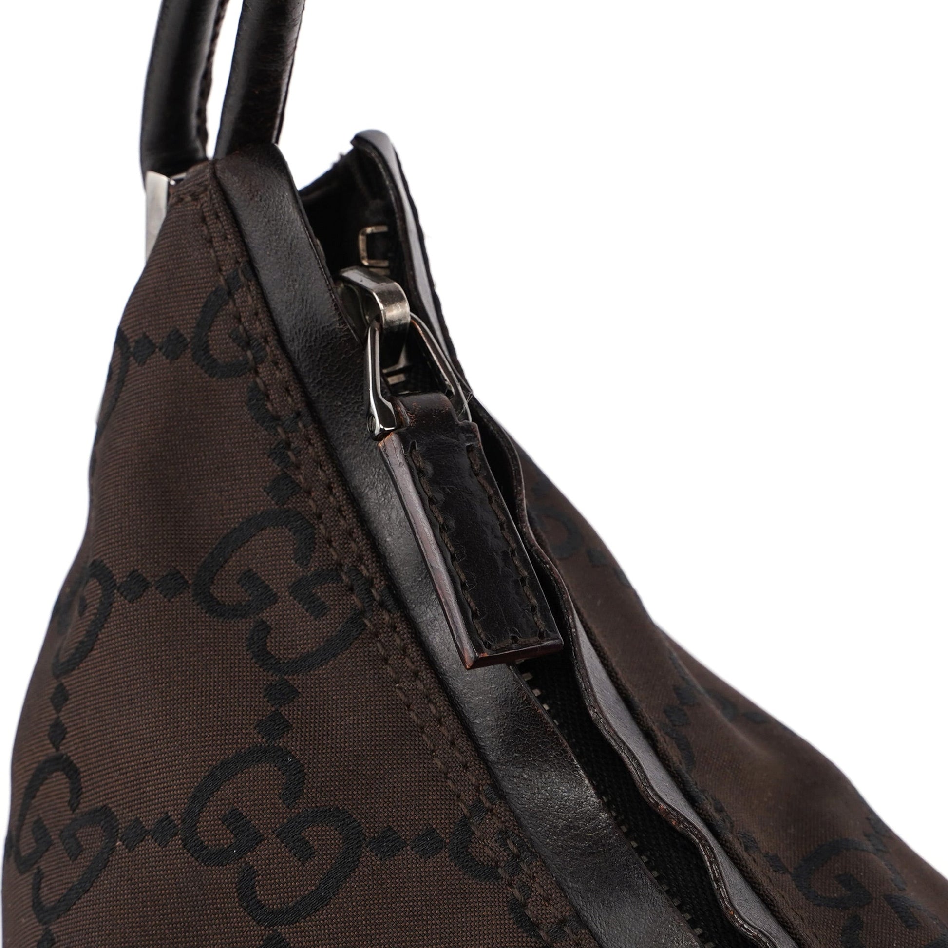 Designed by Tom Ford in the late 1990s, the Gucci hobo bag blends brown GG canvas and tonal leather elegantly. Silver-tone hardware complements its design. The cotton-lined interior features a convenient zipper pocket, with a discreet Gucci logo plate adorning the side.