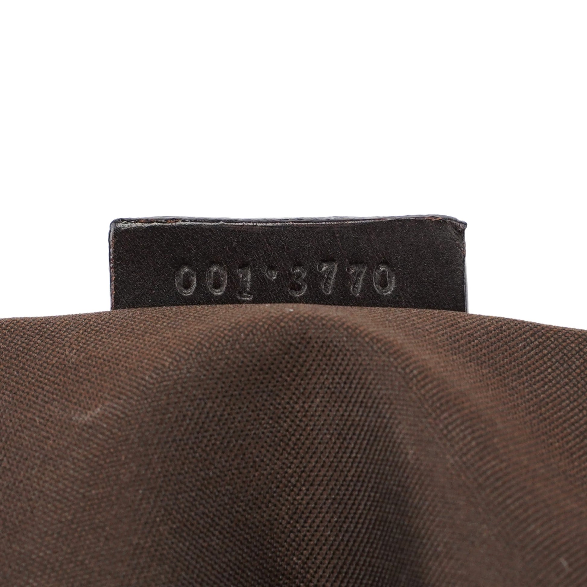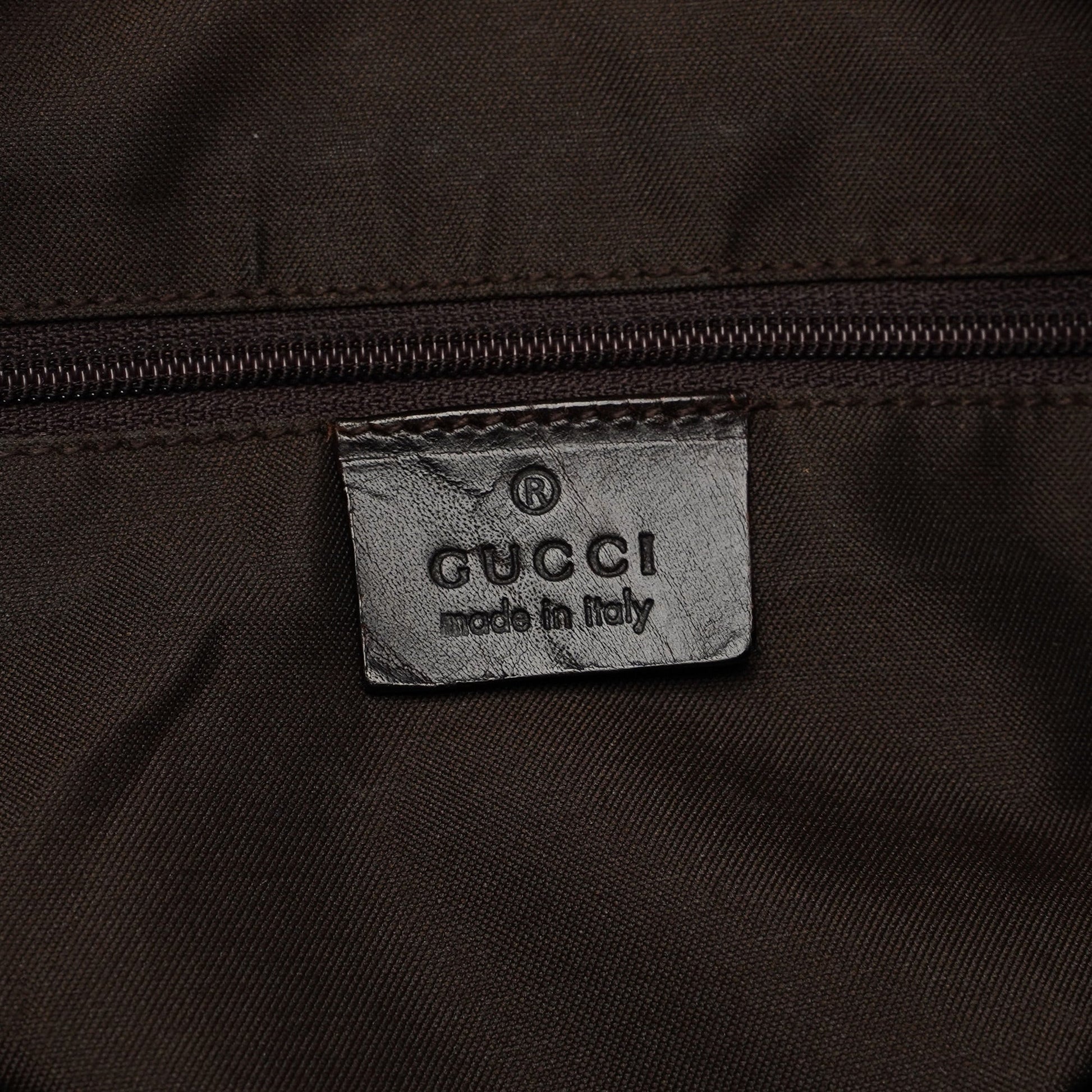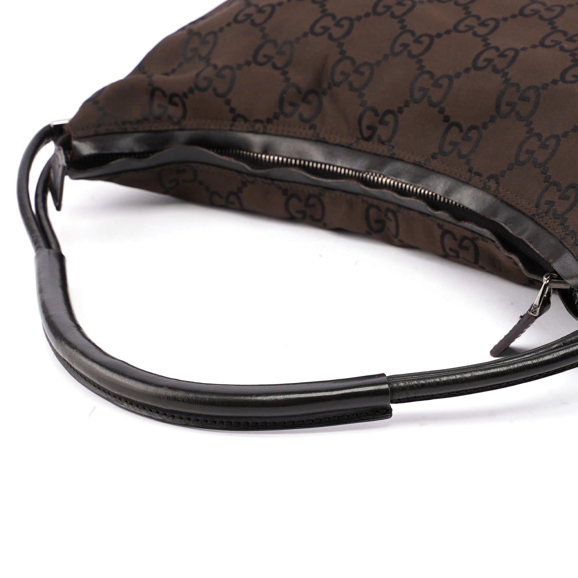 Designed by Tom Ford in the late 1990s, the Gucci hobo bag blends brown GG canvas and tonal leather elegantly. Silver-tone hardware complements its design. The cotton-lined interior features a convenient zipper pocket, with a discreet Gucci logo plate adorning the side.