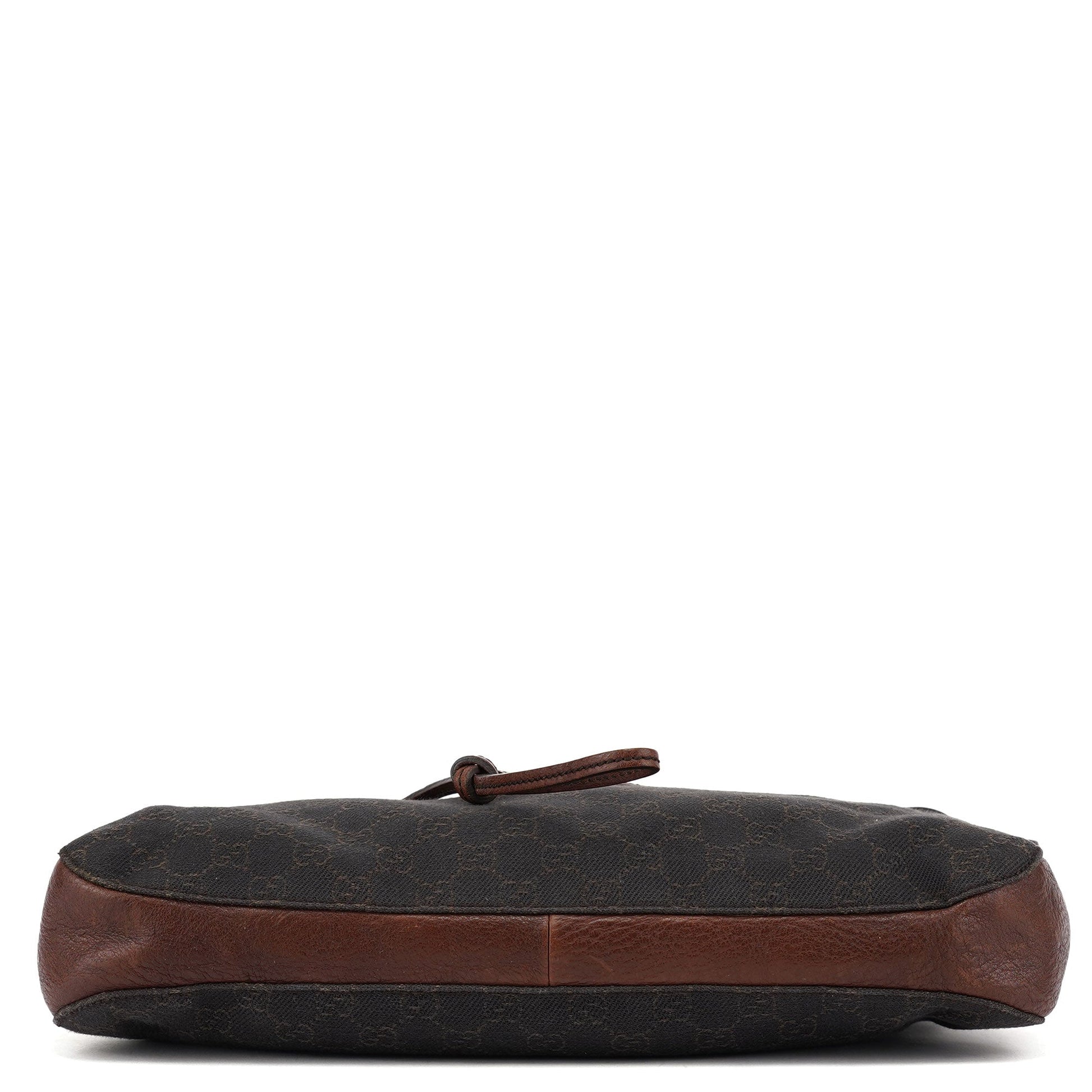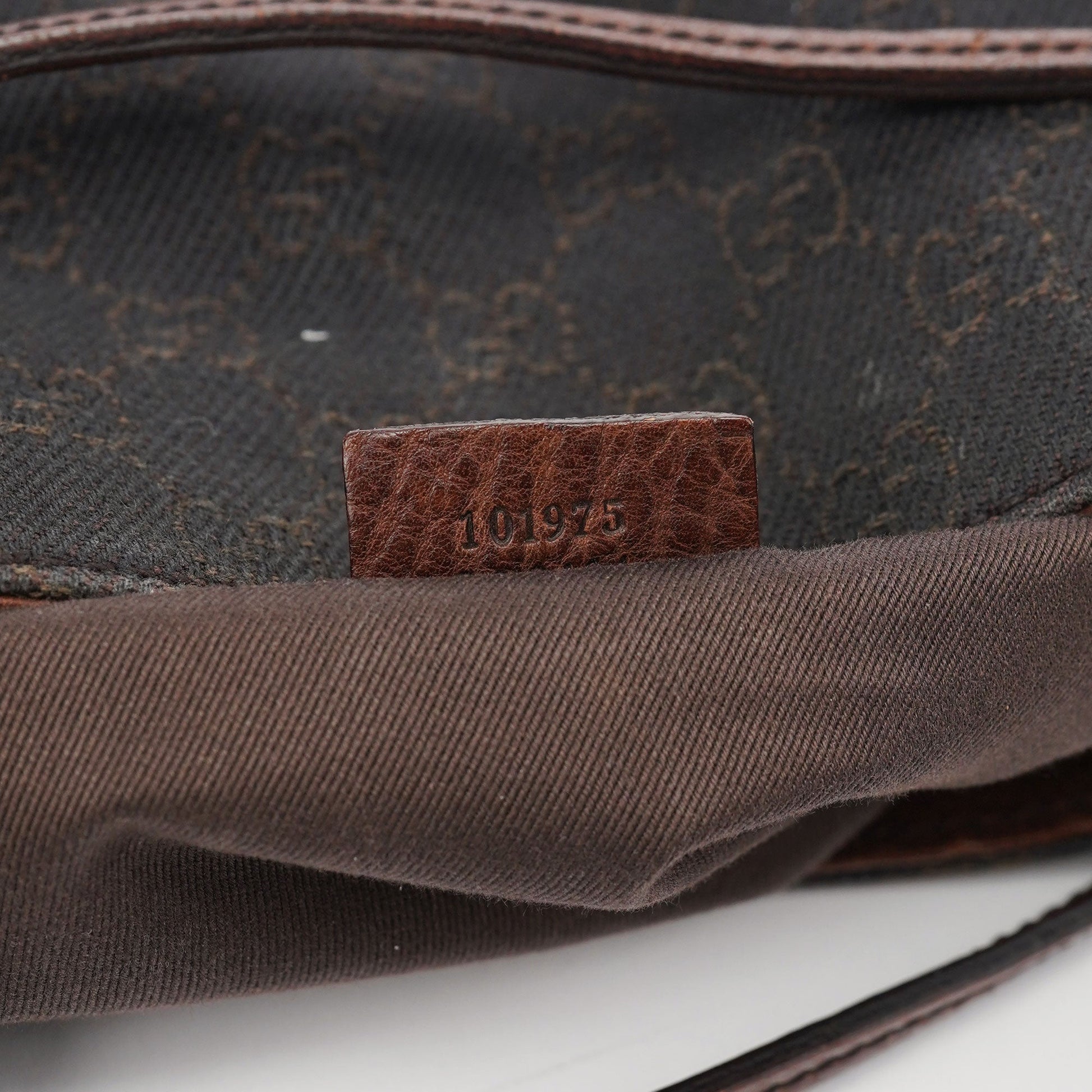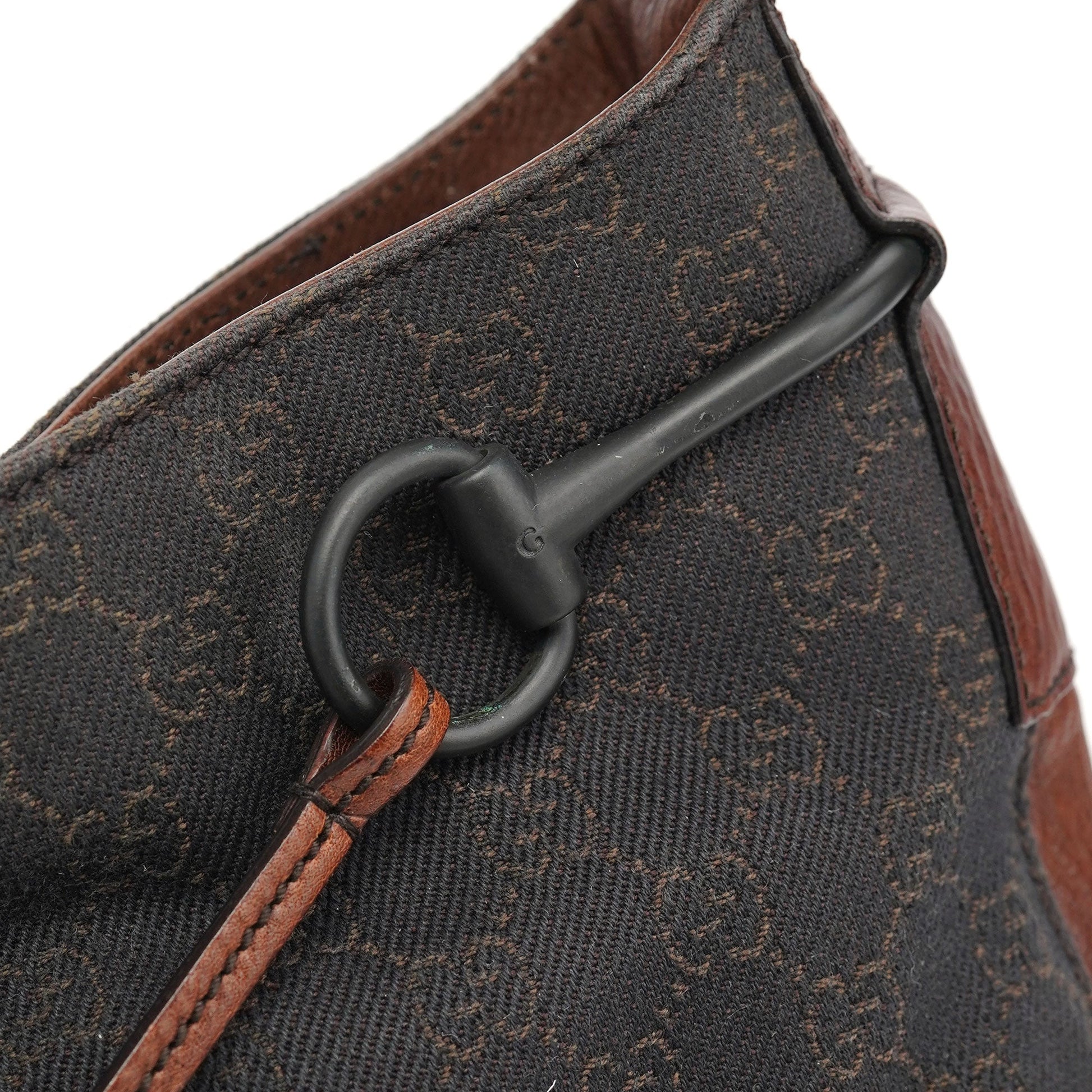 Designed by Tom Ford in the early 2000s, the Gucci GG Horsebit shoulder bag is crafted from brown GG monogram canvas with anthracite horsebit hardware. A belt detail on the handle adds distinction, while the magnetic closure secures a cotton-lined interior with a zipper pocket.