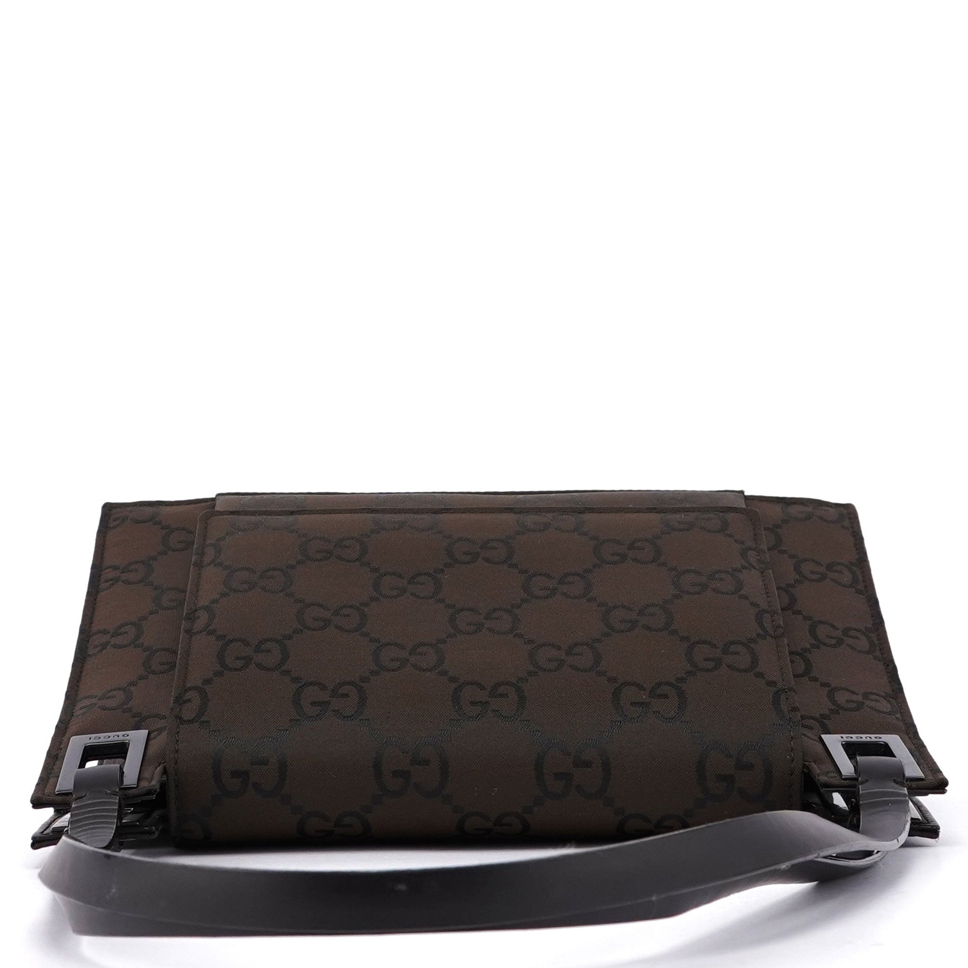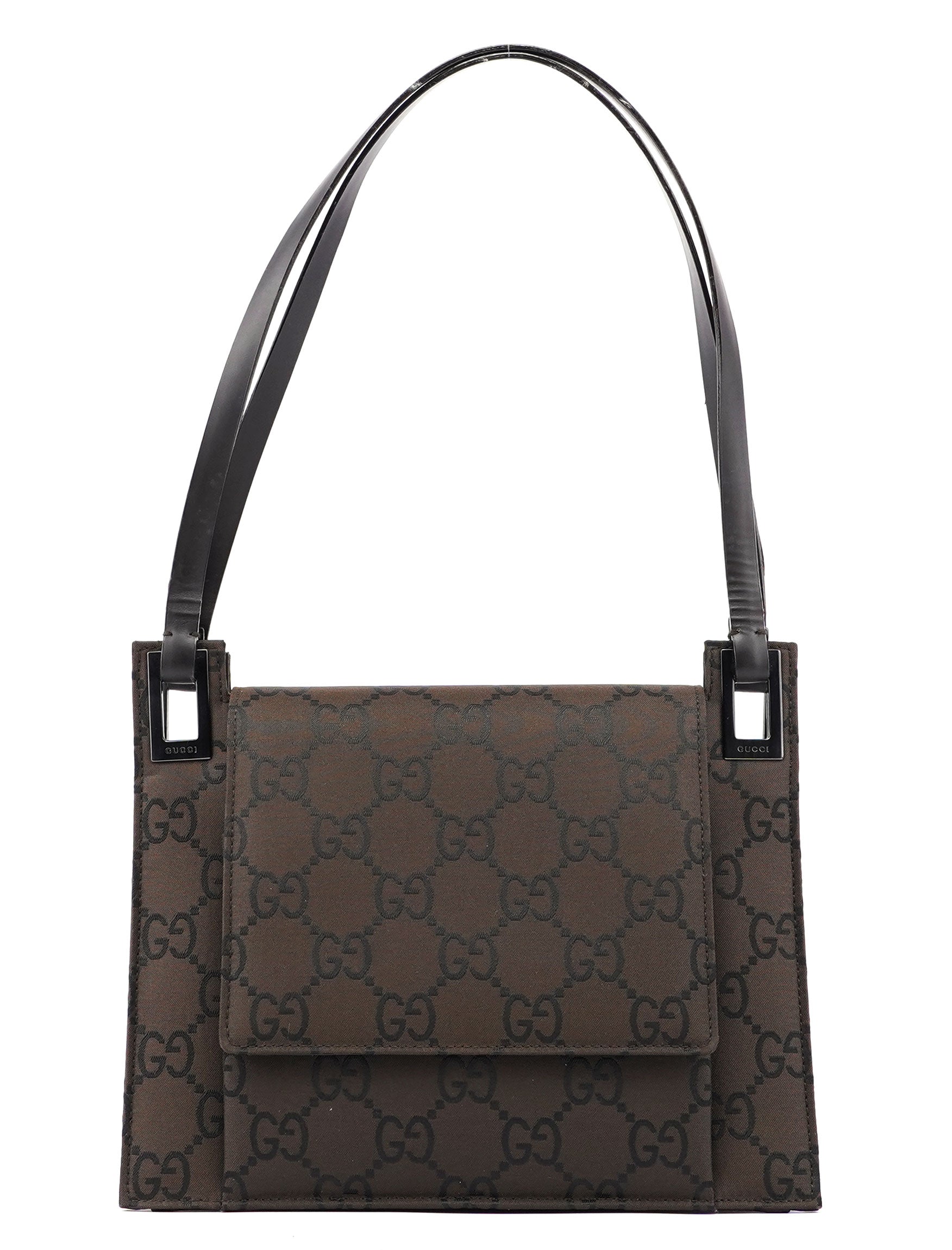 Designed by Tom Ford in the late 1990s, the Gucci GG shoulder bag is handcrafted from brown GG monogram canvas with tonal leather trim. It features anthracite hardware engraved with the Gucci logo, a flap magnetic closure, and a satin-lined interior with a zipper pocket.