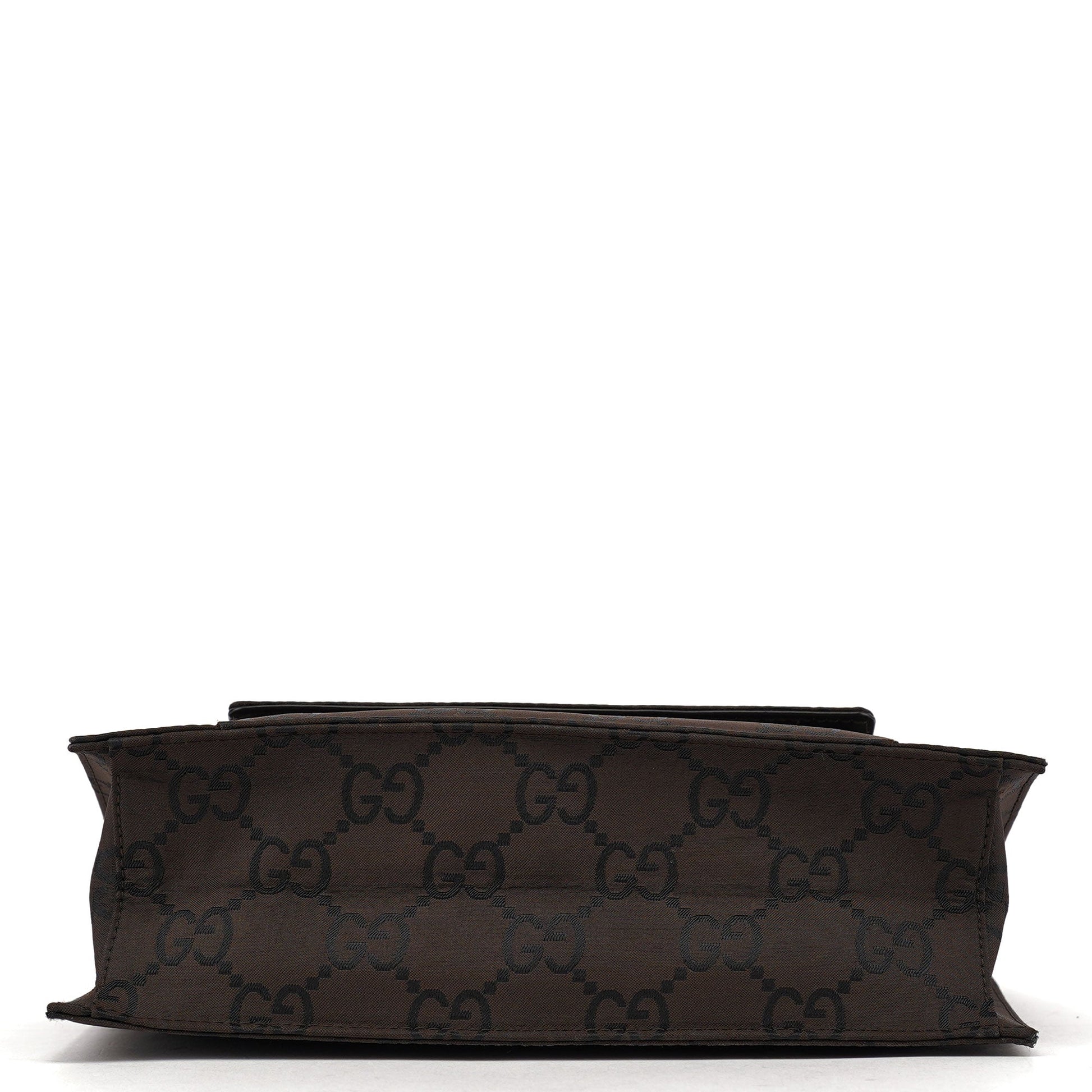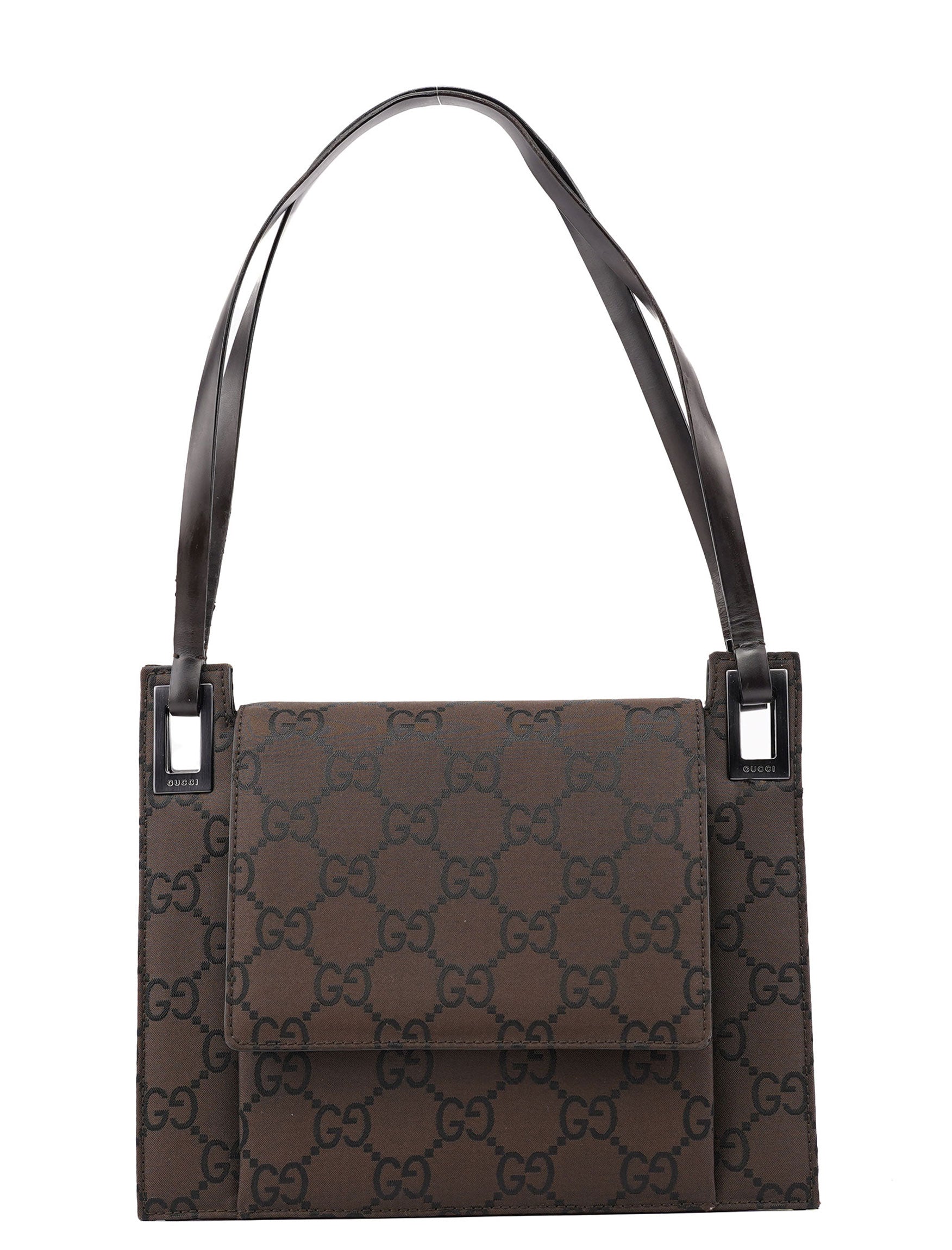 Designed by Tom Ford in the late 1990s, the Gucci GG shoulder bag is handcrafted from brown GG monogram canvas with tonal leather trim. It features anthracite hardware engraved with the Gucci logo, a flap magnetic closure, and a satin-lined interior with a zipper pocket.