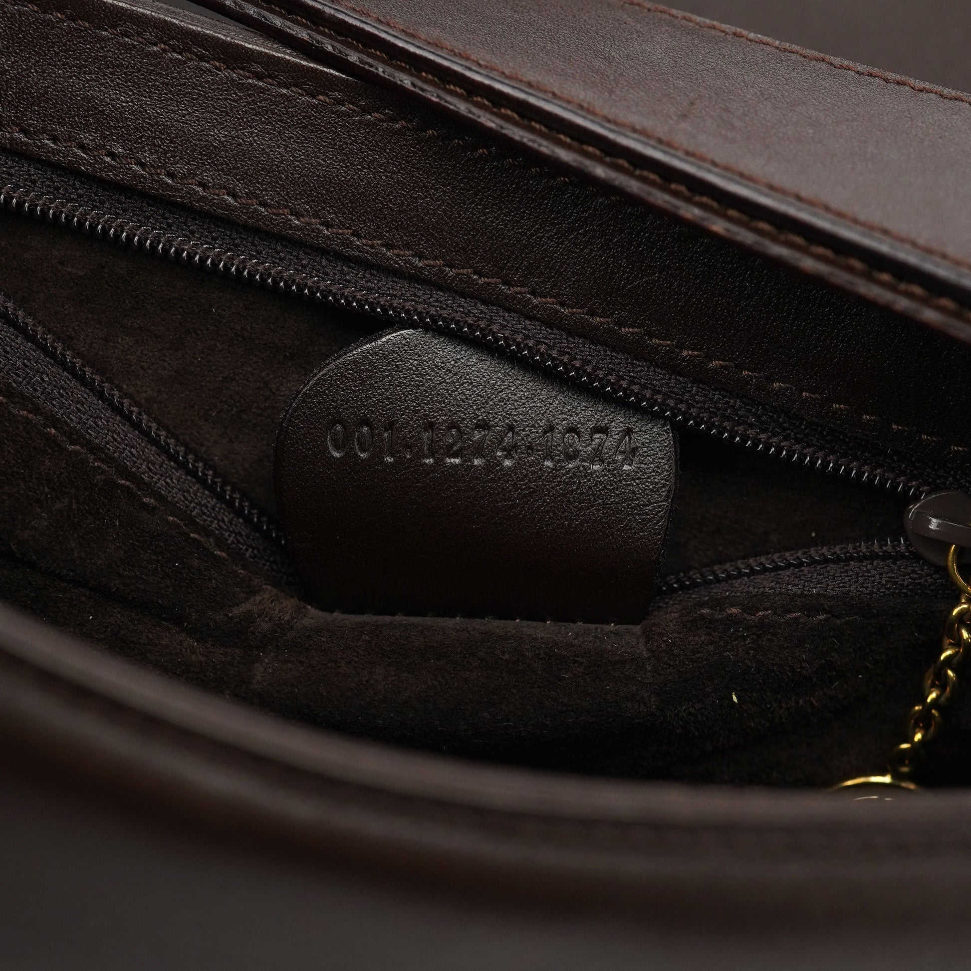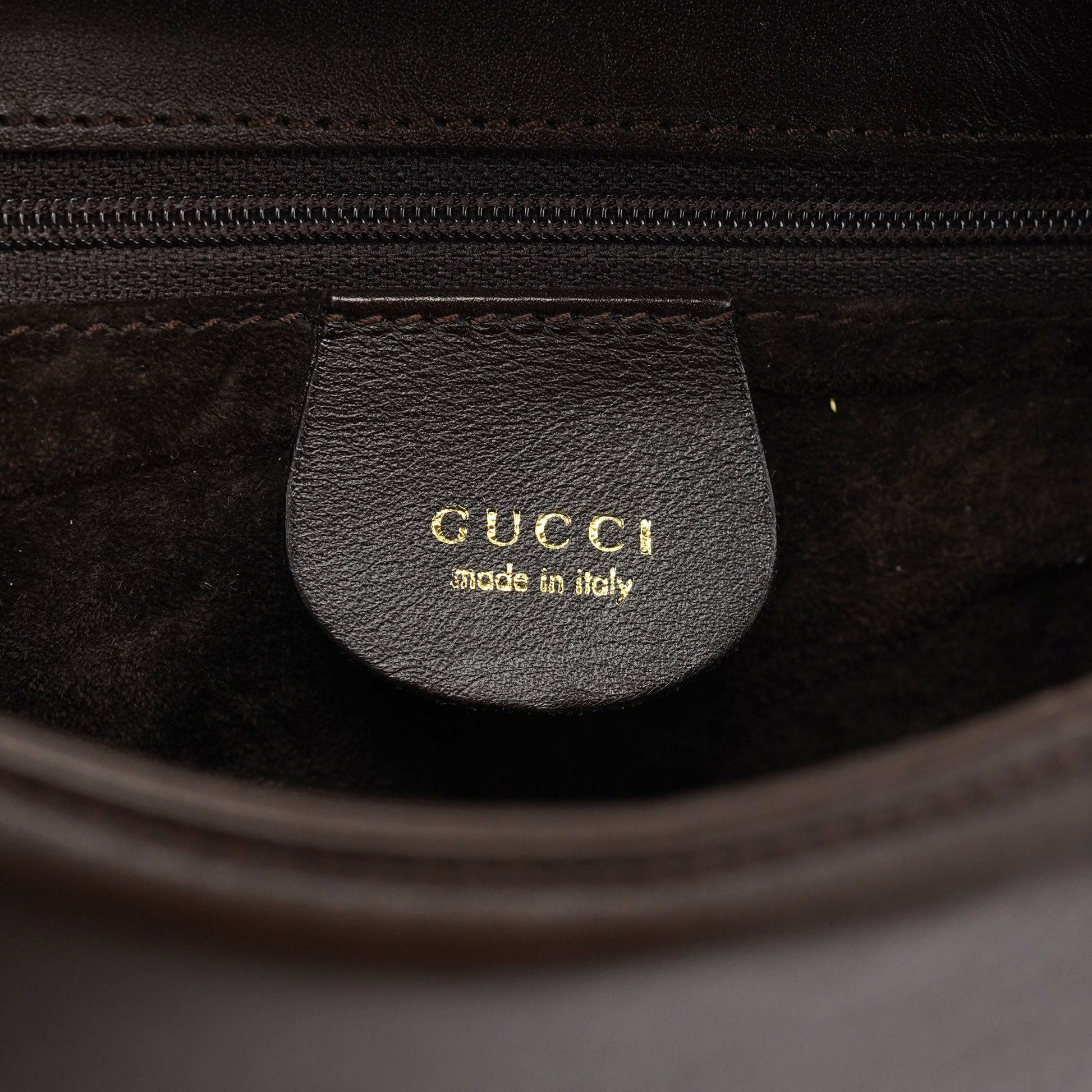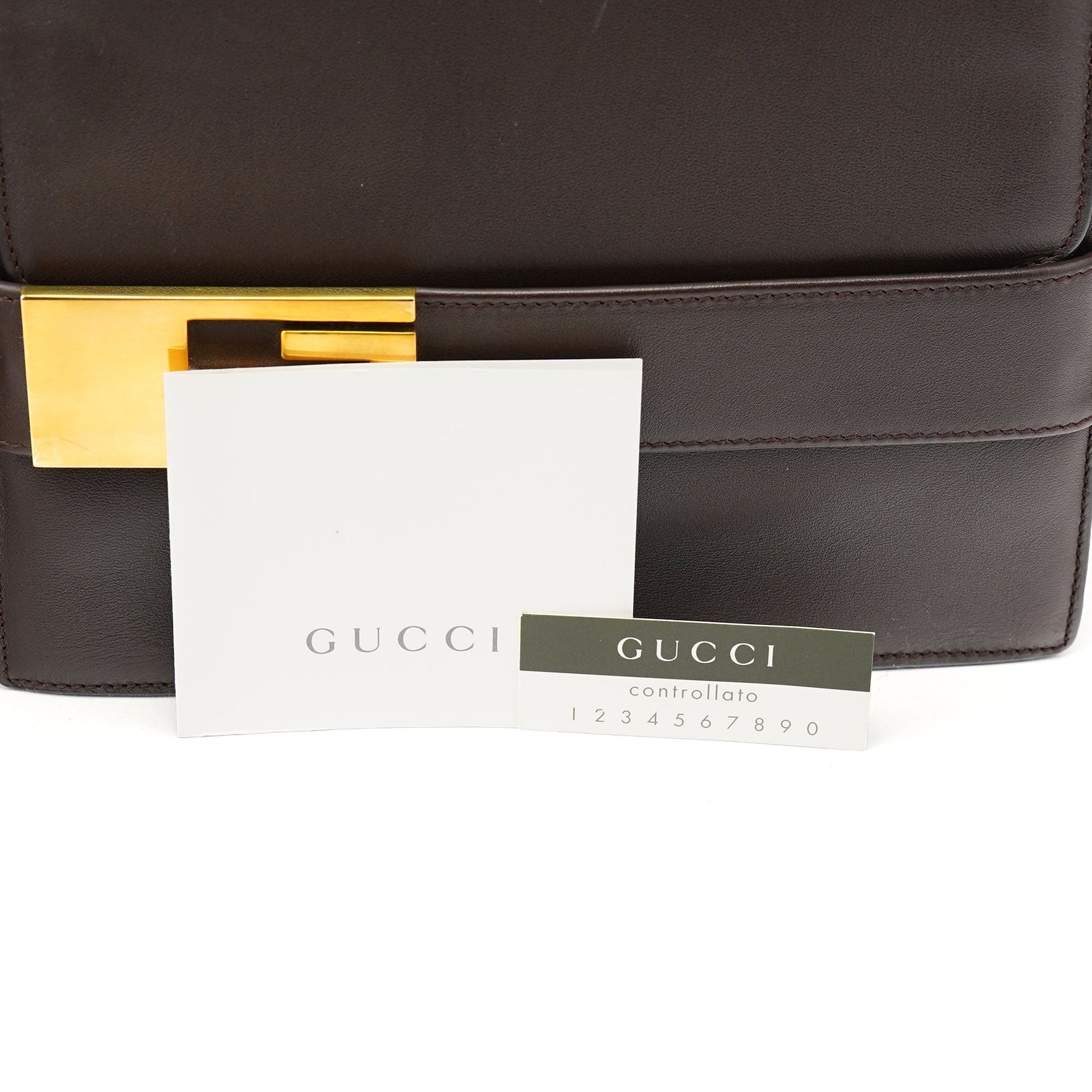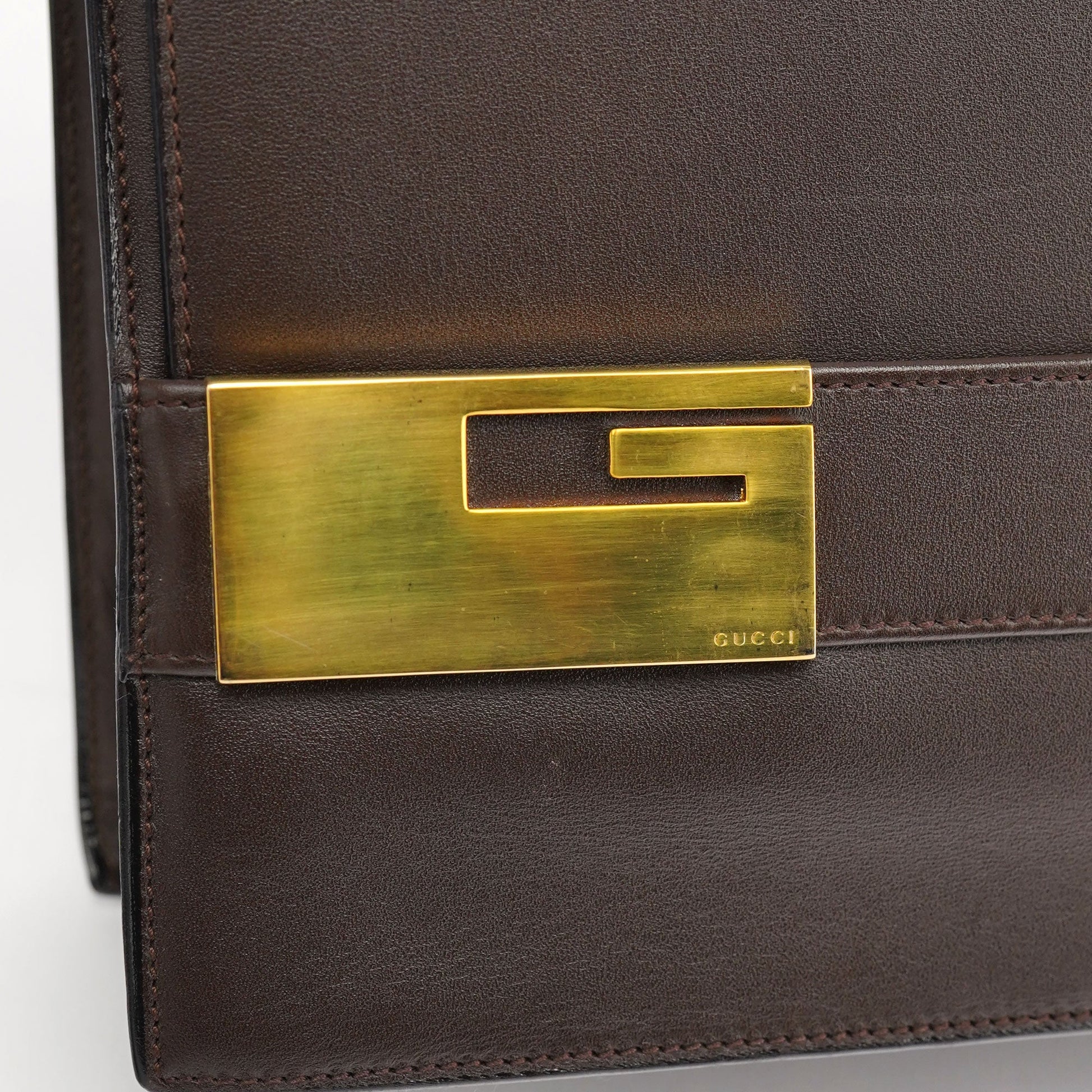 Designed by Tom Ford in the late '90s, the Gucci Square G bag exudes elegance. Its brown calfskin leather exterior is accentuated by gold-tone hardware bearing the iconic Gucci logo. The flap closure opens to reveal a luxurious interior lined with sumptuous suede, complete with a convenient interior zipper pocket.