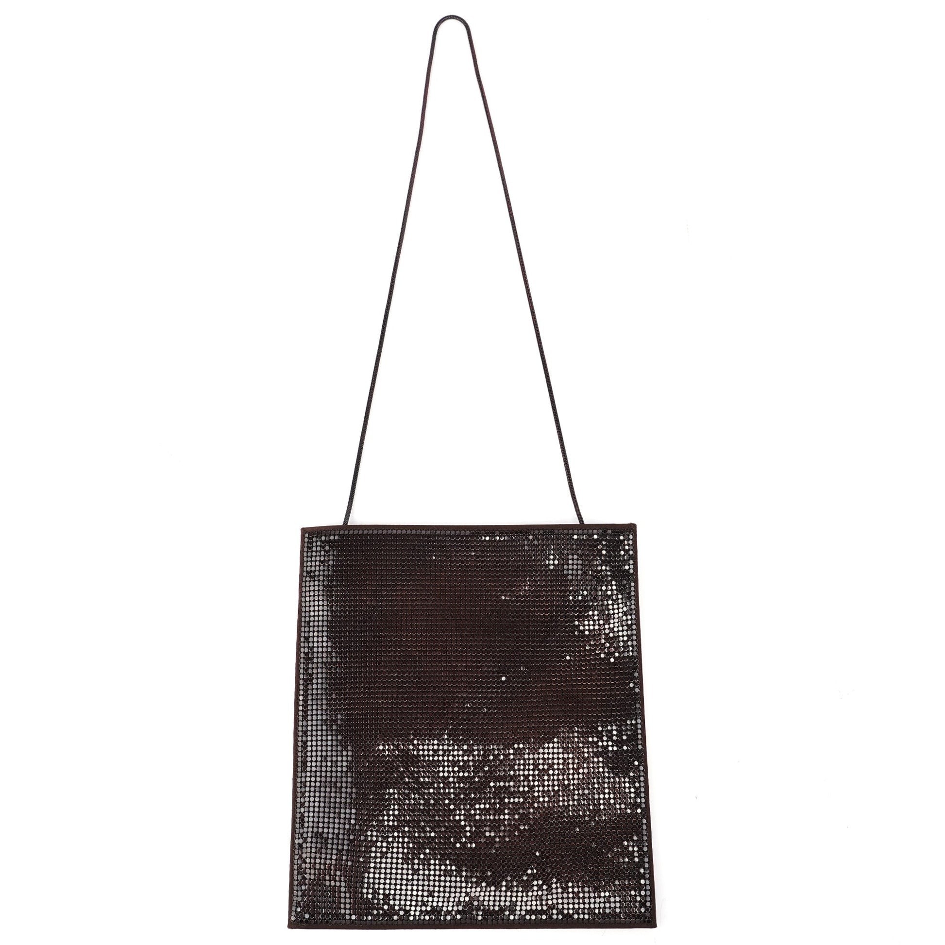 Handcrafted from brown silk with a brown sequin chainmail overlay, this incredibly rare Gucci Sequin mini bag by Tom Ford from the late 1990s features a removable snake chain handle and a silk-lined interior with a pocket, showcasing timeless elegance.