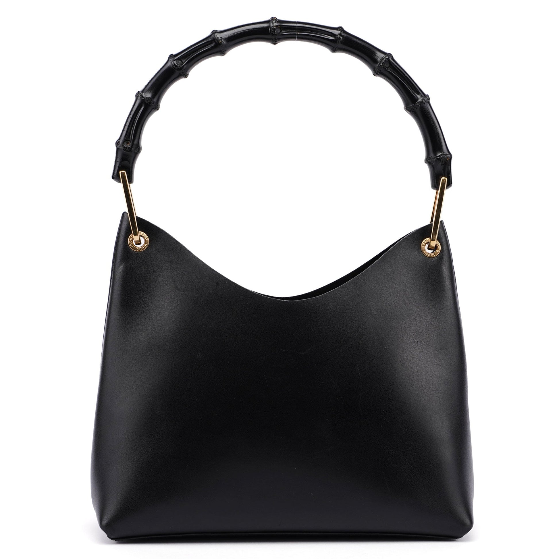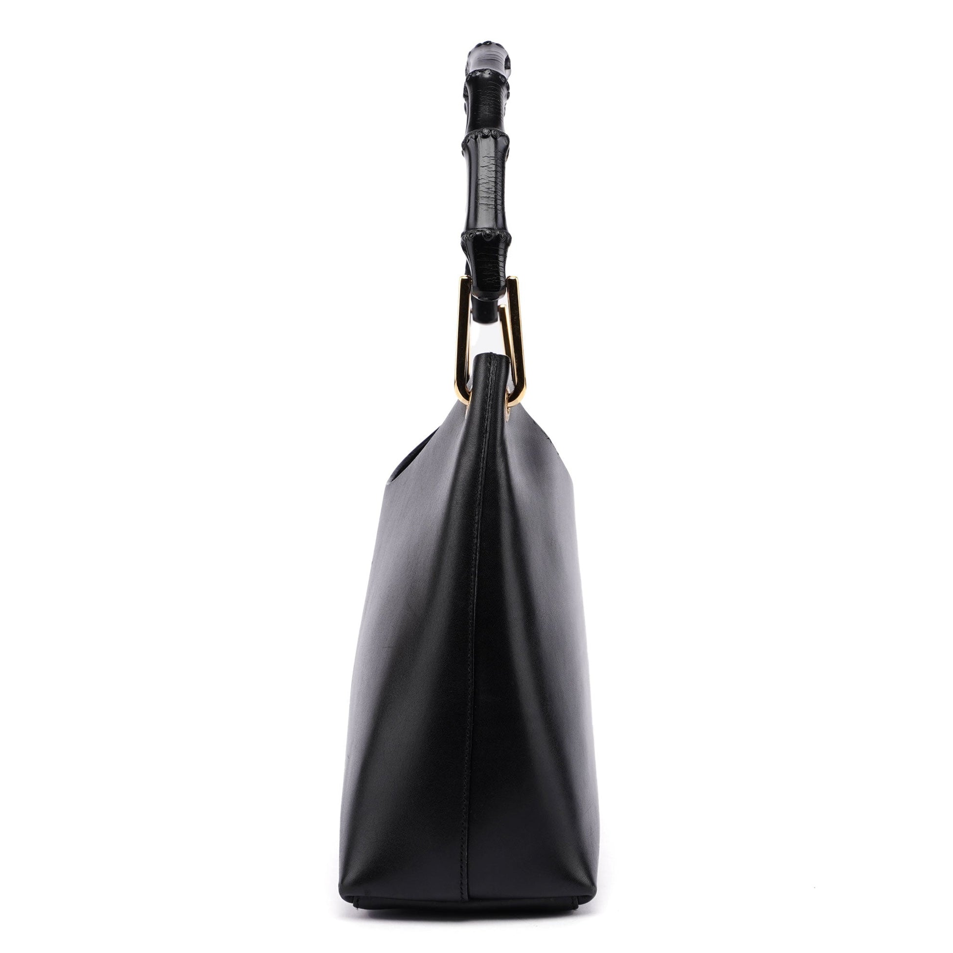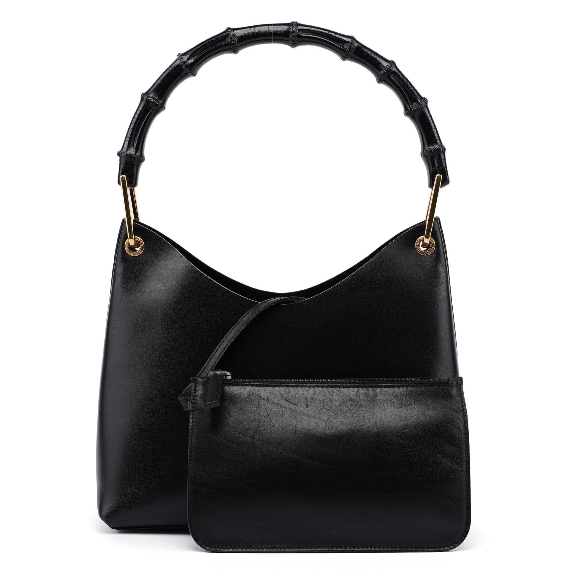 Designed by Tom Ford in the late 1990s, this Gucci Bamboo leather shoulder bag seamlessly combines functionality with luxurious design. It features an attached zipper pouch in the same premium leather, perfect for securing small essentials. The bag is finished with elegant gold-tone hardware, adding a touch of sophistication to this timeless piece, making it a versatile addition to any wardrobe.