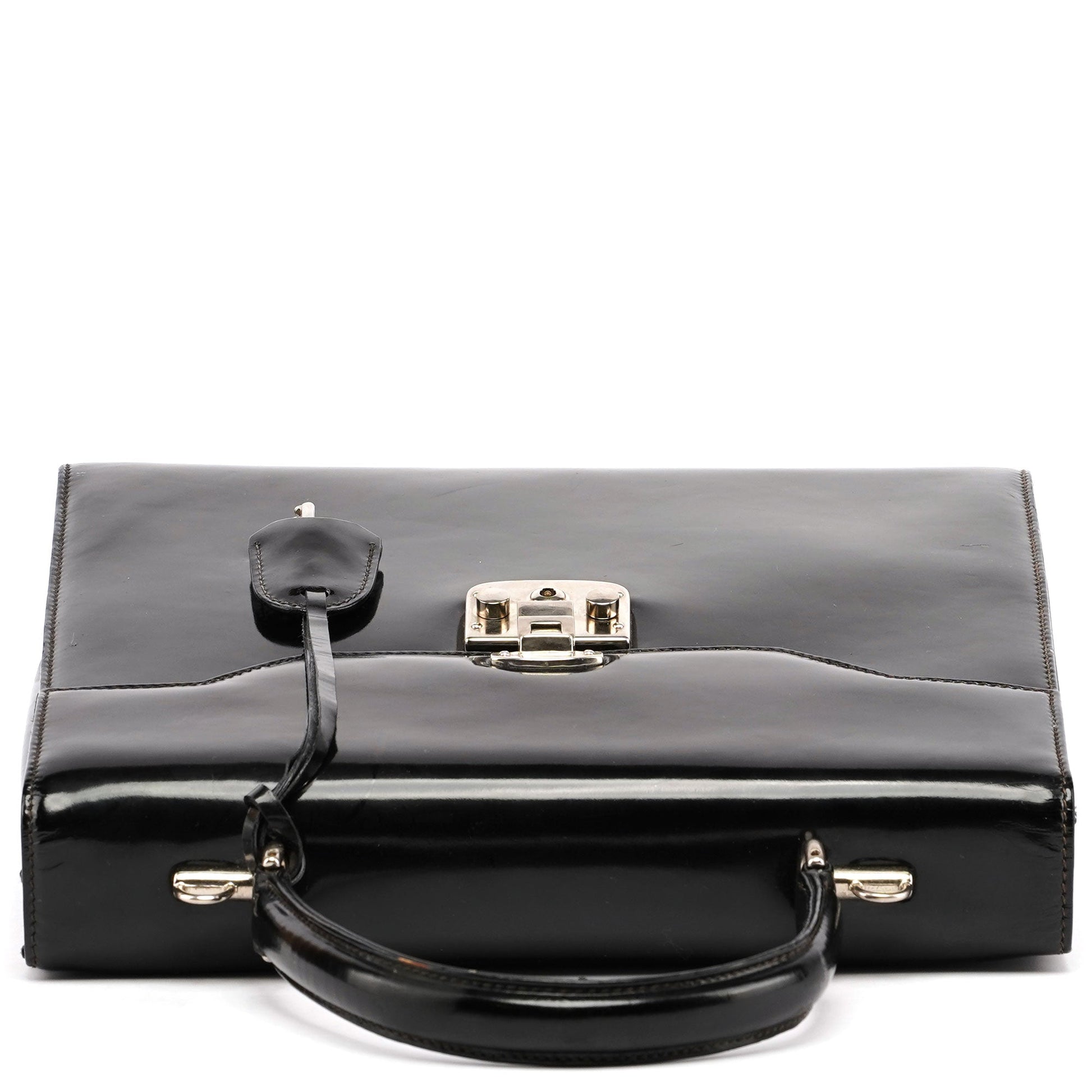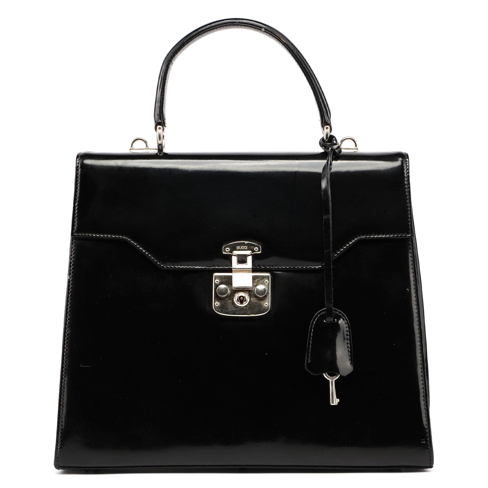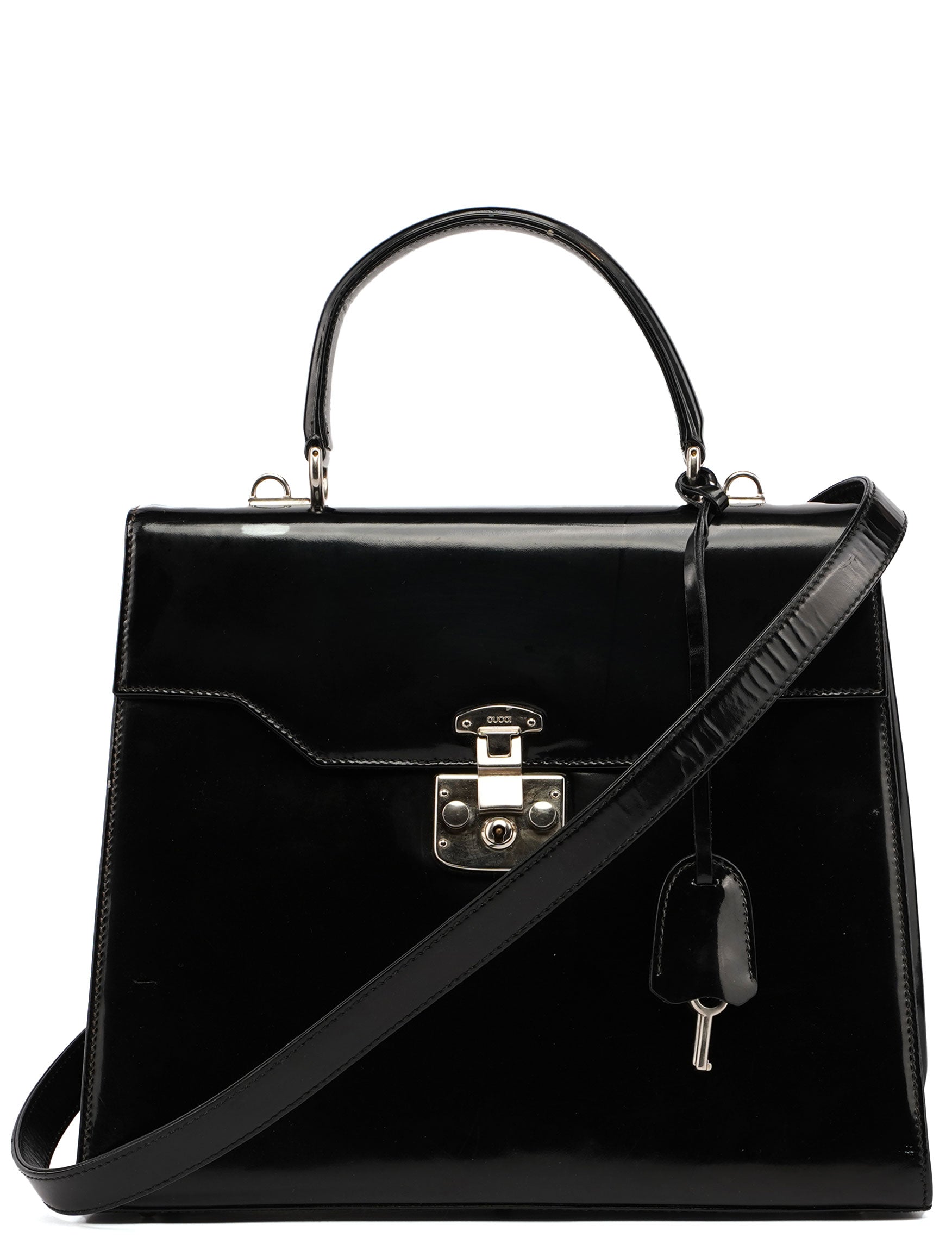 This Gucci Ladylock handbag, famously worn by Diana and handcrafted in luxurious black patent leather, features a detachable cross-body strap and a top handle for versatile carrying options, highlighted by silver-tone hardware. A flap lock closure with attached keys ensures the safety of your belongings, while two inside pockets provide ample organization. Four bag feet at the bottom protect the handbag's integrity, adding durability to its refined design.