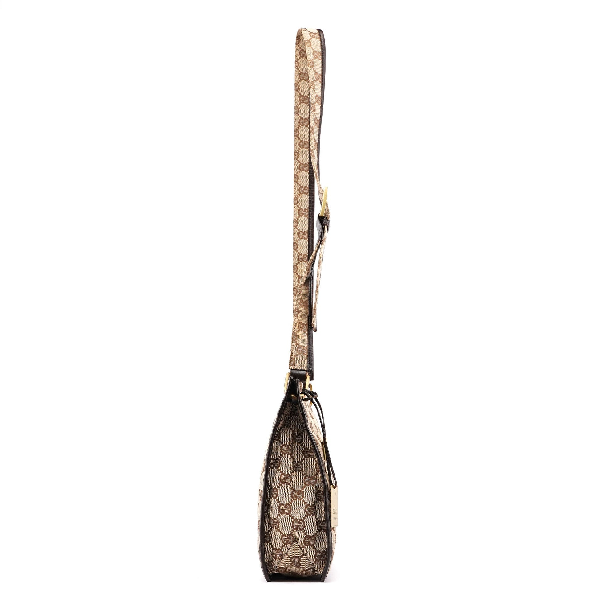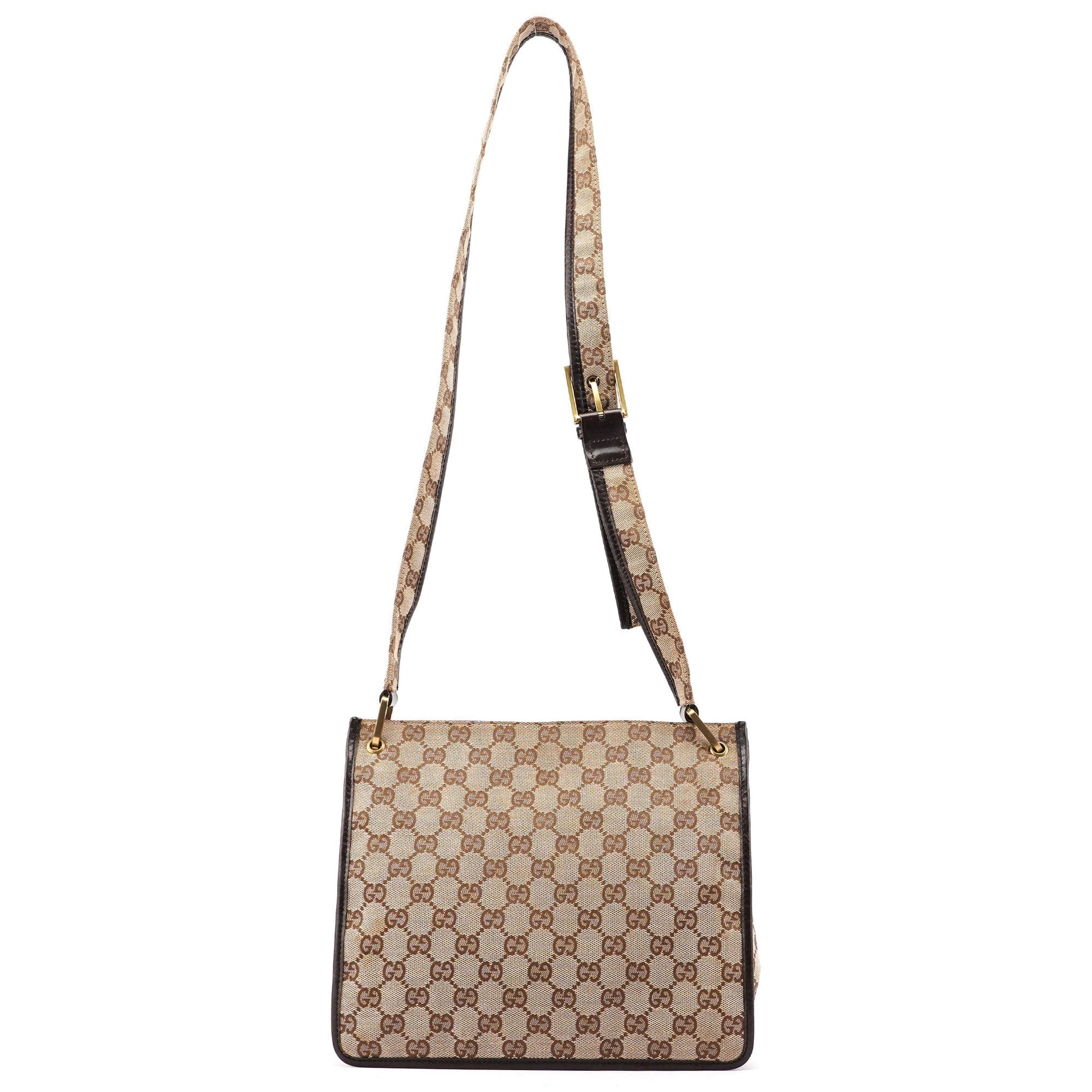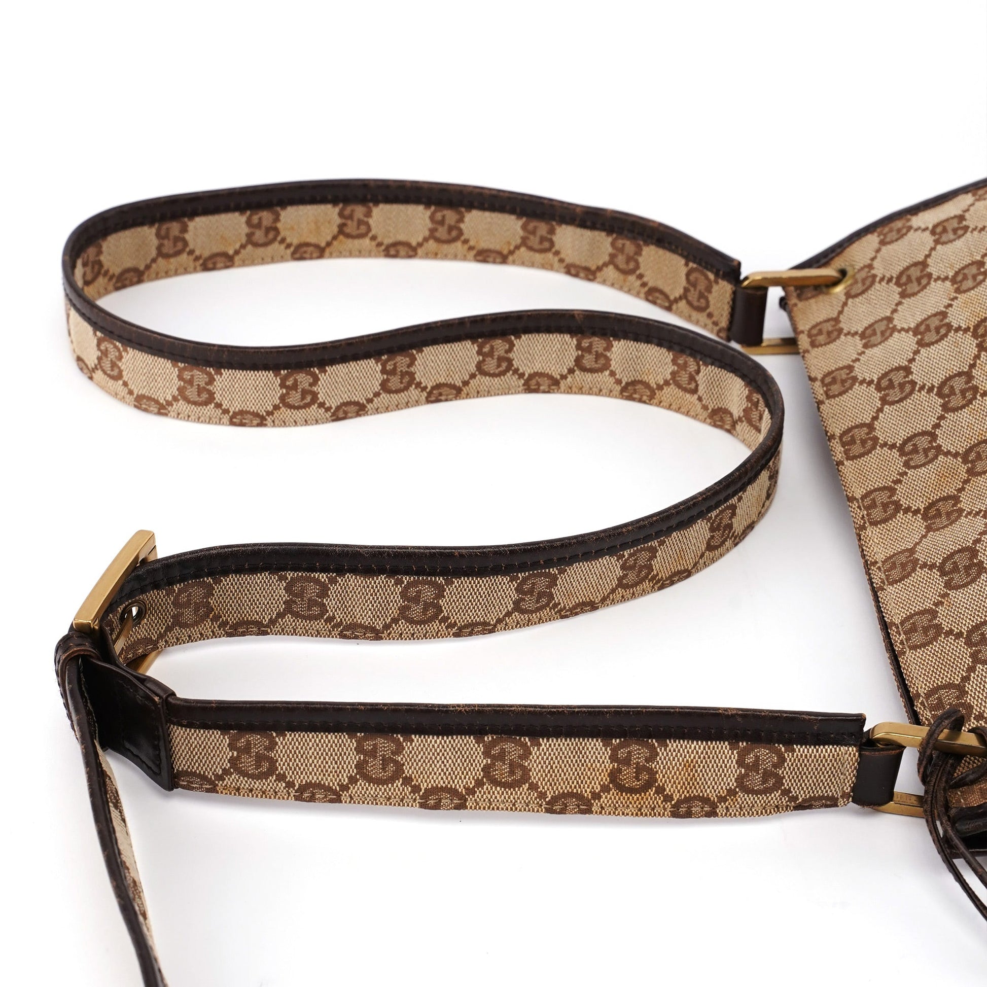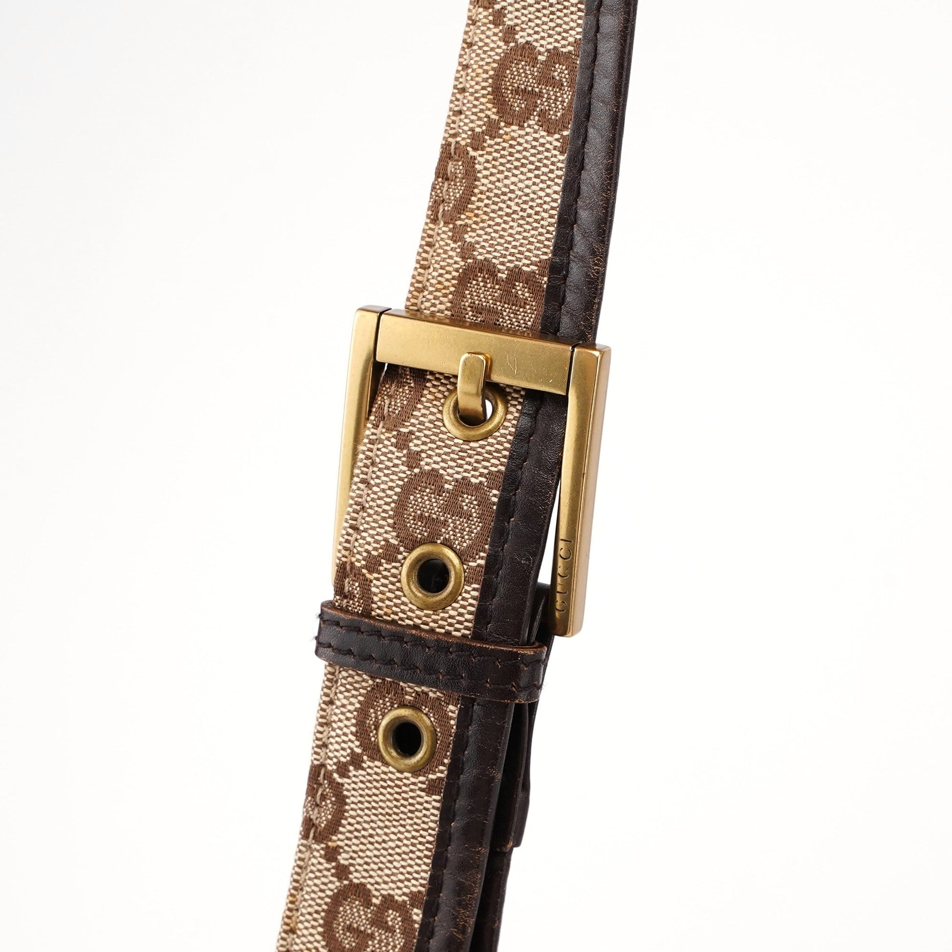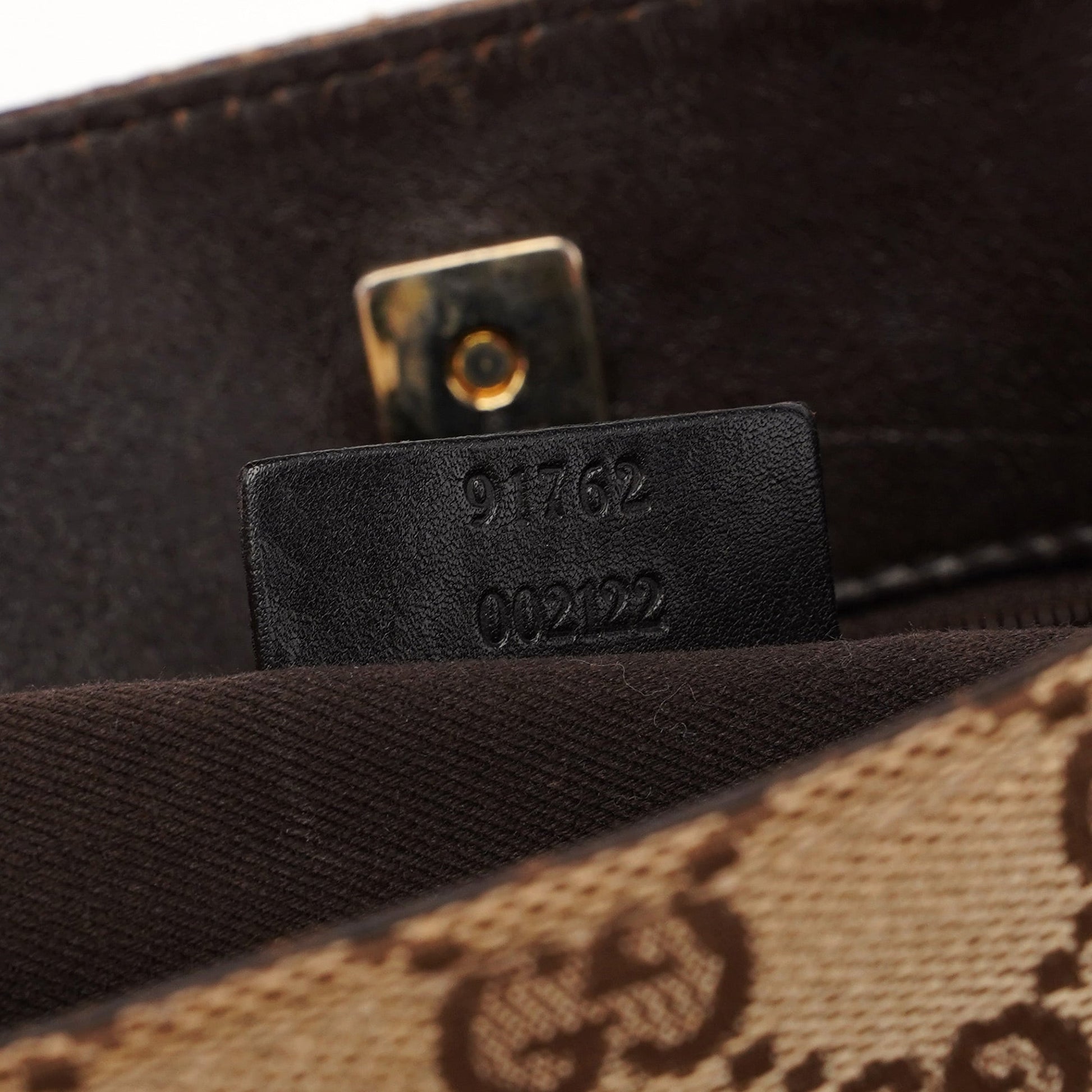 Designed by Tom Ford in the late 1990s, the Gucci GG shoulder bag is handcrafted from beige GG monogram canvas with brown leather trim. It features gold-tone hardware, a magnetic closure, and a cotton-lined interior with a zipper pocket. The bag is adorned with a Gucci logo plate and a Gucci logo leather tag attached at the front, showcasing timeless elegance.
