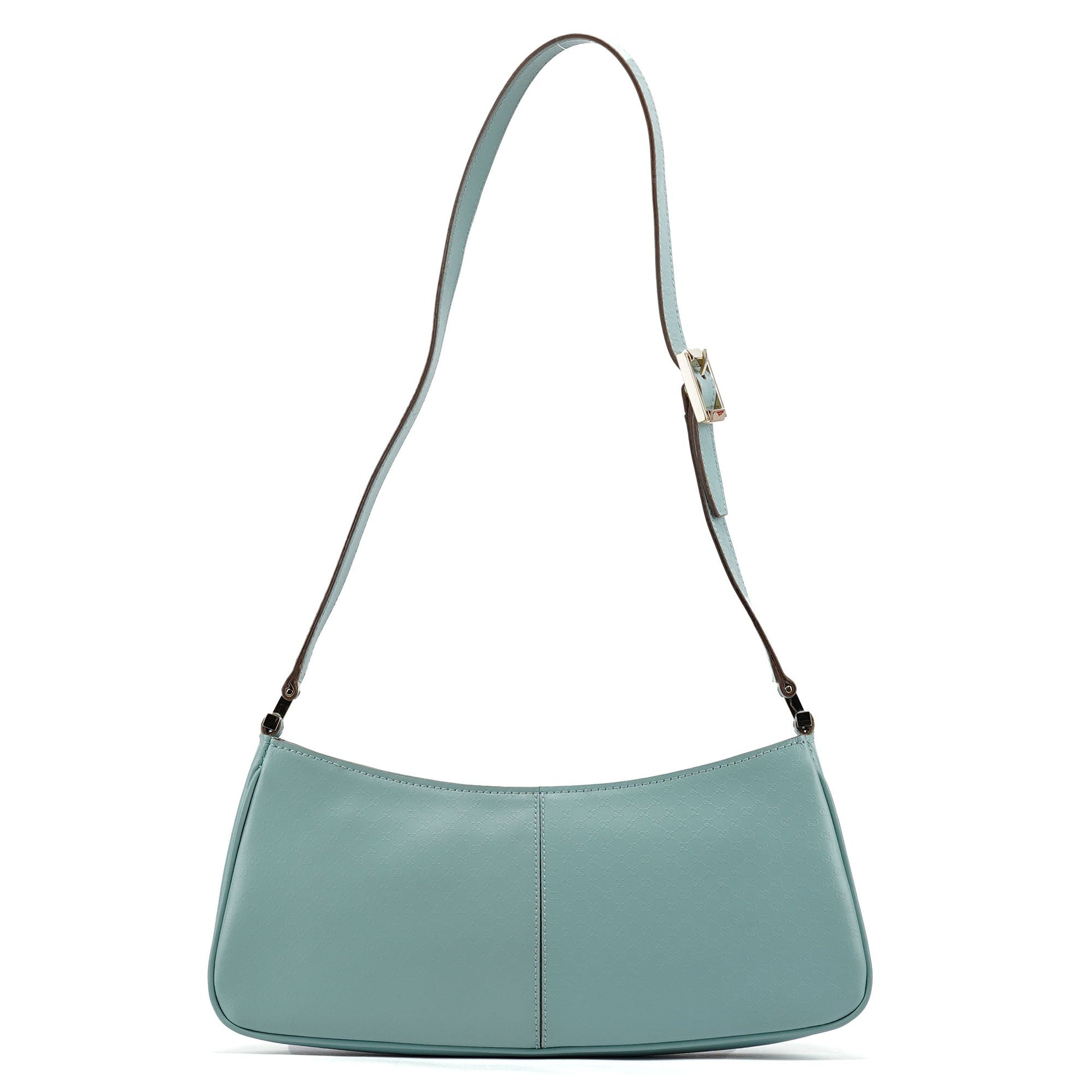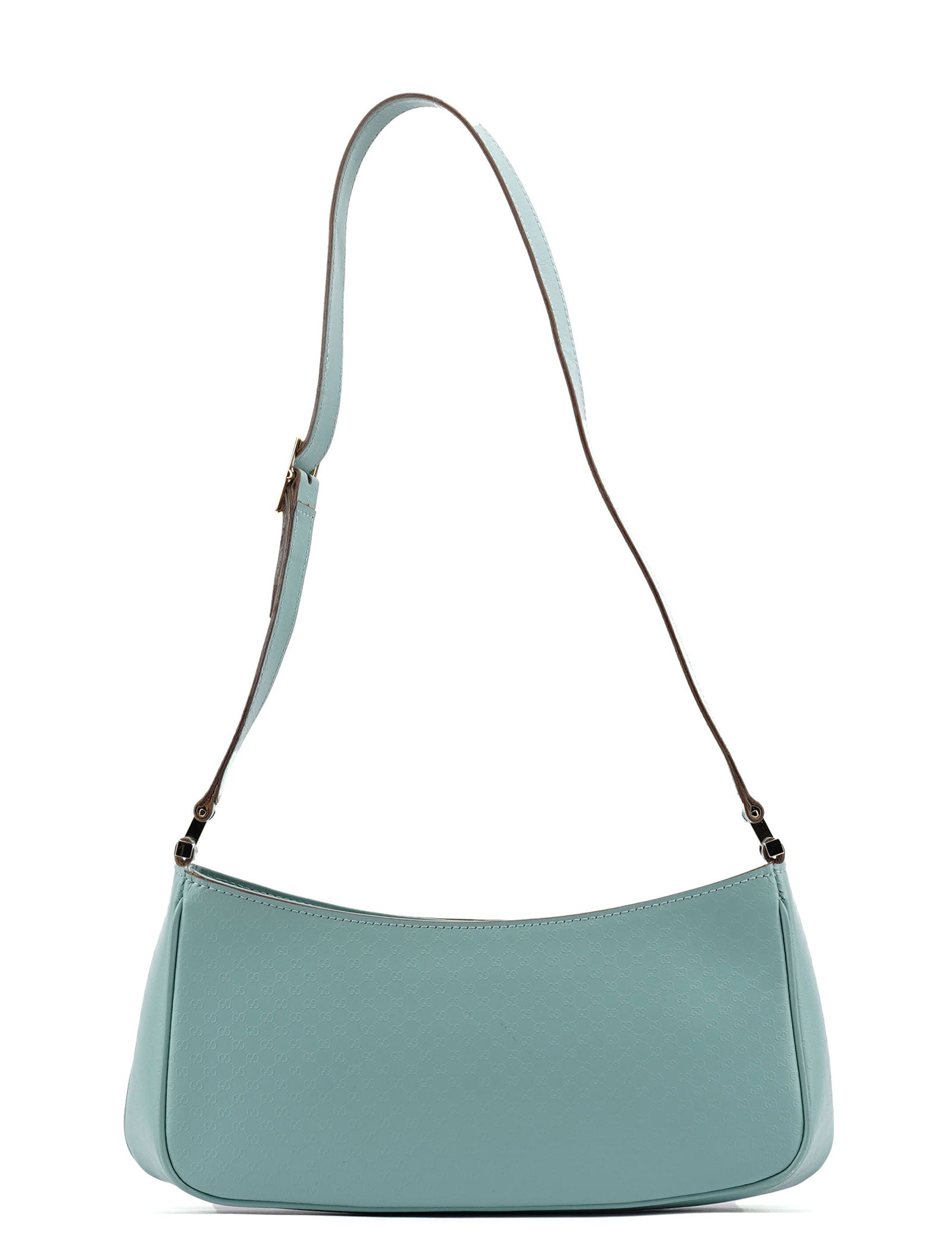 Designed by Tom Ford in the late 1990s, the Gucci GG mini hobo bag showcases a baby blue GG monogram embossed leather. Its gold-tone hardware accents add a touch of elegance. Lined with satin, it features a small interior pocket for essentials.