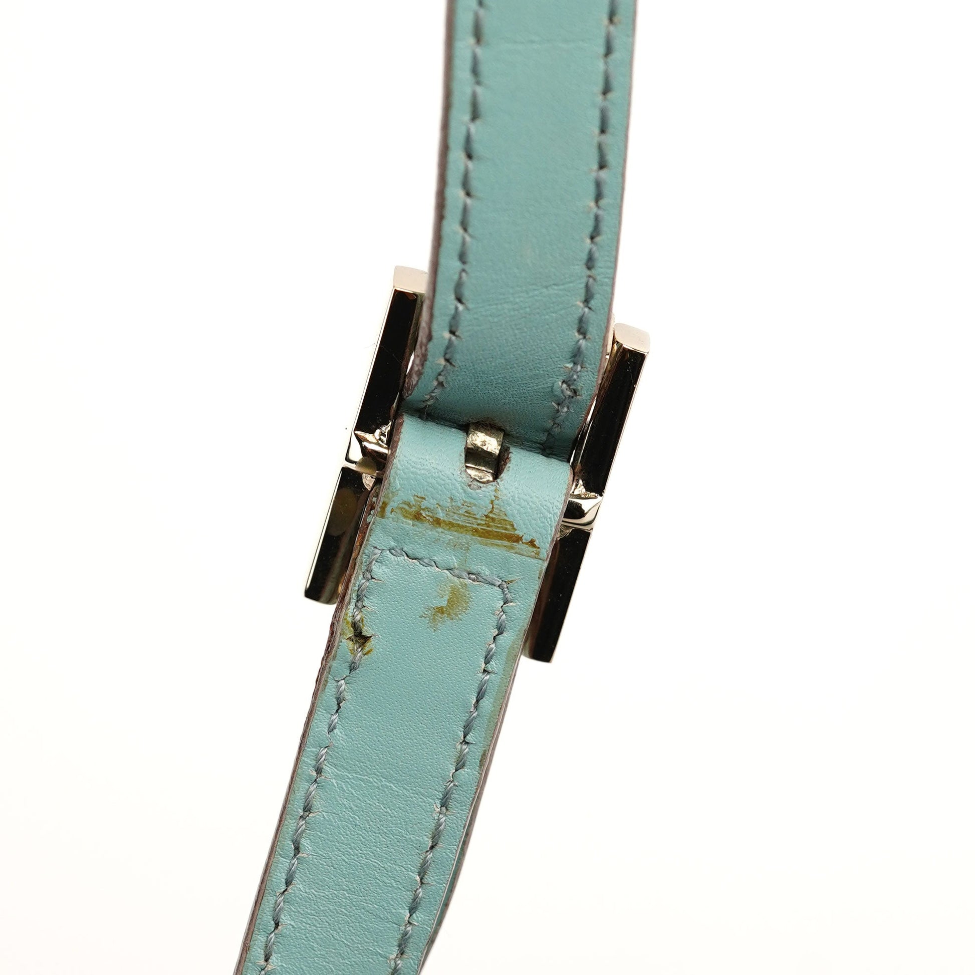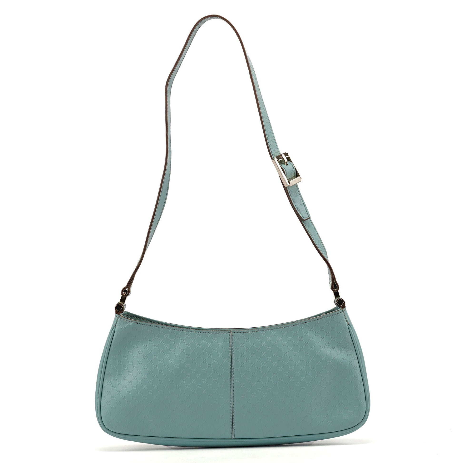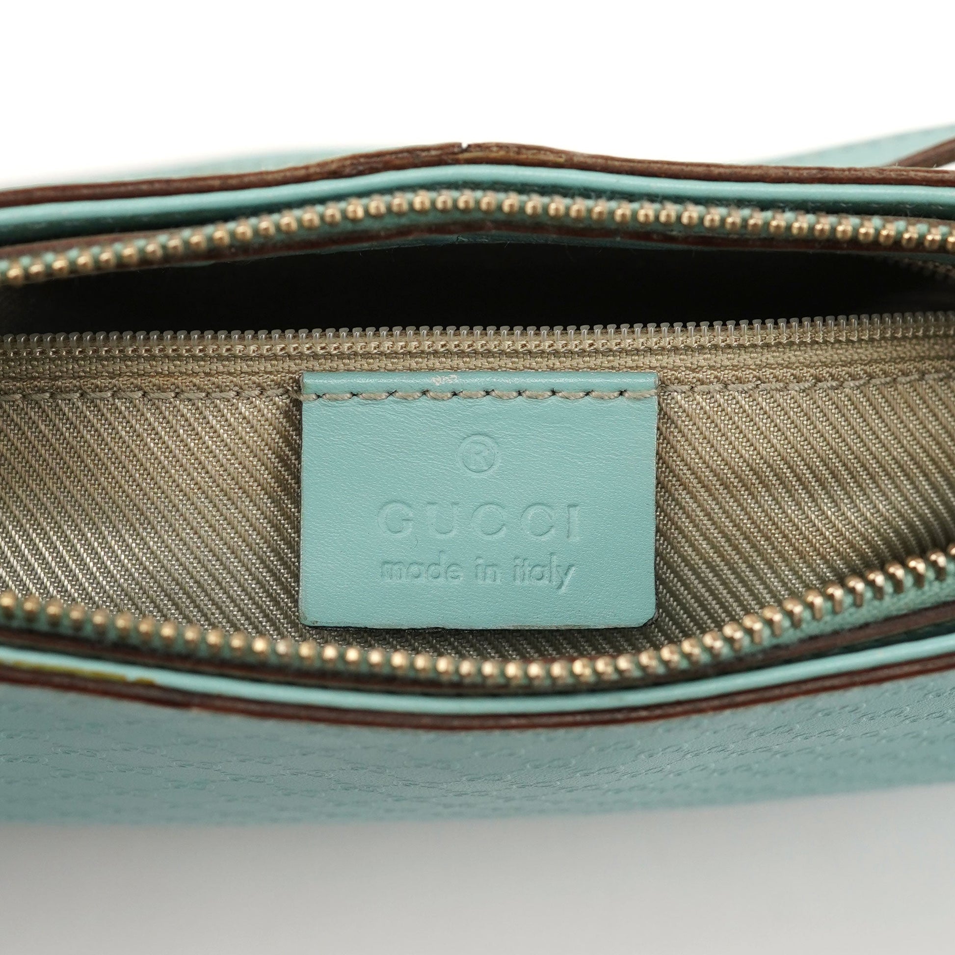 Designed by Tom Ford in the late 1990s, the Gucci GG mini hobo bag showcases a baby blue GG monogram embossed leather. Its gold-tone hardware accents add a touch of elegance. Lined with satin, it features a small interior pocket for essentials.