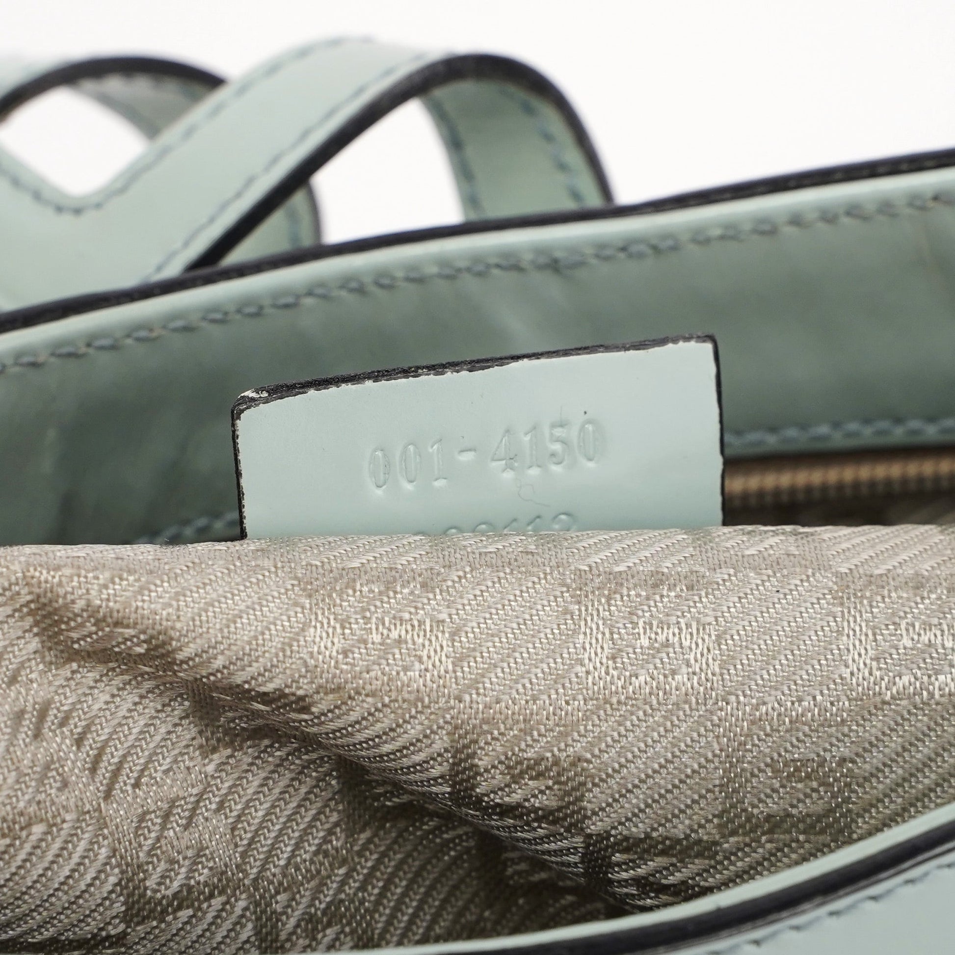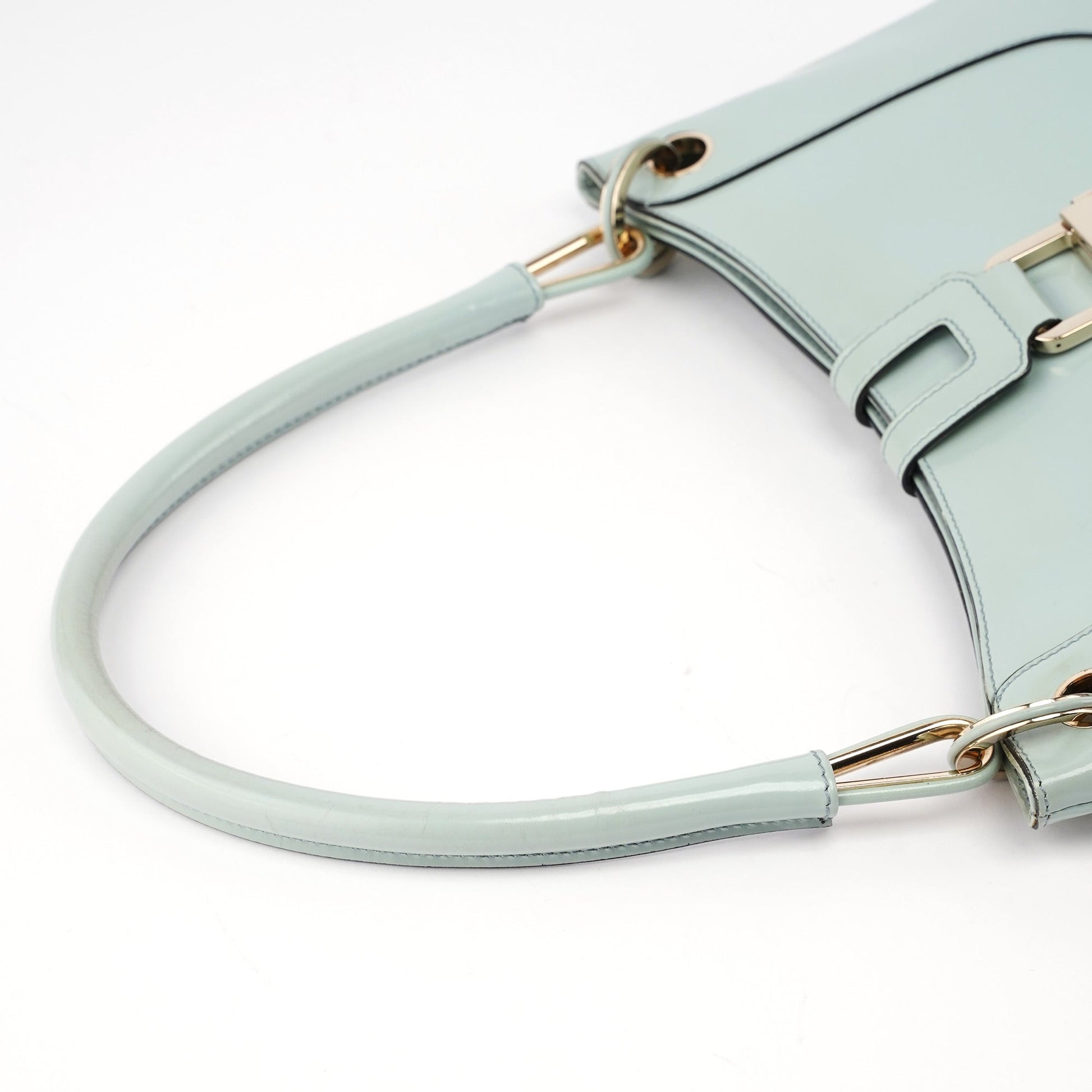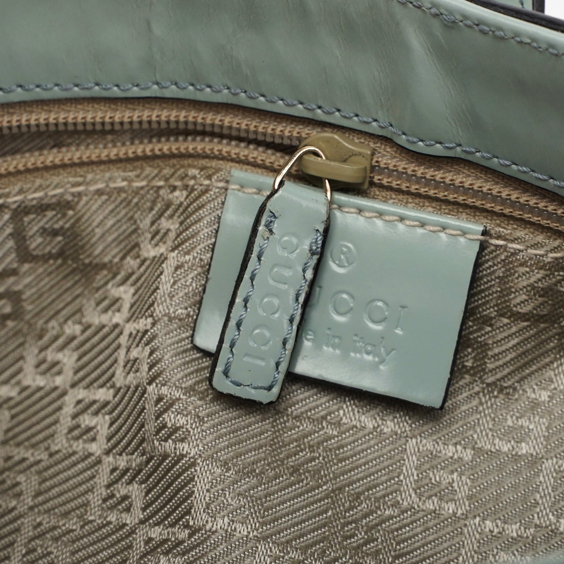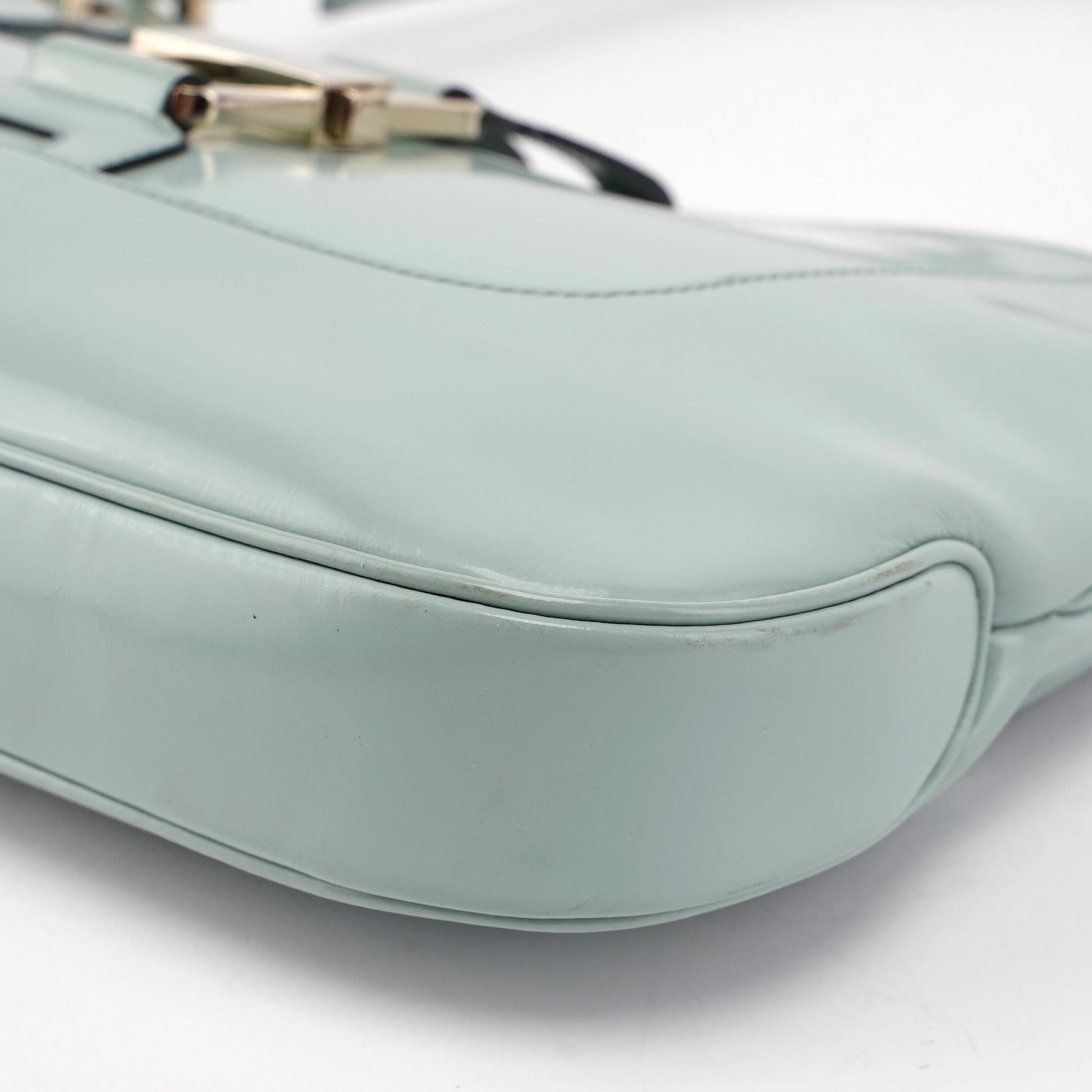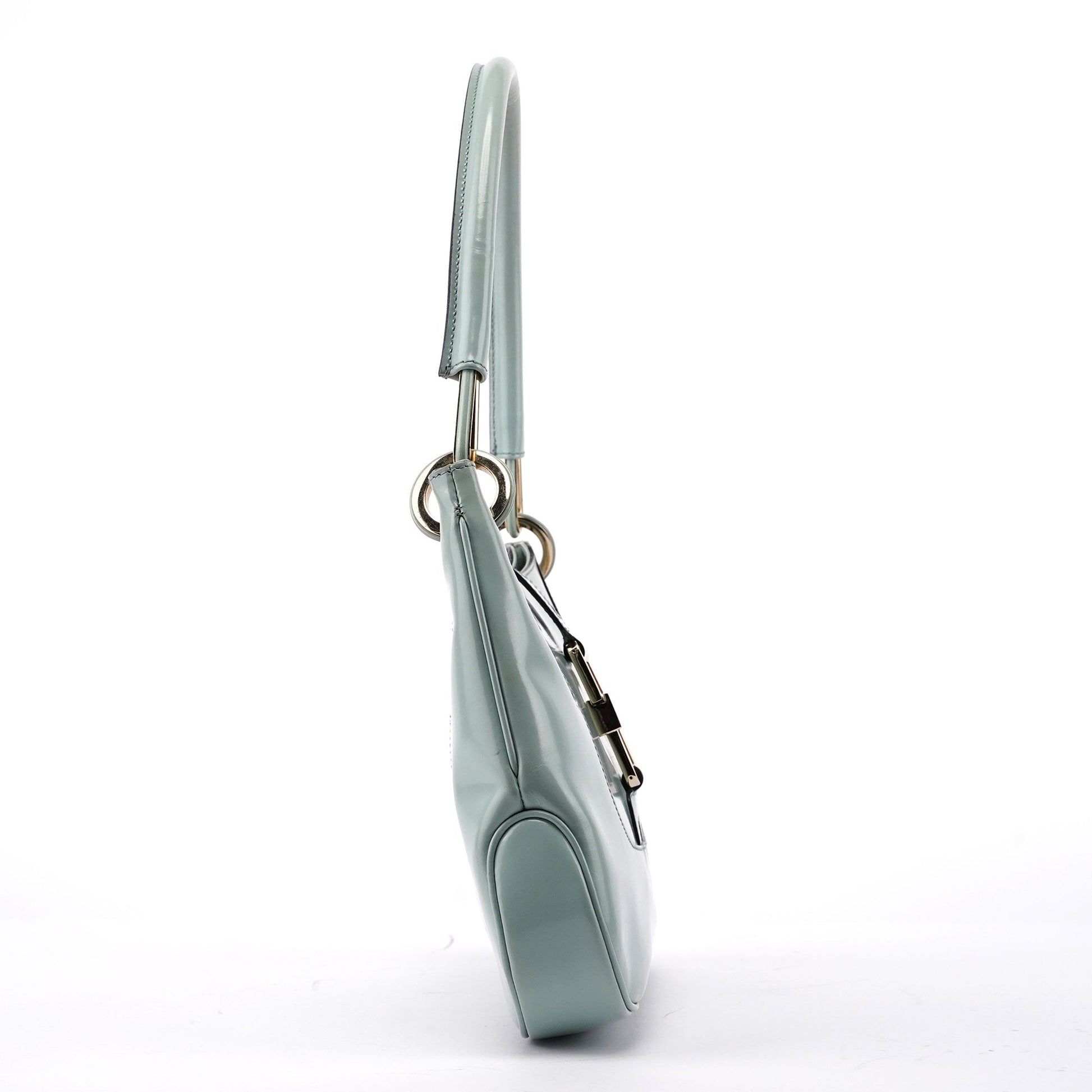 Designed by Tom Ford in the late 1990s, the Gucci Jackie shoulder bag exudes sophistication. Made from light blue patent leather with gold-tone hardware engraved with the Gucci logo, it features the signature Jackie clasp closure. Inside, the satin-lined interior offers practicality with a convenient interior zipper pocket.