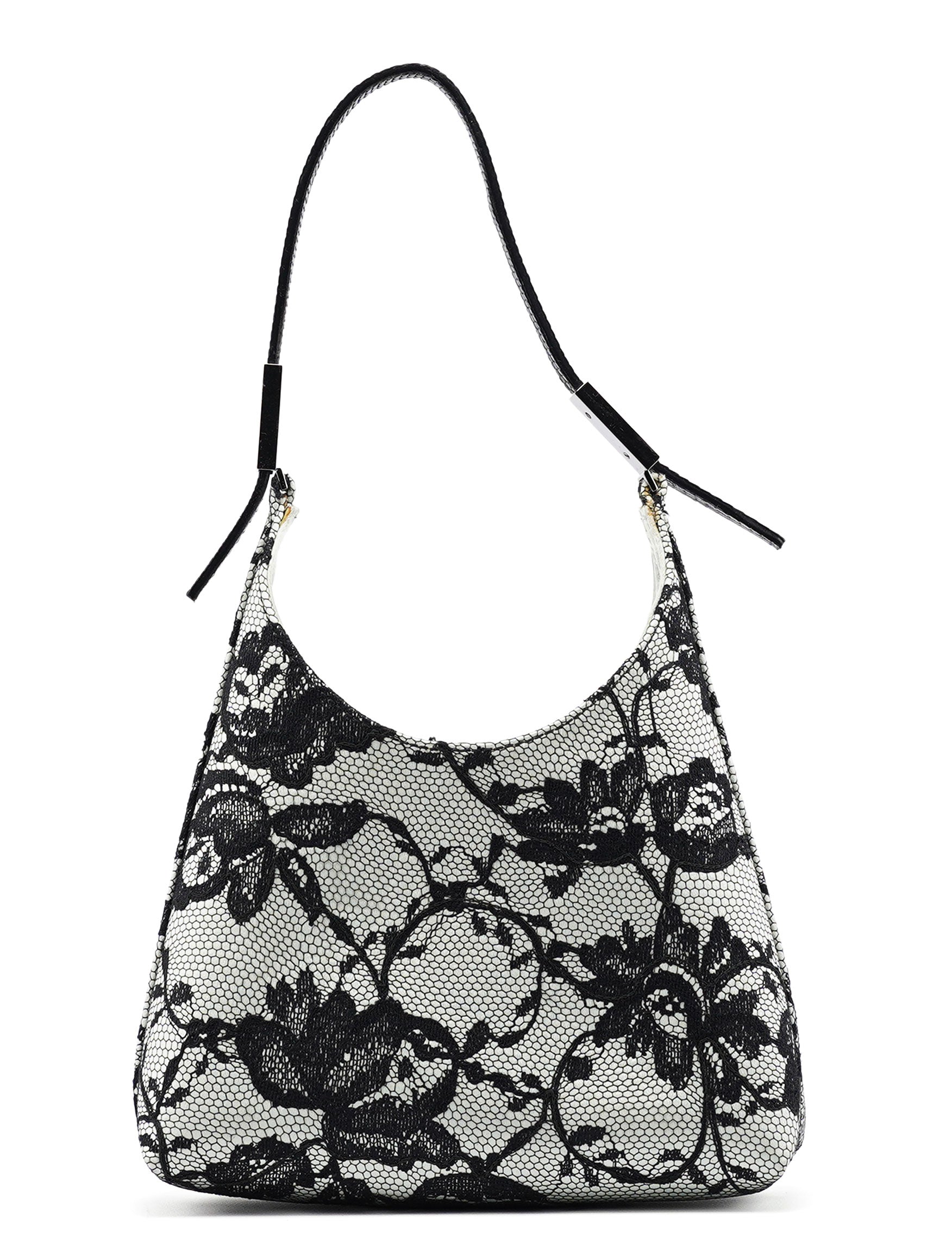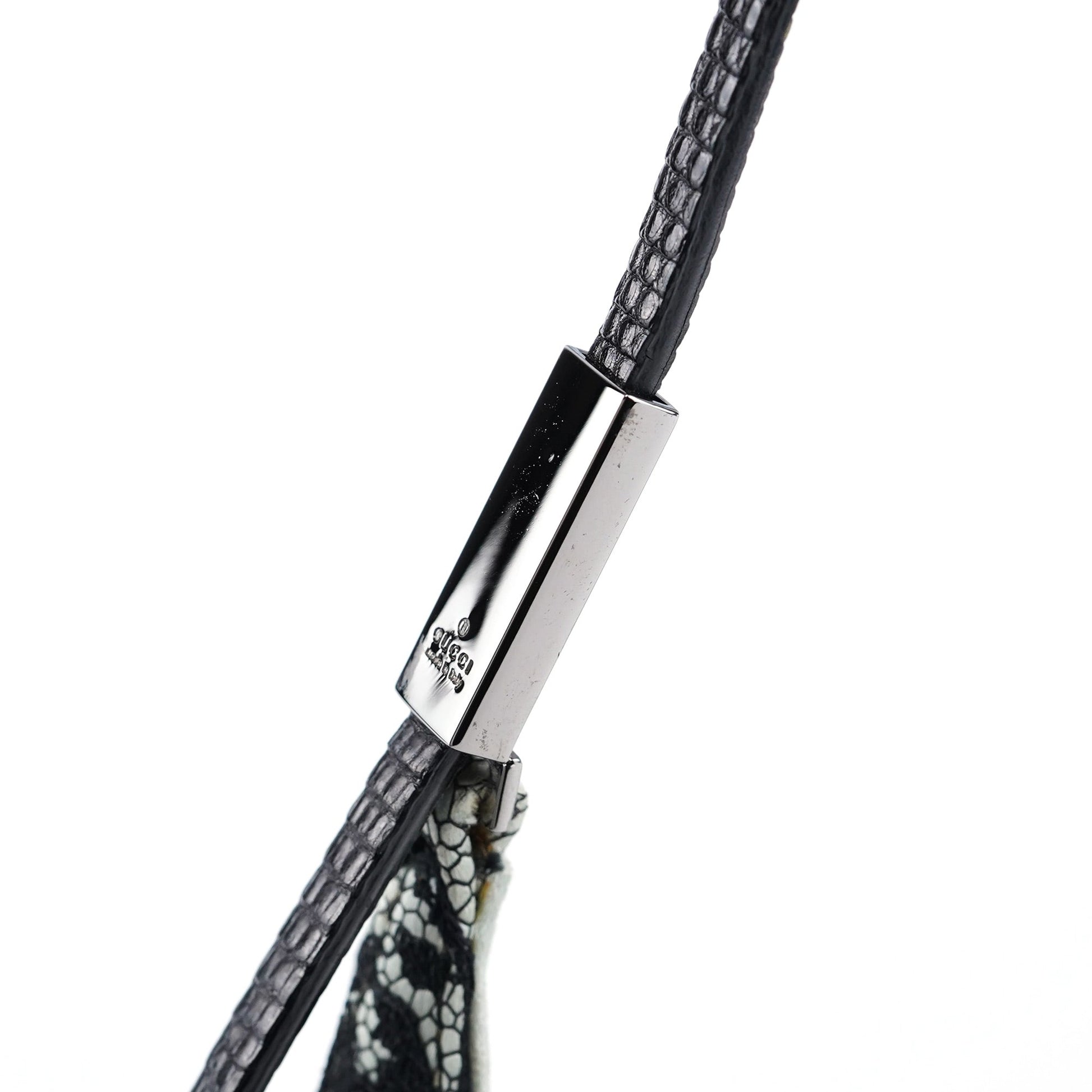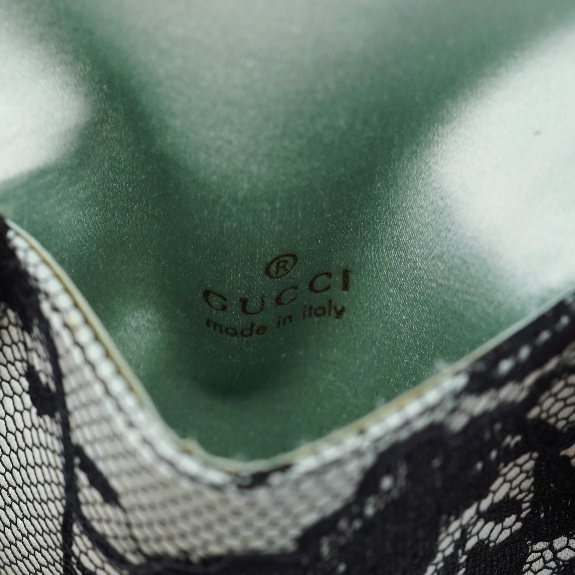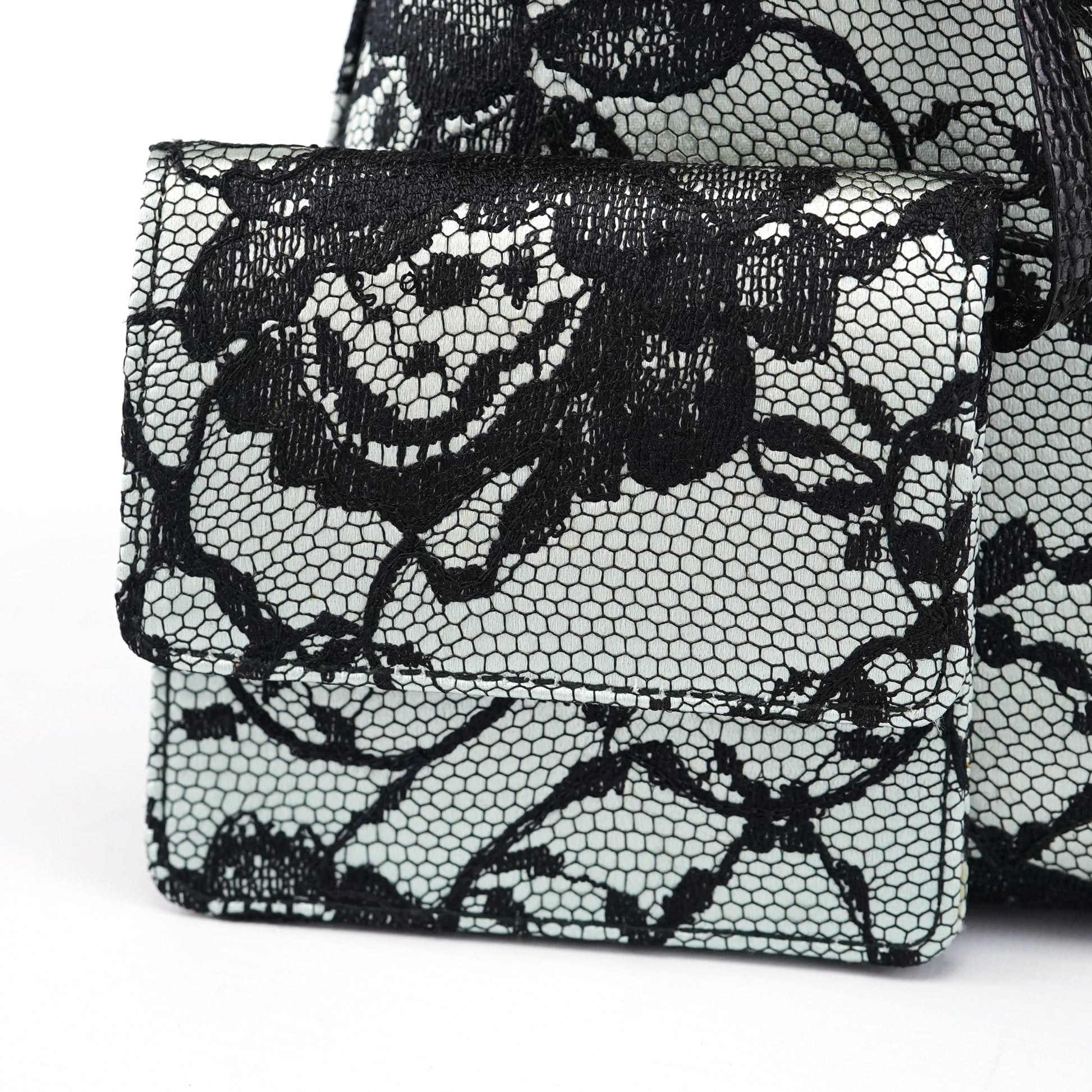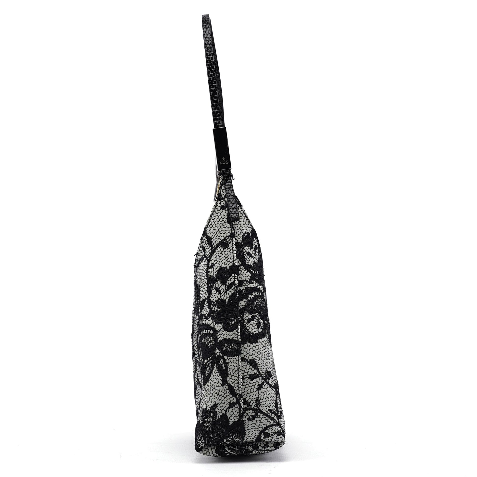 Handcrafted from black lace over light blue satin, this vintage Gucci mini bag by Tom Ford from the late 1990s exudes timeless elegance. Featuring silver-tone hardware engraved with the Gucci logo, an attached coin pouch, and a satin-lined interior, it’s a compact yet luxurious piece. The handle, detailed with lizard embossing, adds an exotic touch, making this mini bag a true statement of refined style.