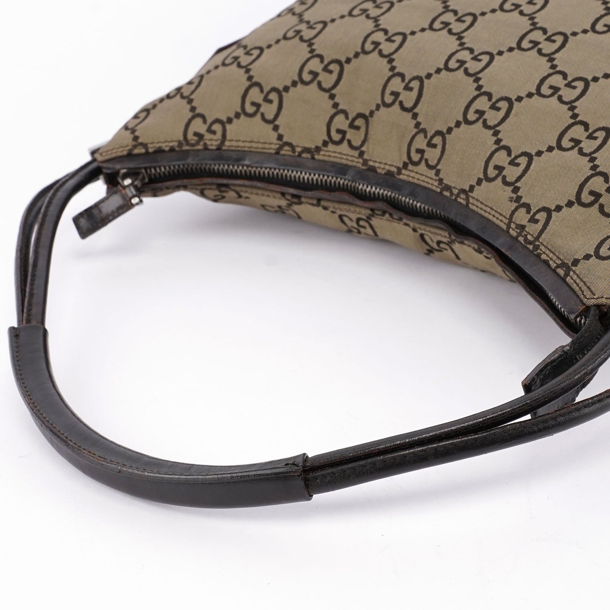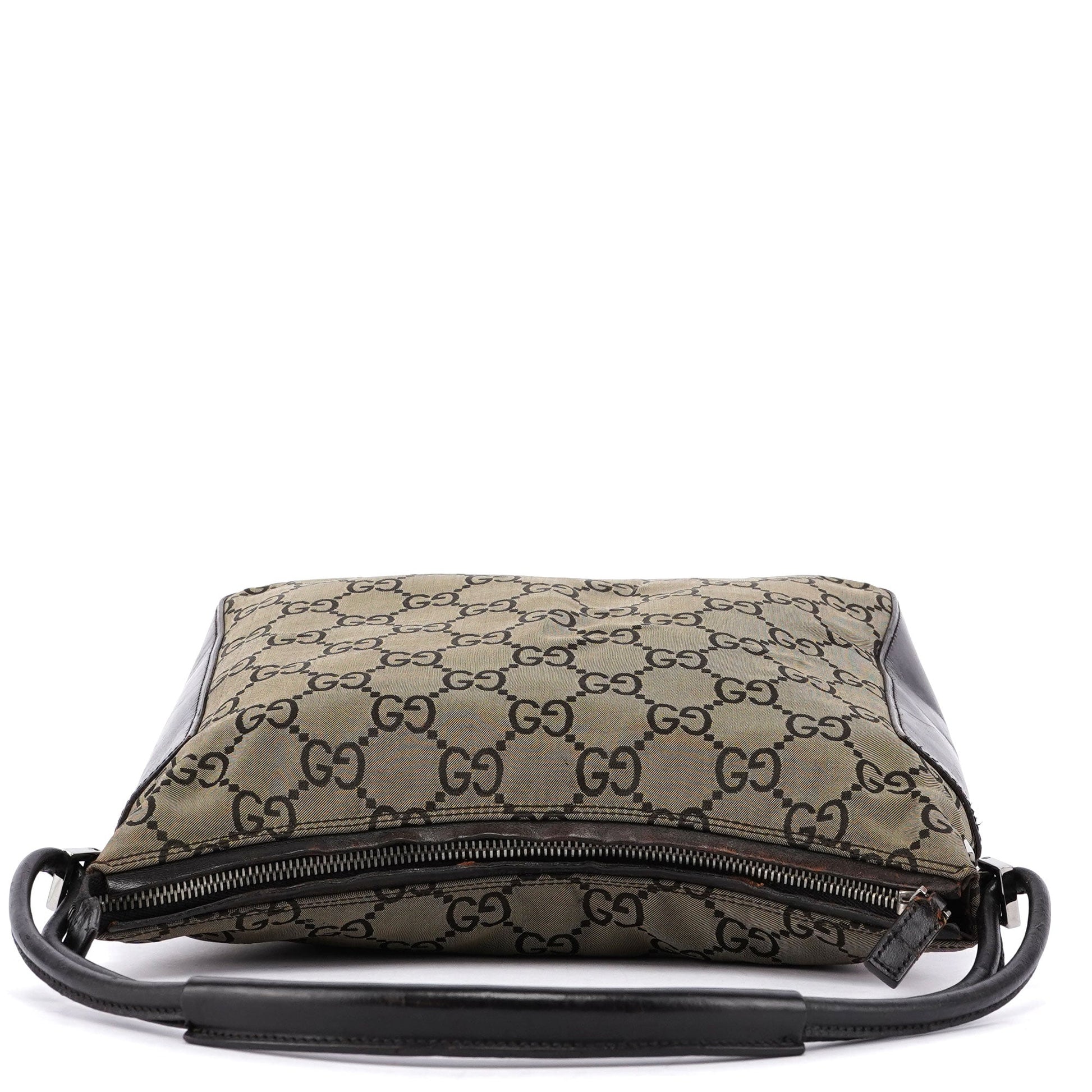 Designed by Tom Ford in the late 1990s, the Gucci hobo bag blends beige GG canvas and black leather elegantly. Silver-tone hardware complements its design. The cotton-lined interior features a convenient zipper pocket, with a discreet Gucci logo plate adorning the side.