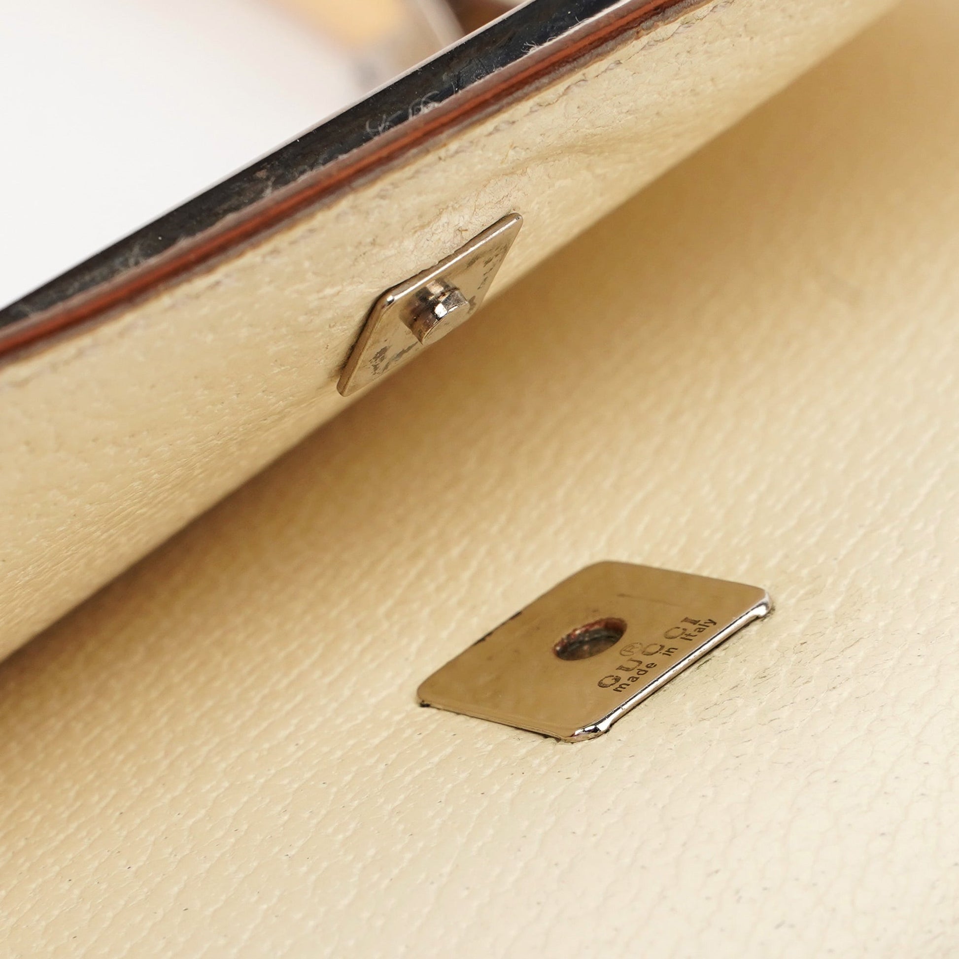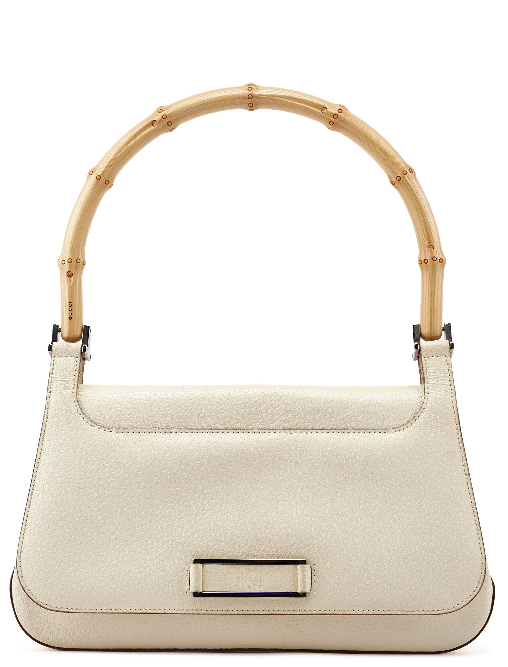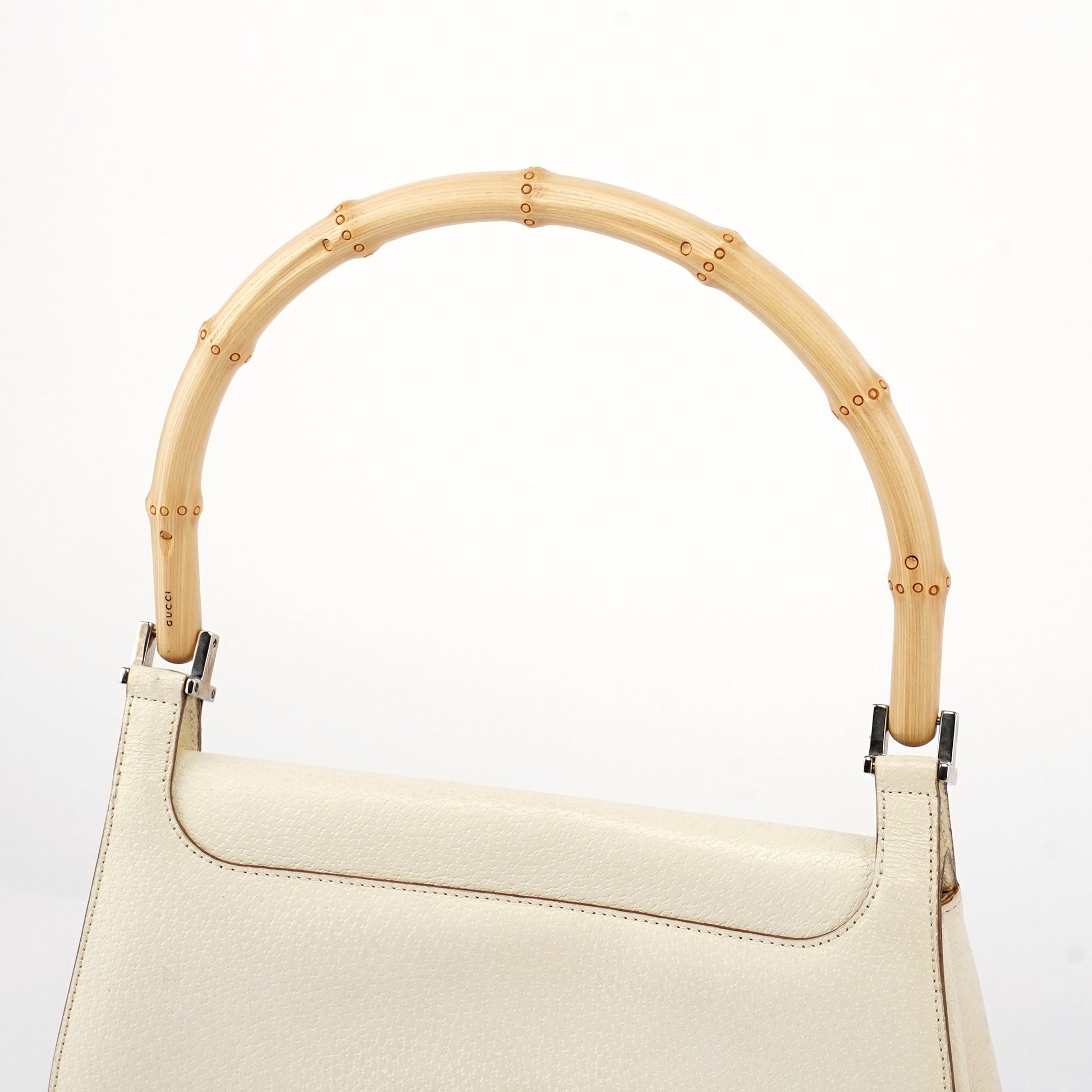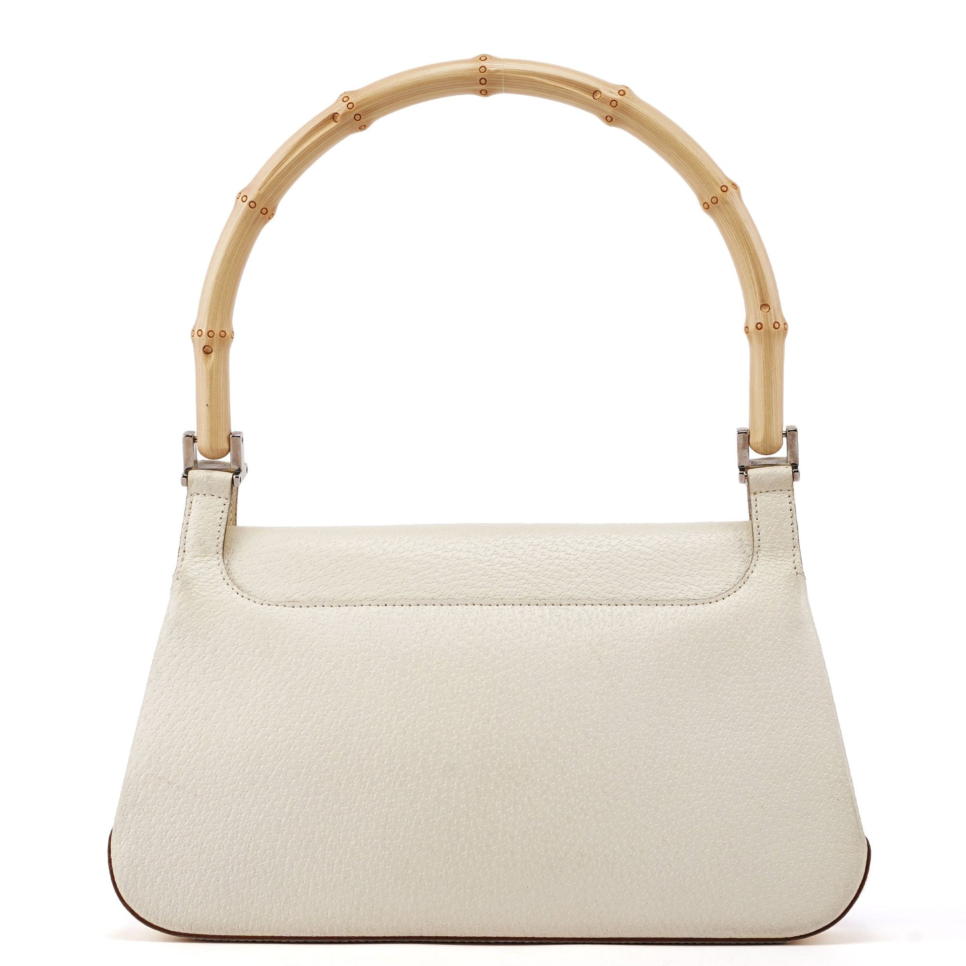 Designed by Tom Ford in the late 1990s, this Gucci Bamboo bag is handcrafted from off-white leather. It features a bamboo handle engraved with the Gucci logo, silver-tone hardware, and a satin-lined interior with an interior zipper pocket. The Gucci logo is subtly embossed at the front, showcasing timeless elegance.