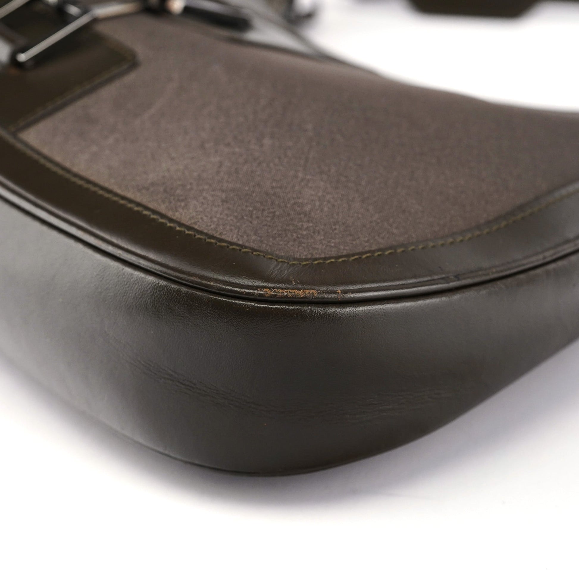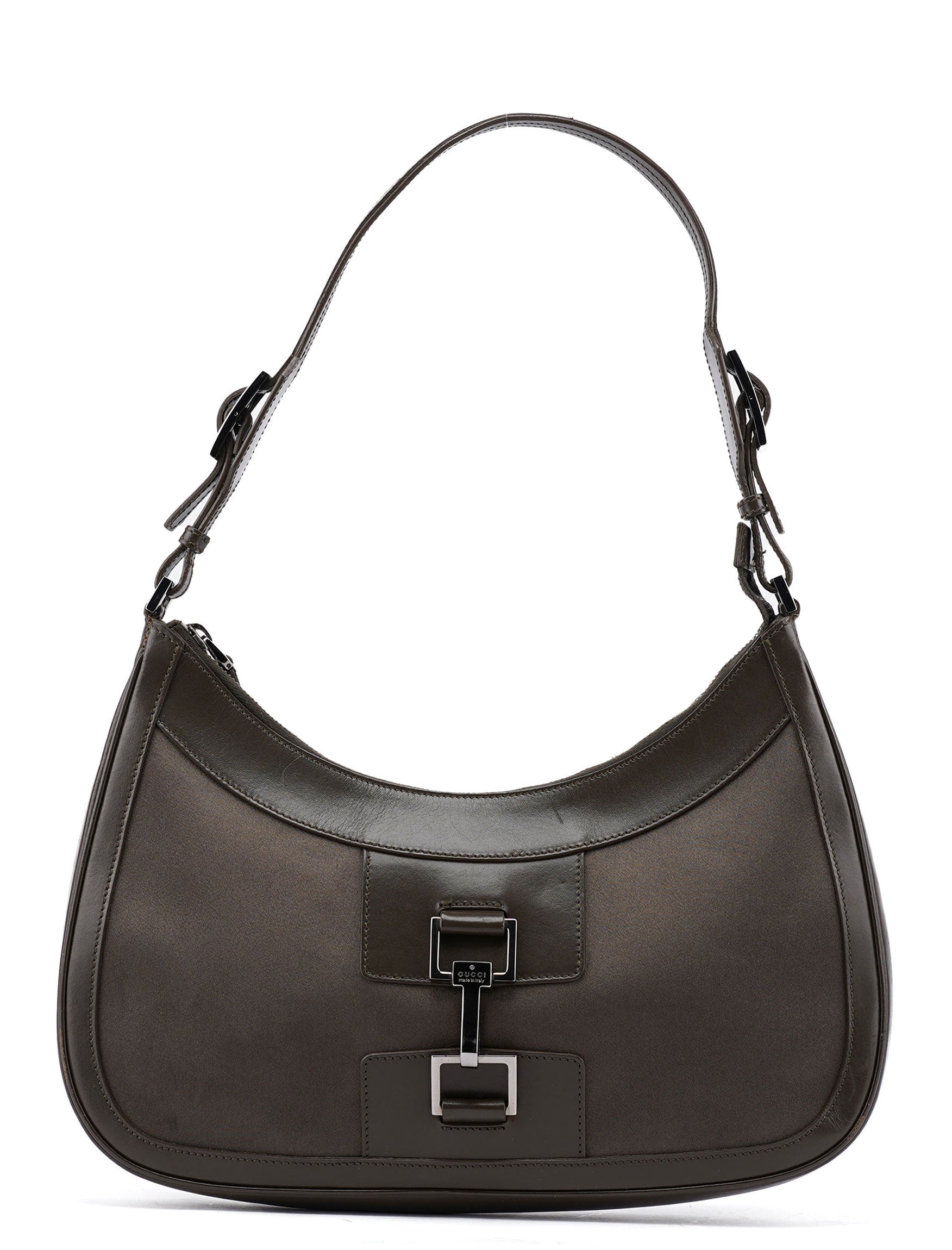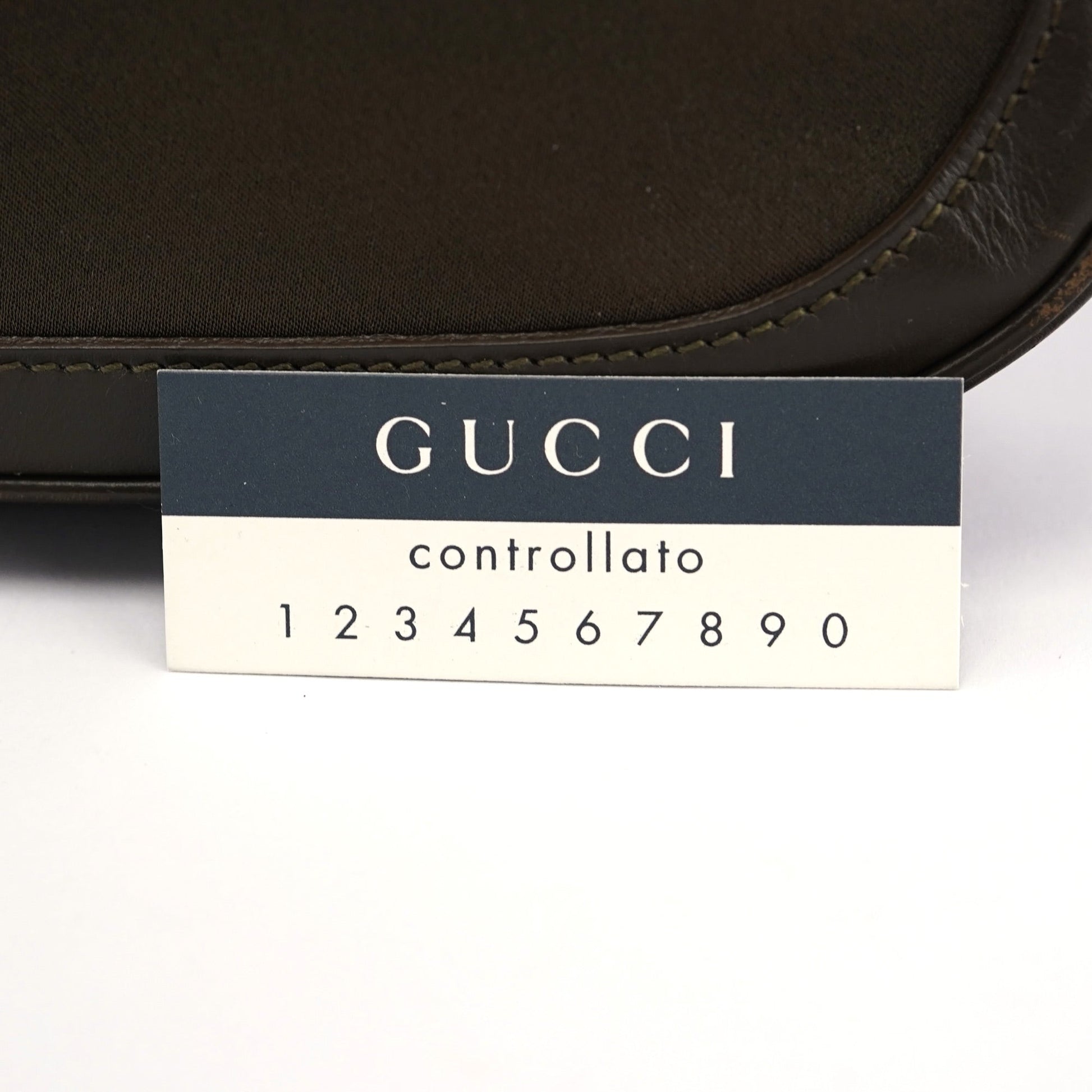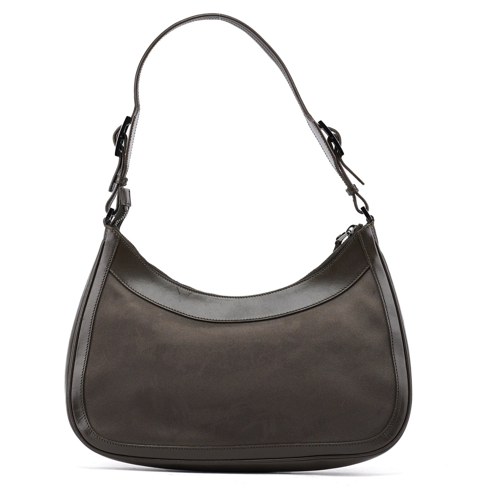 Designed by Tom Ford in the late 1990s, this Gucci Jackie shoulder bag combines olive green satin with tonal calfskin leather trim. Silver-tone hardware engraved with the Gucci logo highlights the design, featuring the iconic Jackie clasp alongside a practical zipper closure. The calfskin-lined interior includes a zipper pocket, blending timeless elegance with functional sophistication.